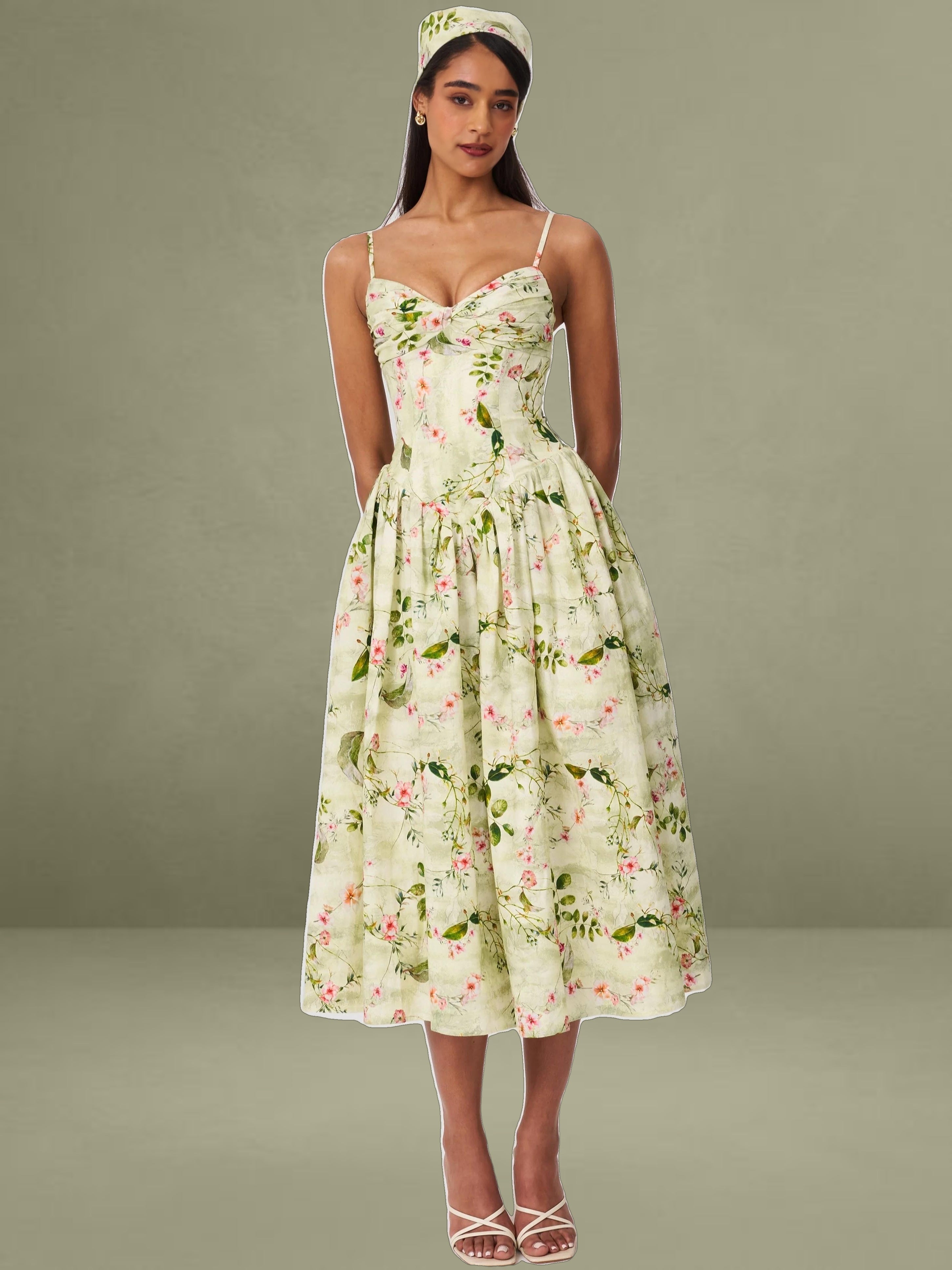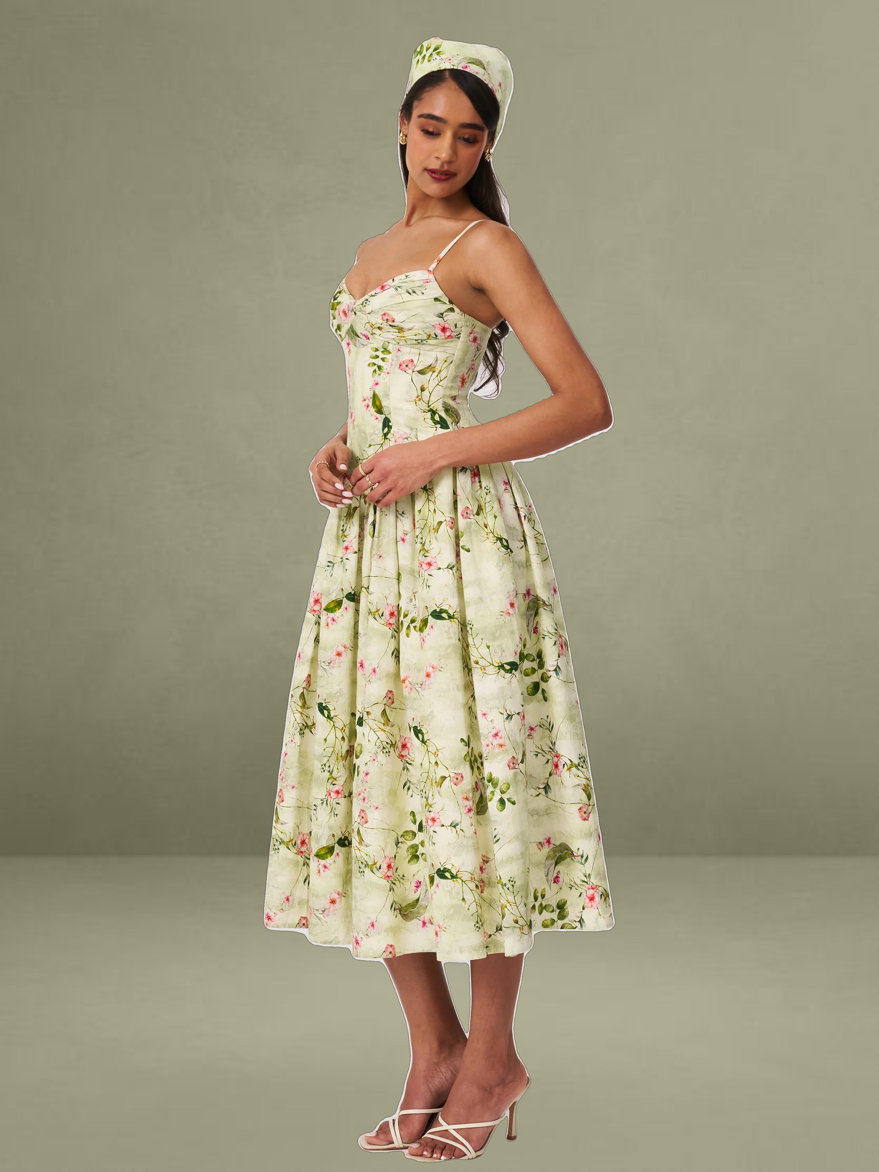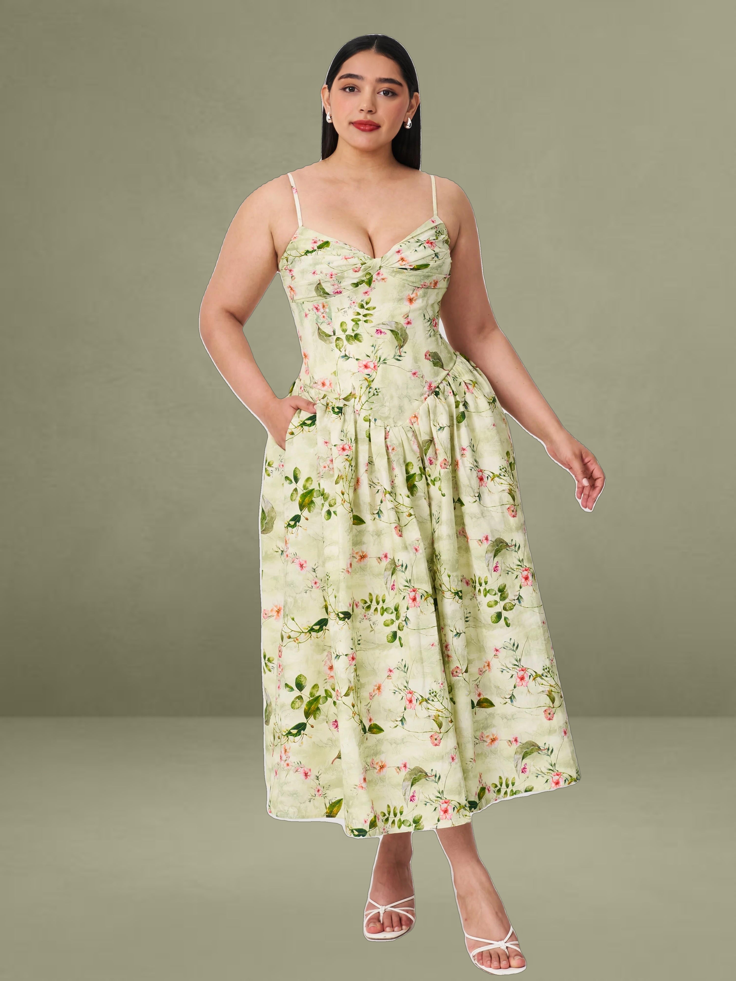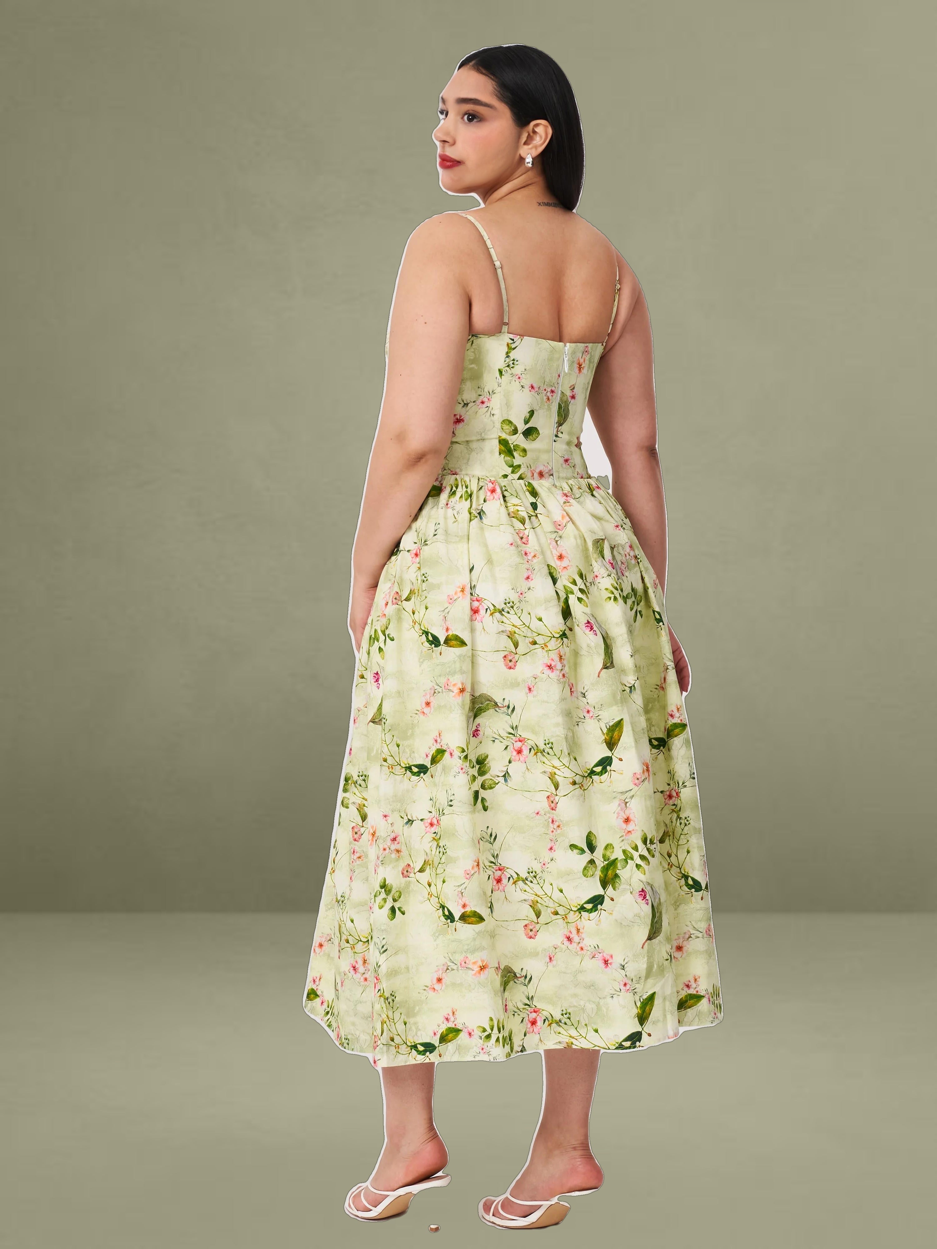 The Jacinda Dress is the perfect blend of springtime charm and effortless elegance, making it an ideal choice for picnics, vacations, holidays, and casual outings. Crafted from breathable linen fabric in a green floral print, this dress embodies a fresh and feminine aesthetic. The ruched front adds delicate texture and enhances the silhouette, while the drop waist design creates a relaxed yet flattering fit. Designed for both style and functionality, it features an invisible zipper and invisible pockets for a seamless look. Fully lined for comfort, the Jacinda Dress is your go-to piece for a breezy and stylish spring wardrobe. Perfectly matches with our Green Floral Print Head Scarf.