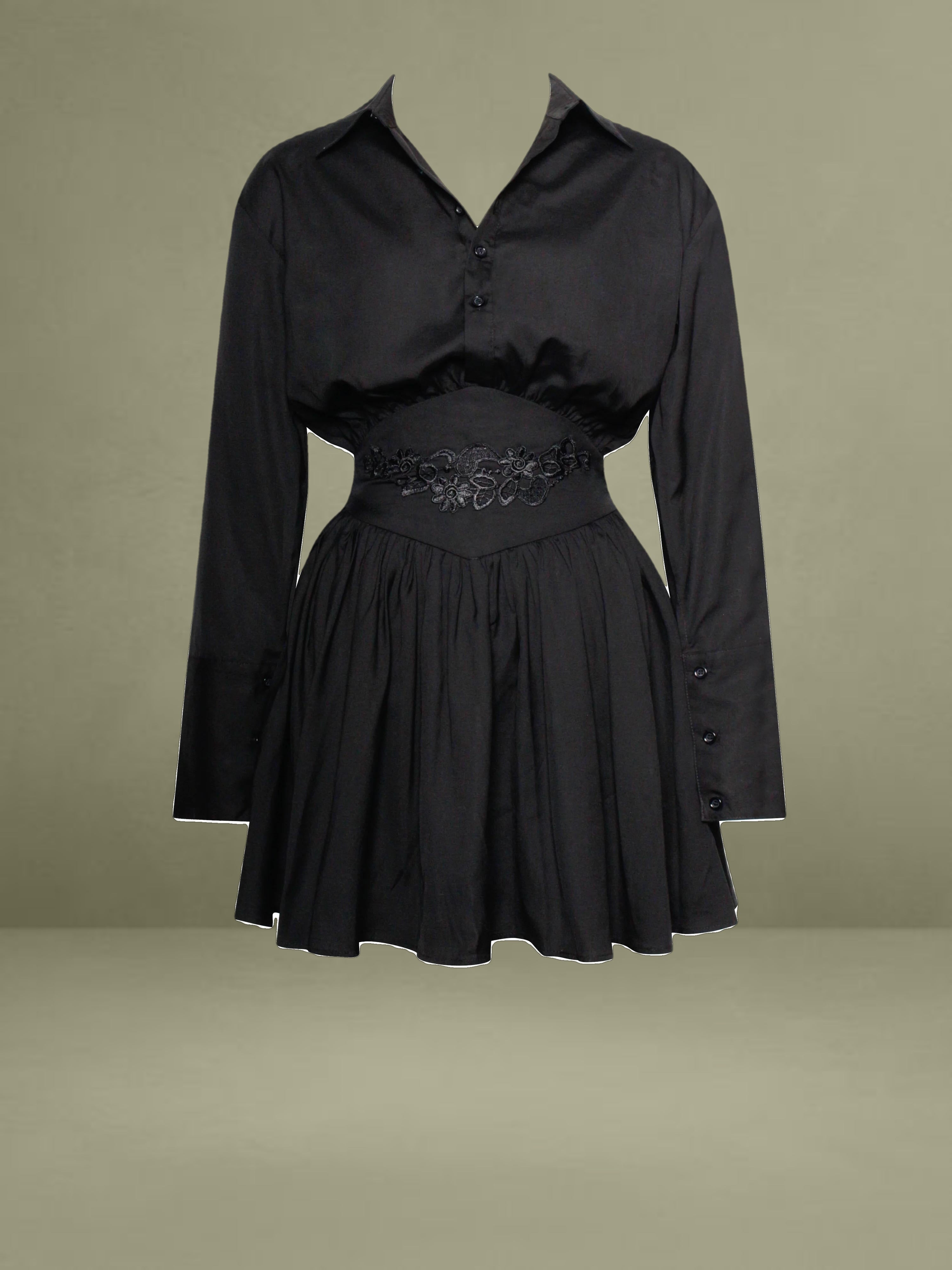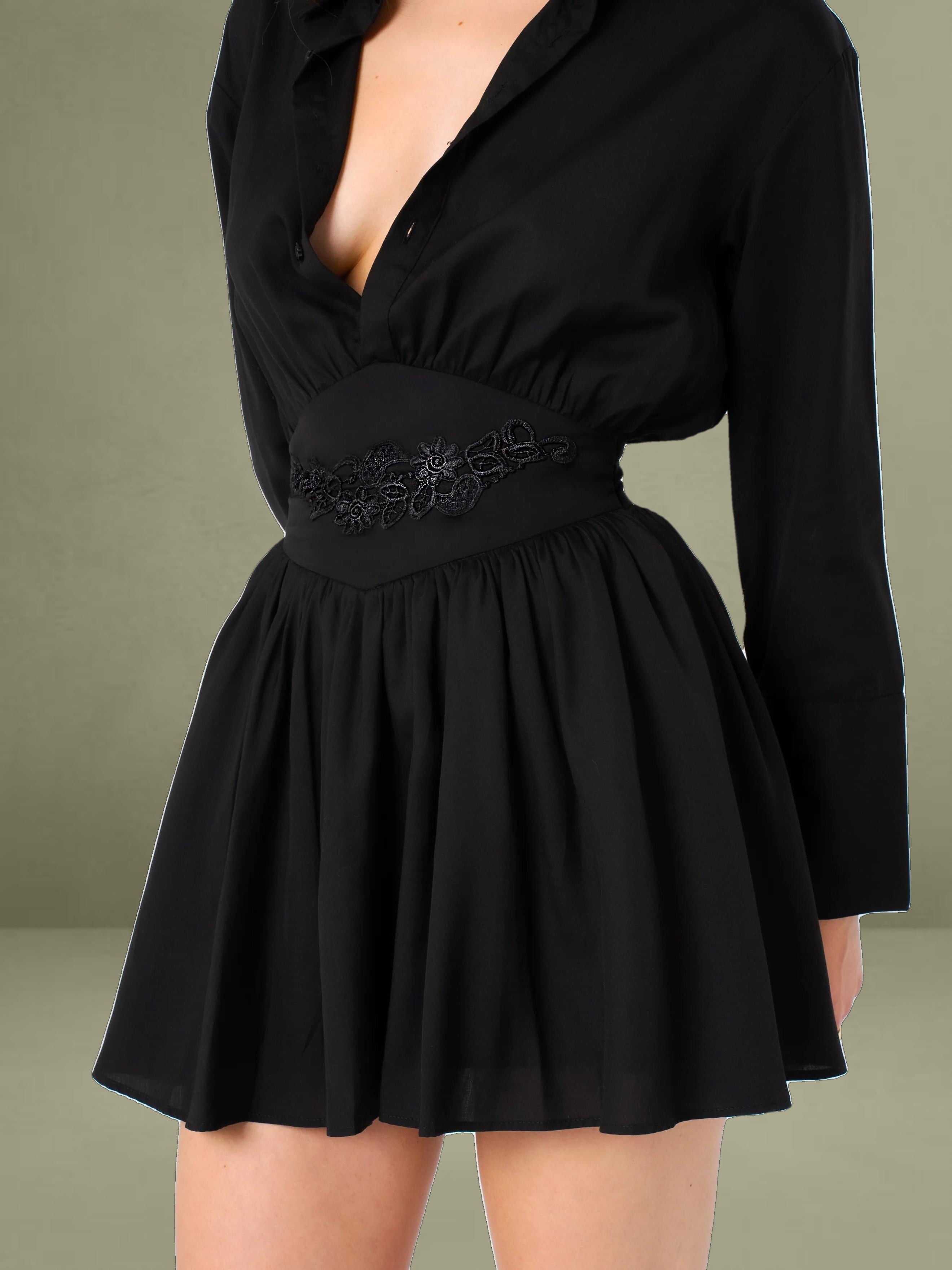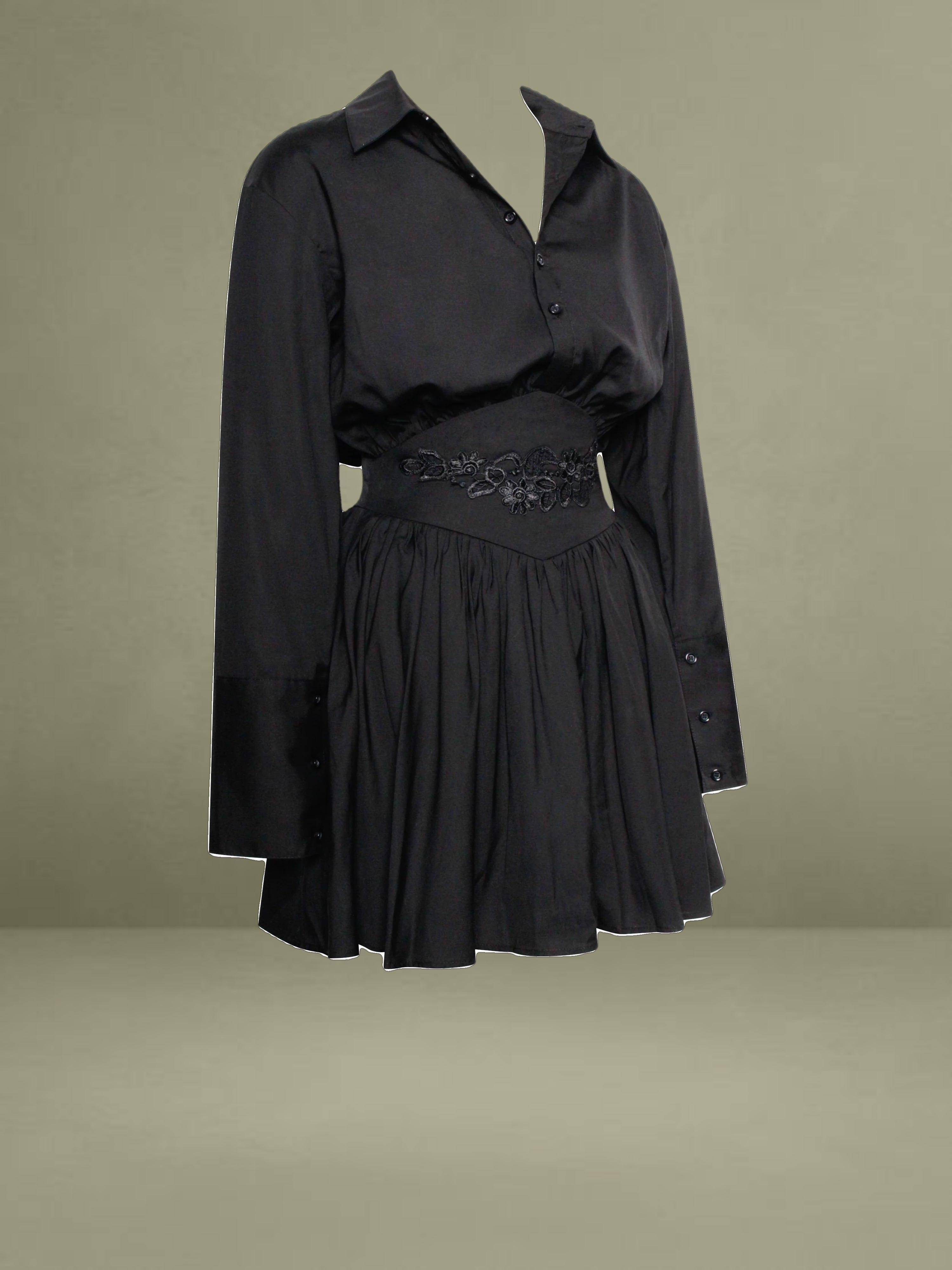 Introducing the Jamila dress, a stylish eco-luxe long-sleeve mini shirt dress designed for both comfort and elegance. The loose-fitting top features a sophisticated long cuff with three buttons, adding a refined touch. The corset waist, adorned with delicate lace decoration, creates a flattering silhouette and adds a hint of romance. An invisible side zipper ensures a seamless fit, enhancing the dress's sleek look. Perfect for any occasion, this dress combines casual charm with chic details, making it a versatile addition to your wardrobe. And it is also available in White.