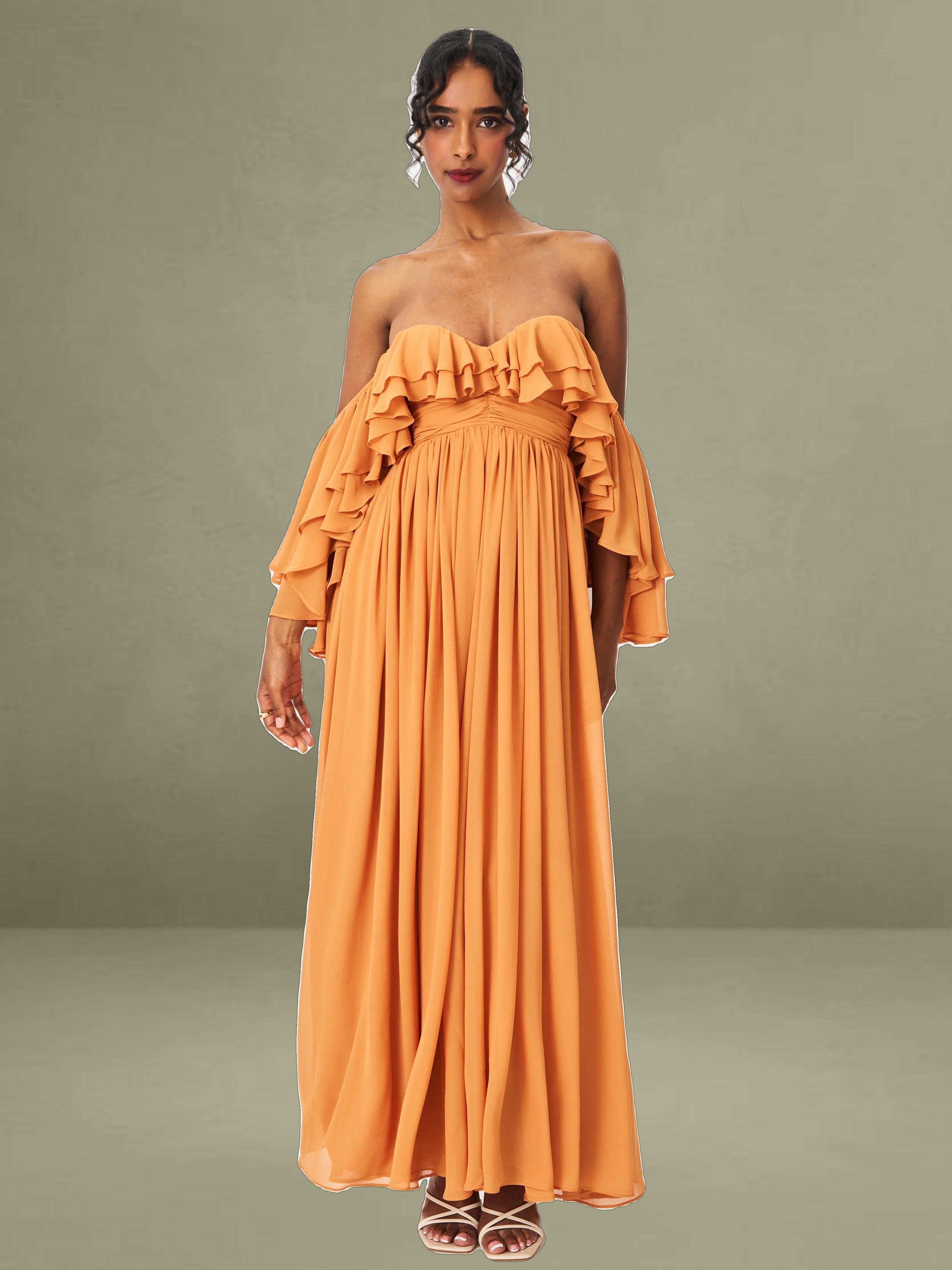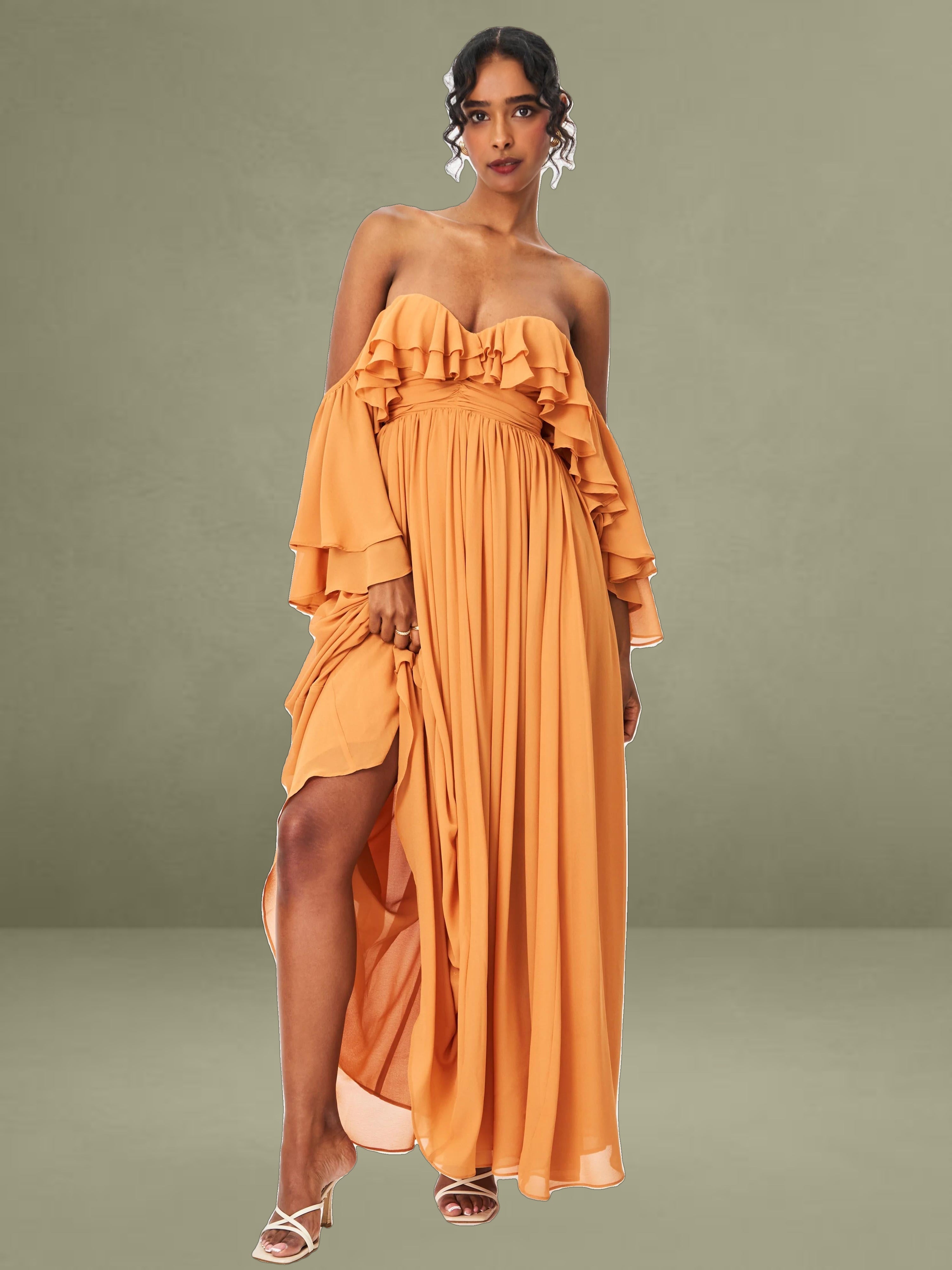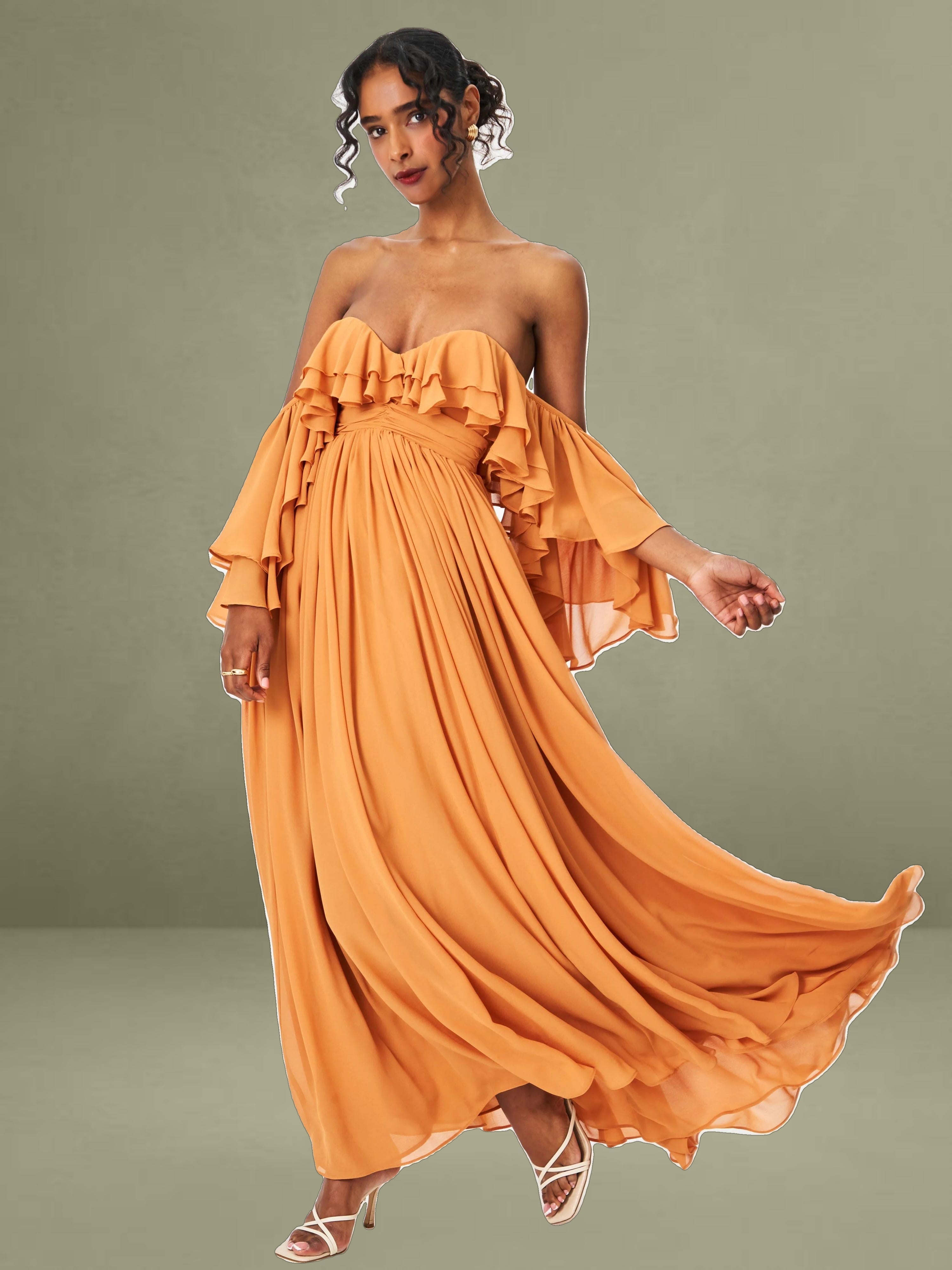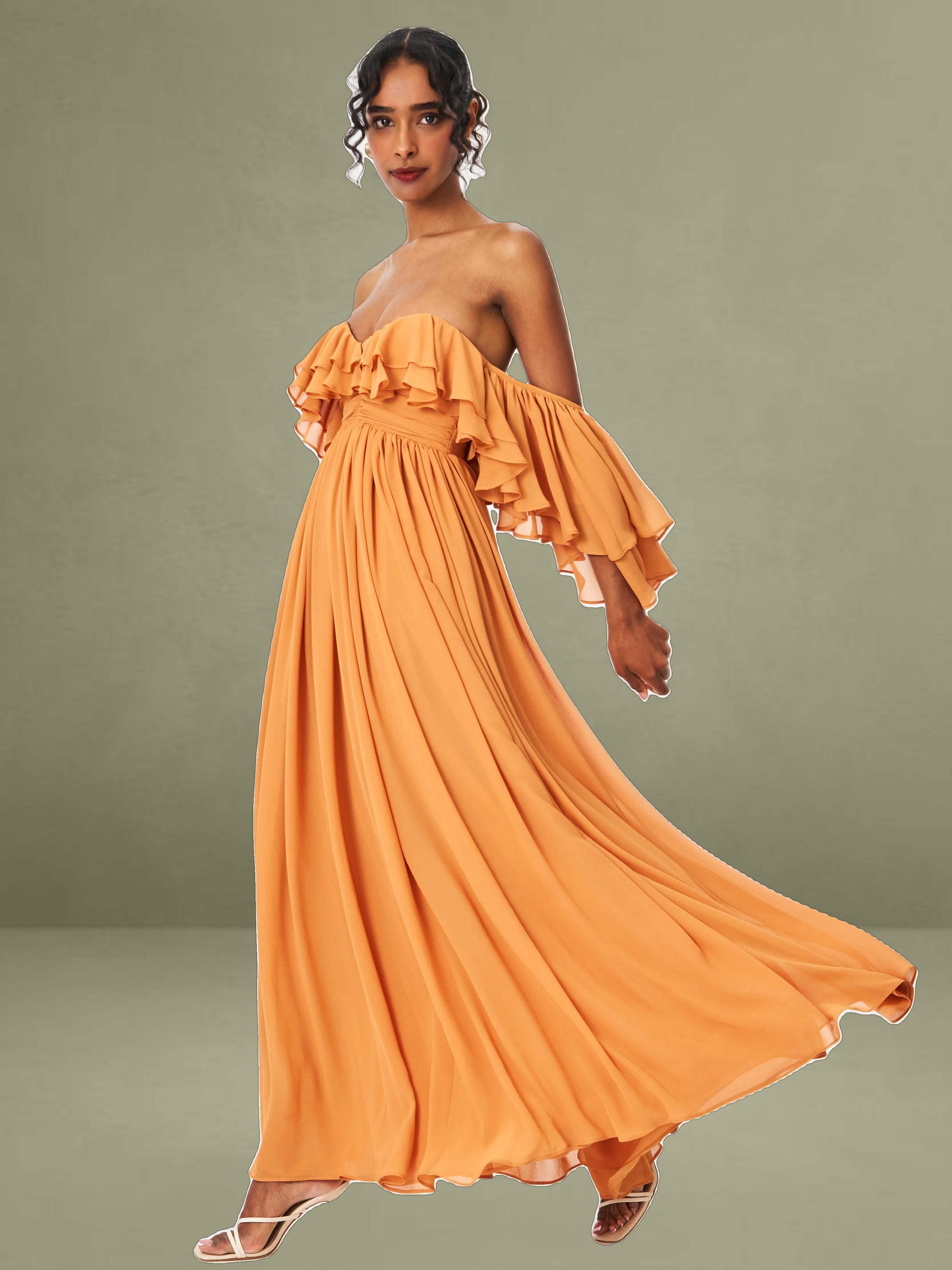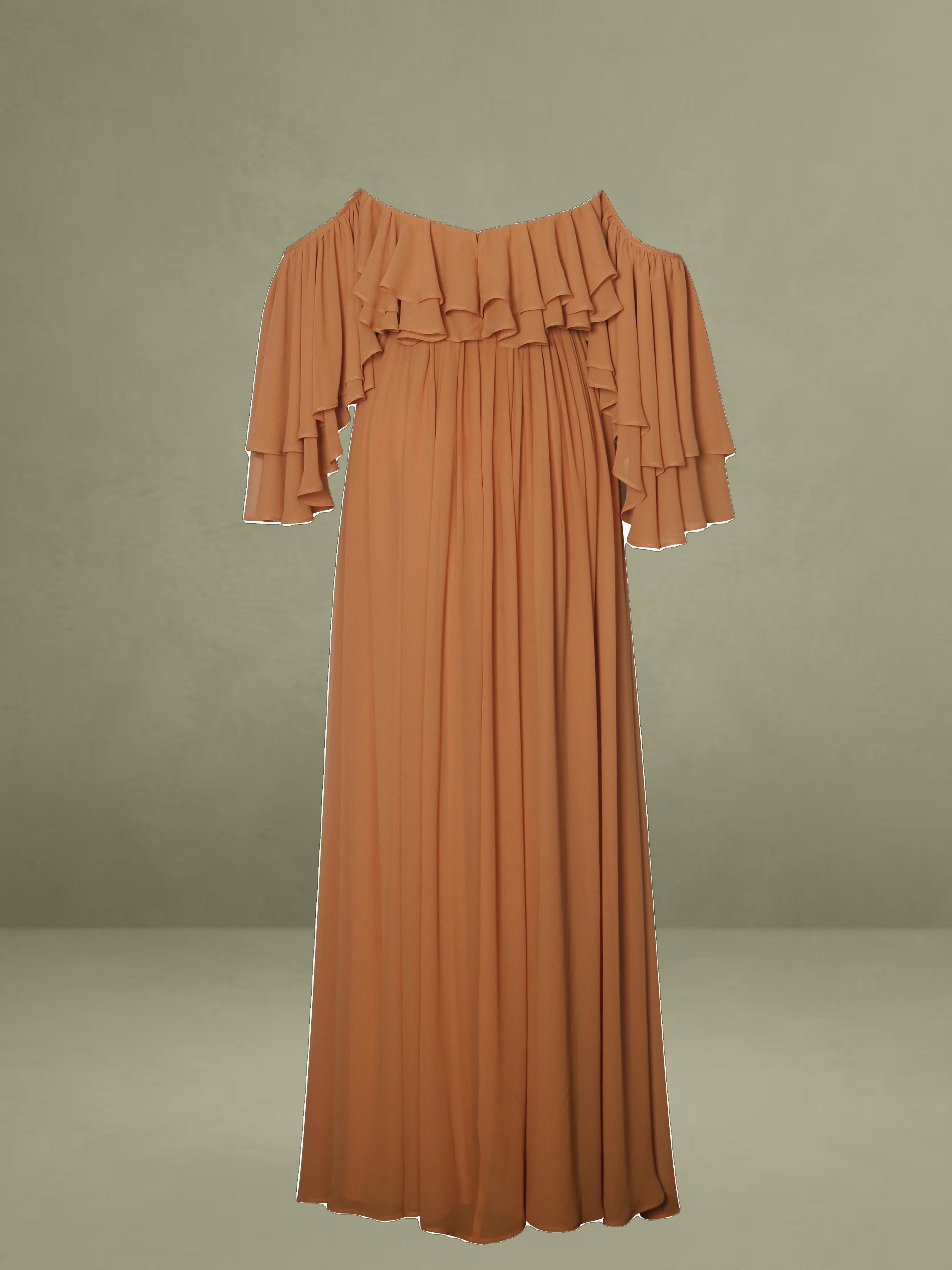 Elevate your getaway wardrobe with the romantic Kaela Dress in a warm brickwork hue. Designed in airy chiffon, this off-shoulder silhouette features delicate ruffle trims that frame the neckline and cascade down its layered maxi skirt. The high waist flatters the figure, while padded cups offer added support and shape. Complete with an invisible zipper and fully lined construction, it's a dreamy choice for holiday escapes, wedding guest looks, or effortless vacation elegance.