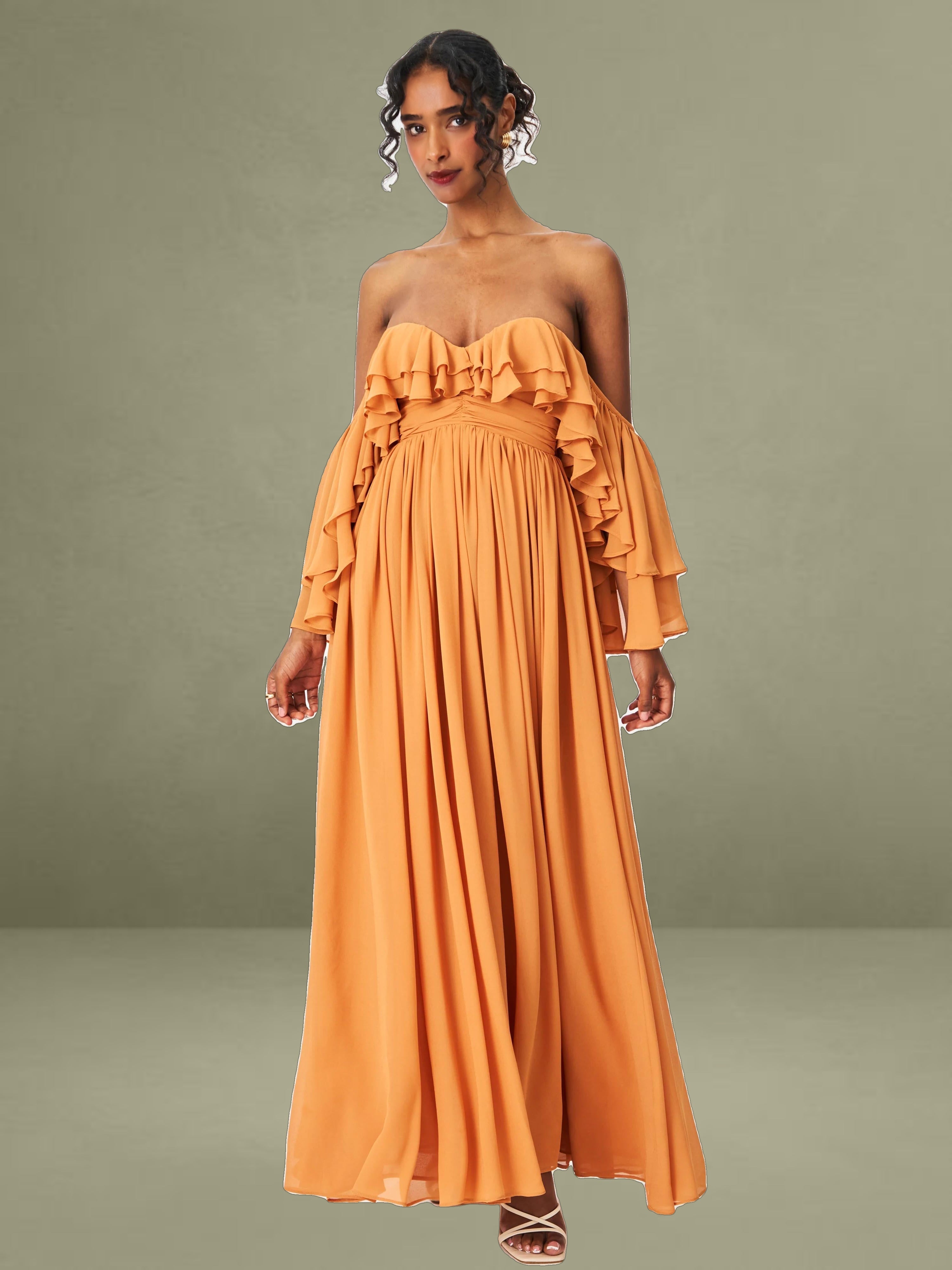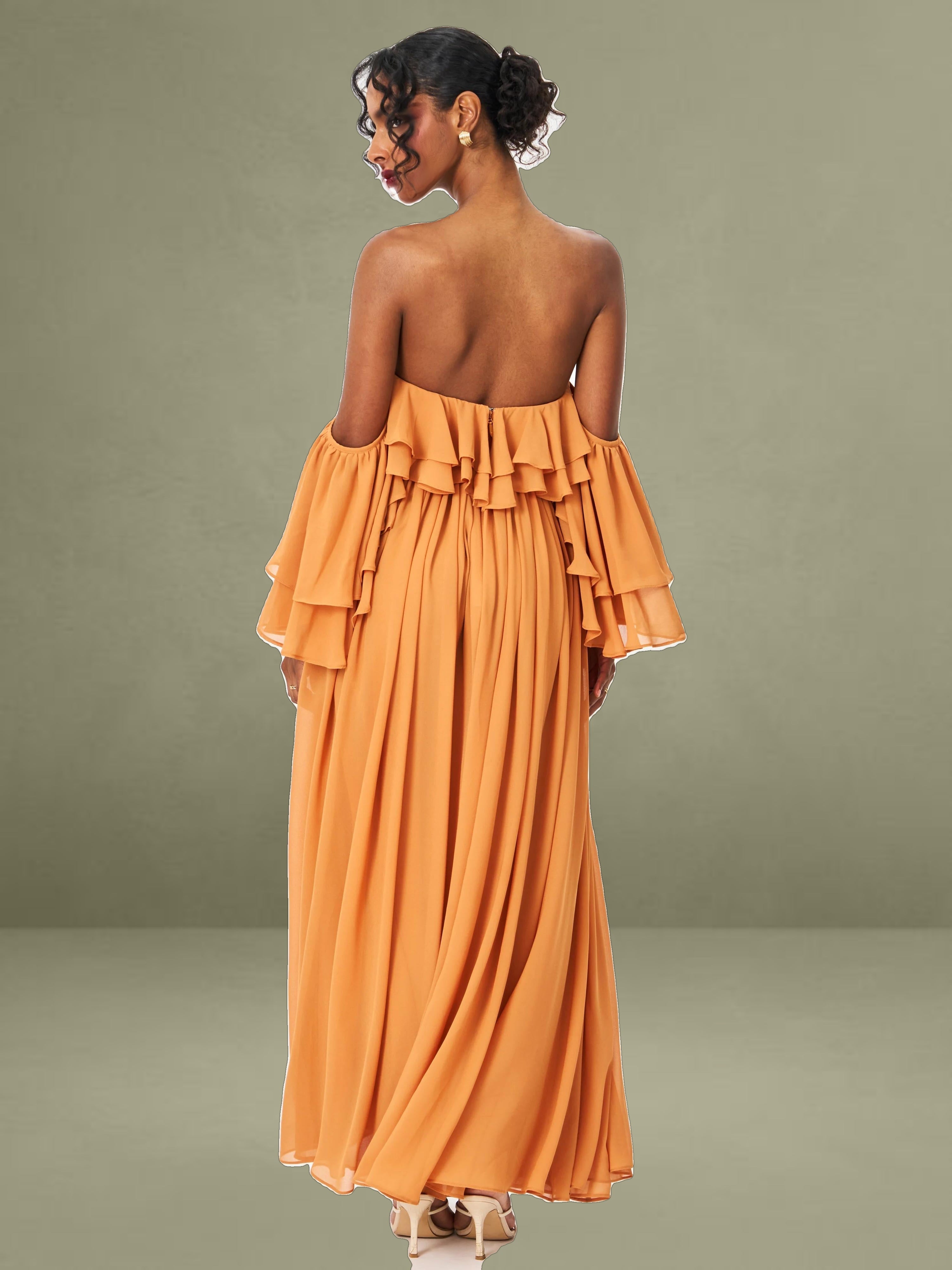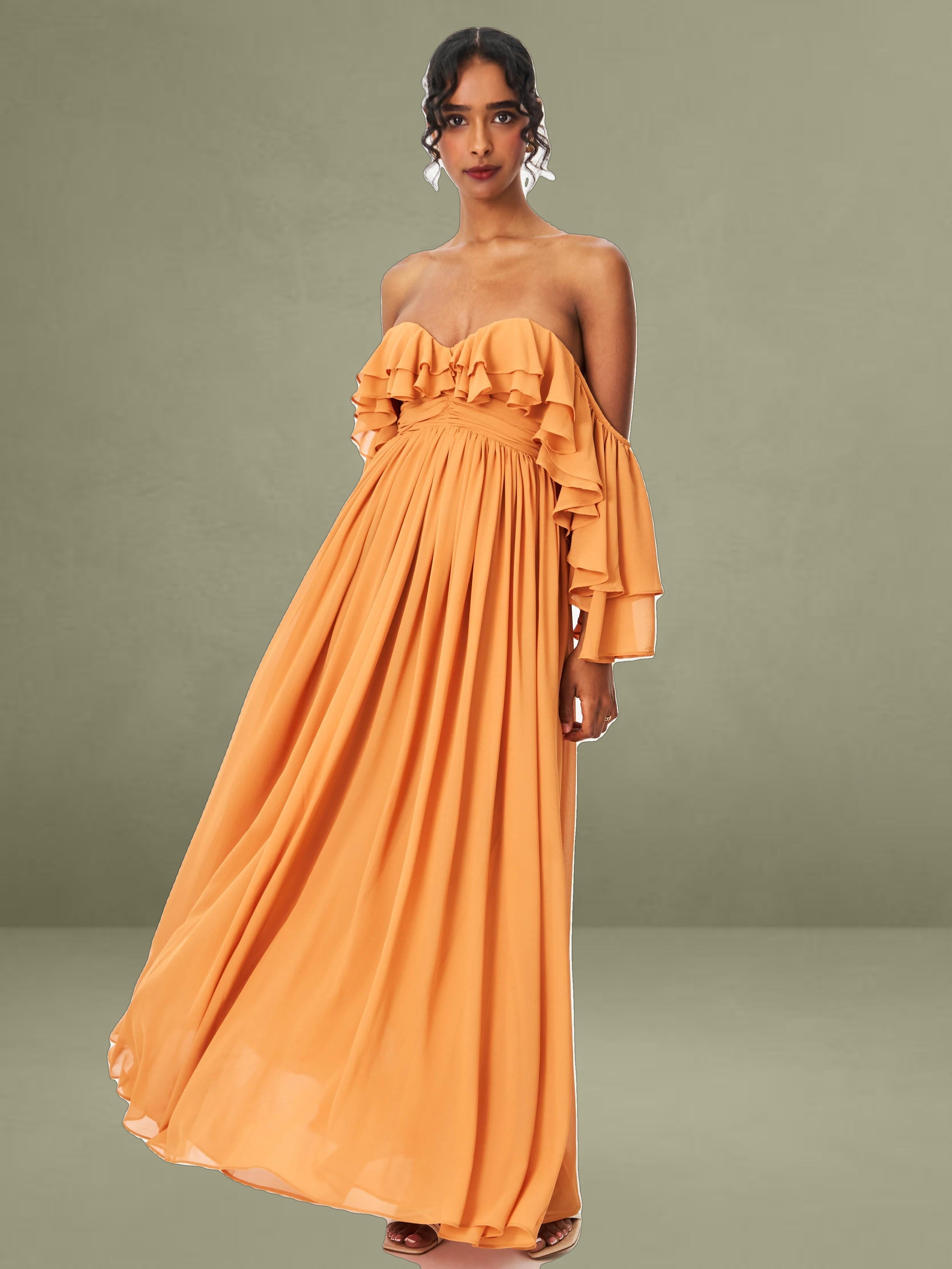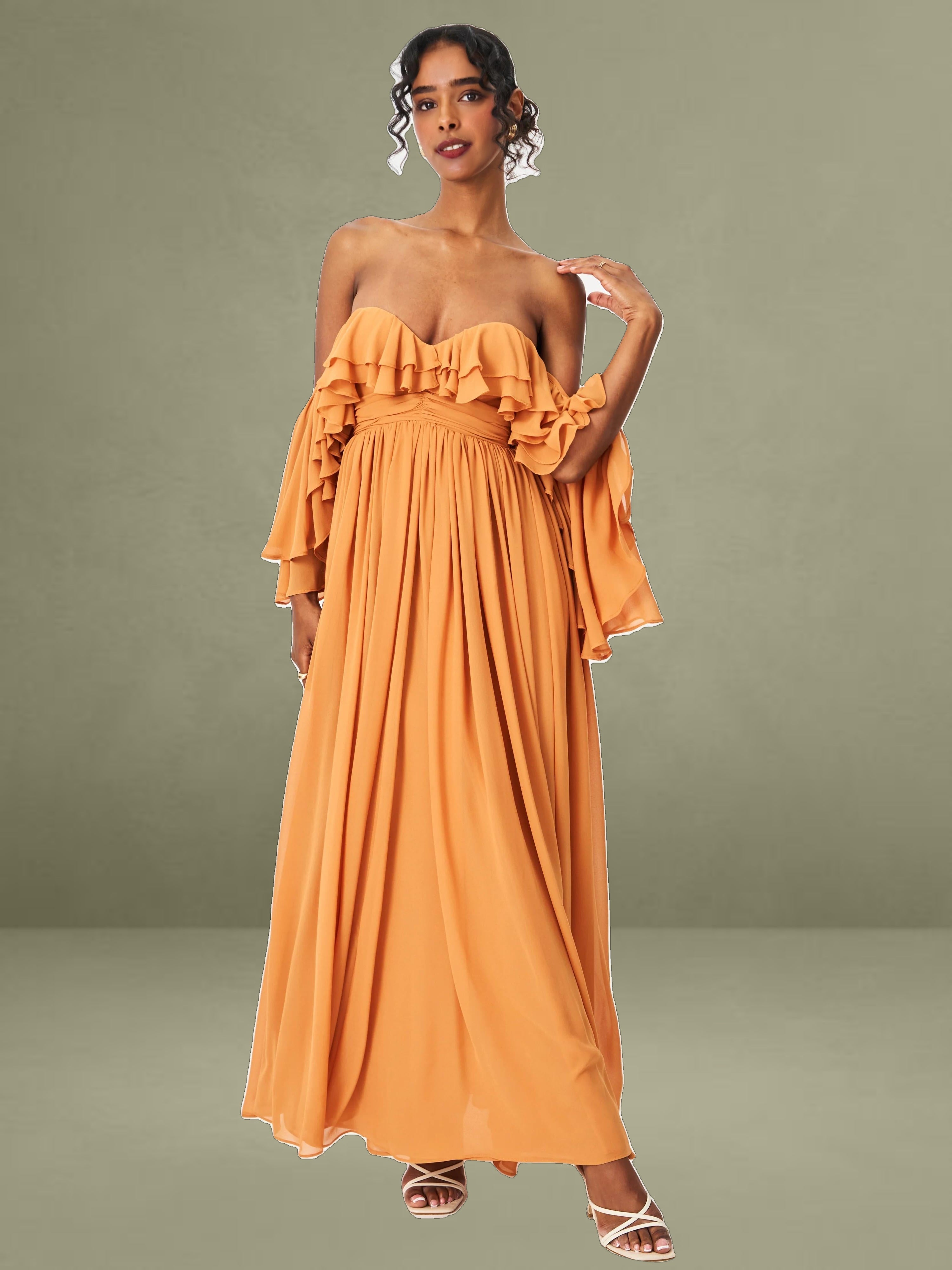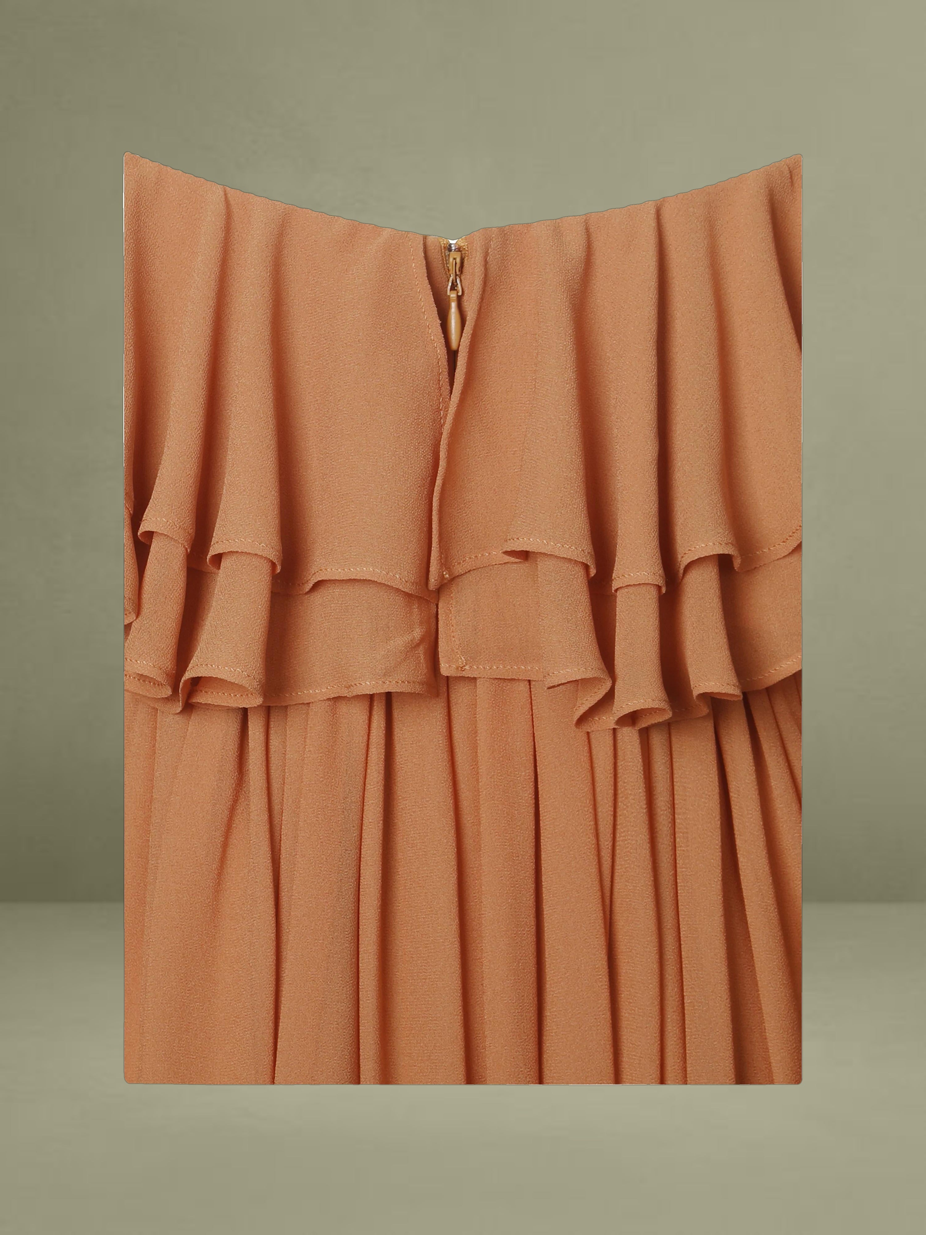 Elevate your getaway wardrobe with the romantic Kaela Dress in a warm brickwork hue. Designed in airy chiffon, this off-shoulder silhouette features delicate ruffle trims that frame the neckline and cascade down its layered maxi skirt. The high waist flatters the figure, while padded cups offer added support and shape. Complete with an invisible zipper and fully lined construction, it's a dreamy choice for holiday escapes, wedding guest looks, or effortless vacation elegance.
