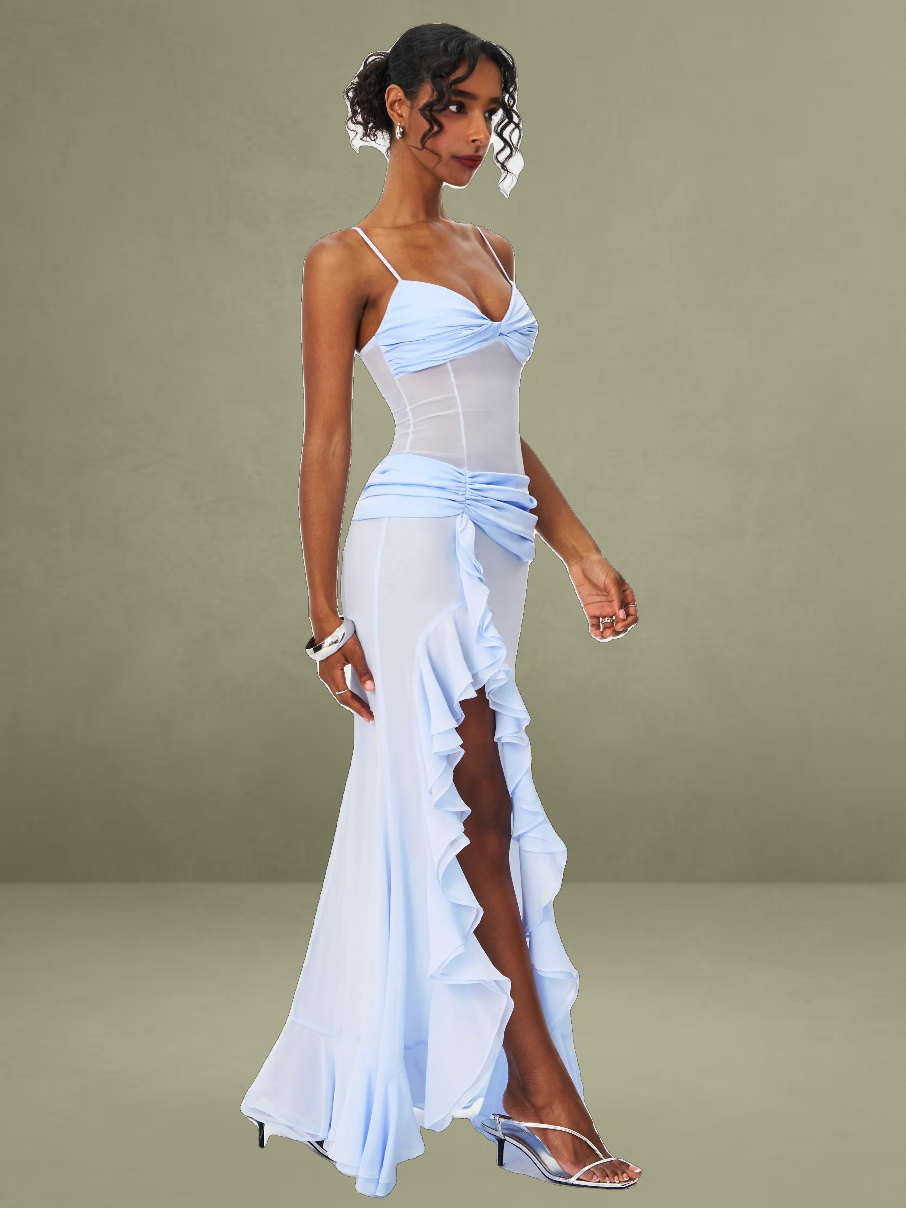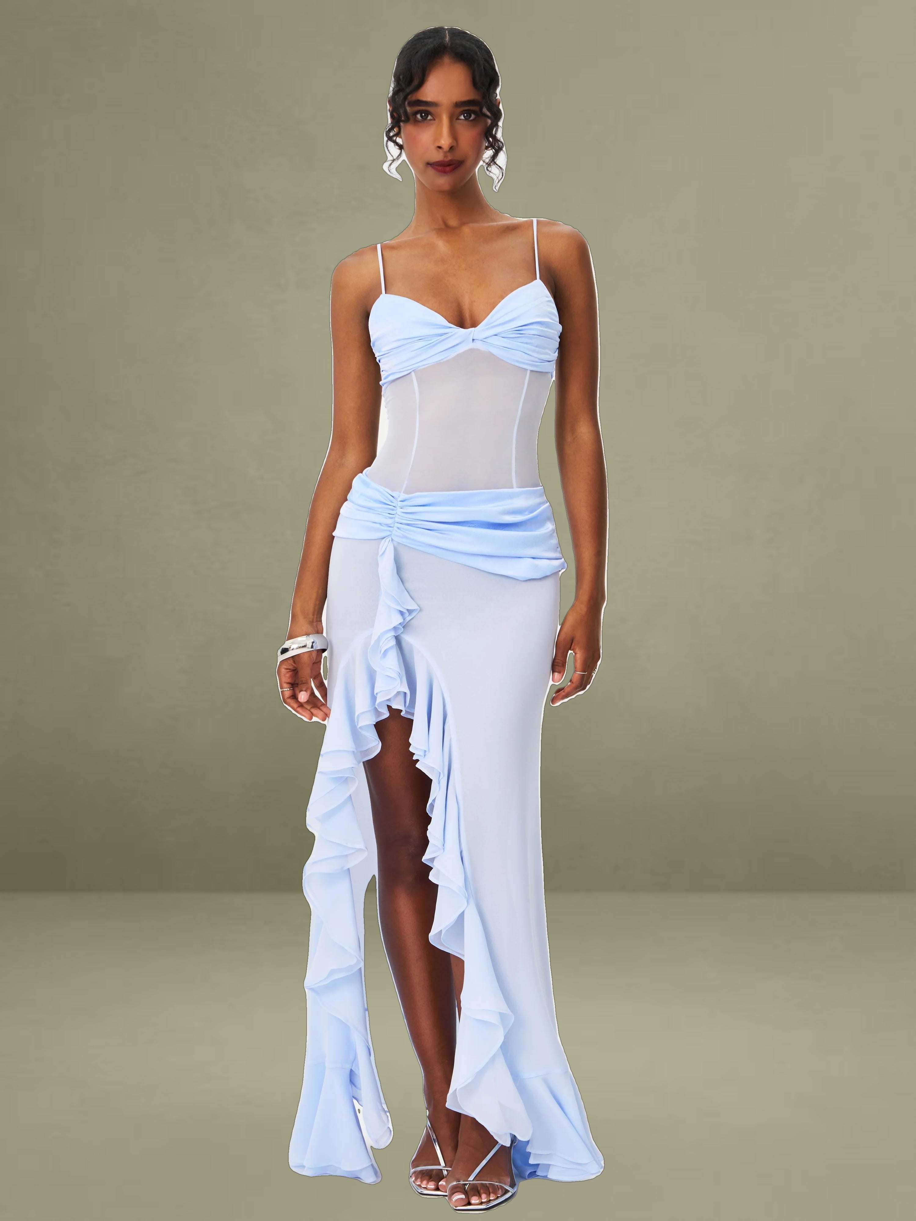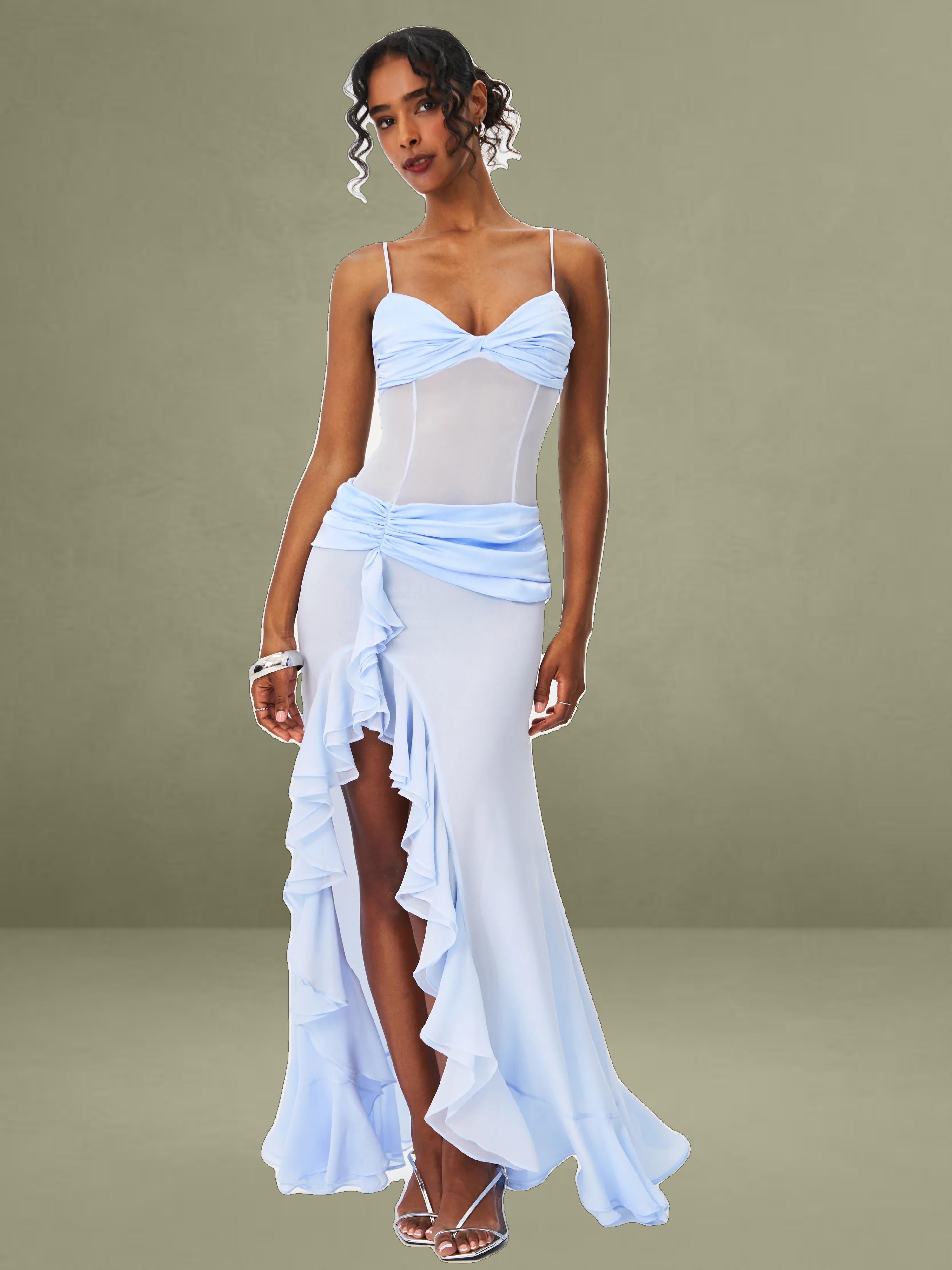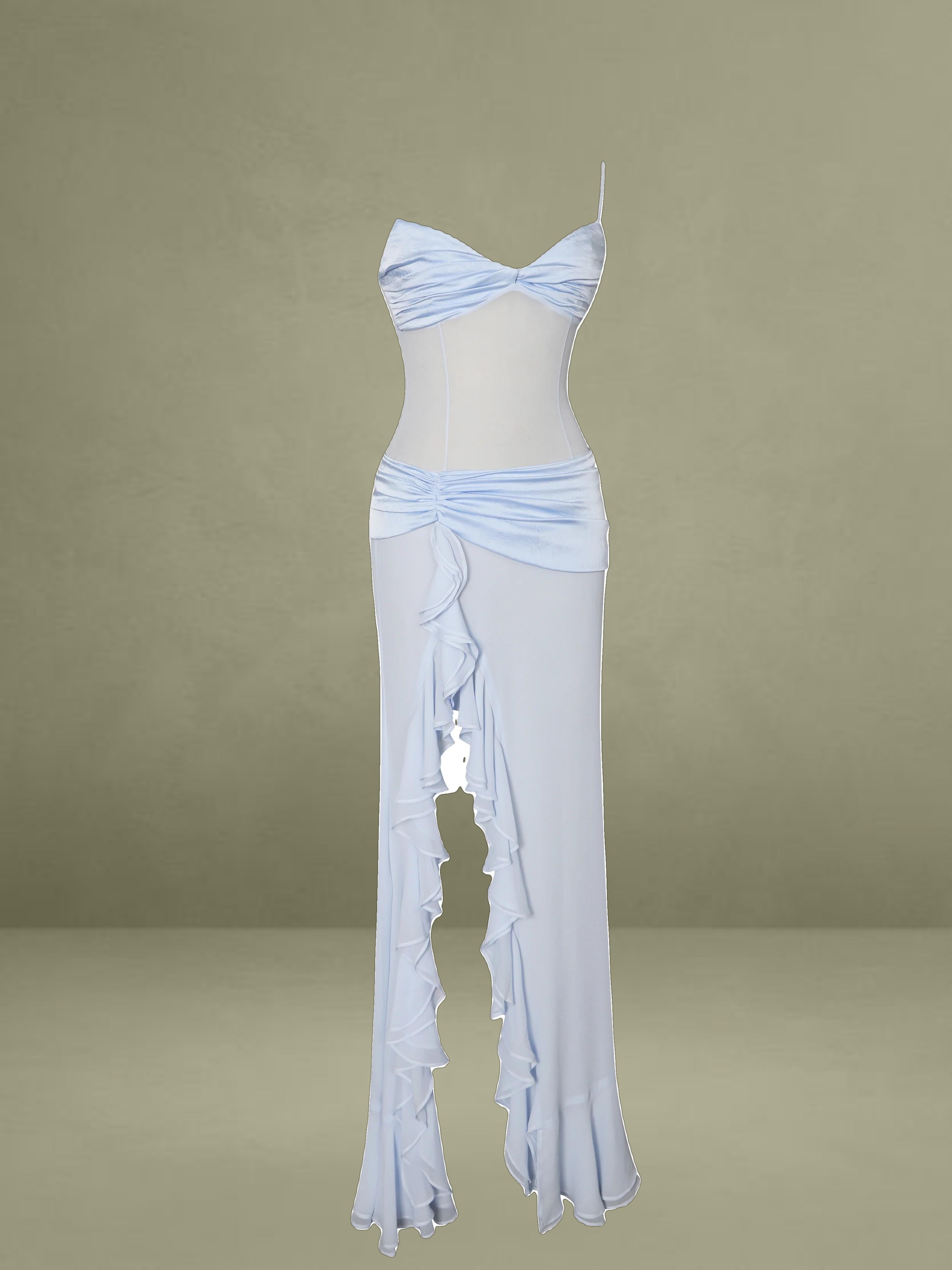 Flowy, feminine, and perfect for your dreamiest escapes—the Lacy Dress is a blue chiffon maxi gown that captures the essence of summer and Mermaid core elegance. With a ruched breast, satin ruffle flares, and a dramatic high slit, this sheer gown floats with every step. Designed with a drop waist, adjustable straps, and an invisible zipper for a seamless fit, it’s your go-to for vacations, holidays, and unforgettable parties by the sea.