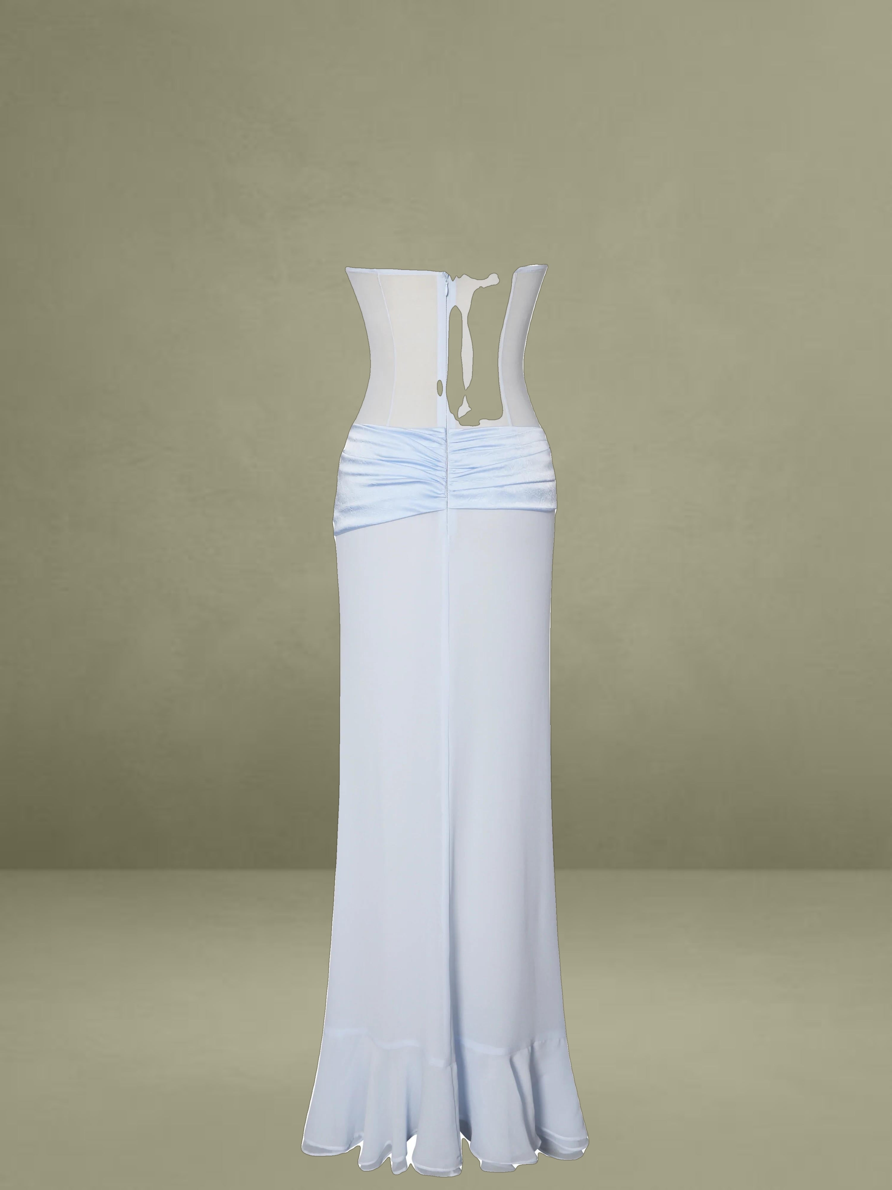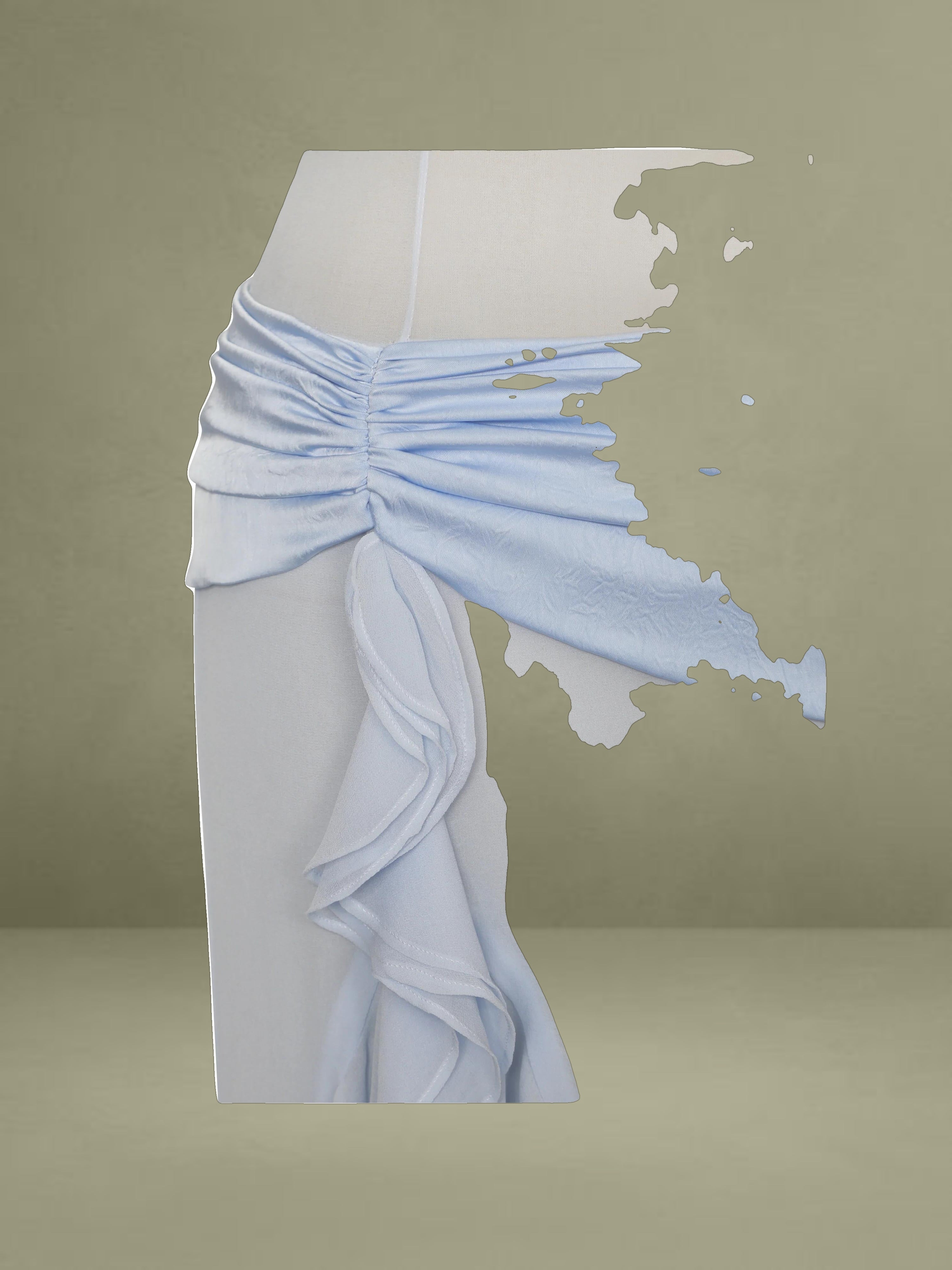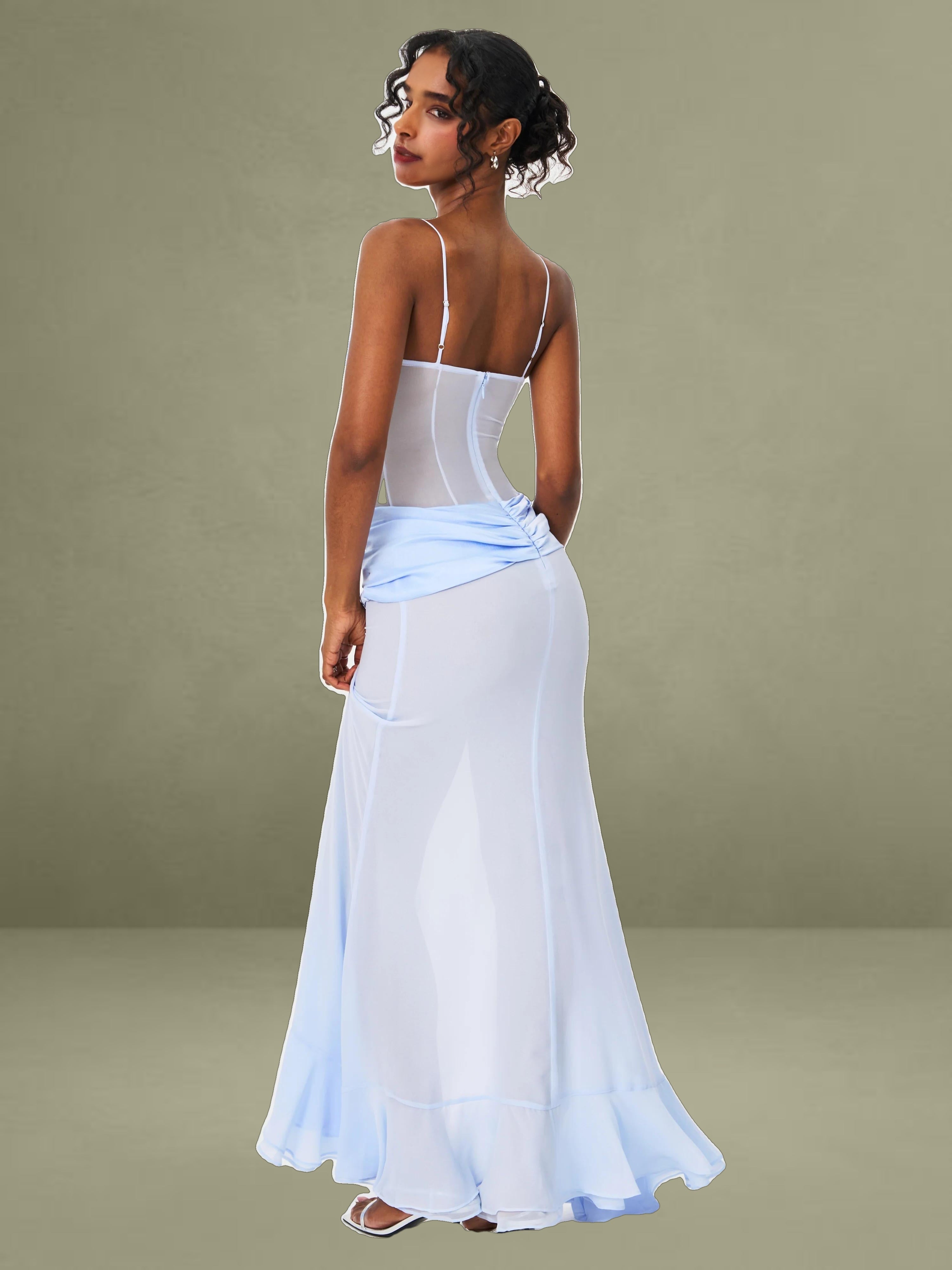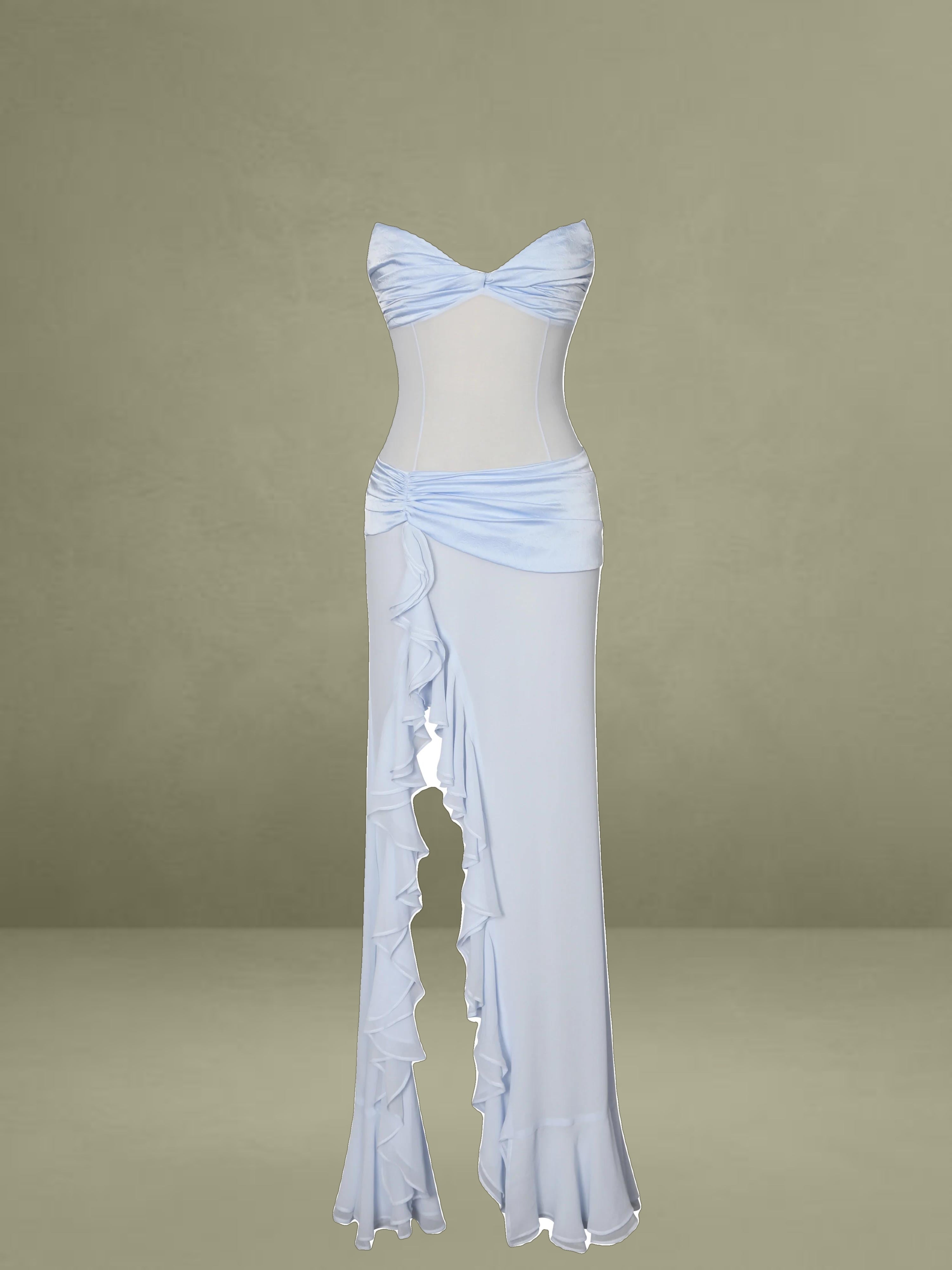 Flowy, feminine, and perfect for your dreamiest escapes—the Lacy Dress is a blue chiffon maxi gown that captures the essence of summer and Mermaid core elegance. With a ruched breast, satin ruffle flares, and a dramatic high slit, this sheer gown floats with every step. Designed with a drop waist, adjustable straps, and an invisible zipper for a seamless fit, it’s your go-to for vacations, holidays, and unforgettable parties by the sea.