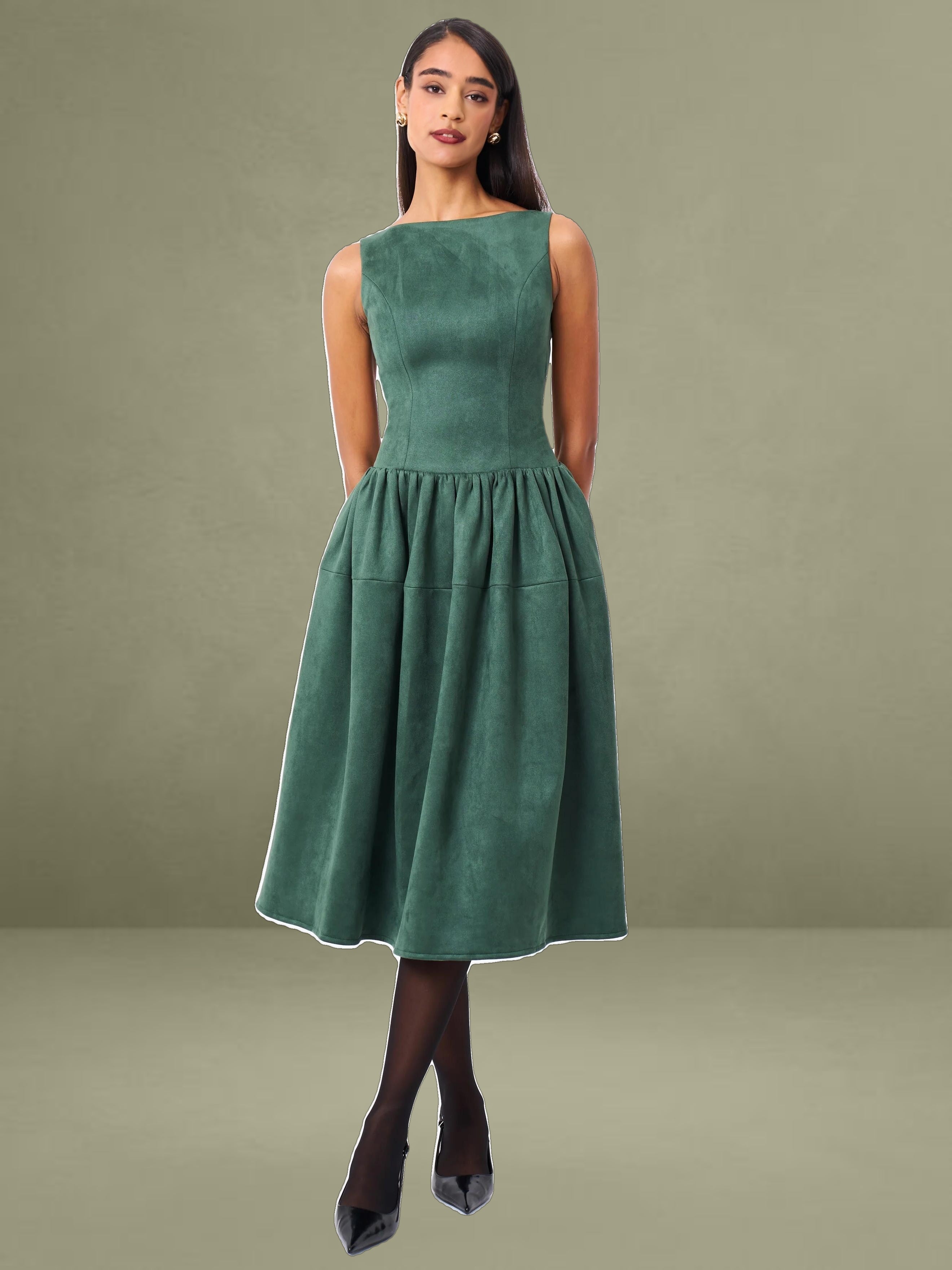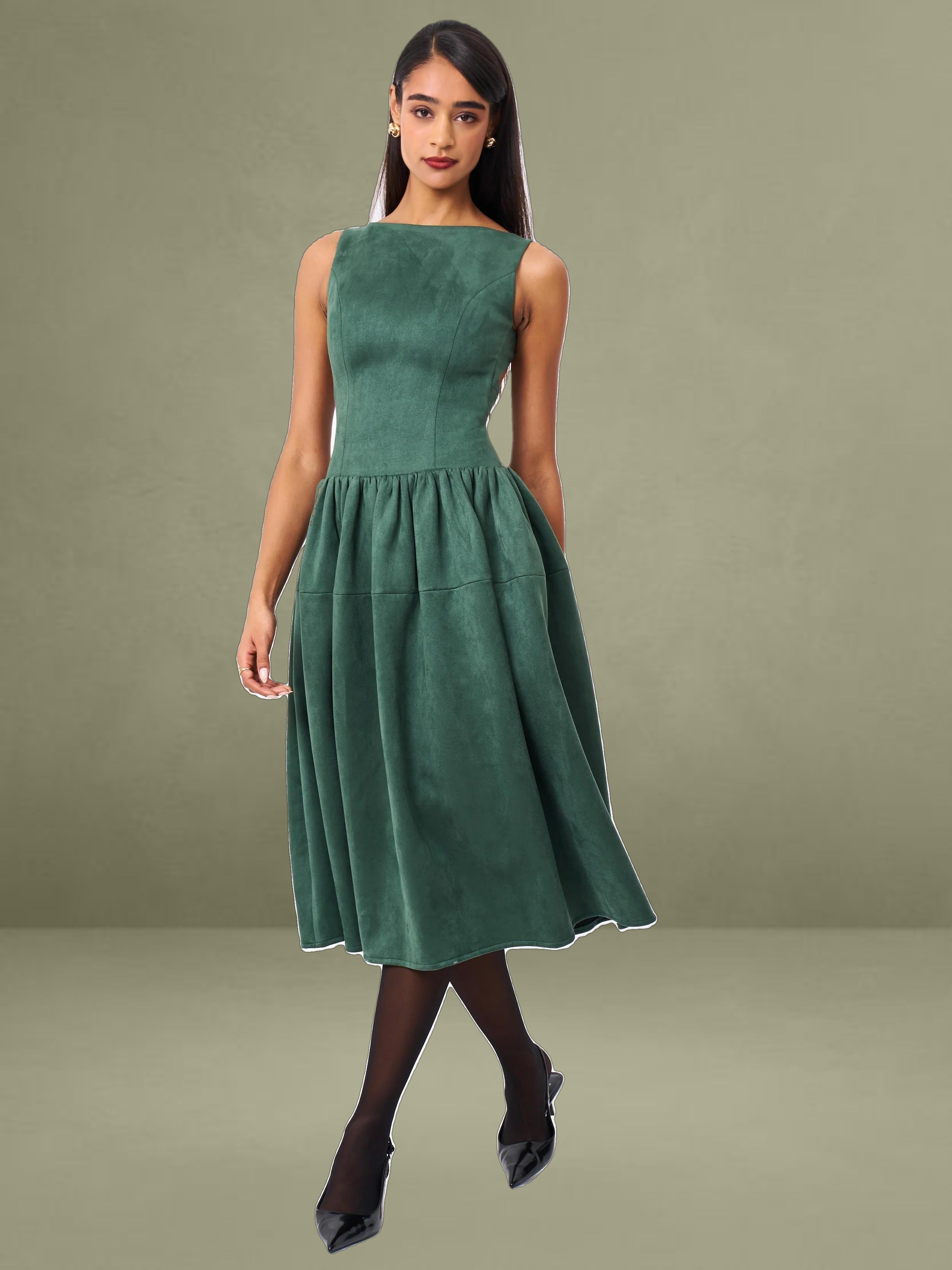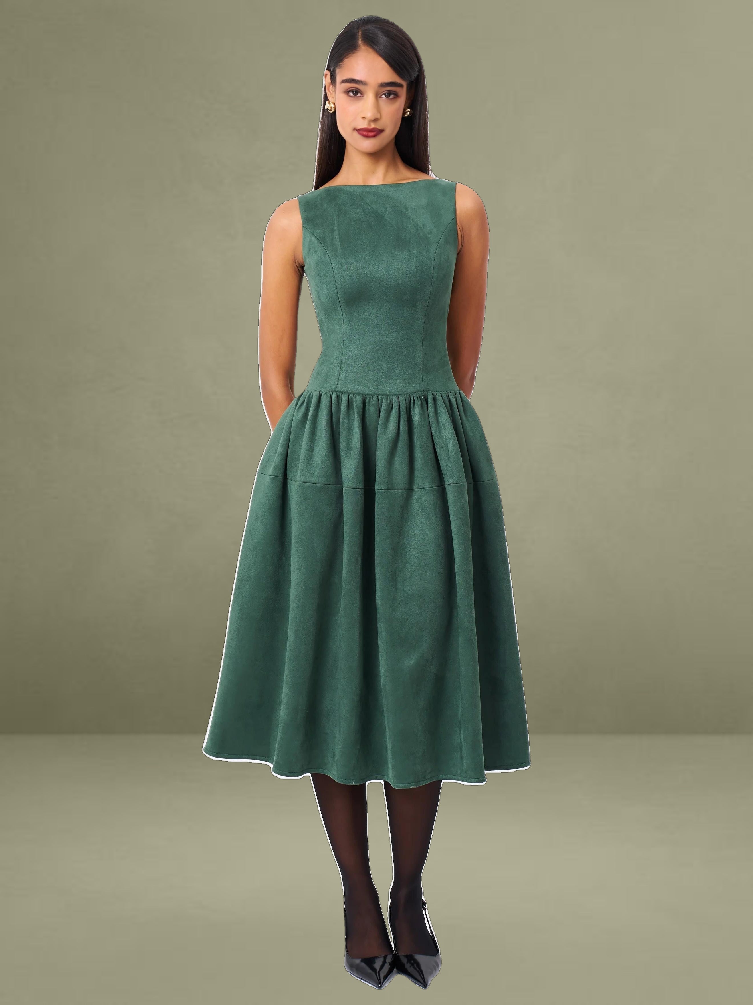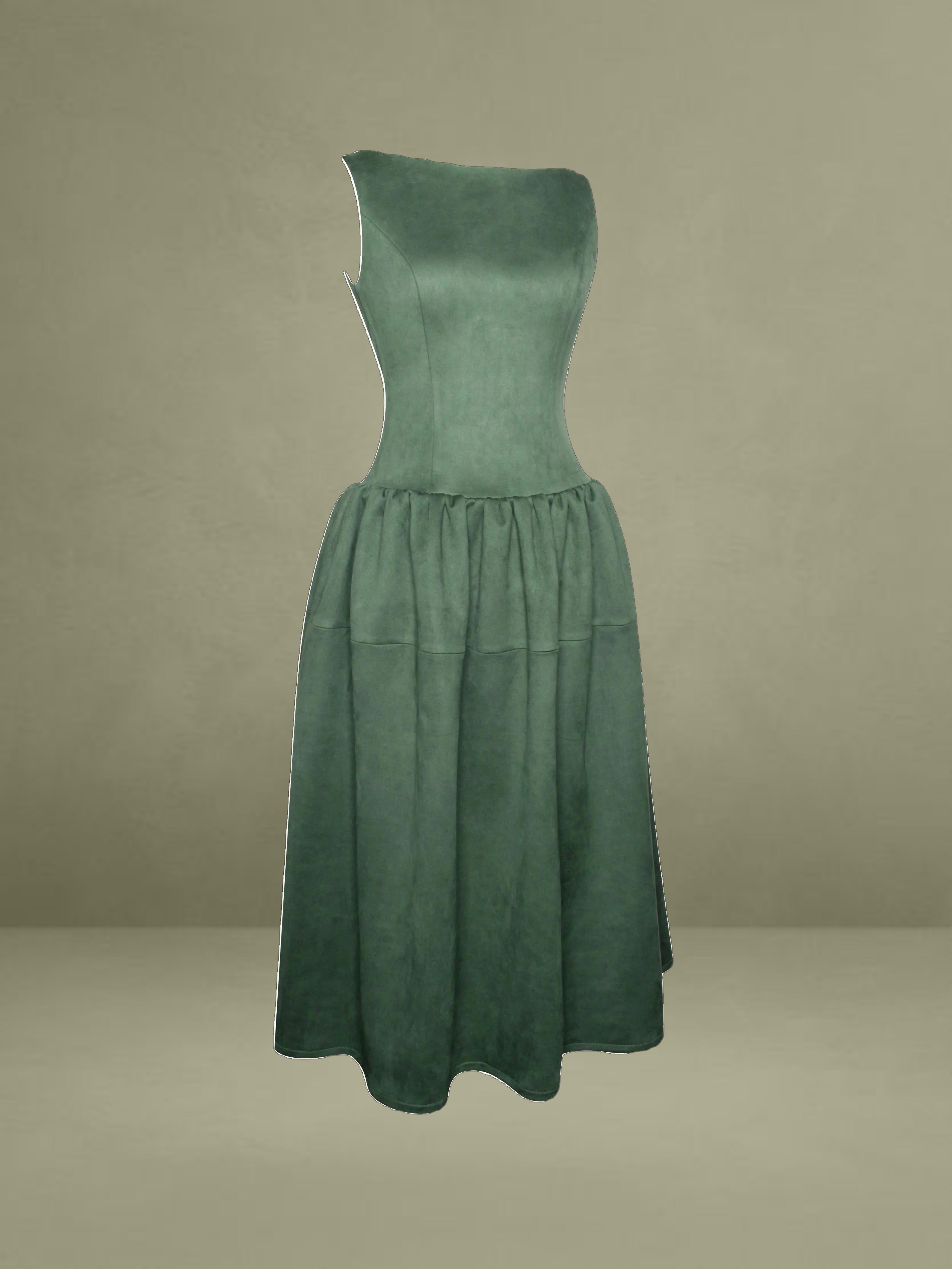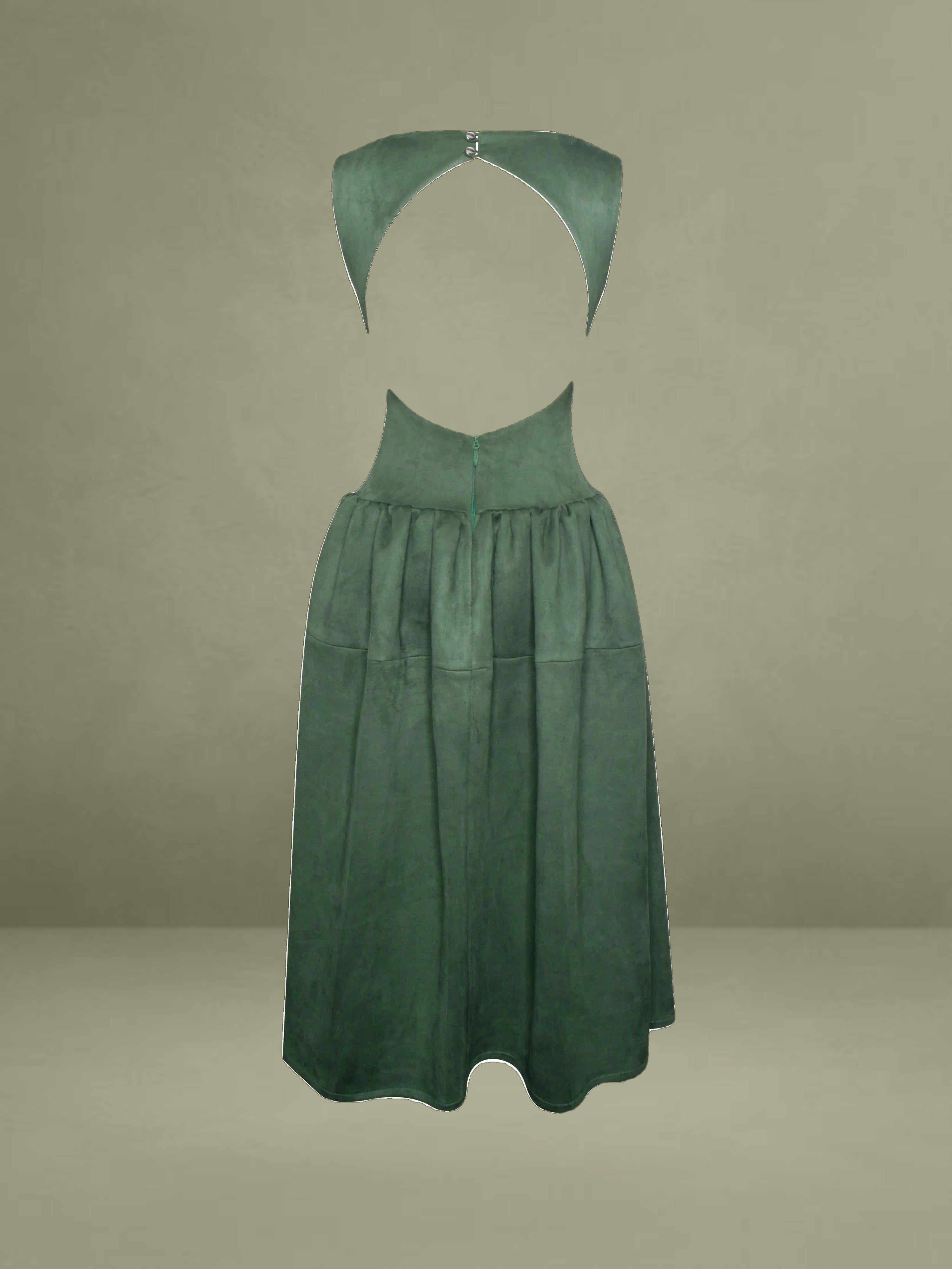 Introducing the Laila Dress, a captivating blend of elegance and playful sophistication. Crafted from luxurious green suede, this dress features a chic boat neck design that exudes understated charm. The highlight is the striking rhombic backless detail, adding a bold and unique touch. The drop waist silhouette transitions into a pleated full skirt, creating graceful movement with every step. Thoughtfully designed with pockets for functionality and an invisible zipper for a seamless finish, the fully lined Laila Dress is a perfect choice for both style and comfort.