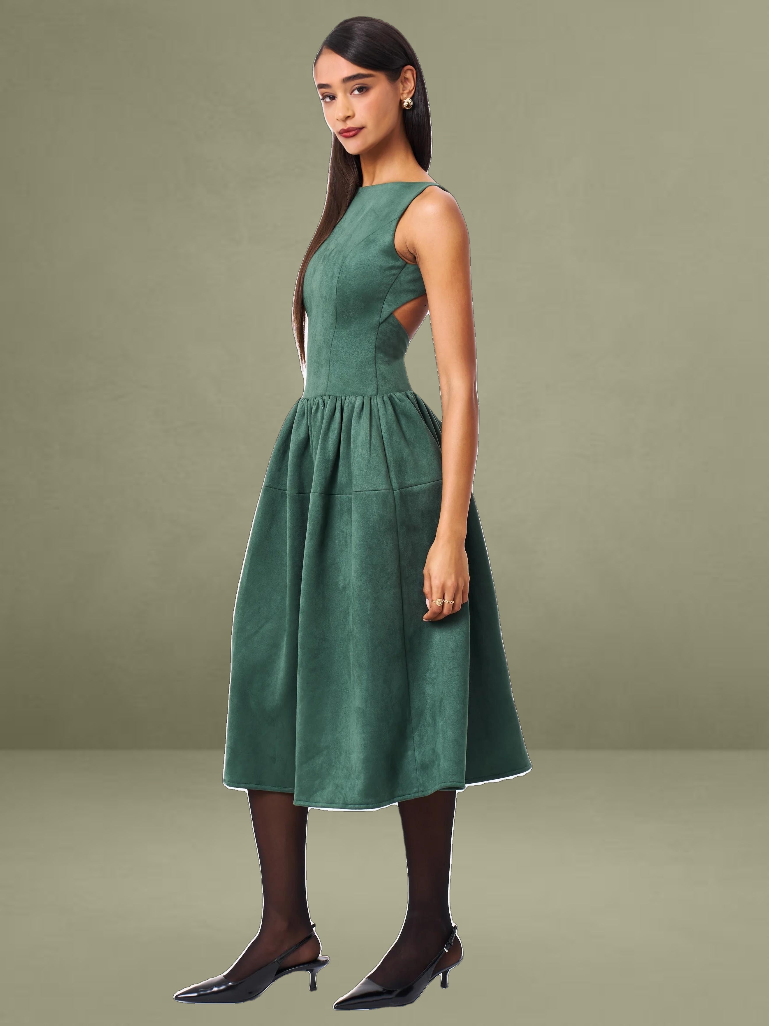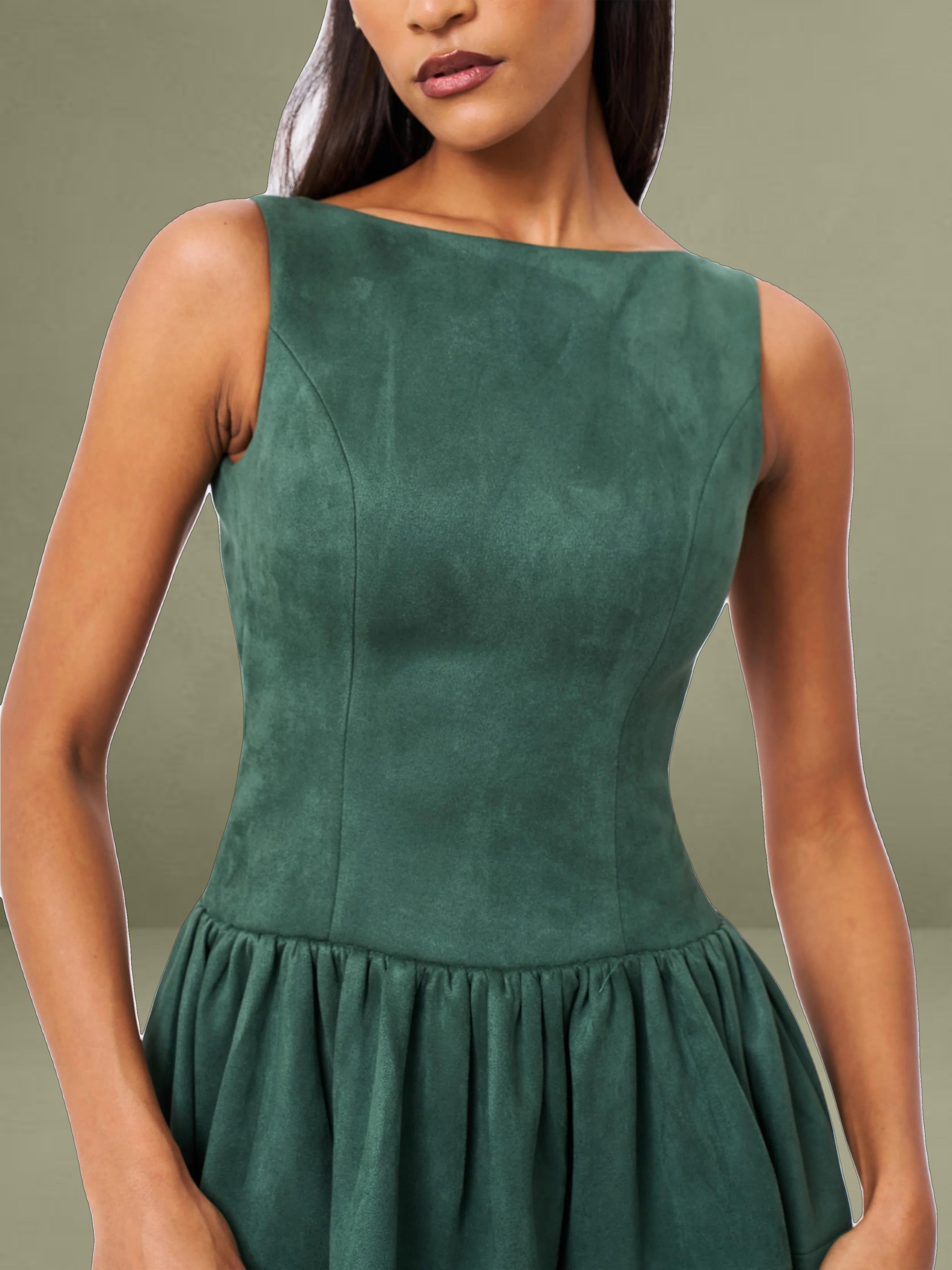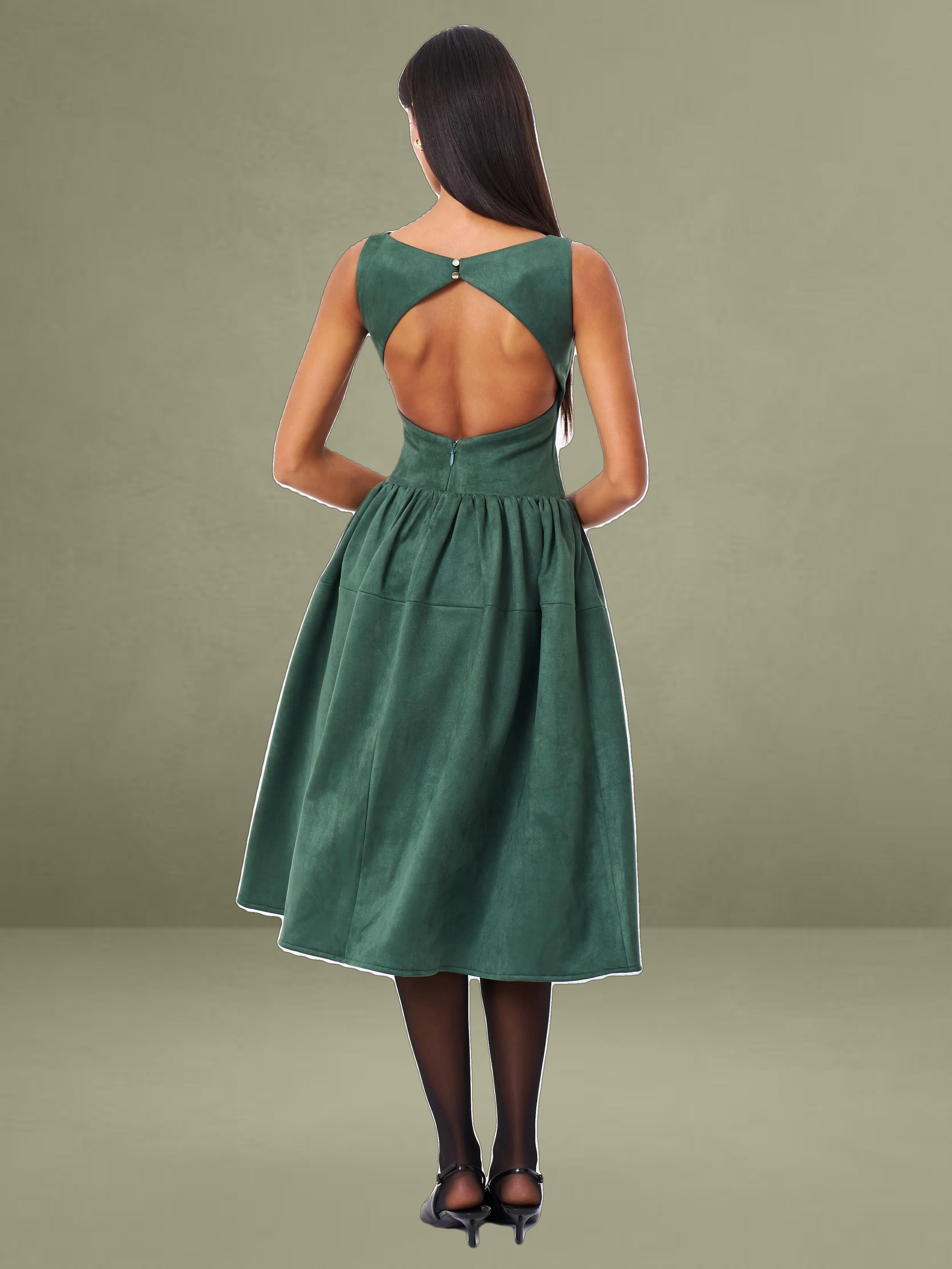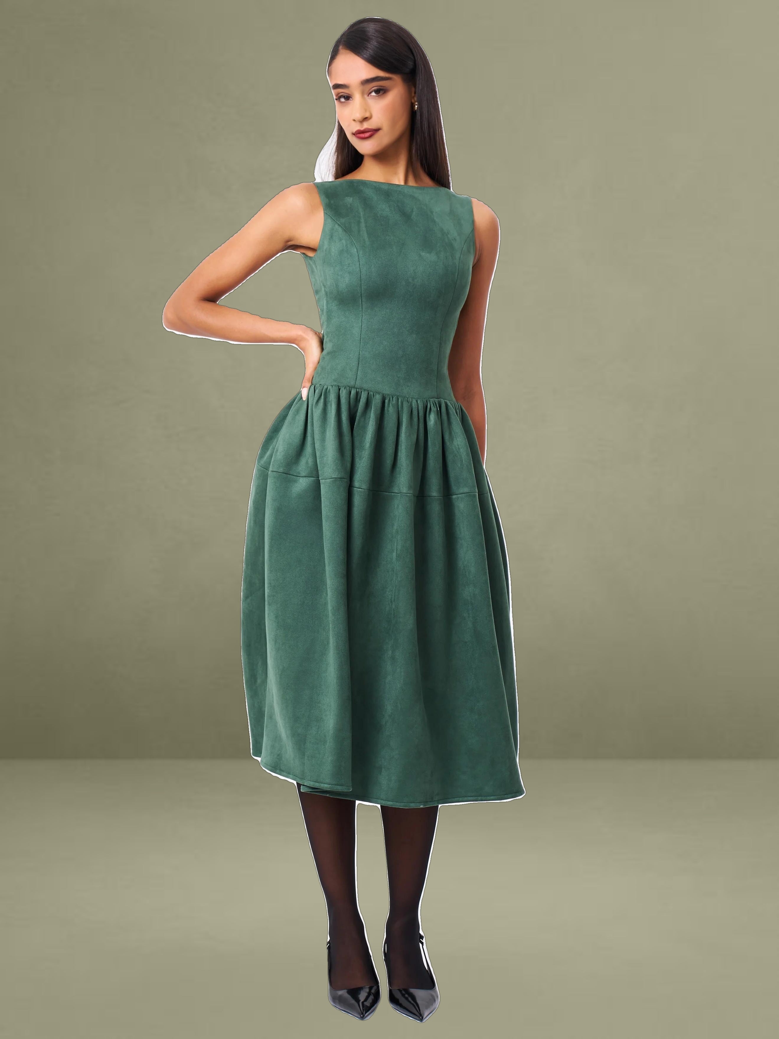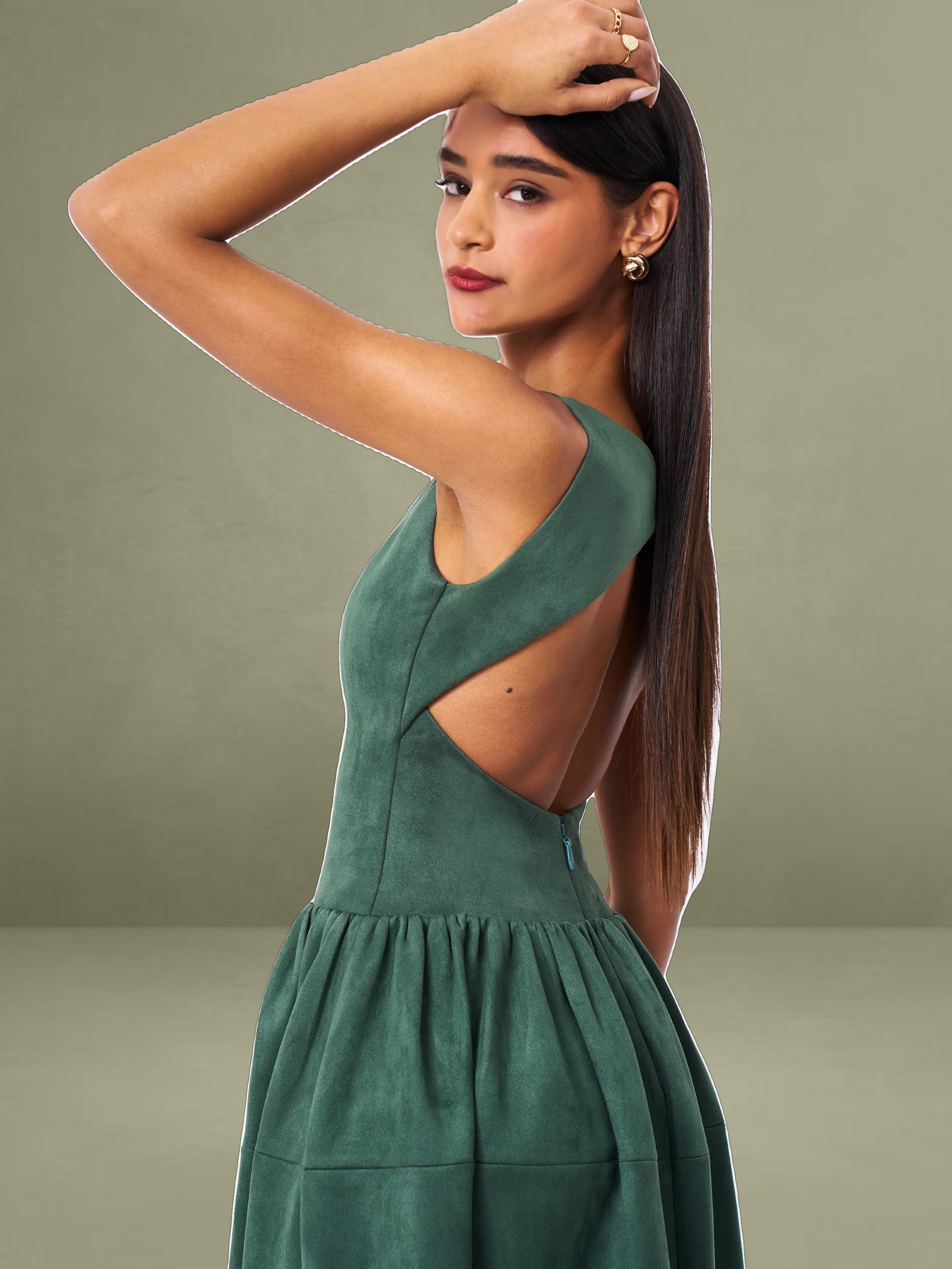Introducing the Laila Dress, a captivating blend of elegance and playful sophistication. Crafted from luxurious green suede, this dress features a chic boat neck design that exudes understated charm. The highlight is the striking rhombic backless detail, adding a bold and unique touch. The drop waist silhouette transitions into a pleated full skirt, creating graceful movement with every step. Thoughtfully designed with pockets for functionality and an invisible zipper for a seamless finish, the fully lined Laila Dress is a perfect choice for both style and comfort.