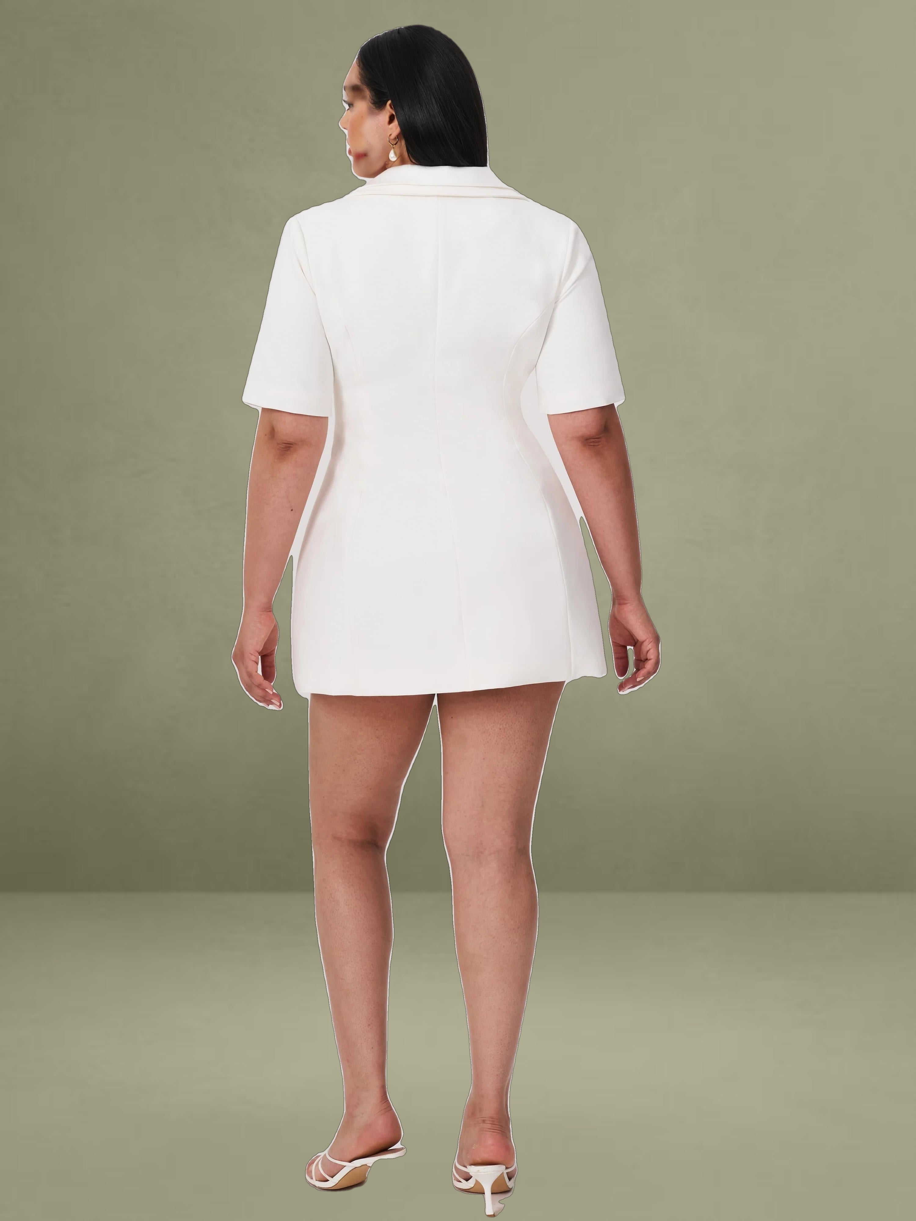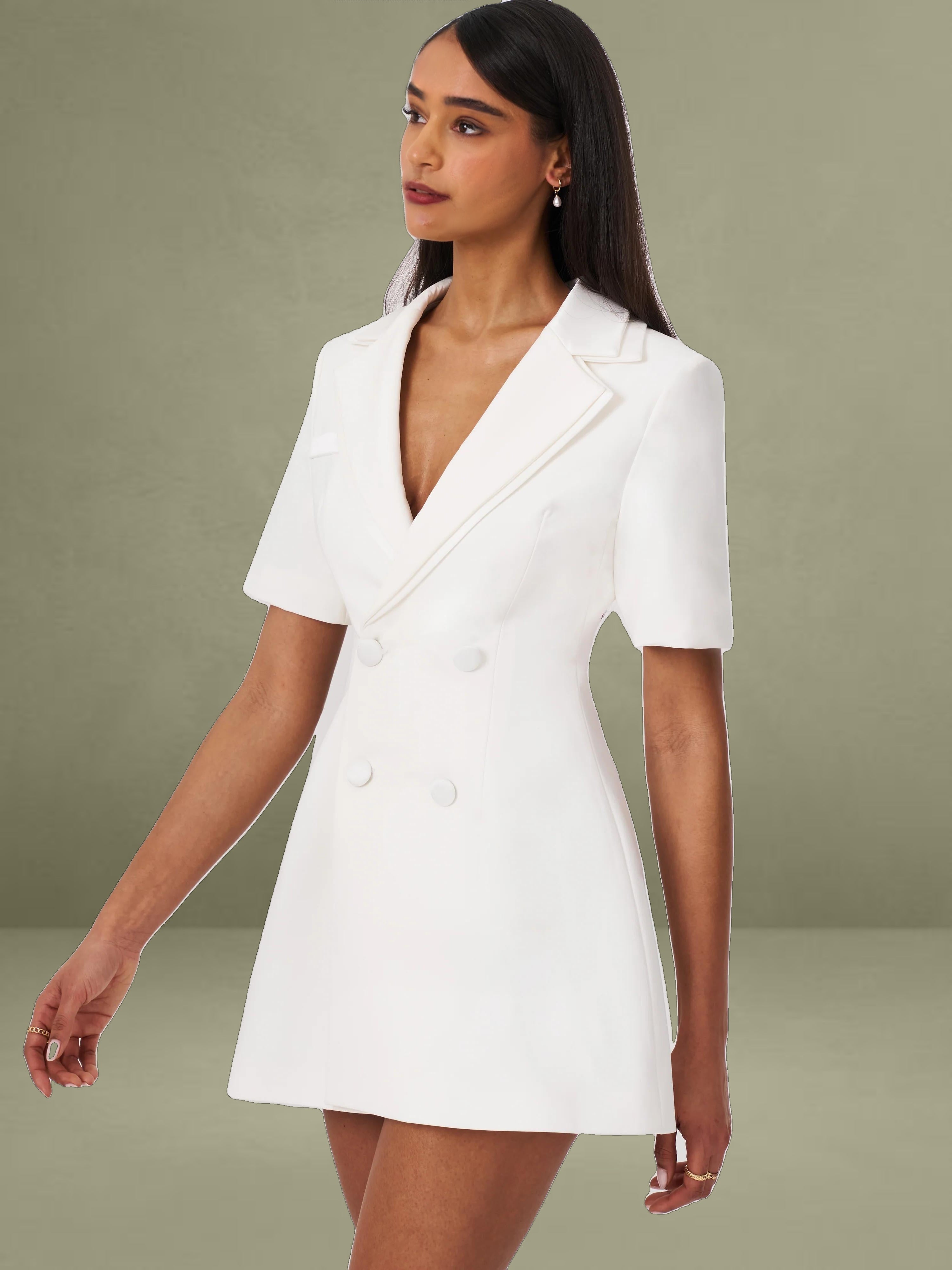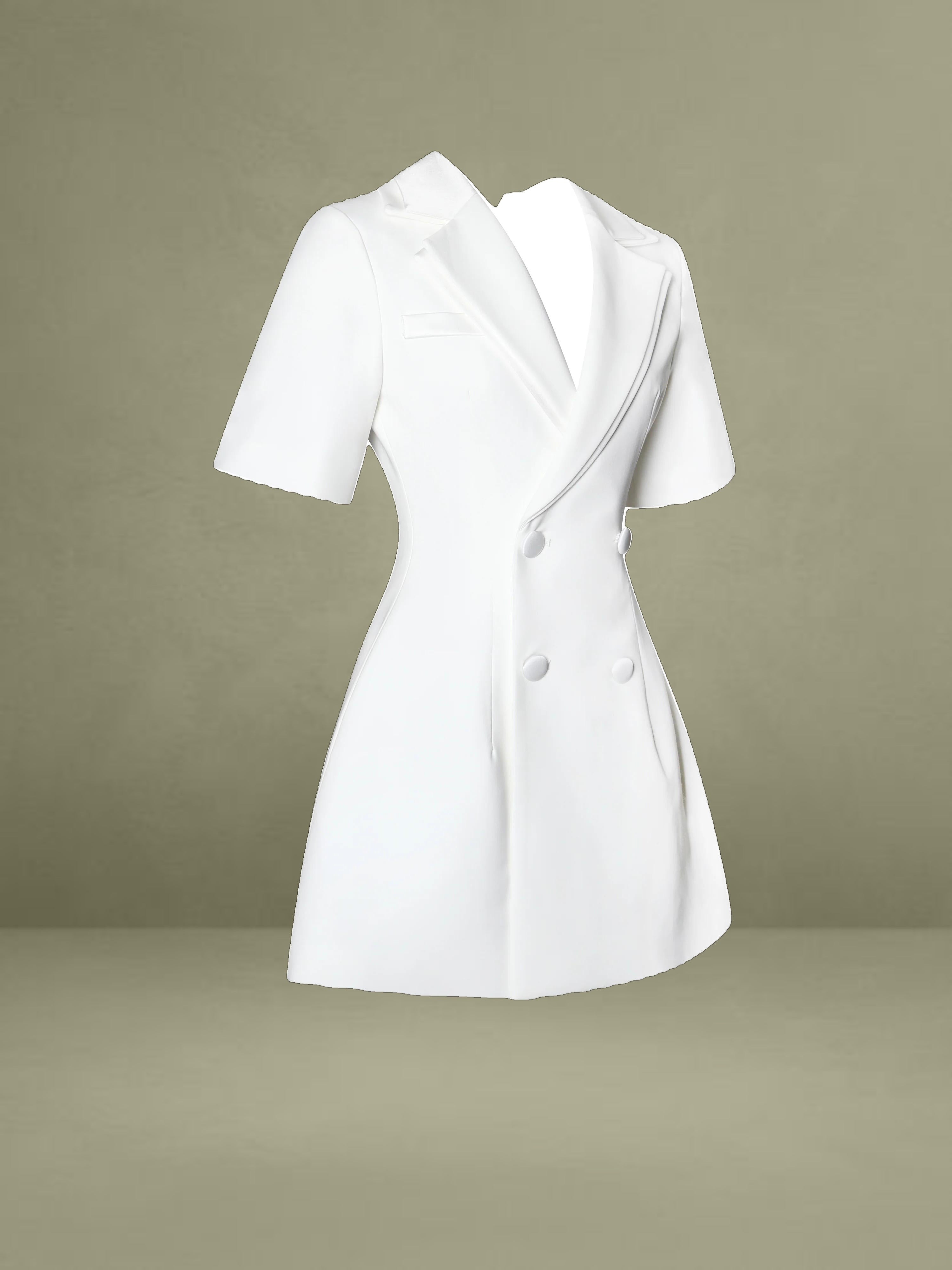 The Madelina Dress is a sophisticated blazer dress that seamlessly blends business casual elegance with a polished office-ready look. Designed for spring, this A-line silhouette offers a structured yet feminine appeal. The double-breasted front and double-layer collar add a refined touch, while the satin trim enhances its luxurious feel. Fabric-covered buttons provide a seamless finish, and the dress is fully lined for maximum comfort. Whether for work or a formal occasion, the Madelina Dress is a timeless statement piece.
