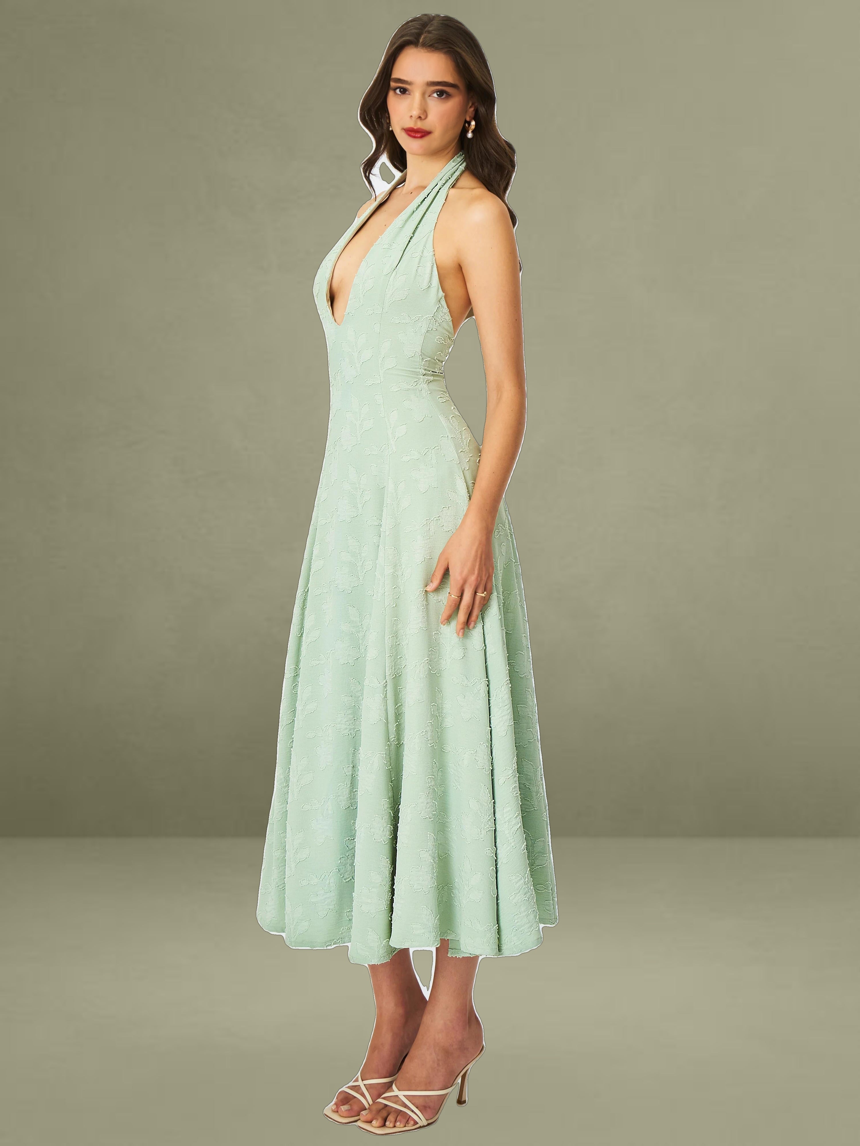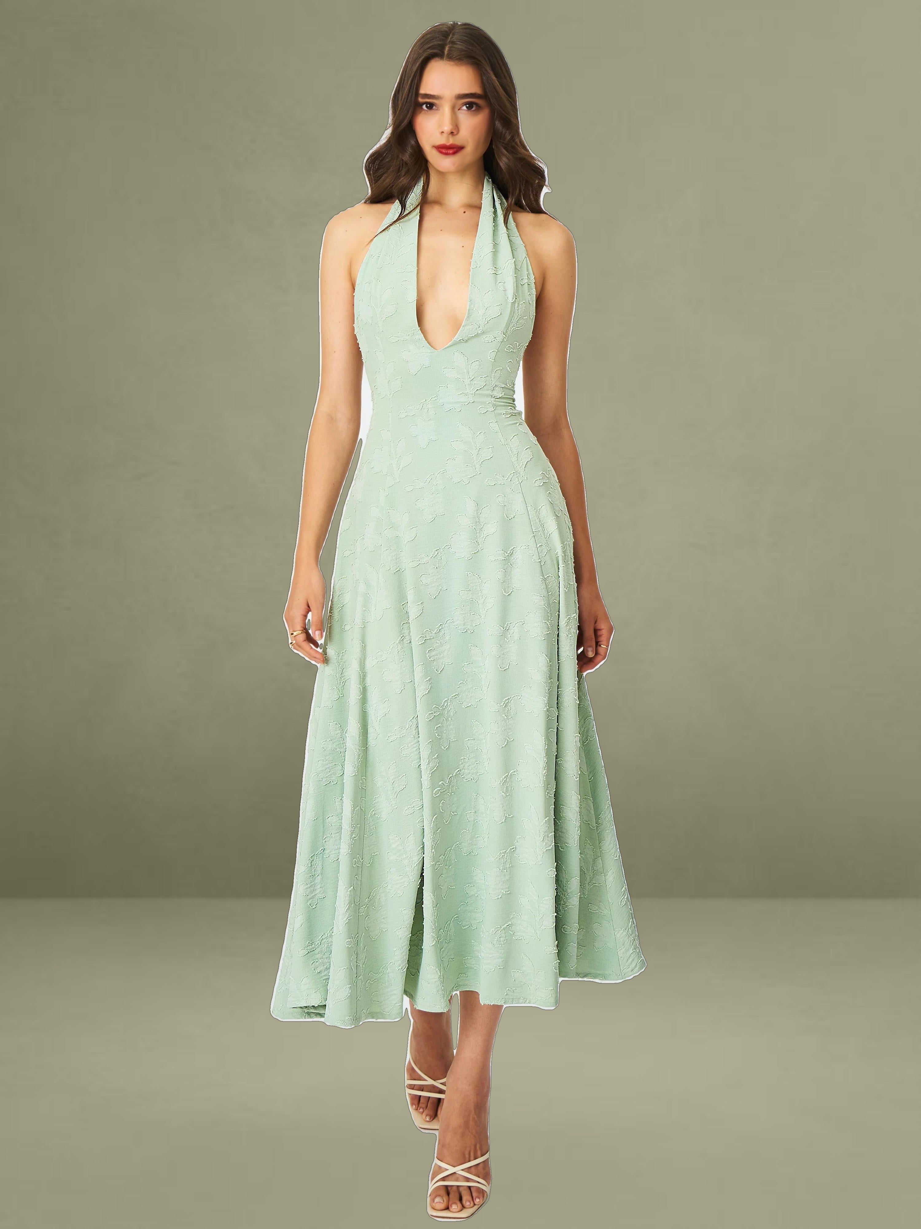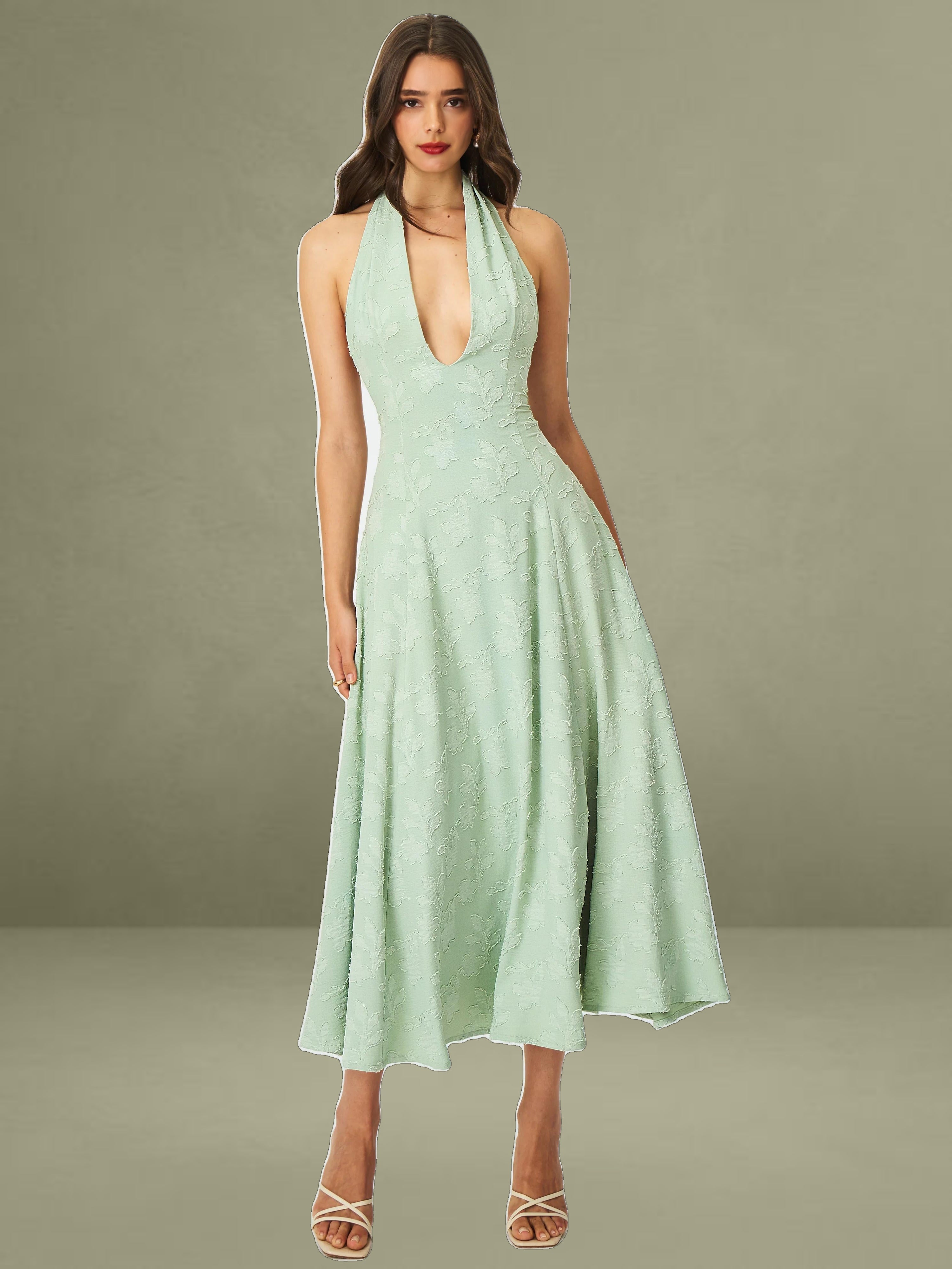 Graceful, fresh, and made for sun-drenched days, the Magda Dress is a mint green midi masterpiece. Crafted from soft jacquard fabric, this halter-style dress features a plunging deep V neckline and a stunning backless design that adds a touch of allure. The A-line silhouette flows effortlessly for a flattering, feminine shape, while the invisible zipper and full lining ensure a seamless and comfortable fit. Perfect for summer getaways, beach strolls, or casual vacations, the Magda Dress brings elegance and ease to every moment.