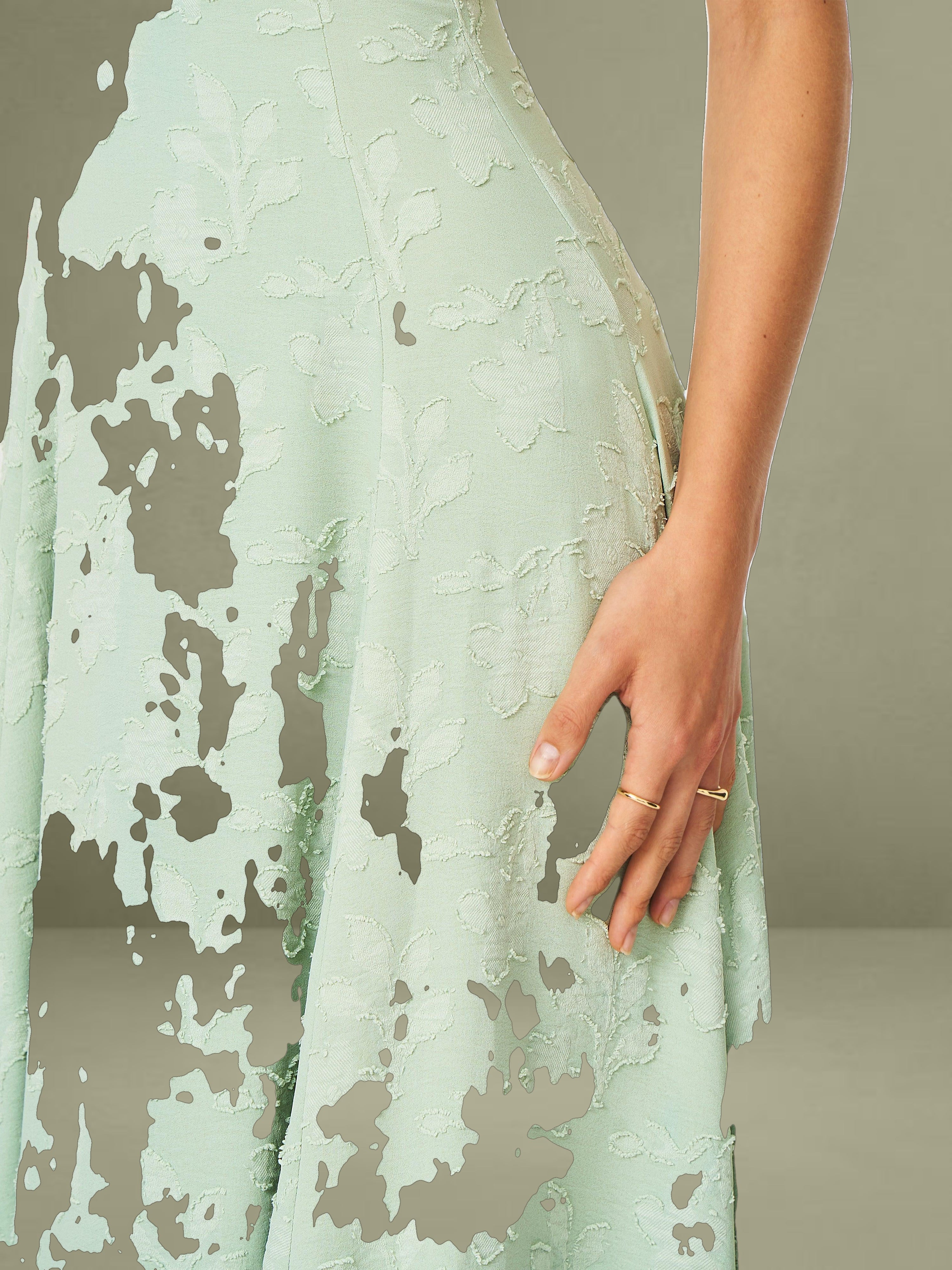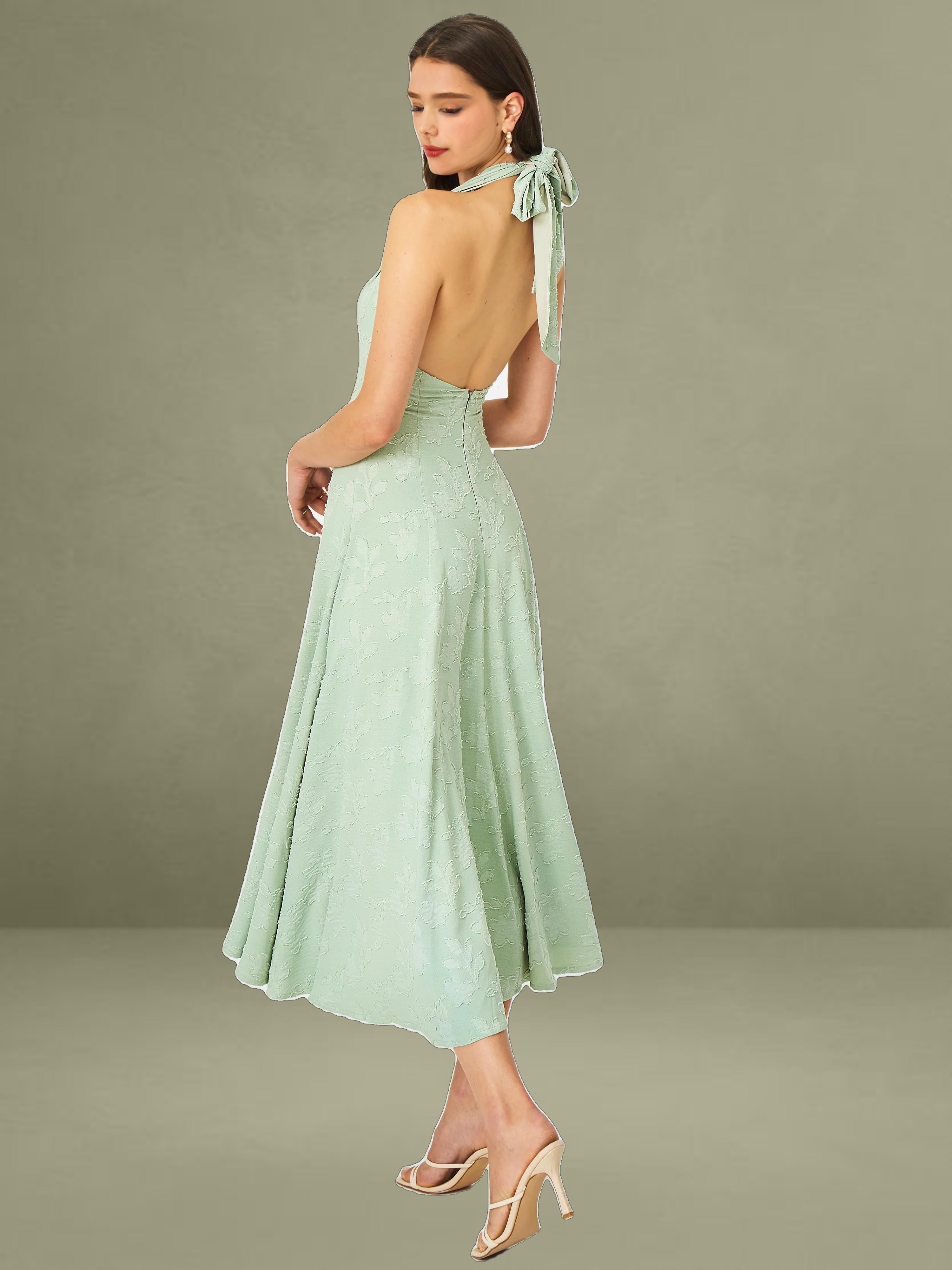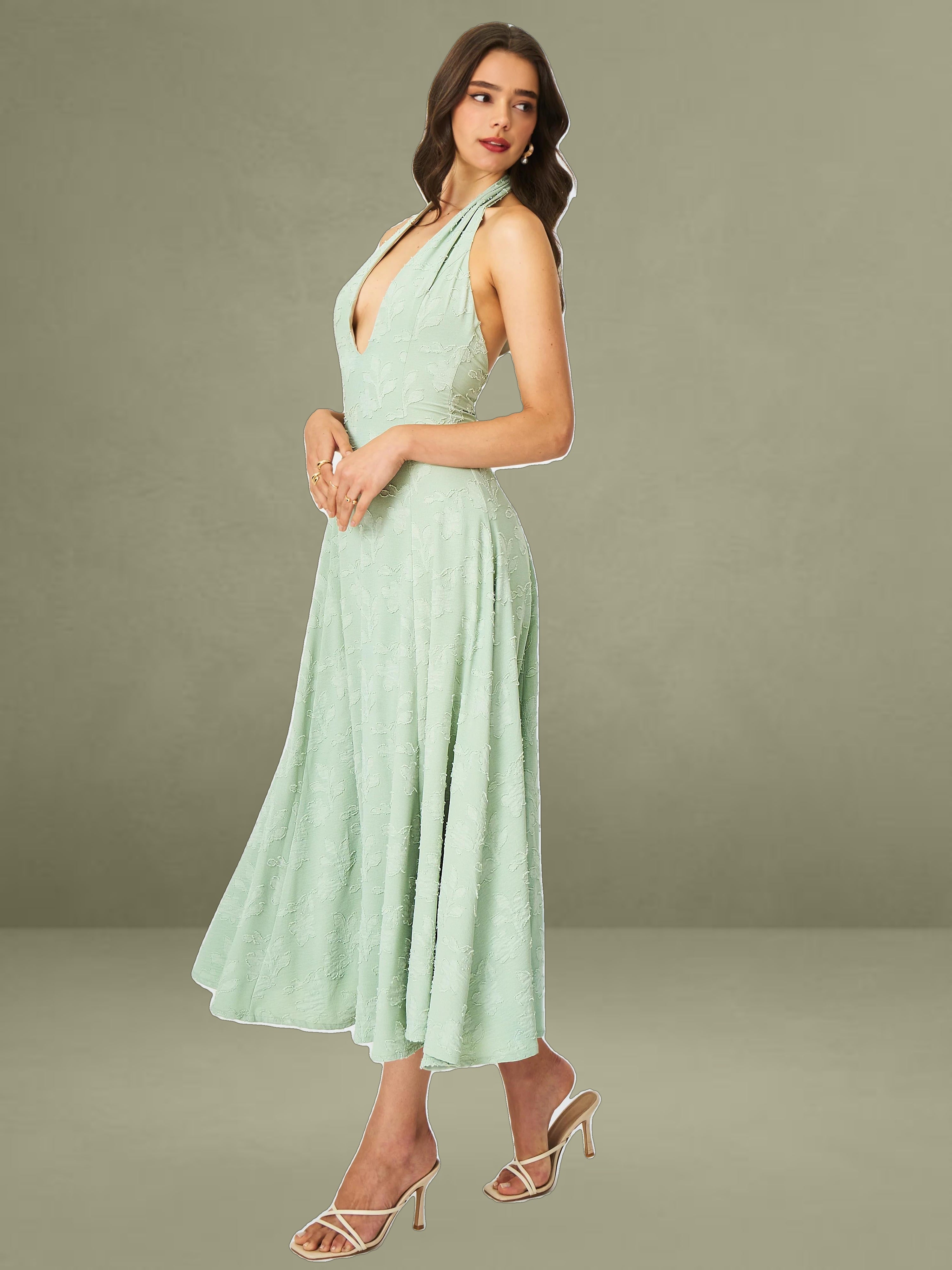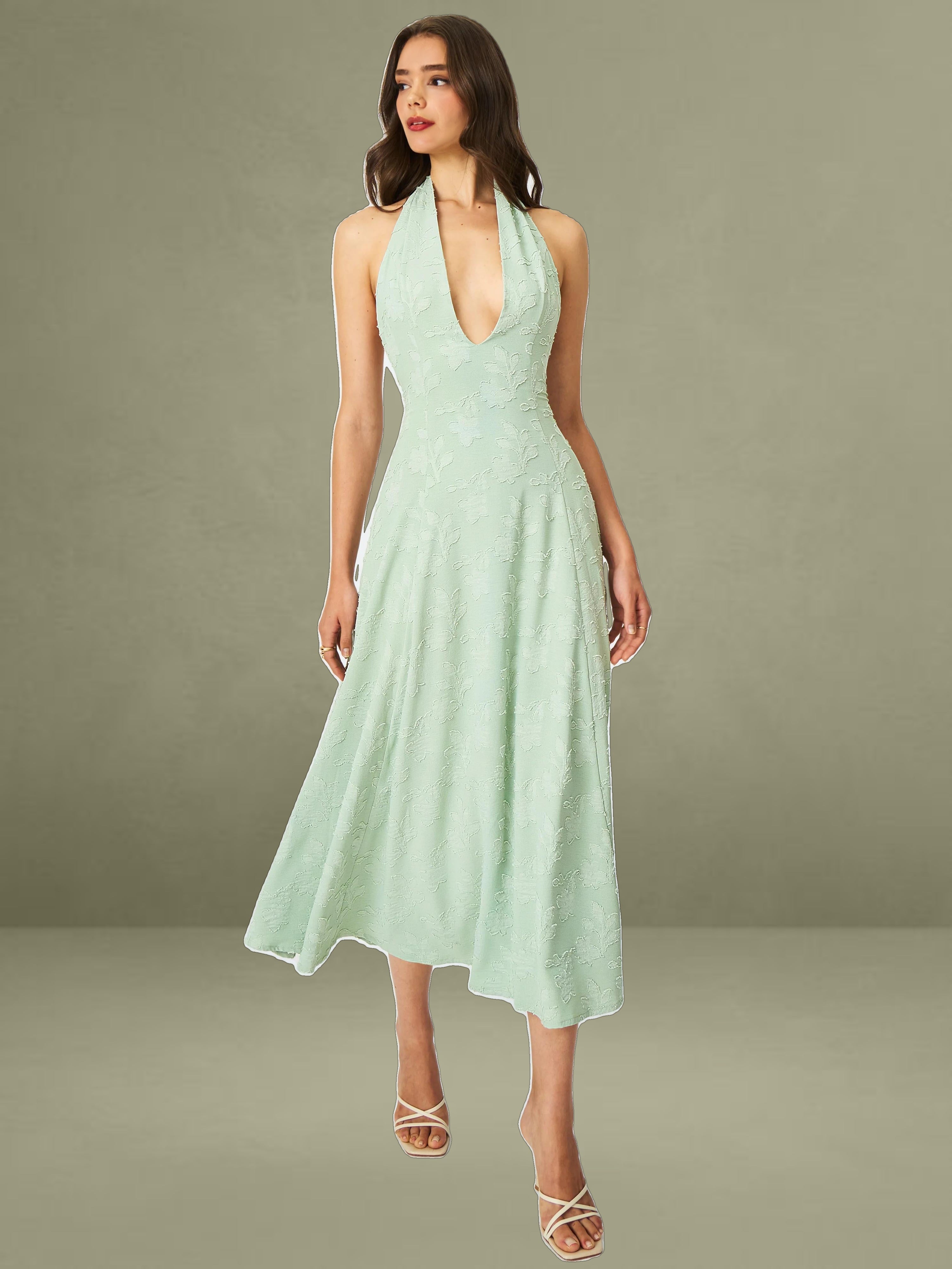 Graceful, fresh, and made for sun-drenched days, the Magda Dress is a mint green midi masterpiece. Crafted from soft jacquard fabric, this halter-style dress features a plunging deep V neckline and a stunning backless design that adds a touch of allure. The A-line silhouette flows effortlessly for a flattering, feminine shape, while the invisible zipper and full lining ensure a seamless and comfortable fit. Perfect for summer getaways, beach strolls, or casual vacations, the Magda Dress brings elegance and ease to every moment.