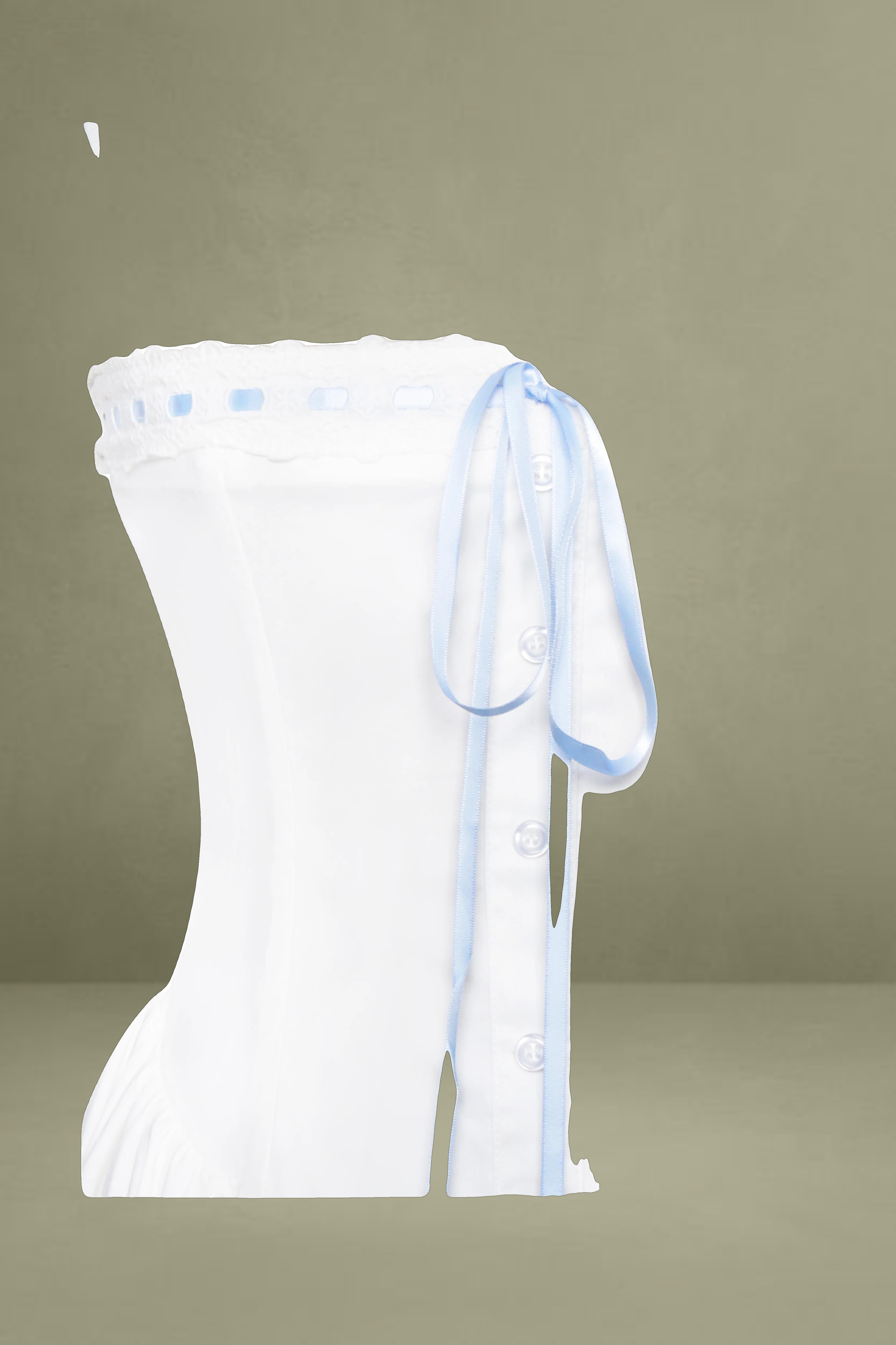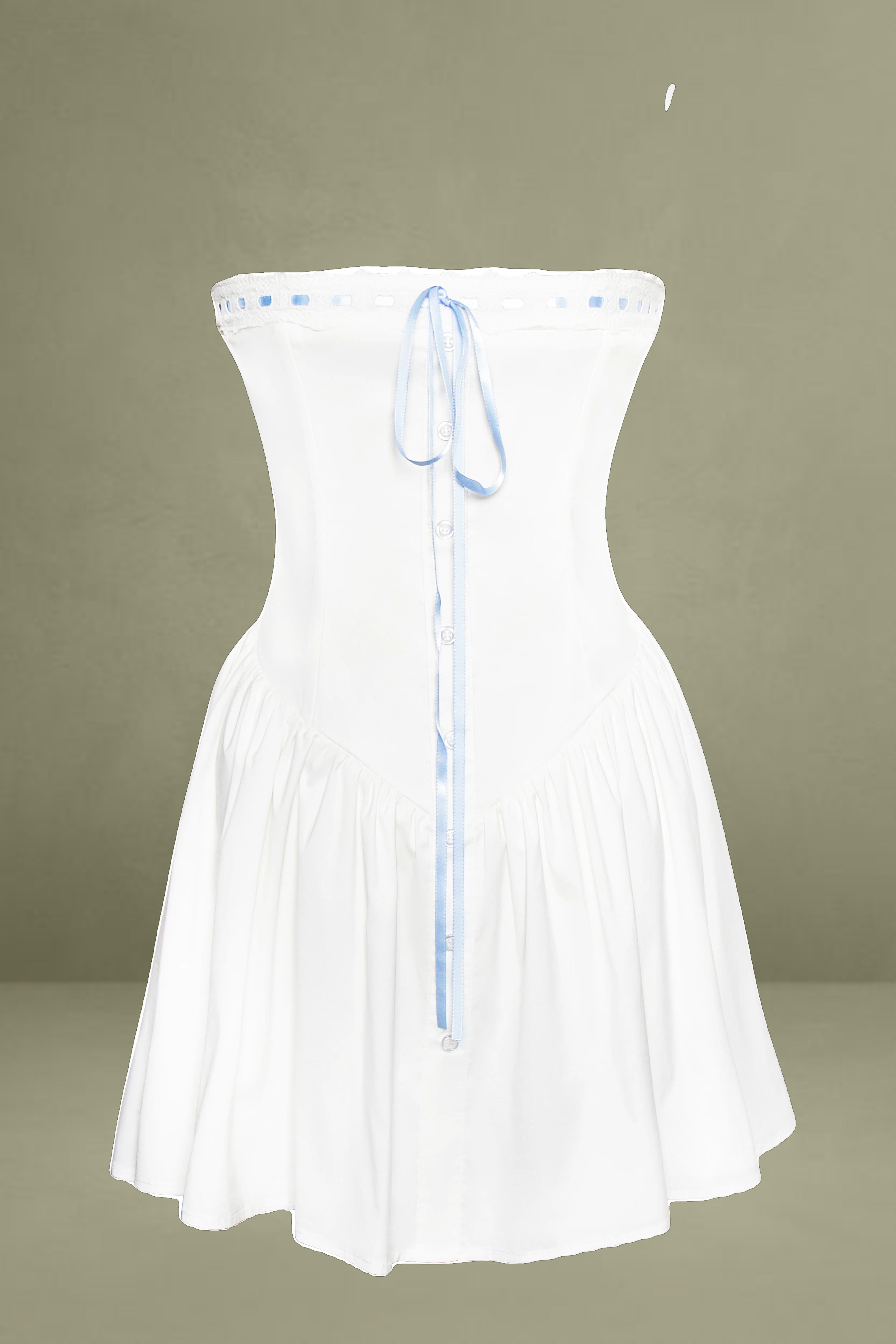 Introducing the Malia dress, a captivating mini dress that exudes elegance and charm. This fully lined dress features built-in bones for added structure and support. The adjustable straps ensure a perfect fit, while the drop waist design adds a contemporary touch. Intricate lace decoration graces the dress, complemented by a delicate lace back that adds a romantic flair. A blue ribbon tie and button decorations at the front enhance its vintage-inspired aesthetic. Perfect for any special occasion, this dress seamlessly blends classic details with modern style, making it a standout piece in any wardrobe.