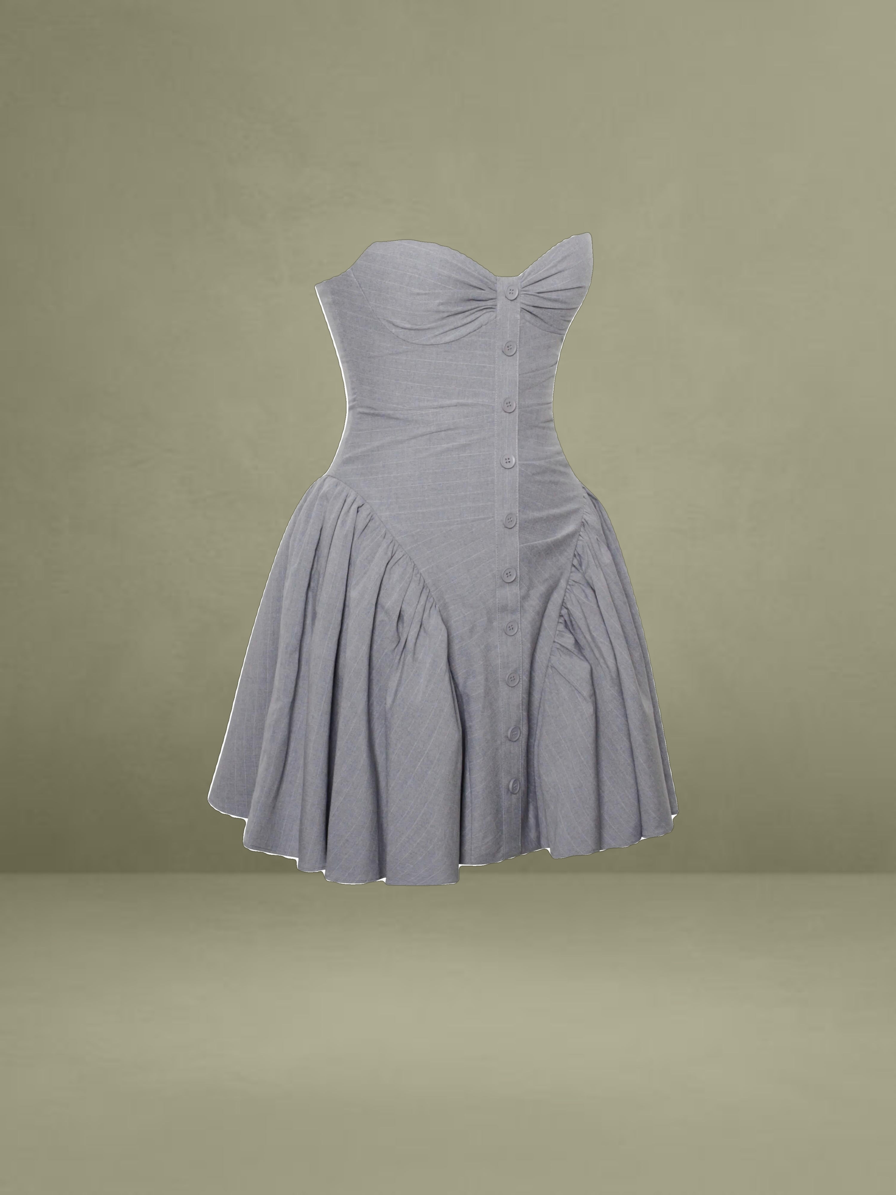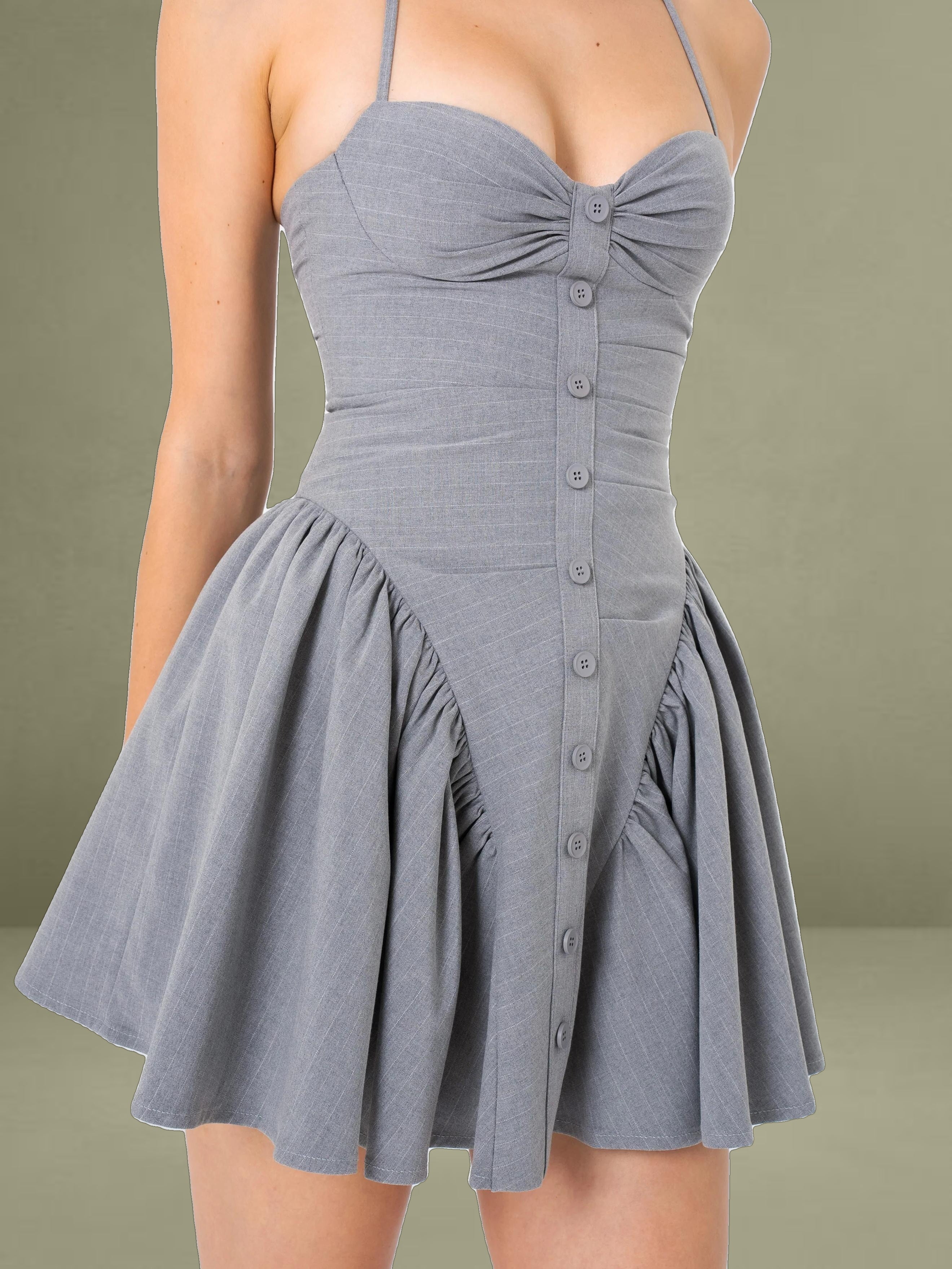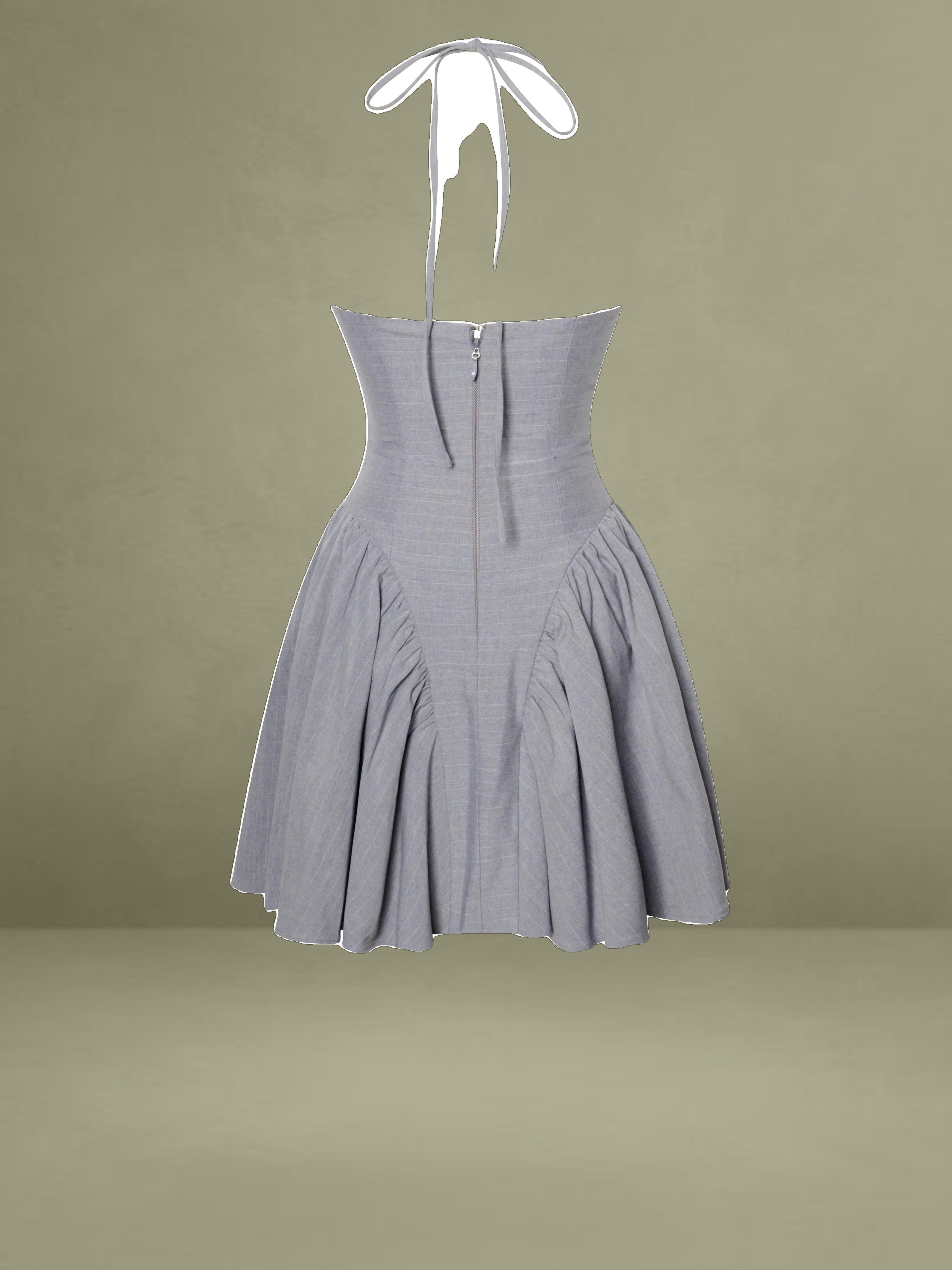 Introducing the Melody mini dress, a sophisticated piece designed in an elegant gray stripe pattern. This dress features an adjustable halter strap and a pleated design at the breast, adding a touch of delicate detail. The obliquely divided gathers around the waist create a flattering silhouette, complemented by an drop waist A-line skirt with inside support for added structure. Fully lined and cupped for added comfort, the Melody dress is completed with an invisible zipper at the back for a seamless finish. Perfect for day time styling.