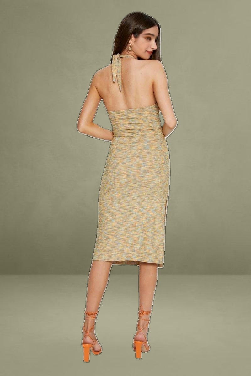 Features: Maxi Length, Halter Design, Side Slit, Space Dye