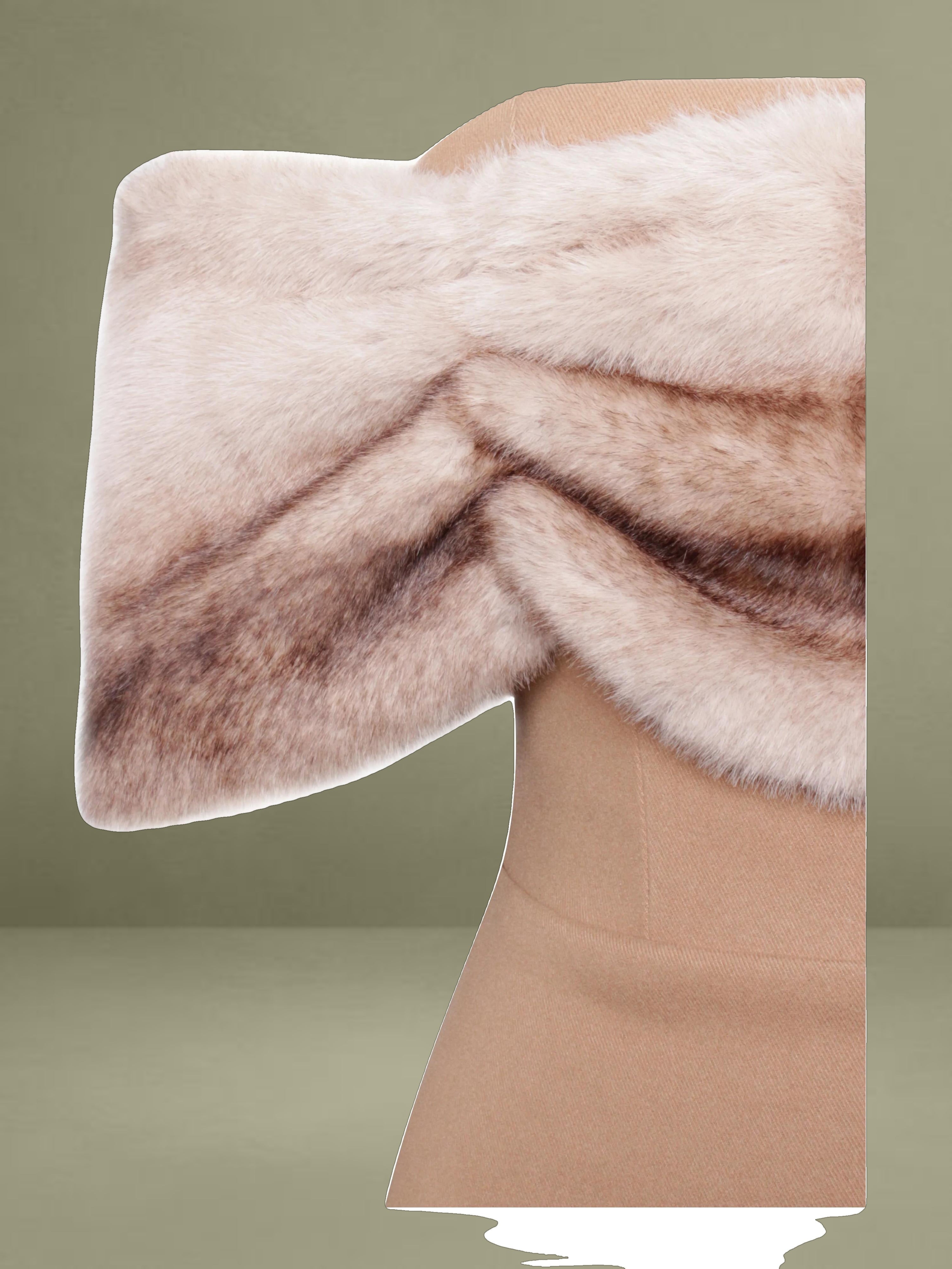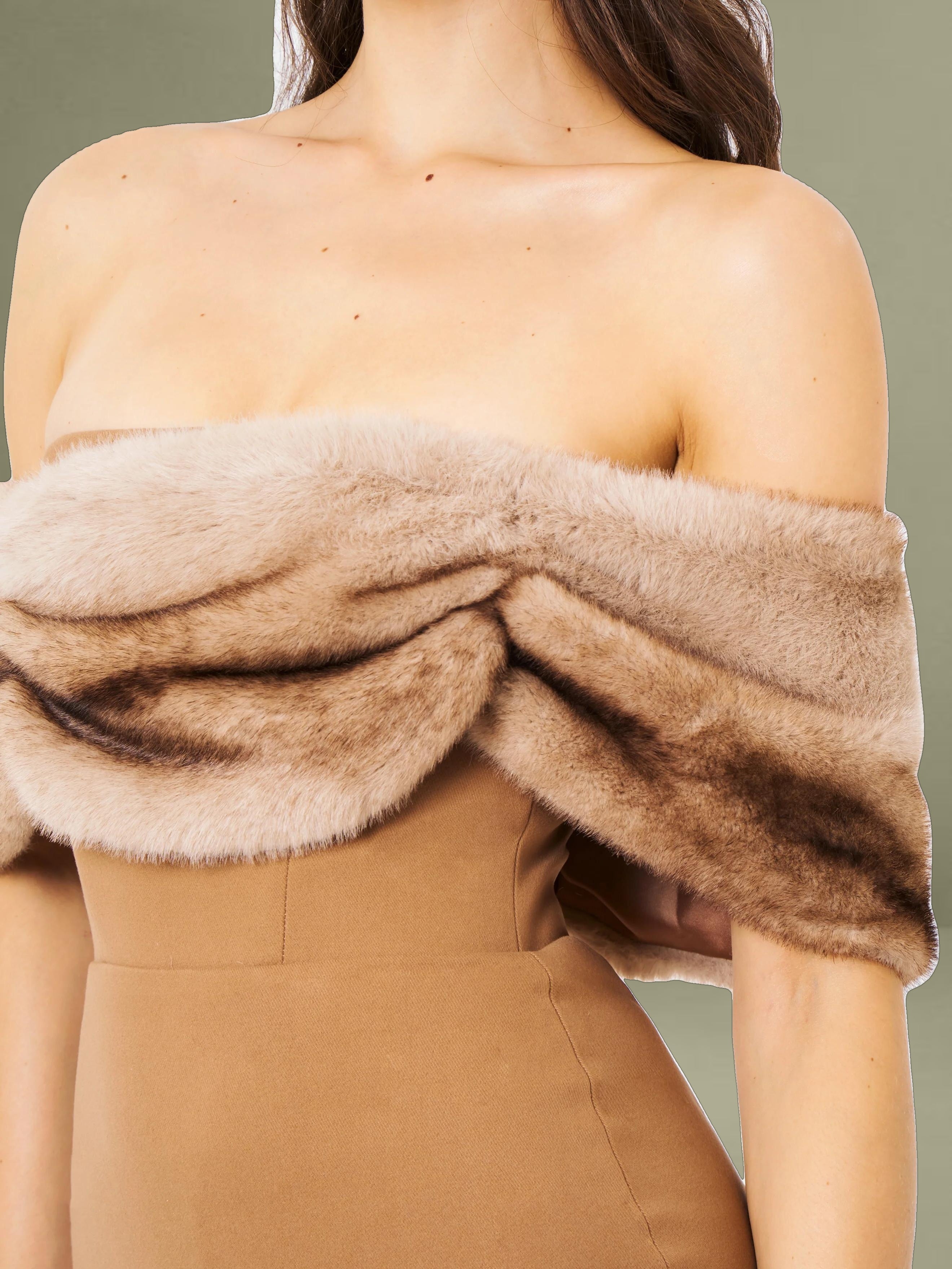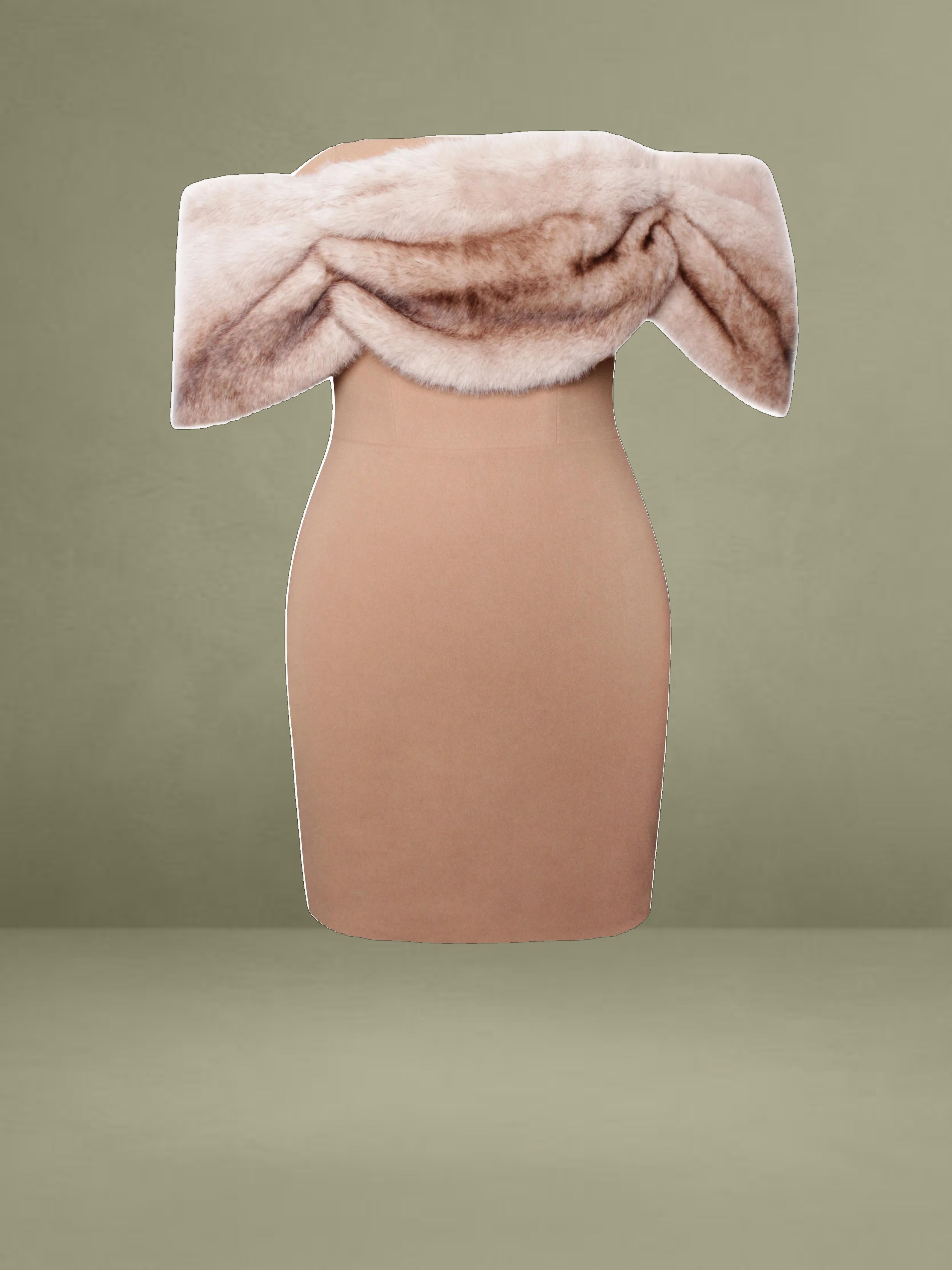 Introducing the Nadira Off Shoulder Dress, a stunning bodycon mini dress that exudes elegance and allure. Crafted from luxurious woolen fabric, this dress features a chic rouched wrap-around trim made from soft vegan fur, adding a touch of glamour to its sleek silhouette. The dress is designed with built-in bones for a structured fit, ensuring a flattering, sculpted shape. Fully lined for comfort, the Nadira Dress includes an invisible zipper for a seamless look. Perfect for any occasion where you want to turn heads with its sophisticated yet bold design.