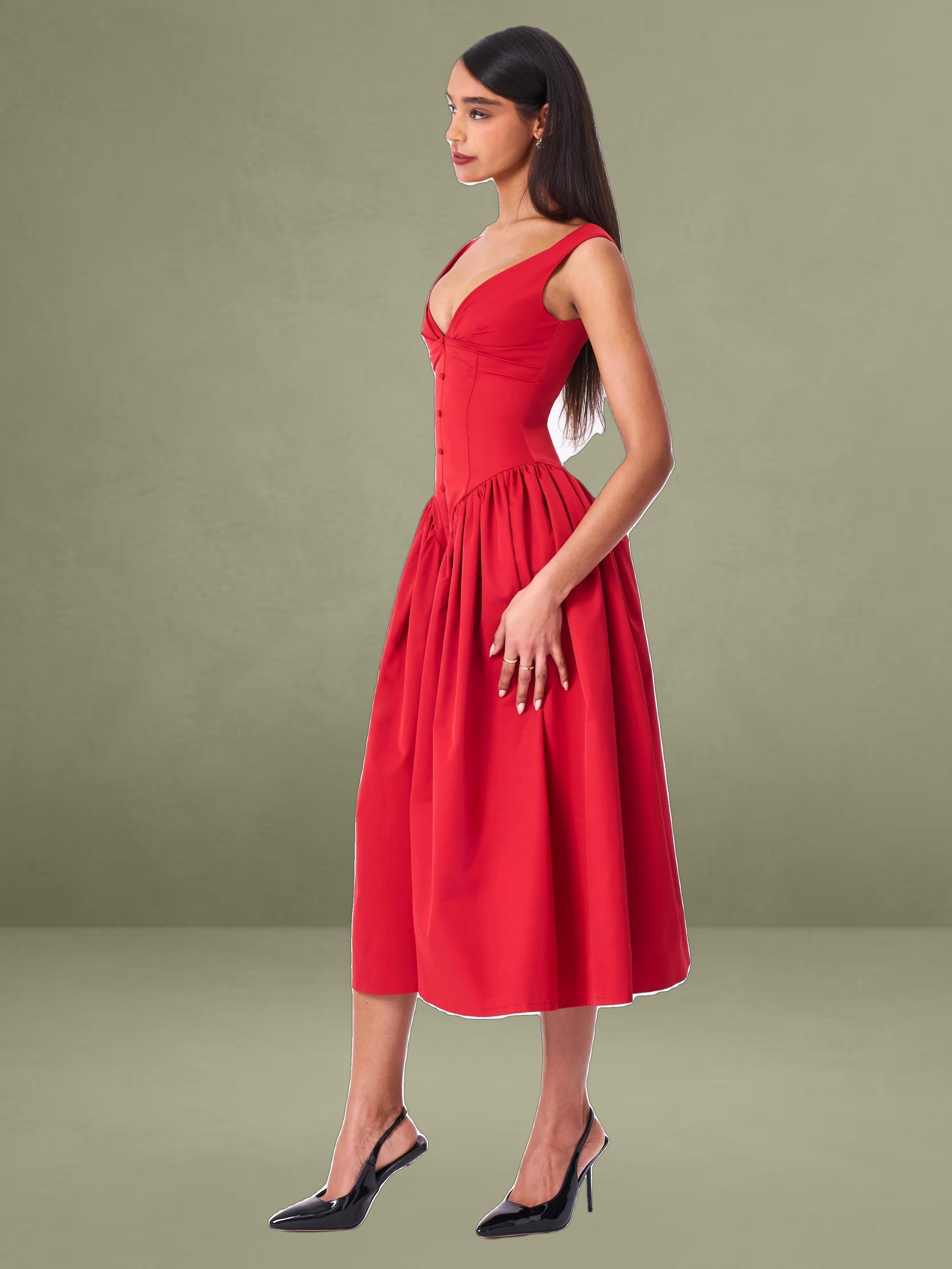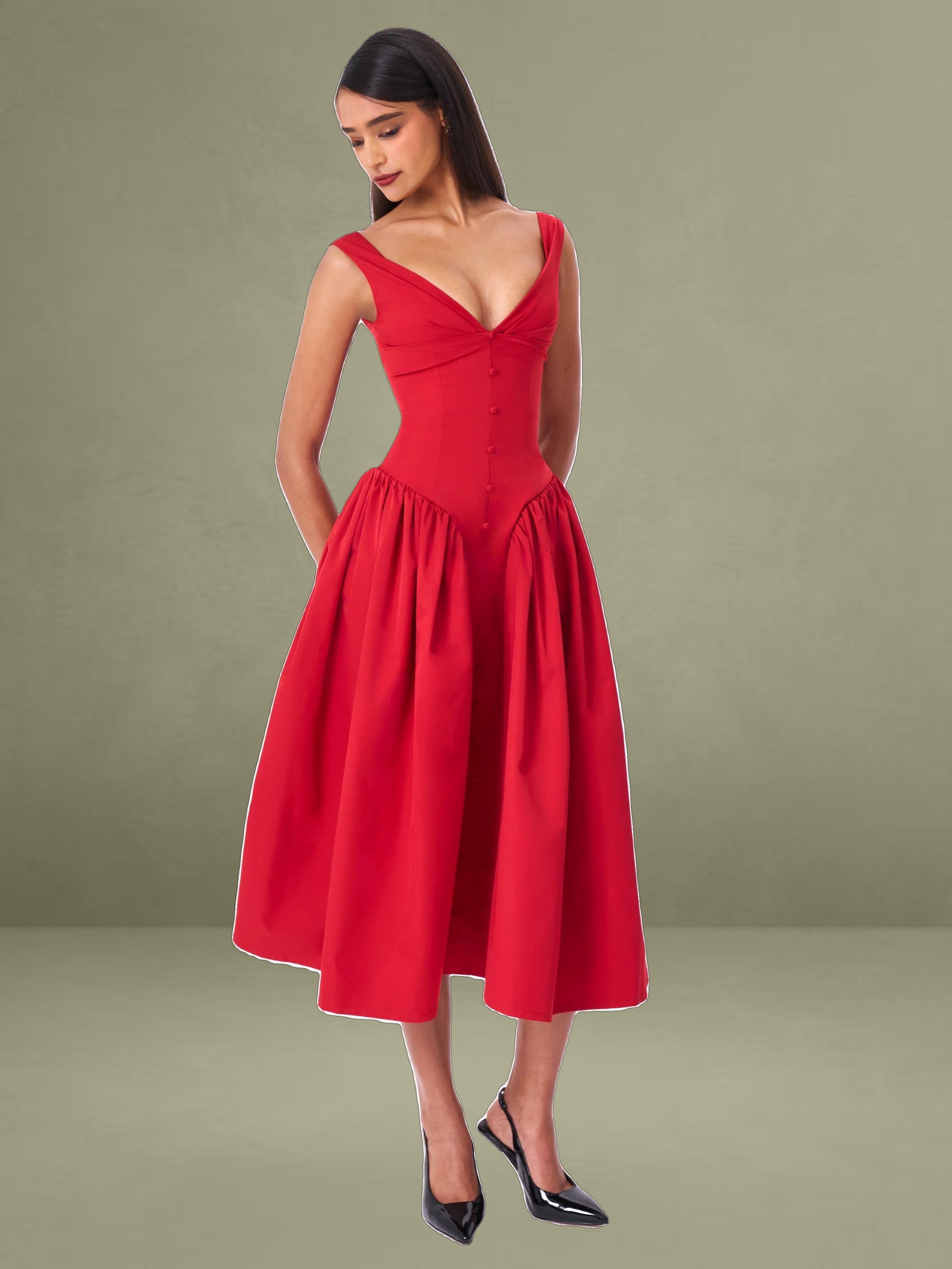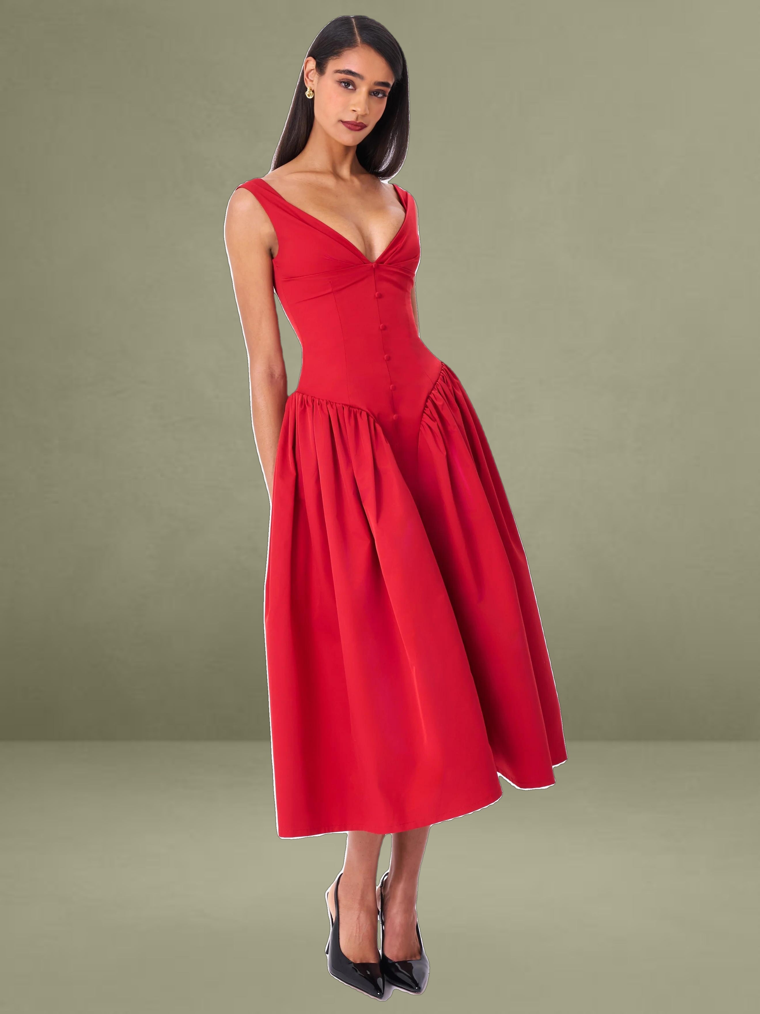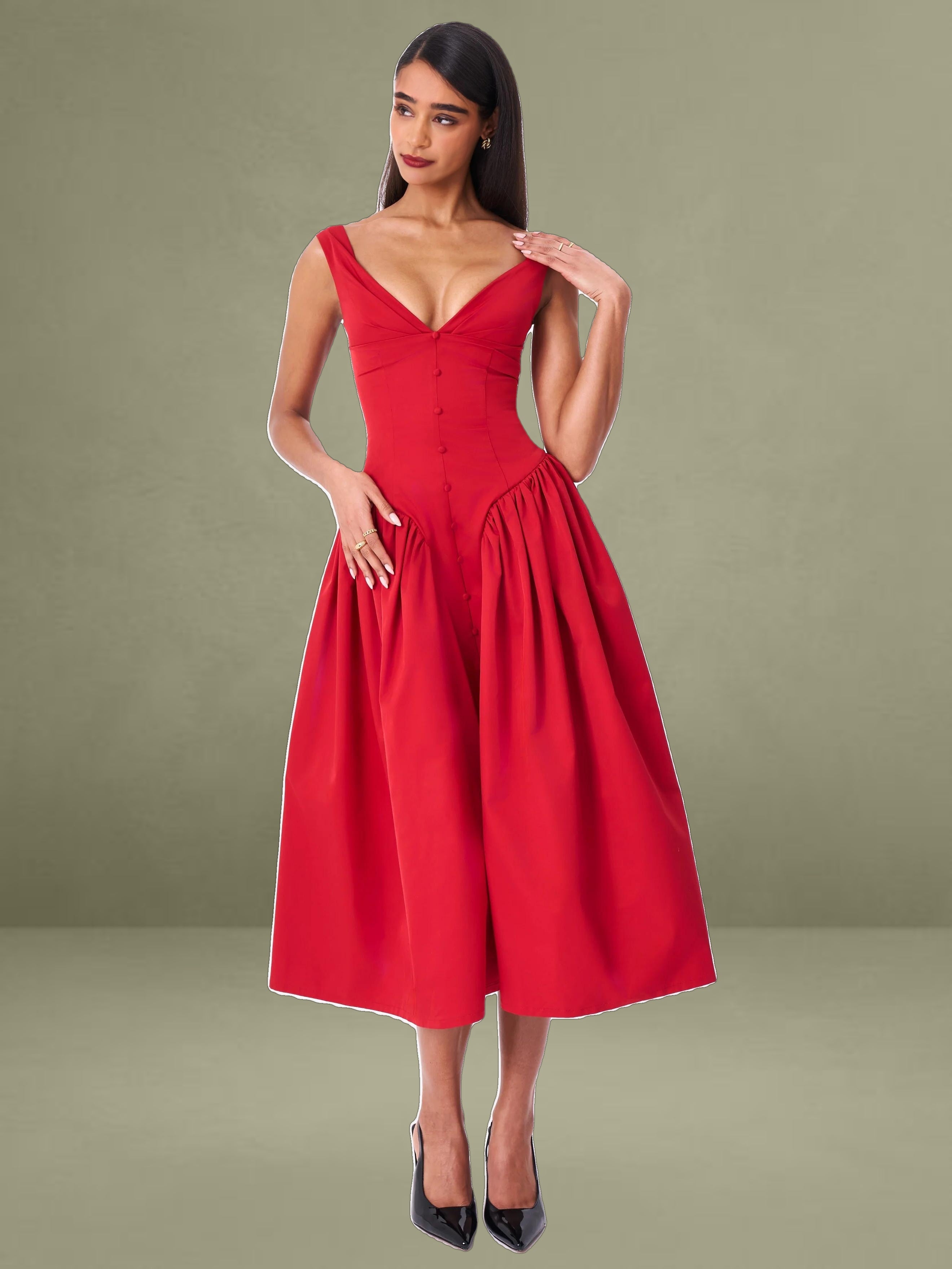 Turn heads with the timeless elegance of the Nahla Dress. This striking red midi dress features a flattering drop waist silhouette and a ruched front chest detail that adds a touch of romance. The sleeveless design and decorative buttons enhance its sophisticated charm, making it perfect for any special occasion. With inside skirt support for added volume and movement, the dress is fully lined for comfort and finished with an invisible zipper for a flawless fit. The Nahla Dress is your go-to piece for a refined and unforgettable look.