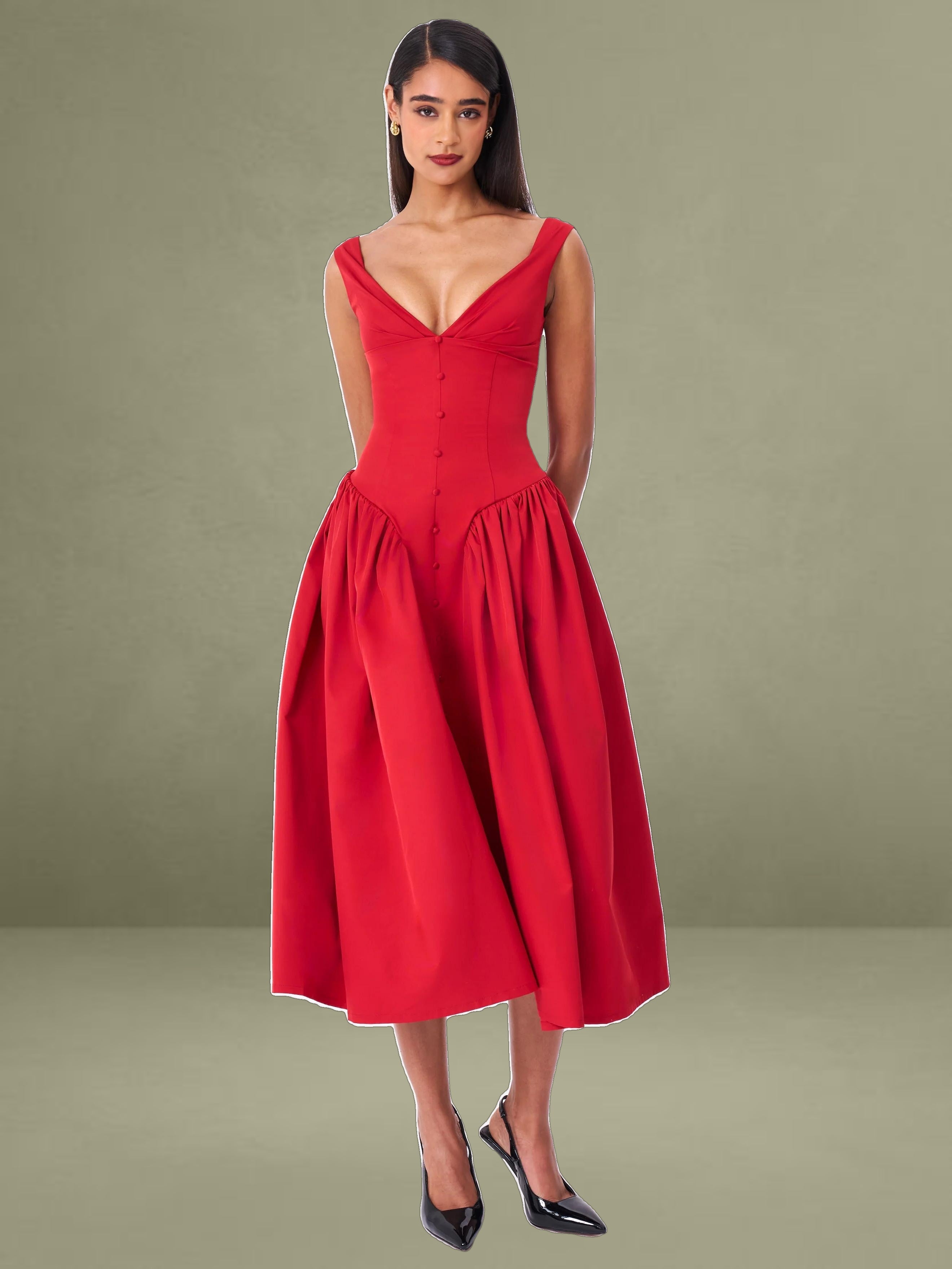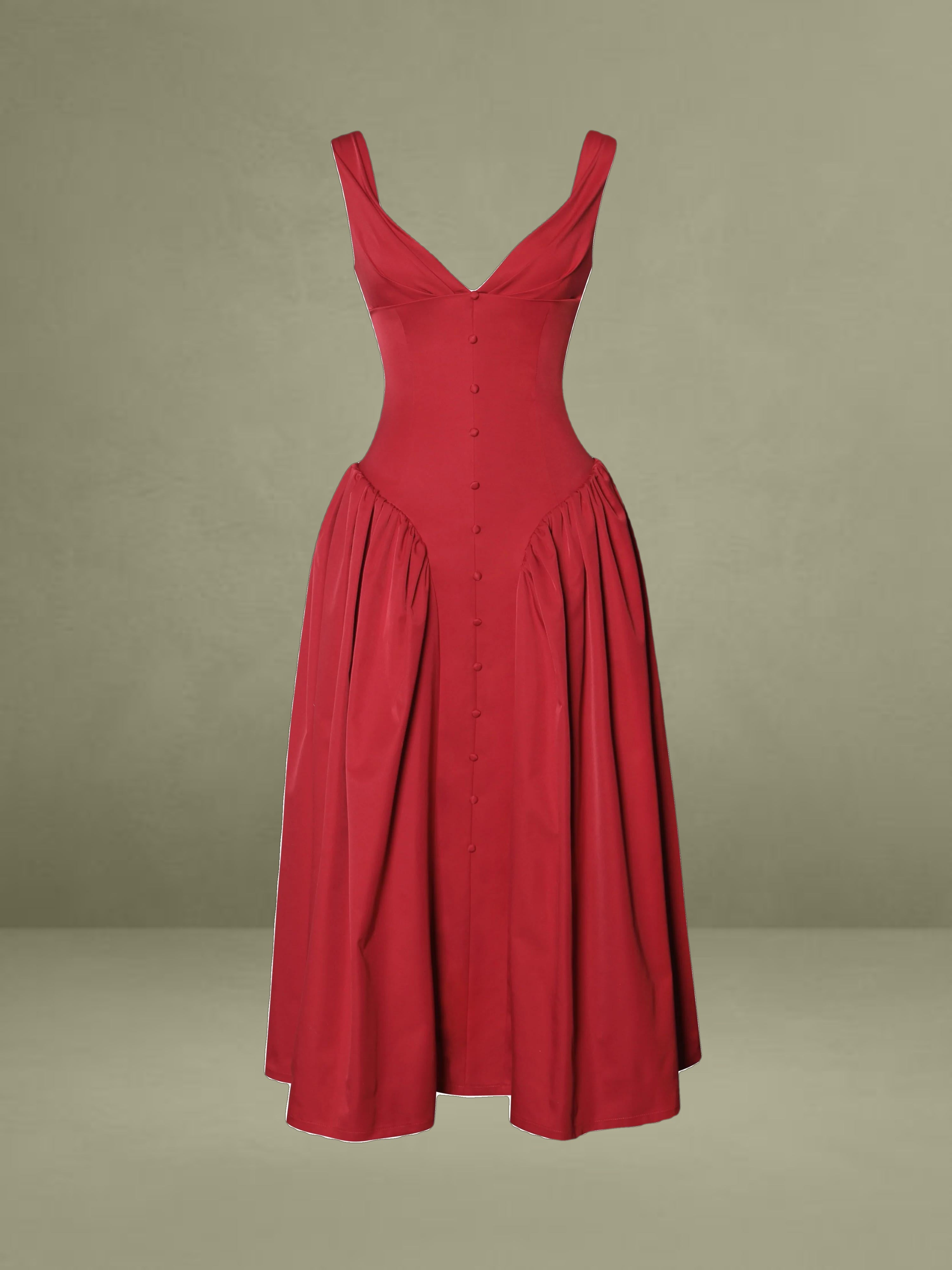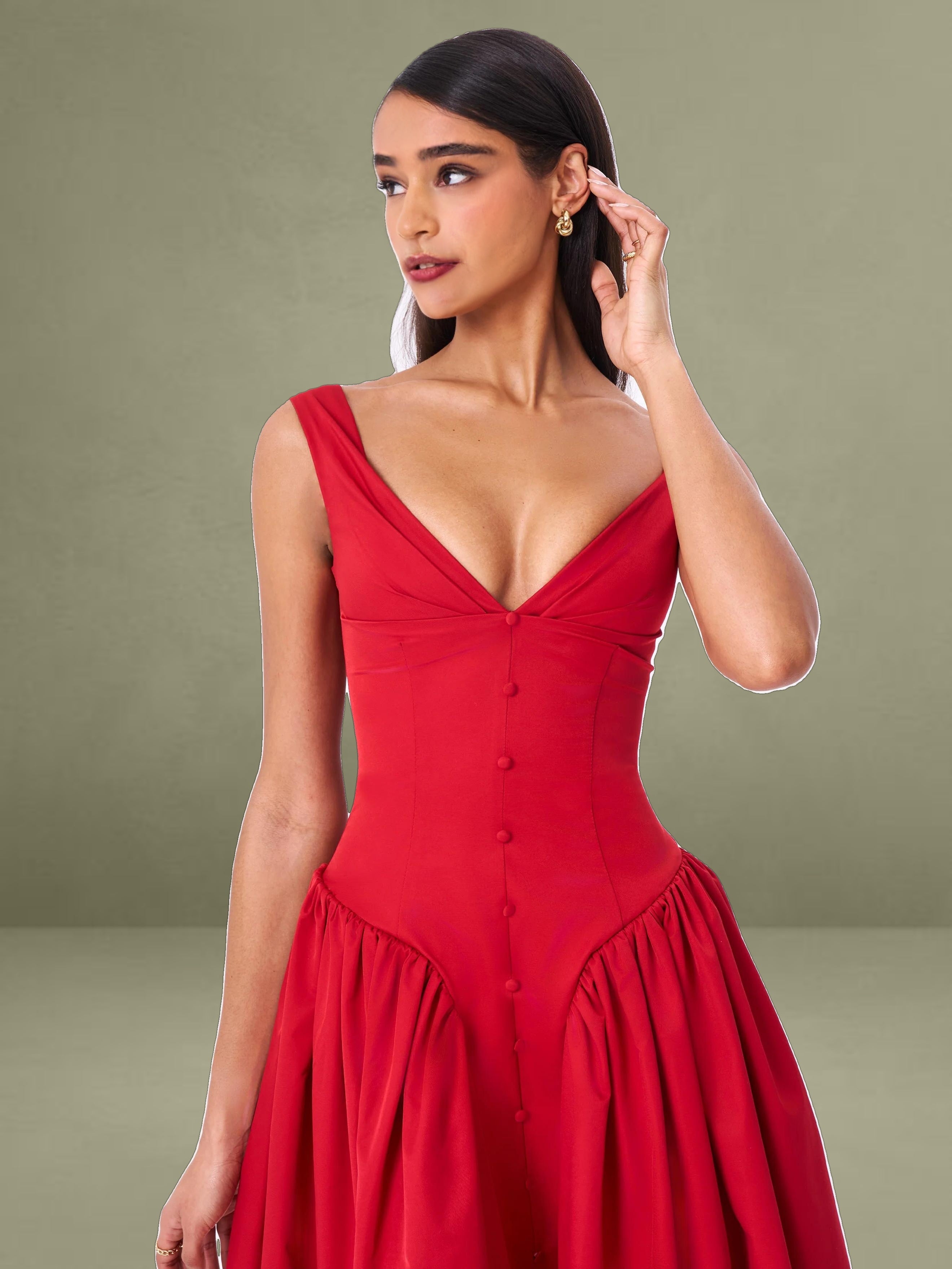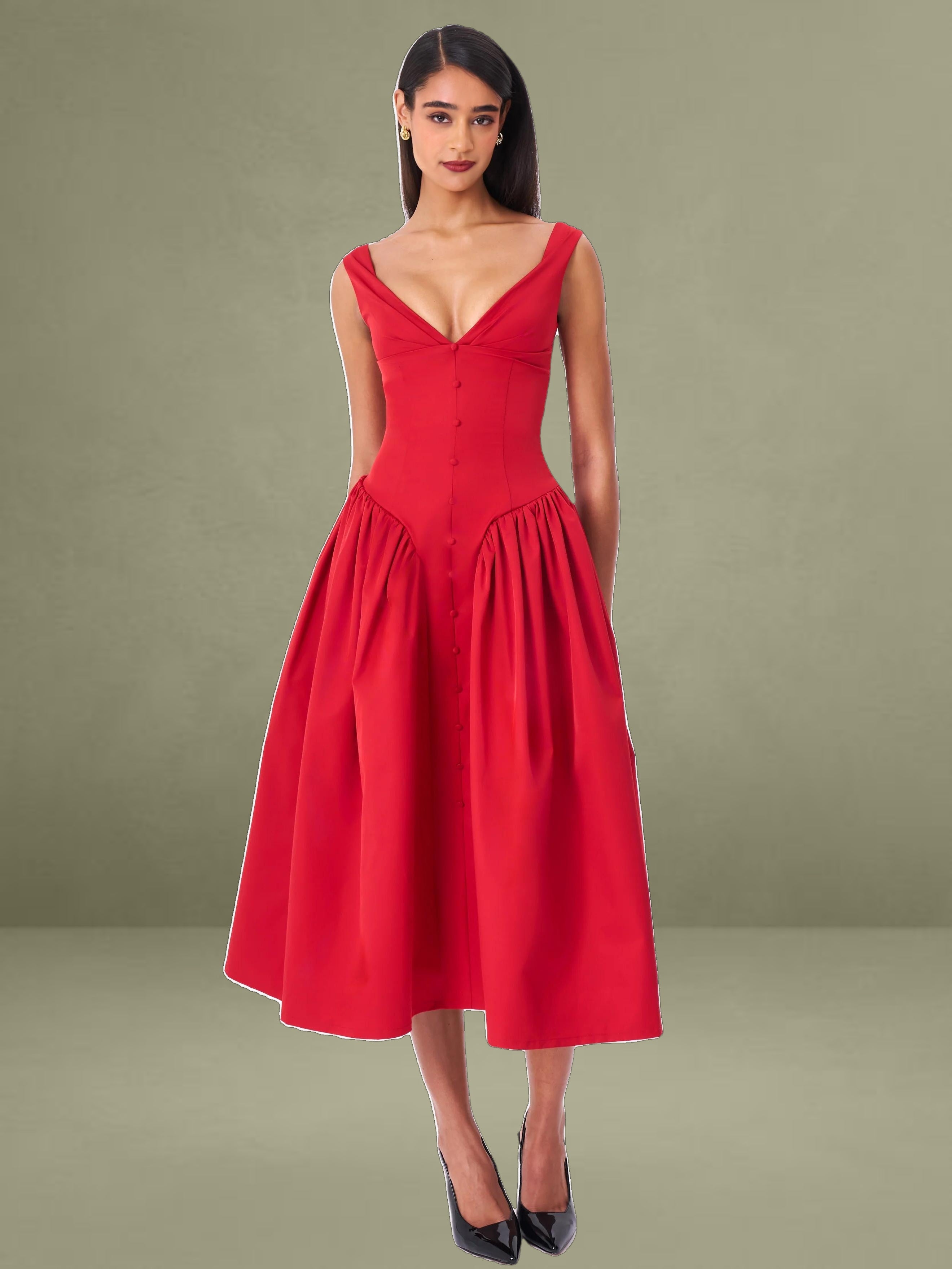 Turn heads with the timeless elegance of the Nahla Dress. This striking red midi dress features a flattering drop waist silhouette and a ruched front chest detail that adds a touch of romance. The sleeveless design and decorative buttons enhance its sophisticated charm, making it perfect for any special occasion. With inside skirt support for added volume and movement, the dress is fully lined for comfort and finished with an invisible zipper for a flawless fit. The Nahla Dress is your go-to piece for a refined and unforgettable look.