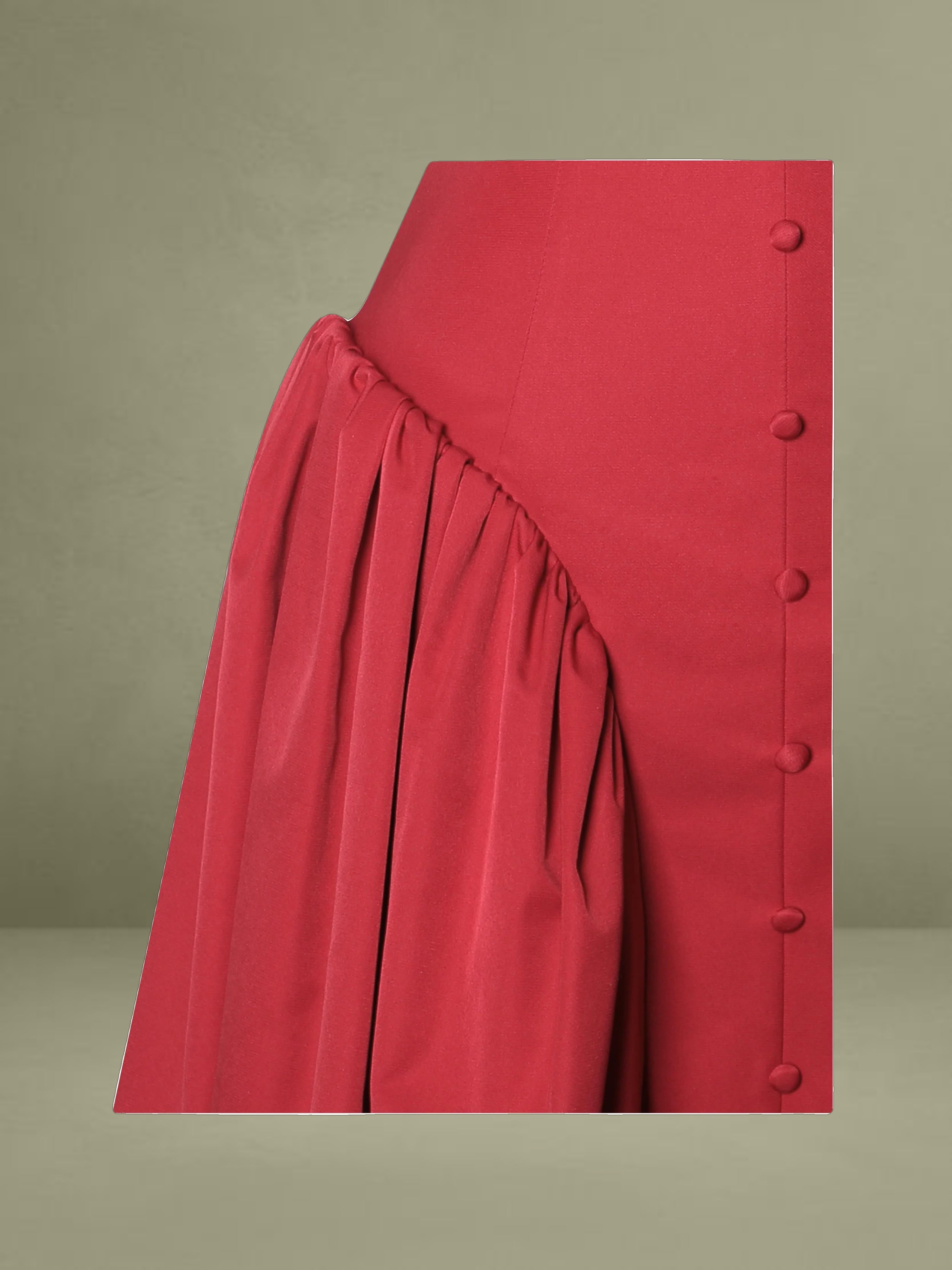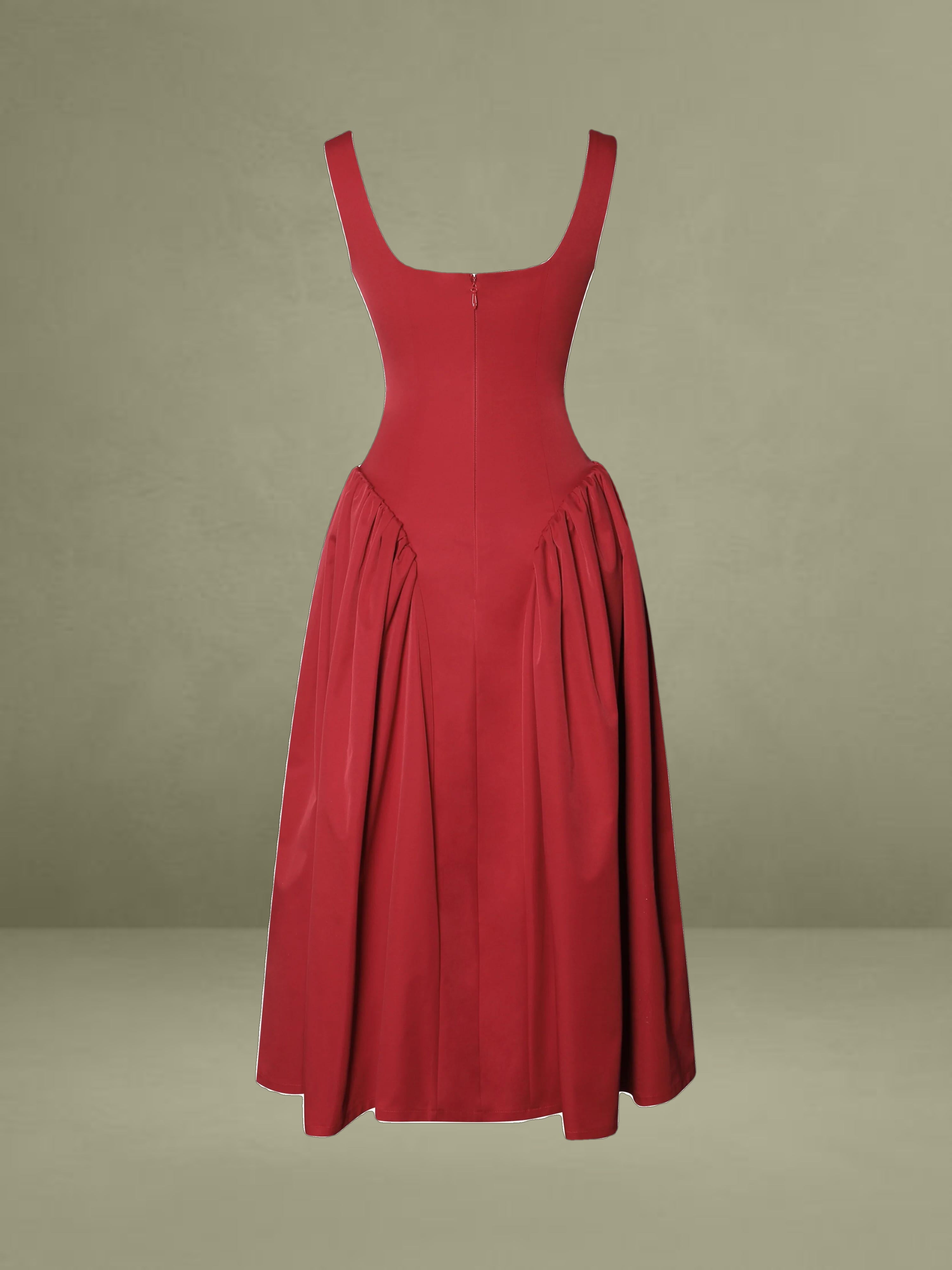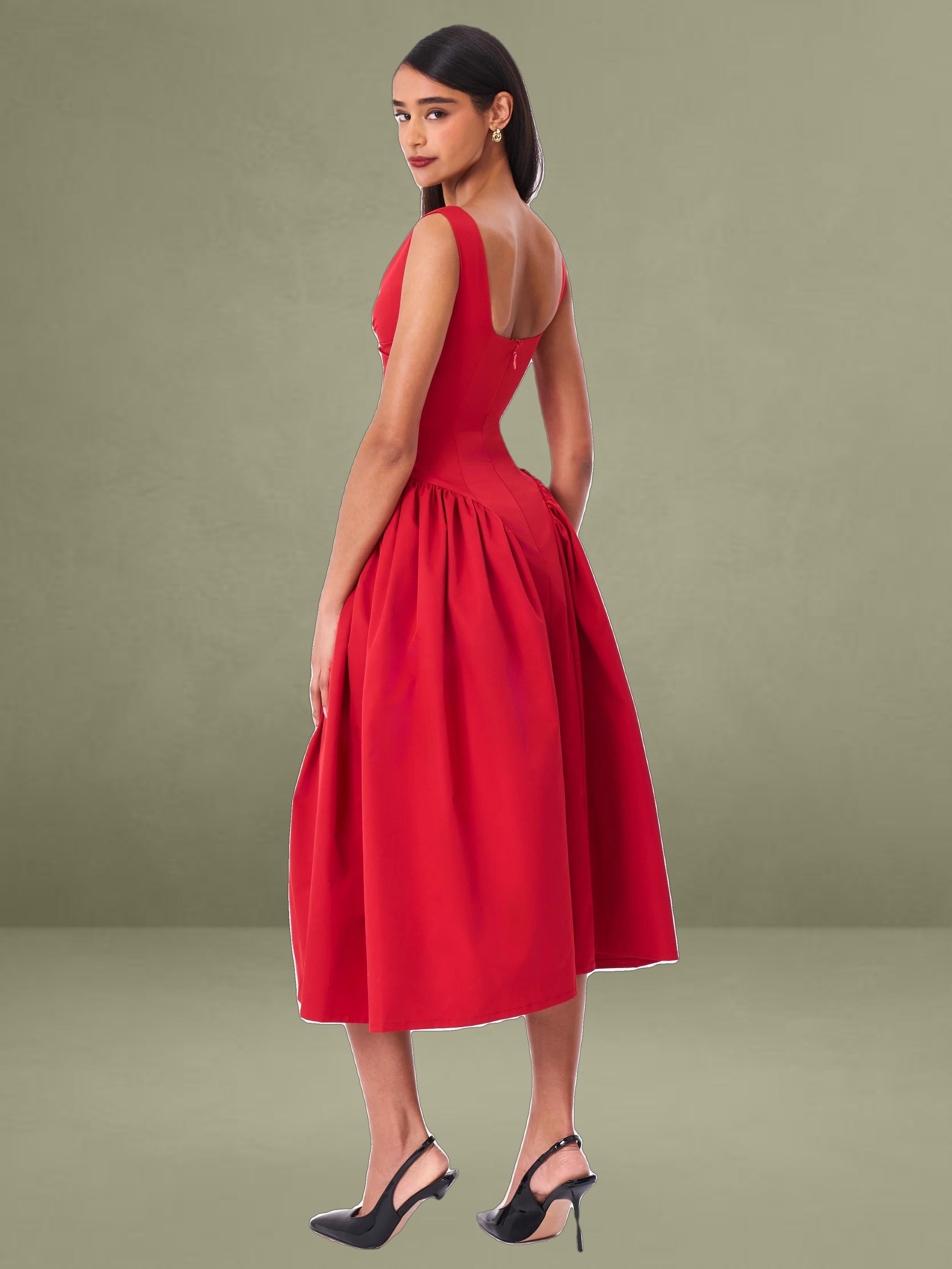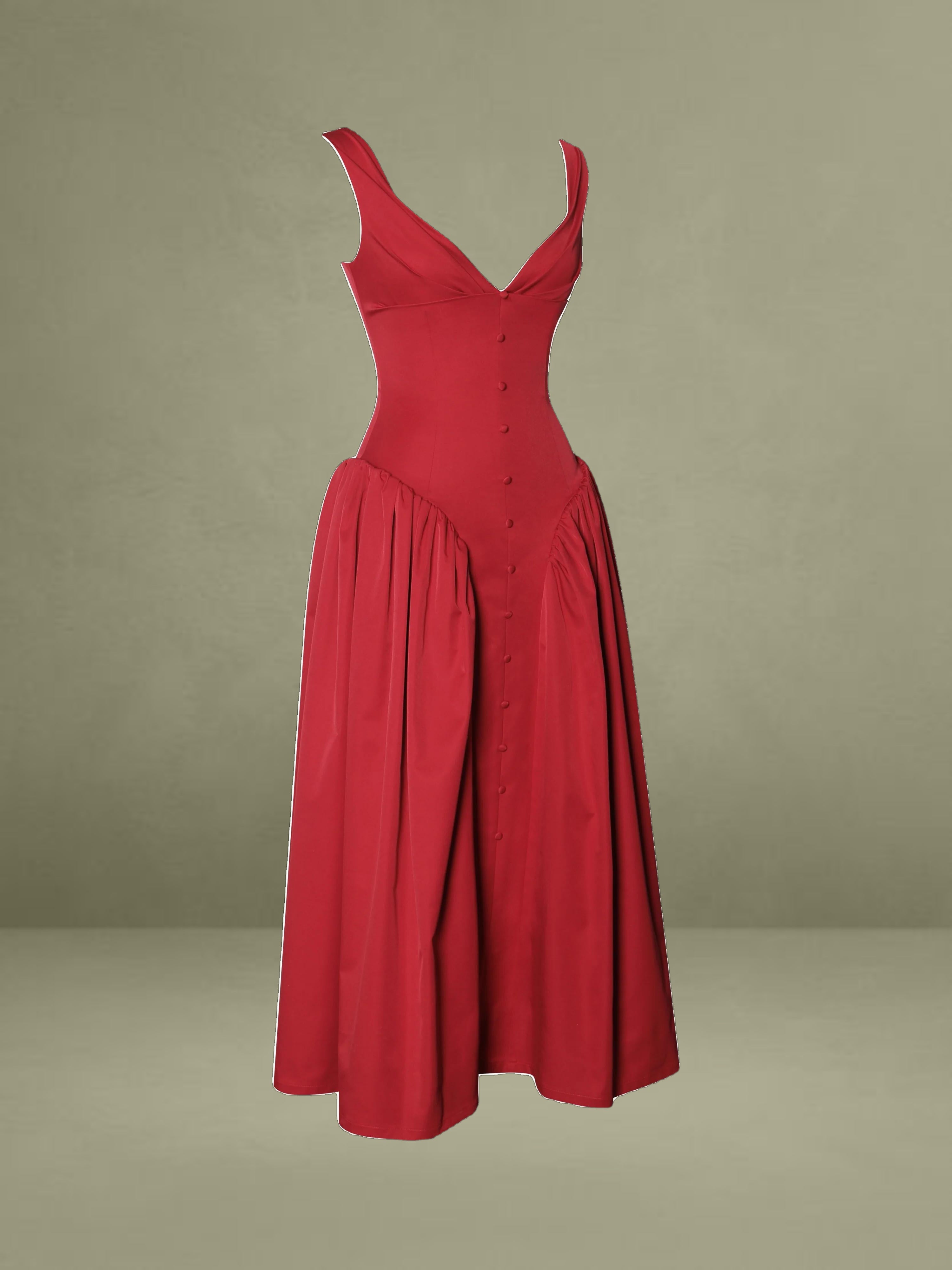 Turn heads with the timeless elegance of the Nahla Dress. This striking red midi dress features a flattering drop waist silhouette and a ruched front chest detail that adds a touch of romance. The sleeveless design and decorative buttons enhance its sophisticated charm, making it perfect for any special occasion. With inside skirt support for added volume and movement, the dress is fully lined for comfort and finished with an invisible zipper for a flawless fit. The Nahla Dress is your go-to piece for a refined and unforgettable look.