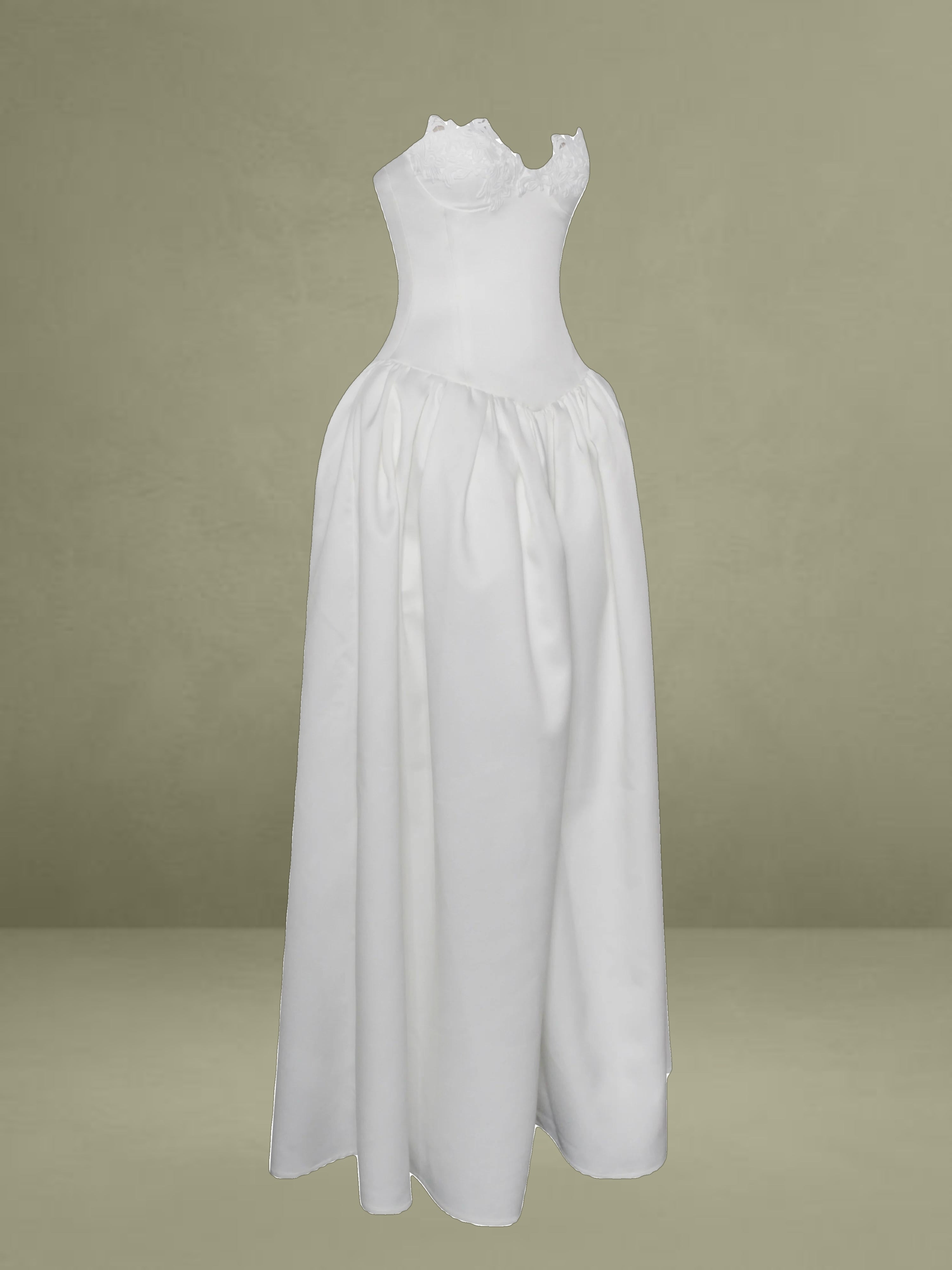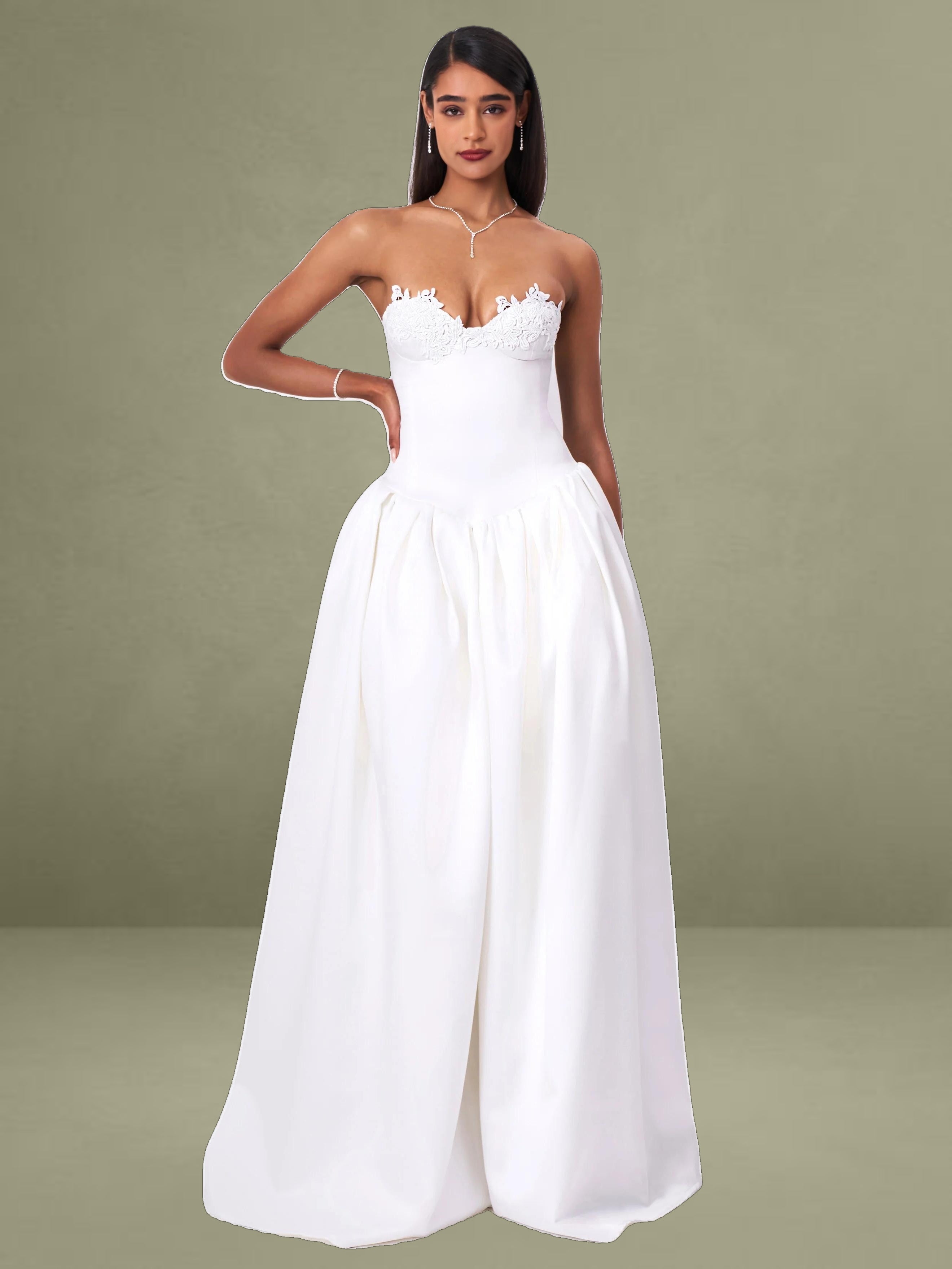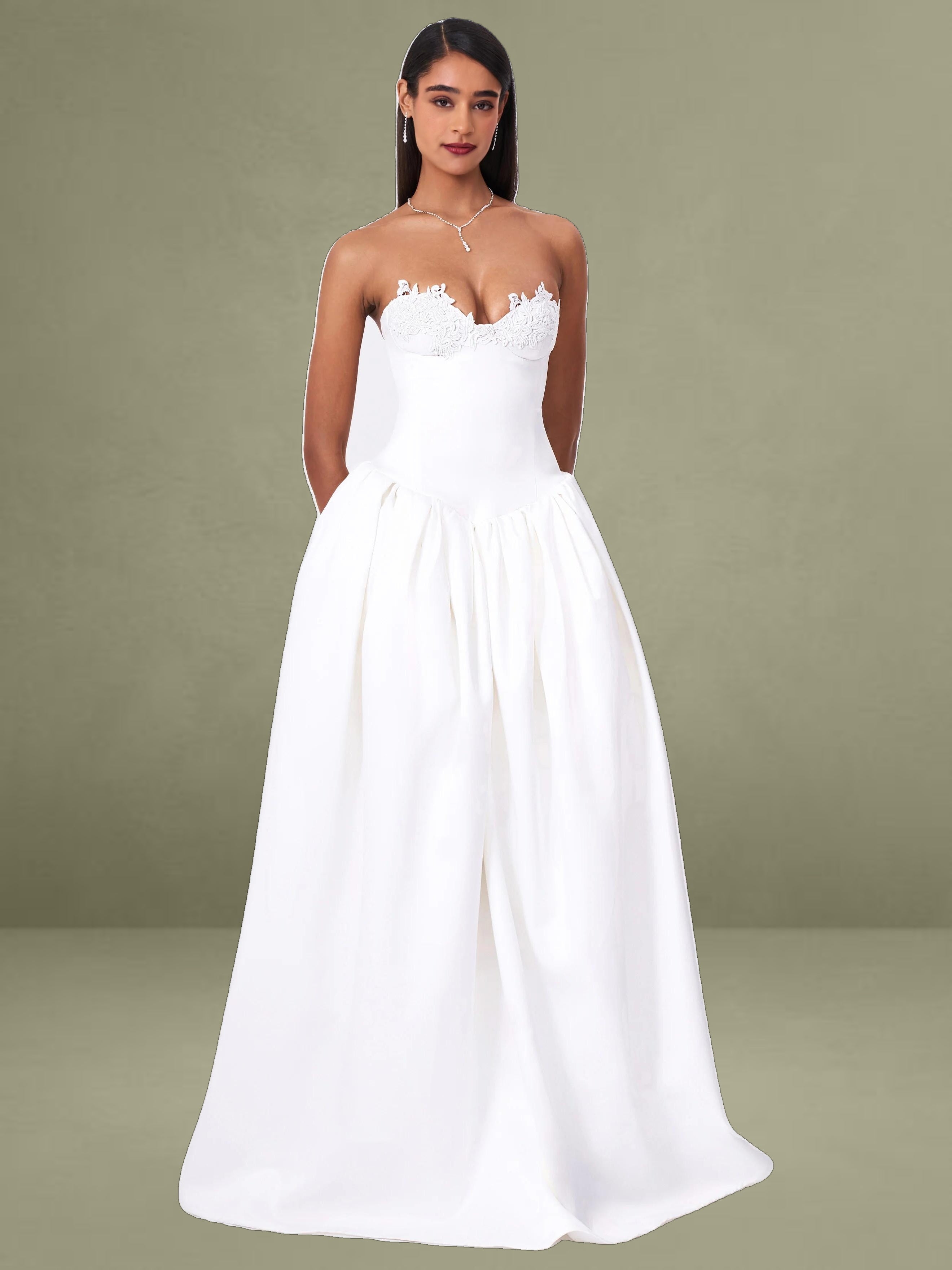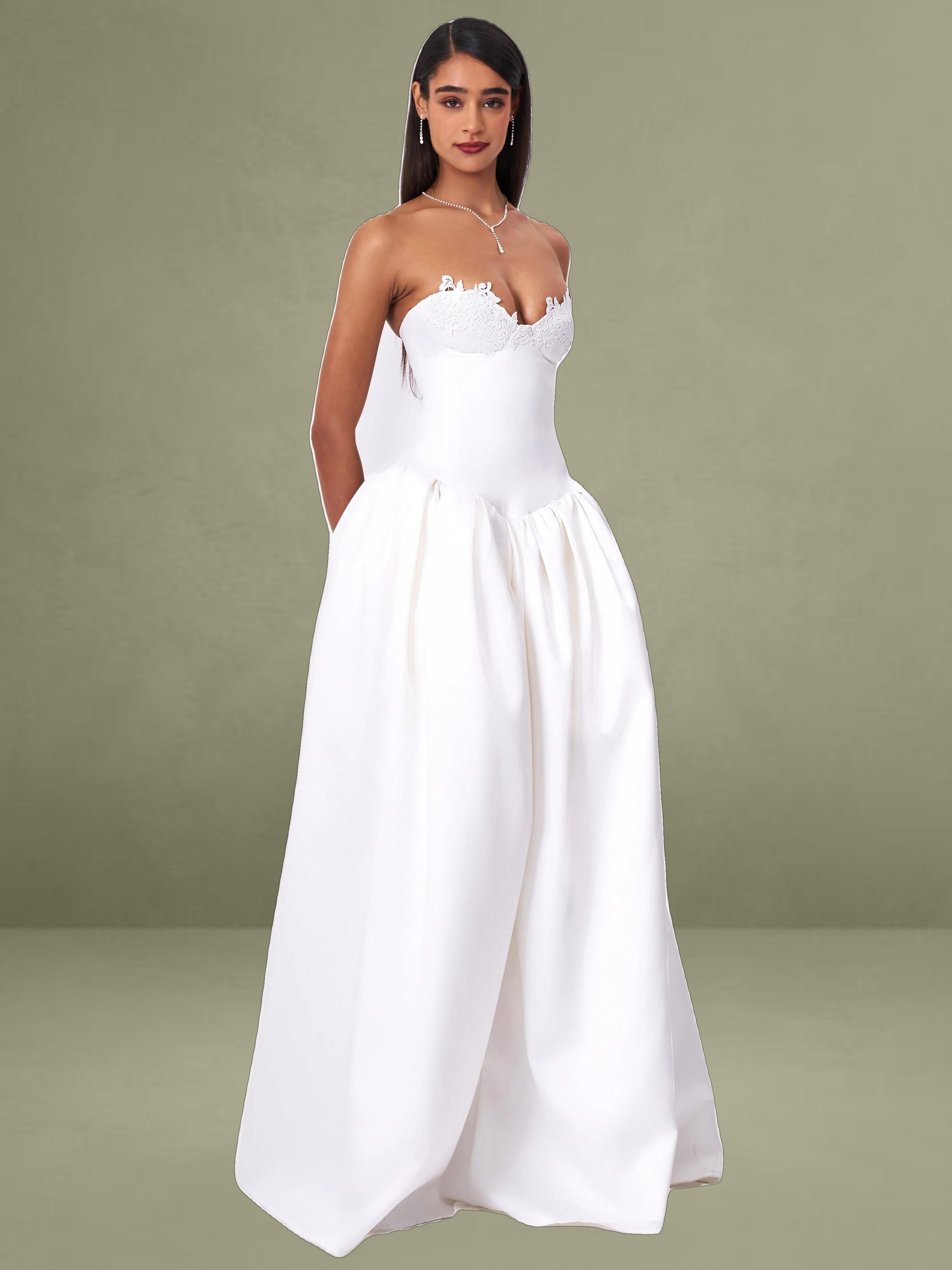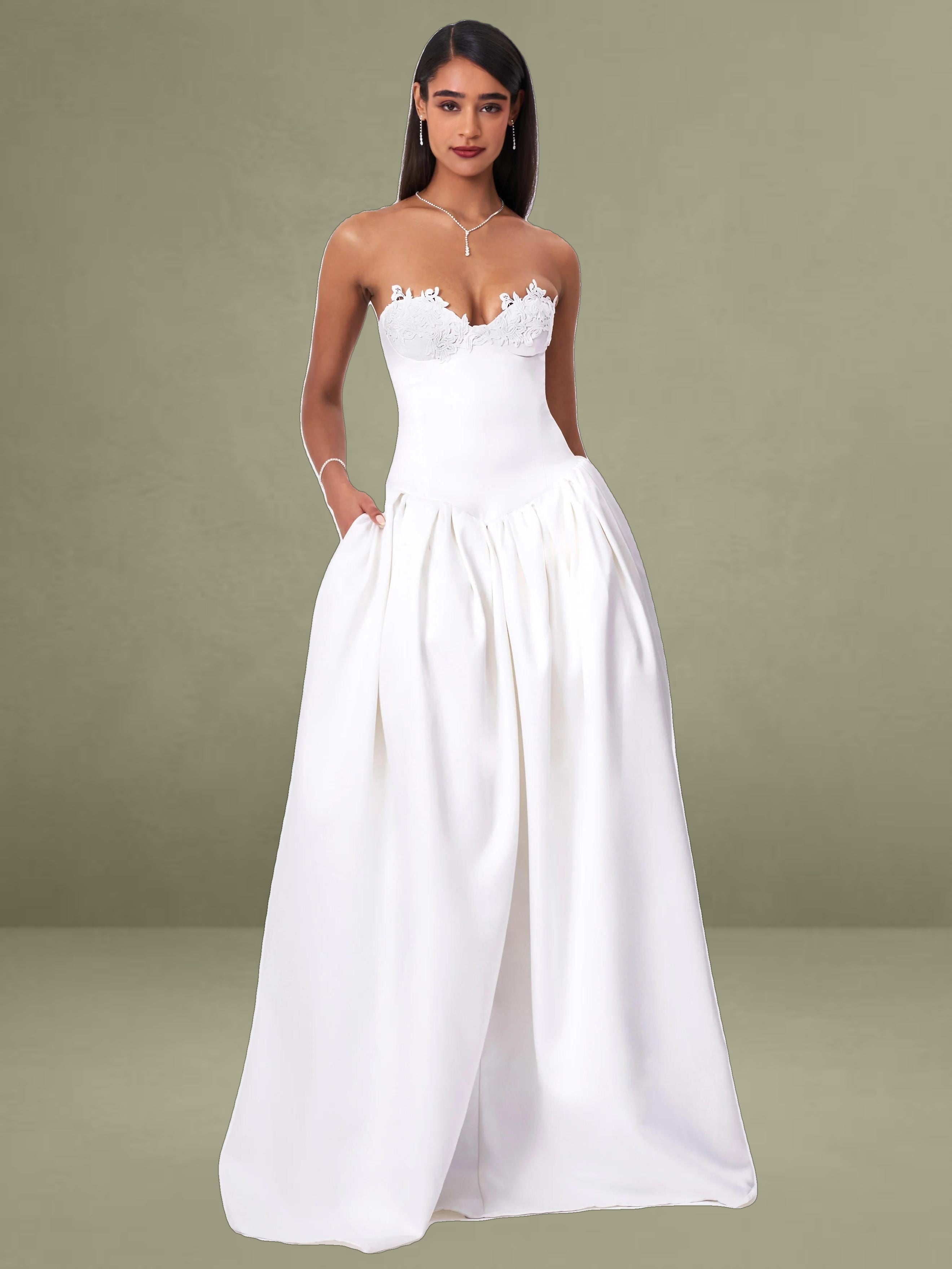 Radiate elegance with the Naila Dress, a timeless gown designed for weddings, engagements, formal events, and unforgettable summer parties. Crafted with precision, it features delicate lace trim at the bust that adds a romantic touch, complemented by a sleeveless design and padded cups for effortless support. The flattering drop waist flows into a voluminous full skirt, enhanced by inside supporting tulle for added drama and movement. Thoughtfully detailed with an invisible pocket and secured by an invisible zipper, the dress also includes built-in bones for a structured, flawless fit. Fully lined for comfort, the Naila Dress is the perfect choice for making a statement at your next wedding, birthday celebration, or formal event.