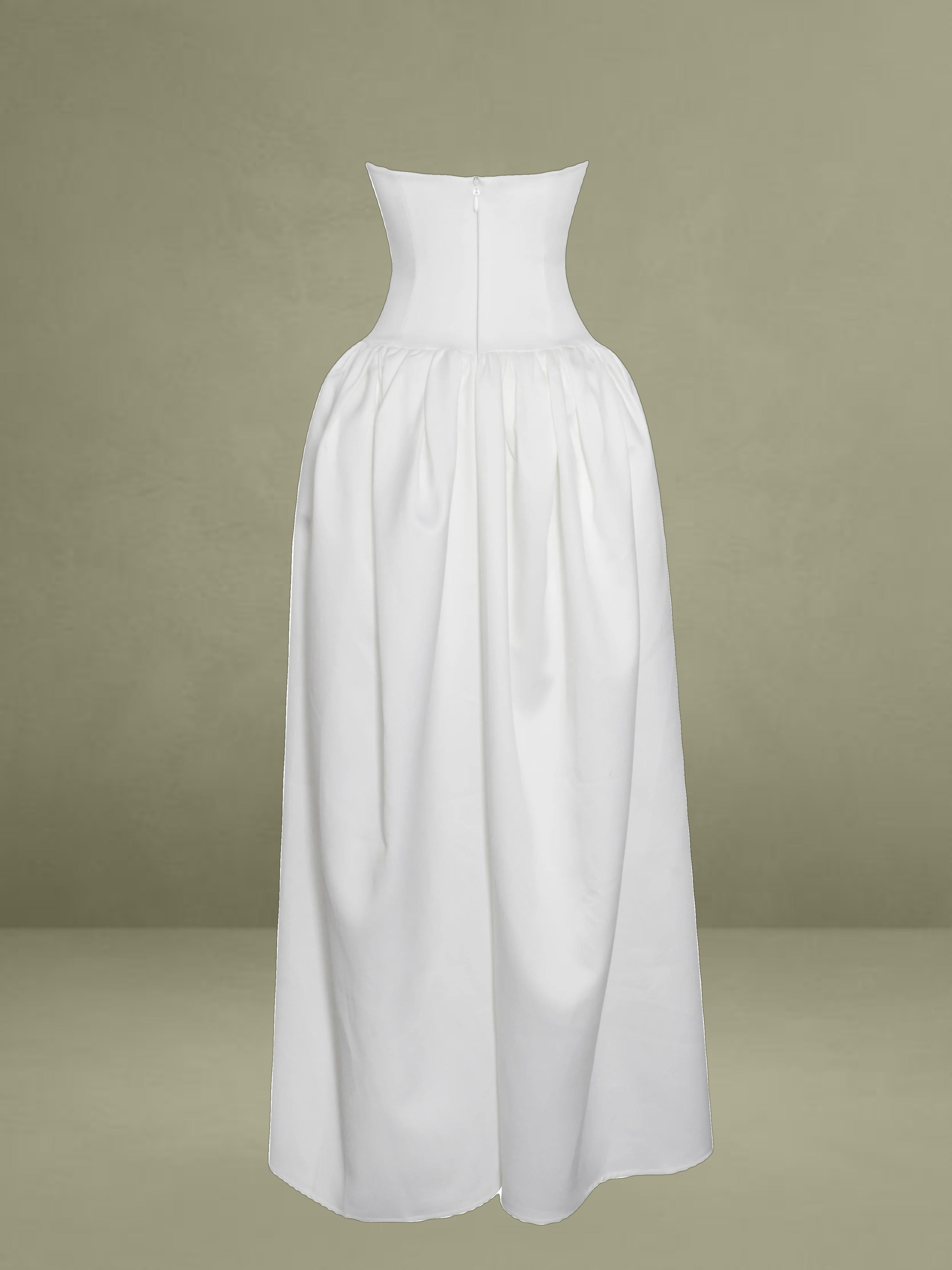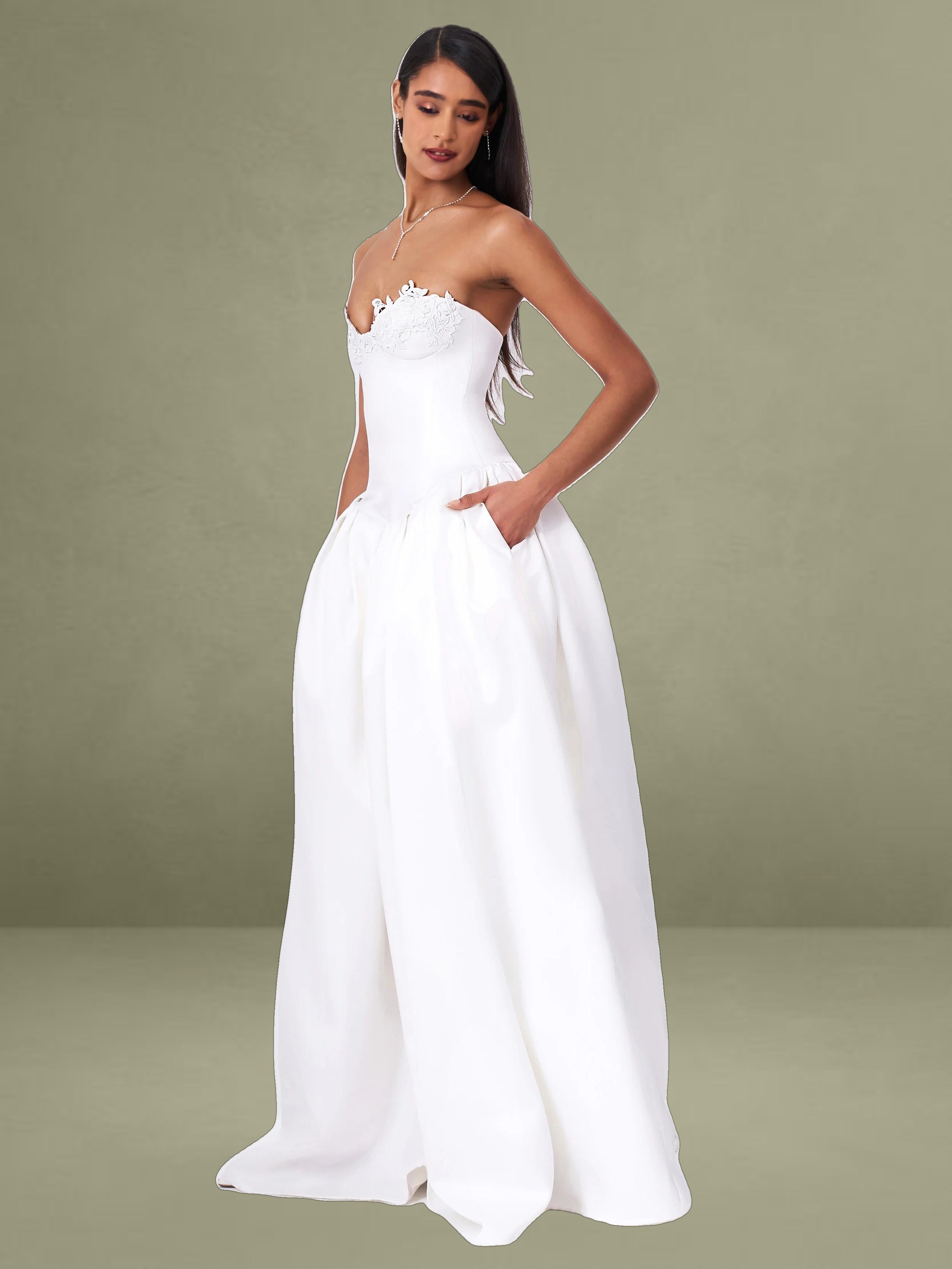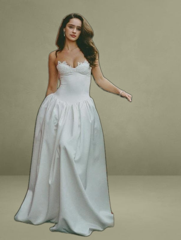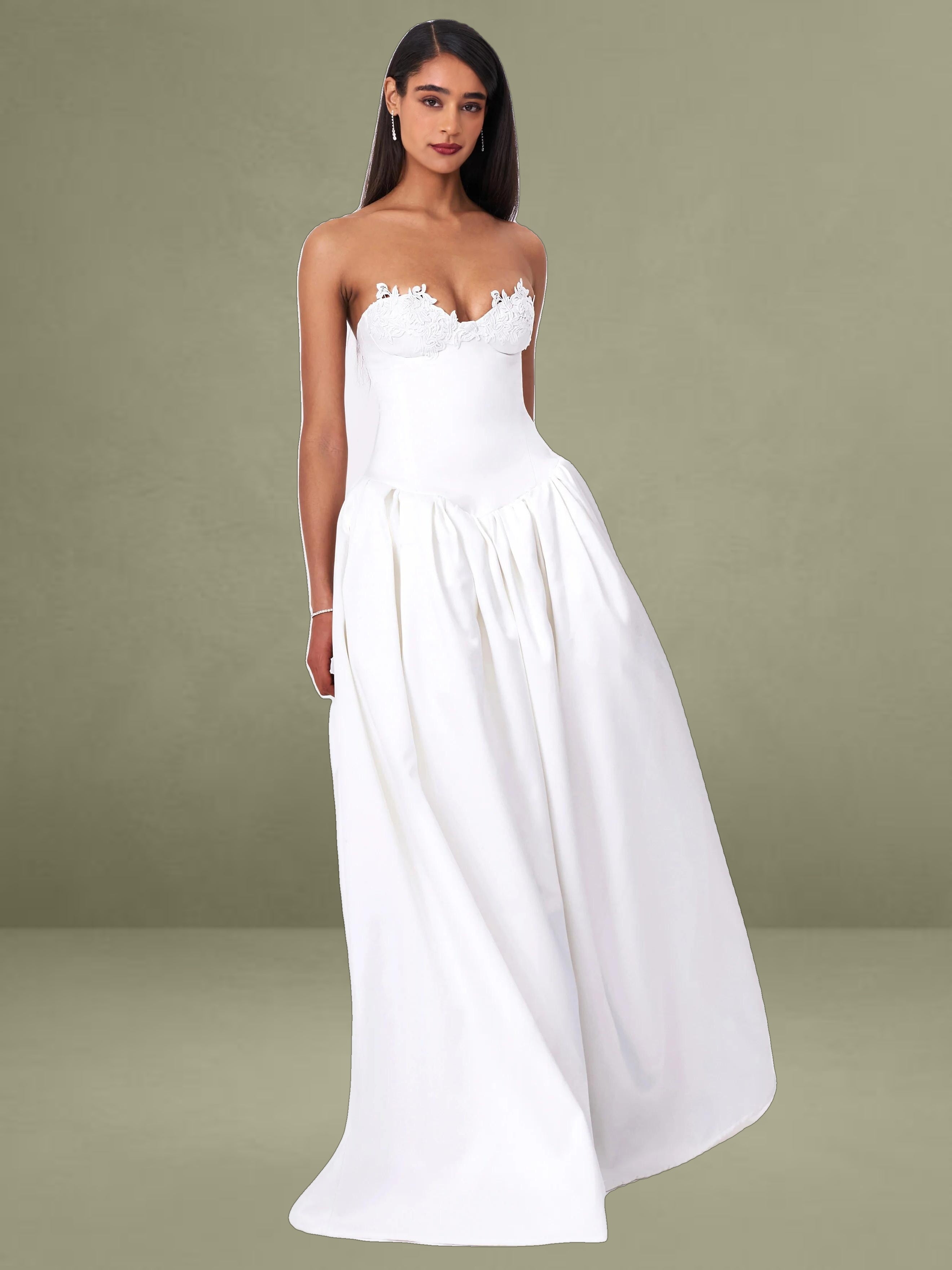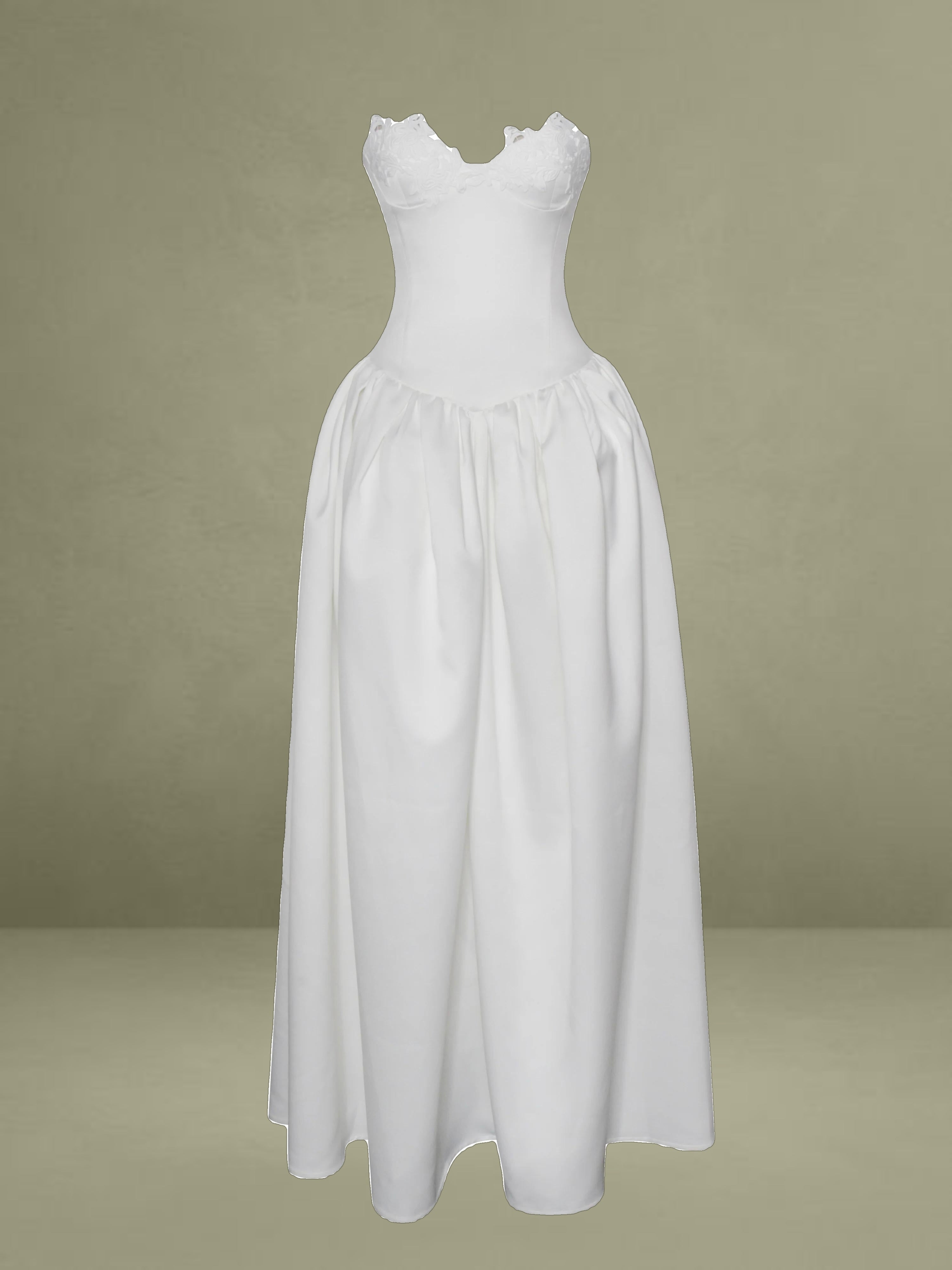 Radiate elegance with the Naila Dress, a timeless gown designed for weddings, engagements, formal events, and unforgettable summer parties. Crafted with precision, it features delicate lace trim at the bust that adds a romantic touch, complemented by a sleeveless design and padded cups for effortless support. The flattering drop waist flows into a voluminous full skirt, enhanced by inside supporting tulle for added drama and movement. Thoughtfully detailed with an invisible pocket and secured by an invisible zipper, the dress also includes built-in bones for a structured, flawless fit. Fully lined for comfort, the Naila Dress is the perfect choice for making a statement at your next wedding, birthday celebration, or formal event.