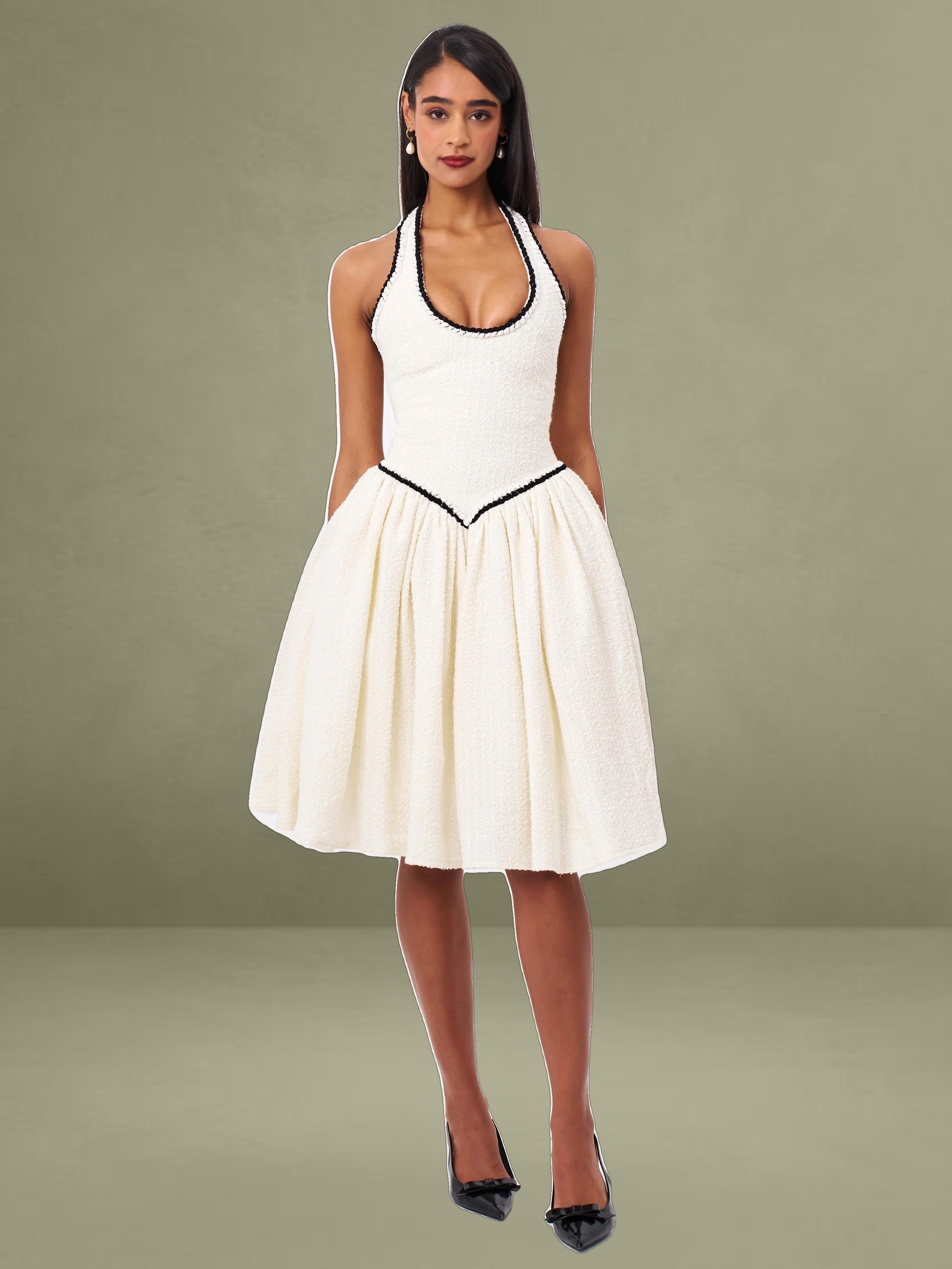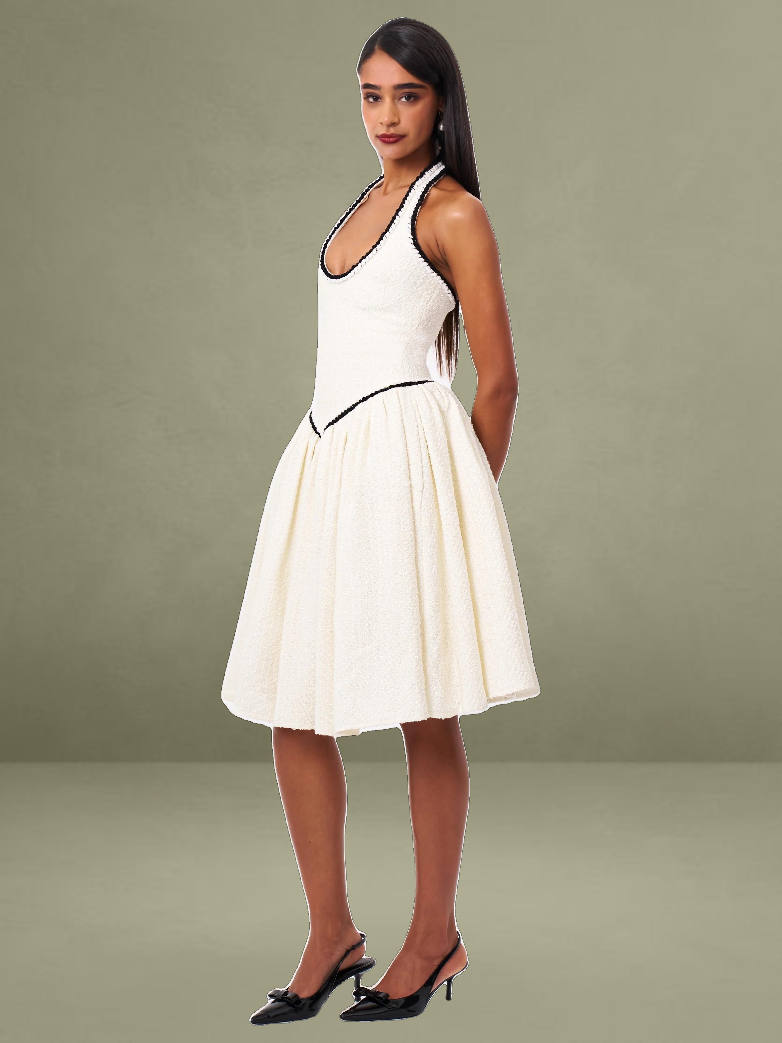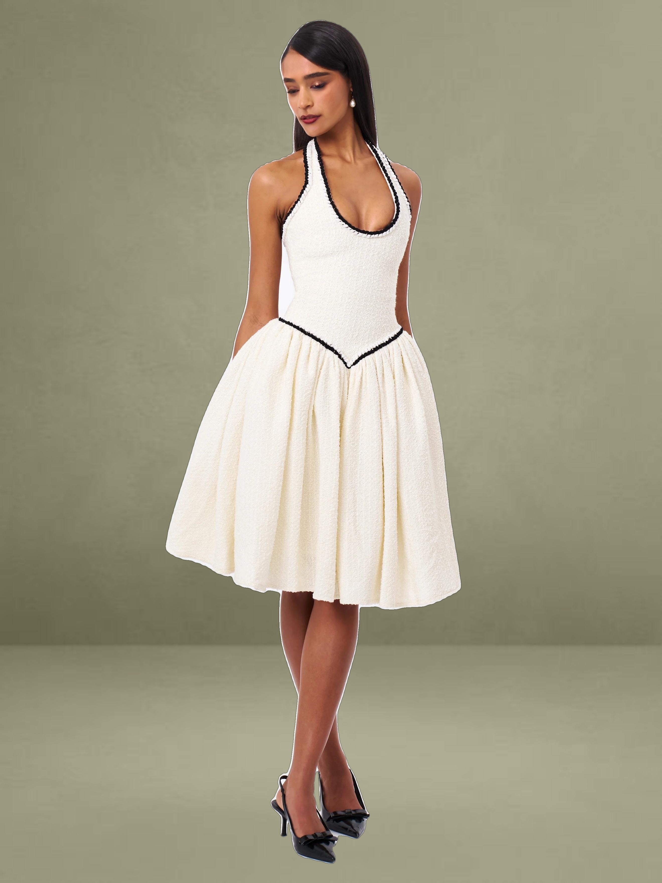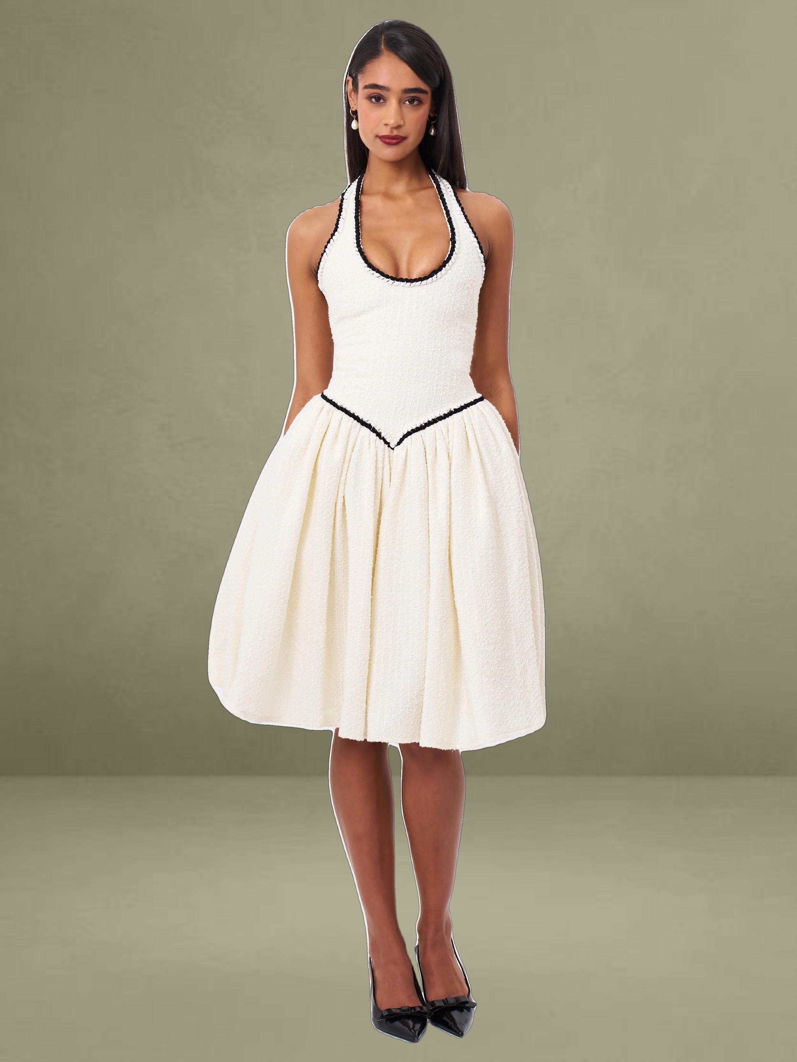 The Natalie Dress blends timeless sophistication with modern details for an effortlessly chic look. Designed with a graceful U-neck halter neckline, it showcases a flattering black and white plait trim that accentuates its elegant lines. Crafted from luxurious tweed boucle fabric, this midi-length dress features a stylish drop waist and V-shape waistline for a tailored, figure-enhancing silhouette. Functional pockets add practicality, while the under-skirt supporting tulle ensures the skirt maintains its structured flair. Fully lined for comfort and a seamless fit, the Natalie Dress is the epitome of refined elegance, perfect for any occasion.