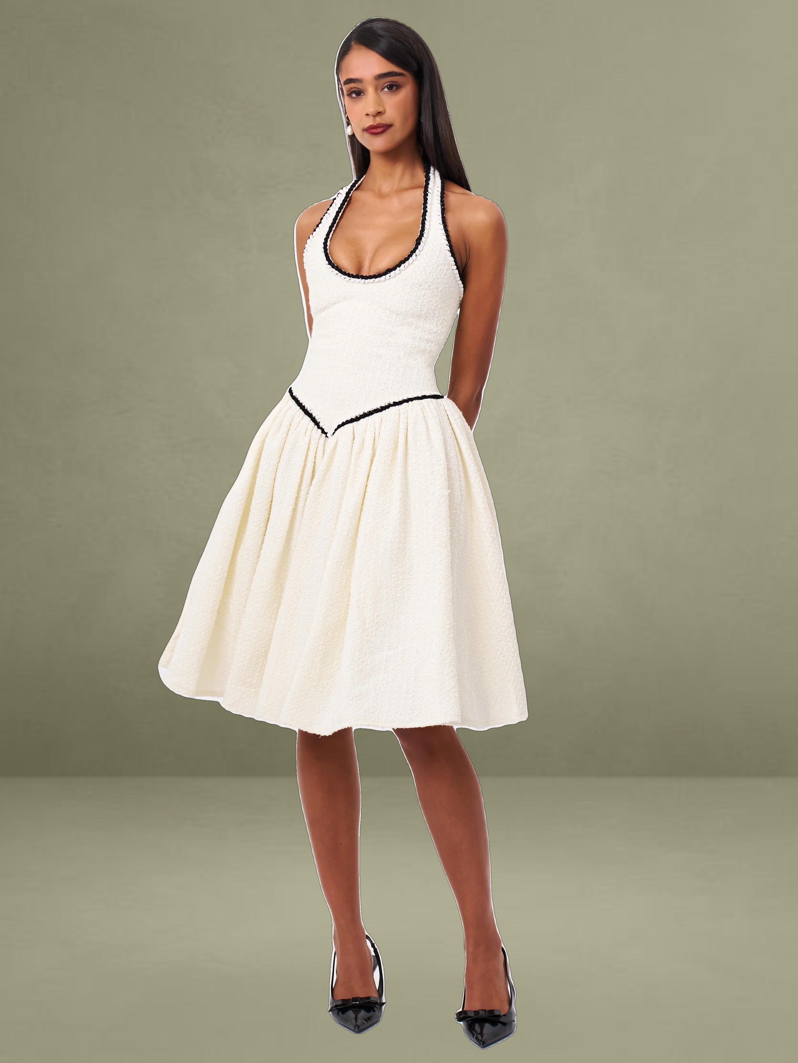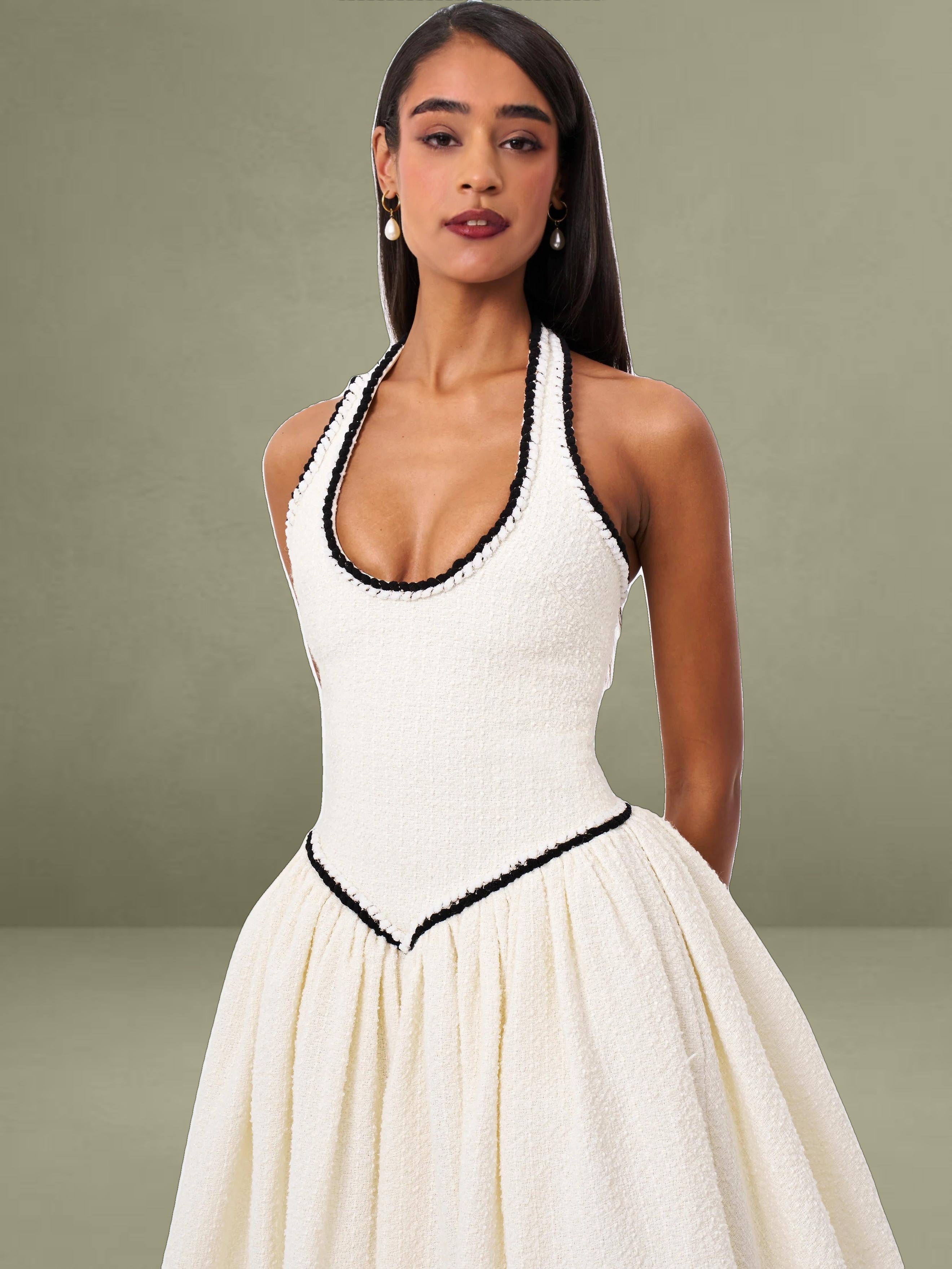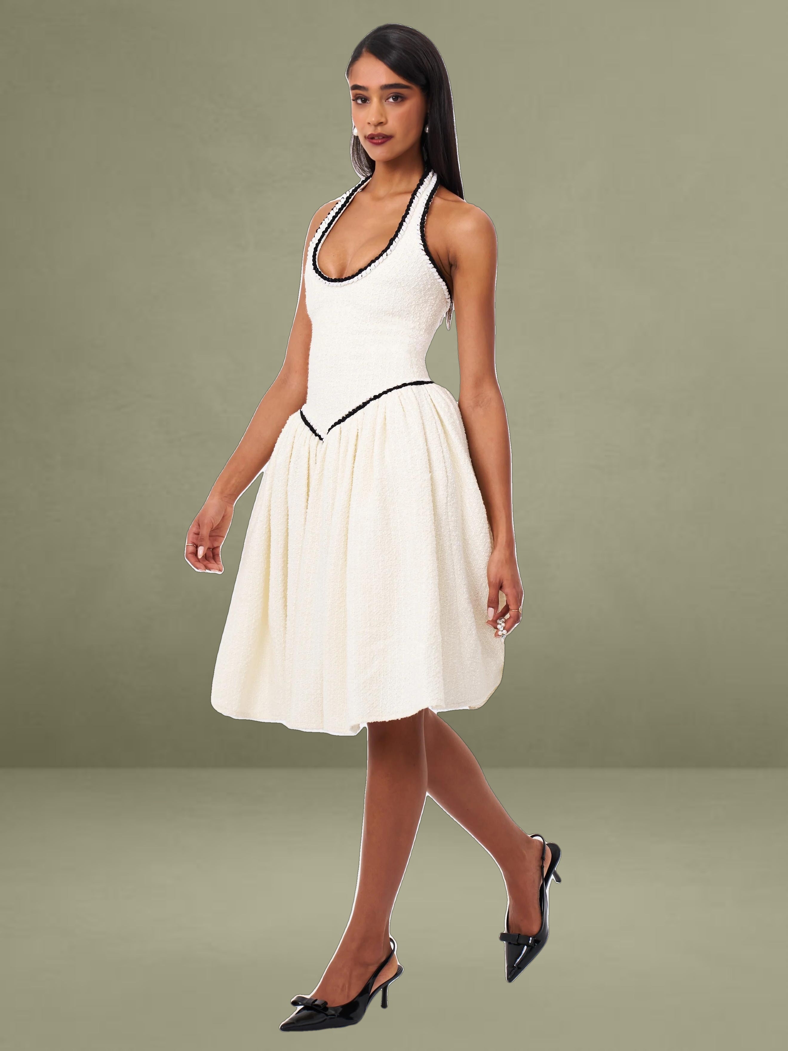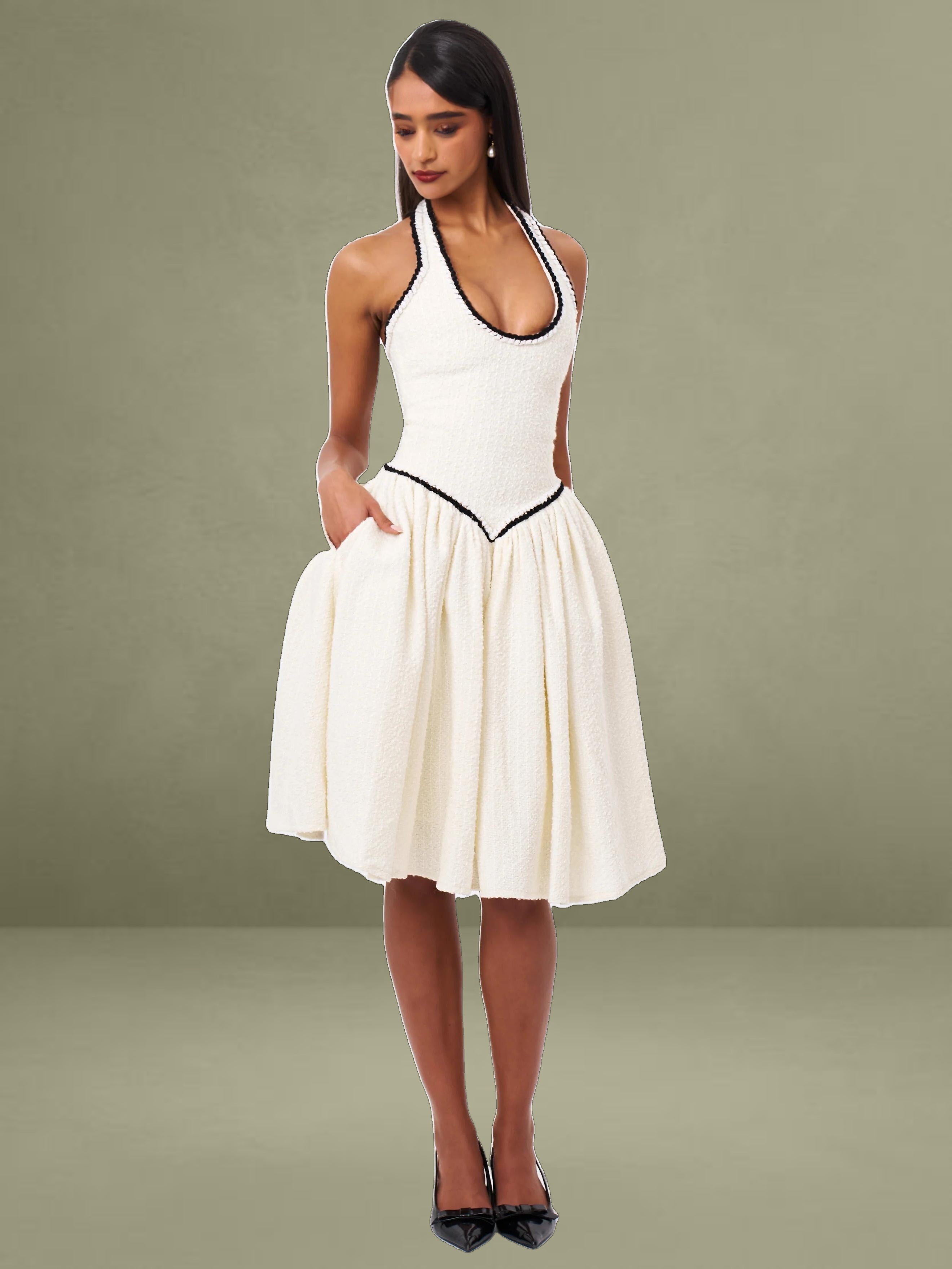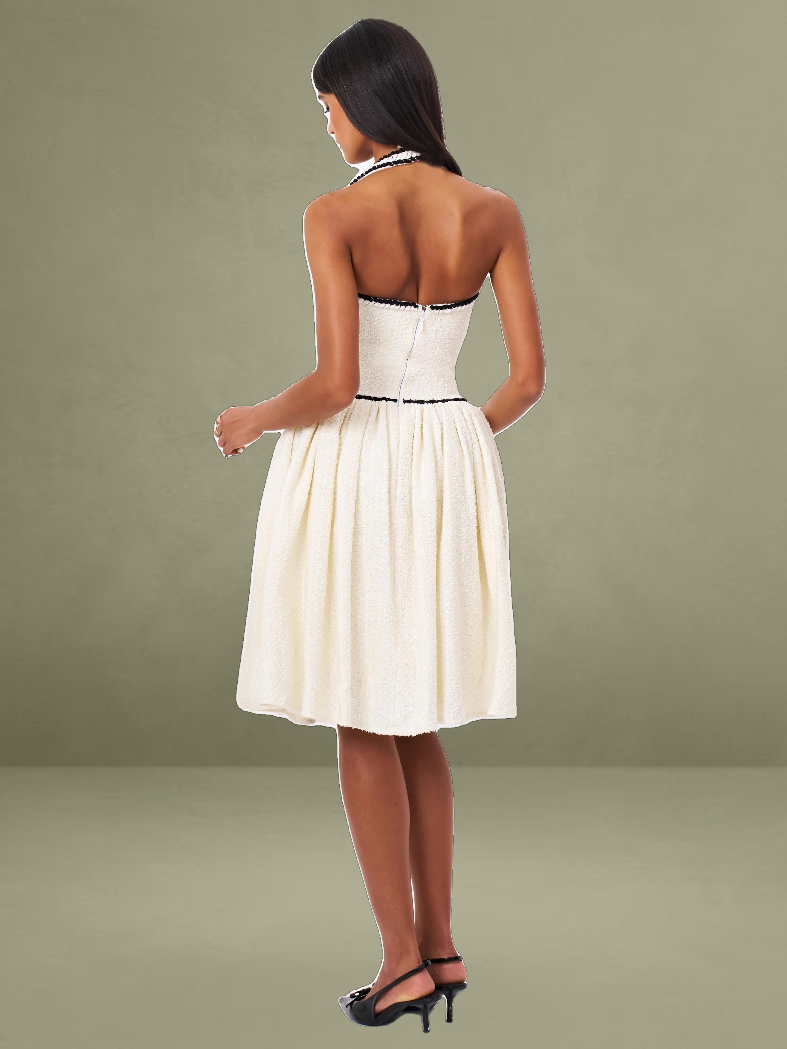 The Natalie Dress blends timeless sophistication with modern details for an effortlessly chic look. Designed with a graceful U-neck halter neckline, it showcases a flattering black and white plait trim that accentuates its elegant lines. Crafted from luxurious tweed boucle fabric, this midi-length dress features a stylish drop waist and V-shape waistline for a tailored, figure-enhancing silhouette. Functional pockets add practicality, while the under-skirt supporting tulle ensures the skirt maintains its structured flair. Fully lined for comfort and a seamless fit, the Natalie Dress is the epitome of refined elegance, perfect for any occasion.