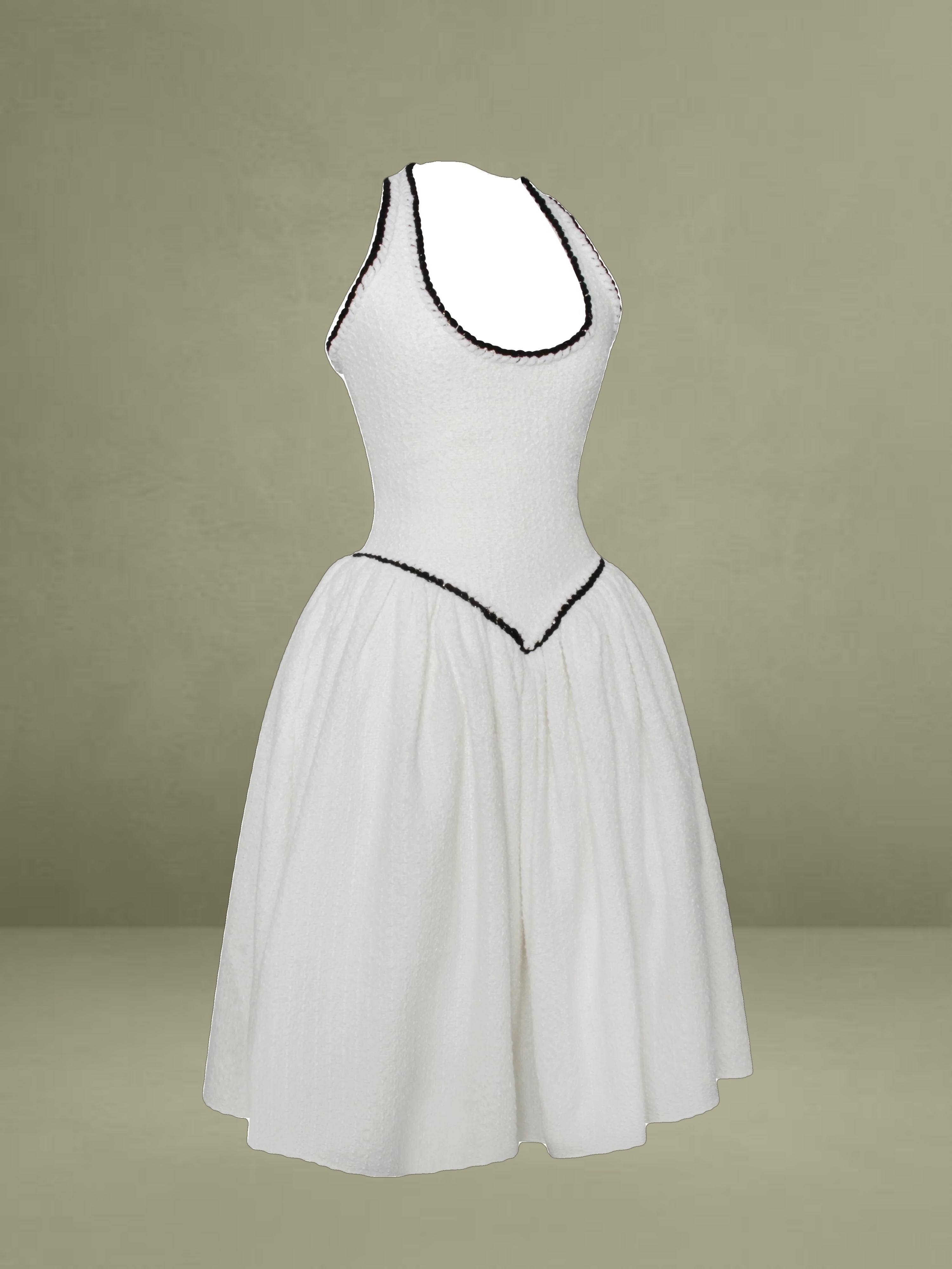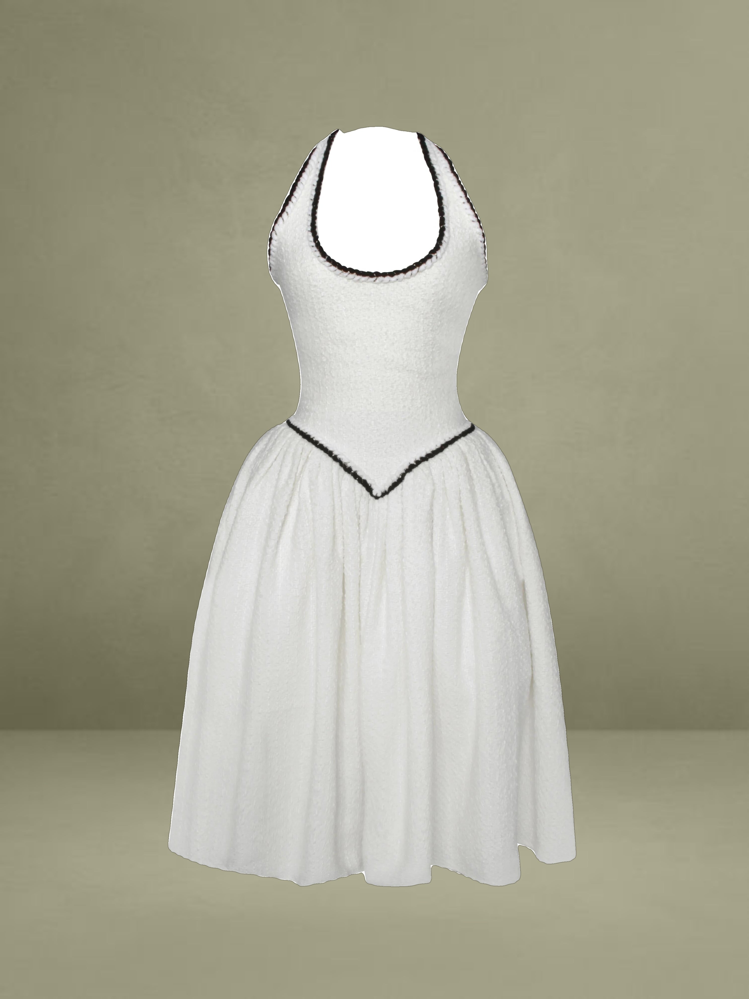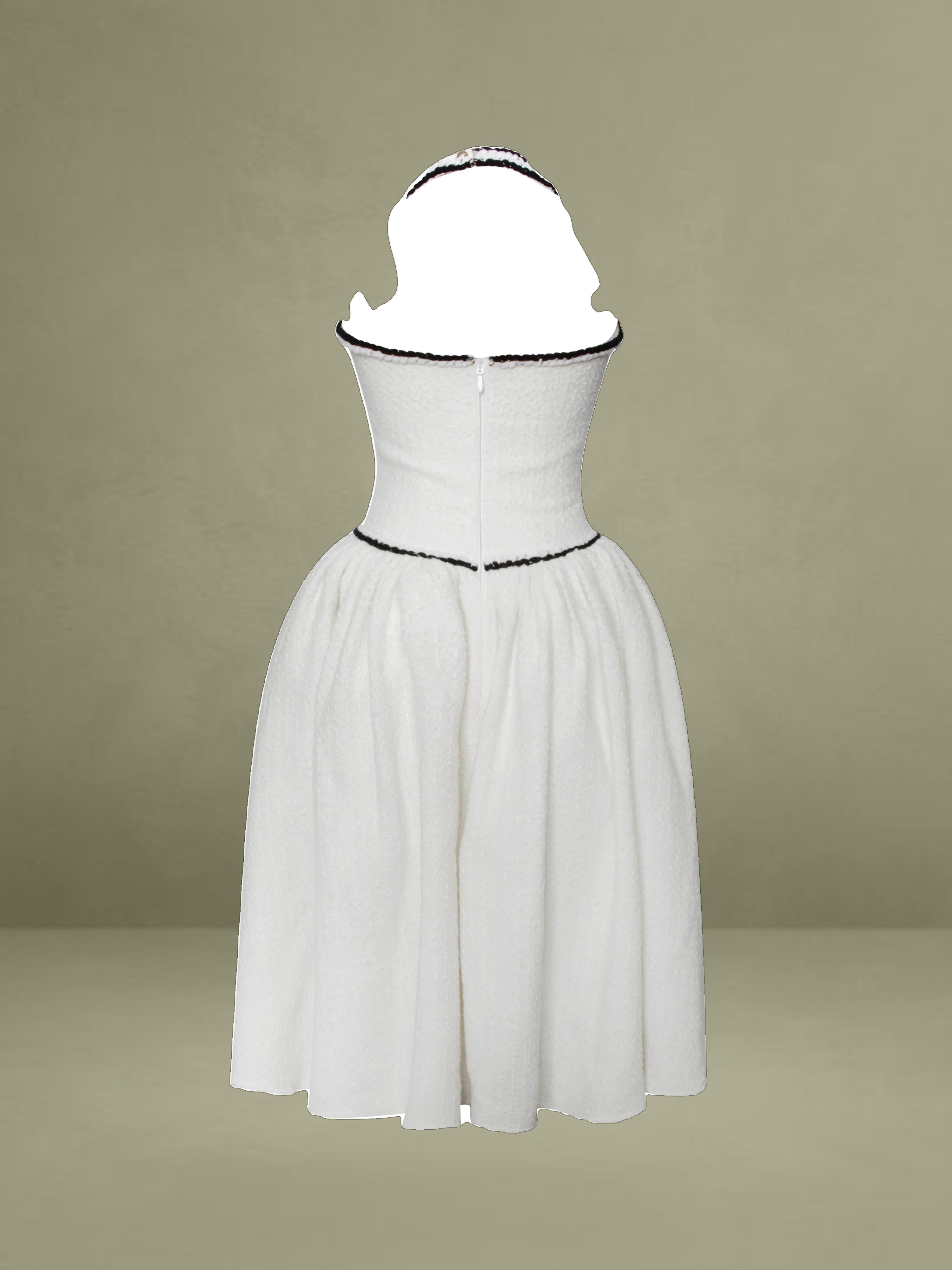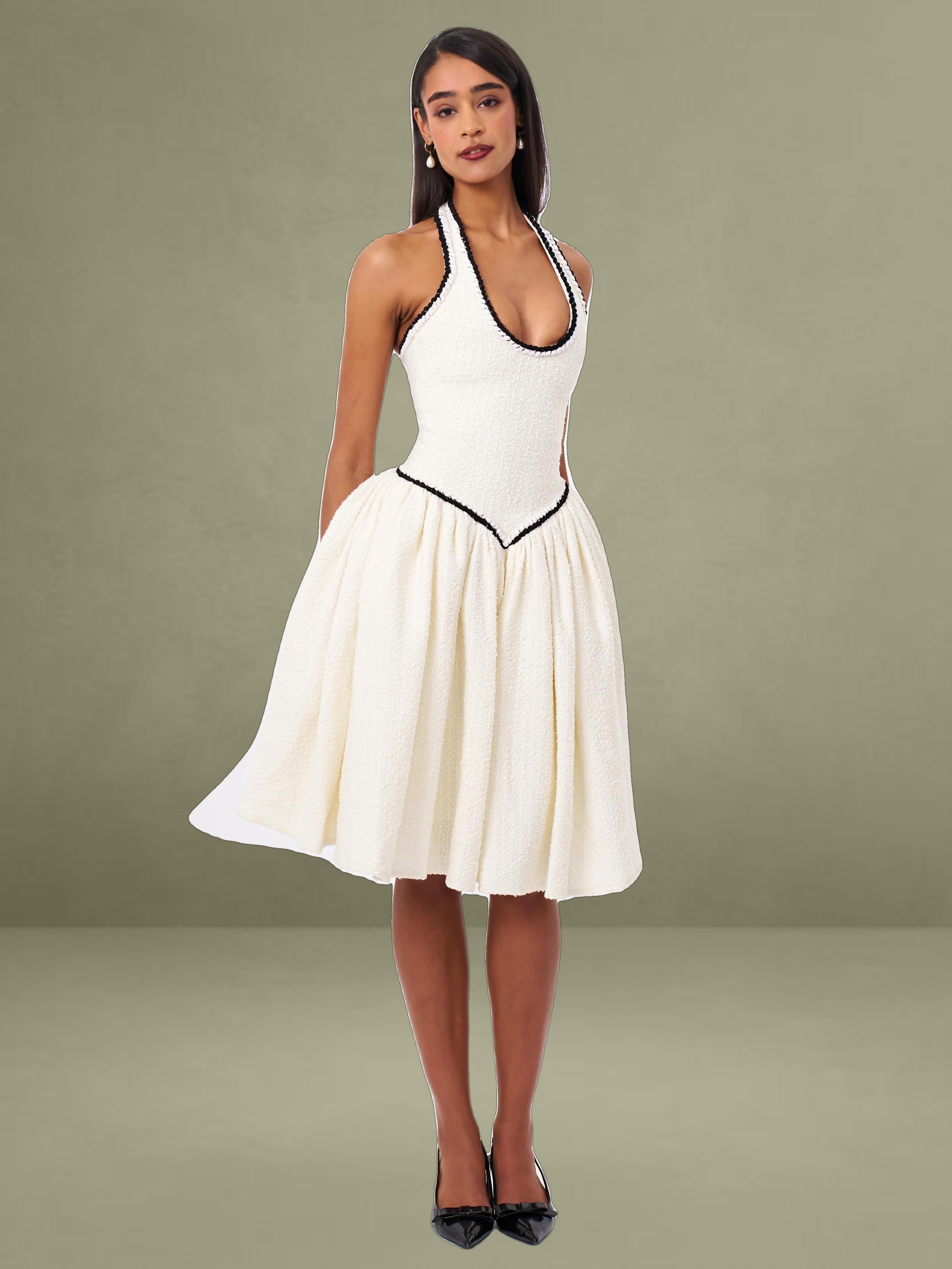 The Natalie Dress blends timeless sophistication with modern details for an effortlessly chic look. Designed with a graceful U-neck halter neckline, it showcases a flattering black and white plait trim that accentuates its elegant lines. Crafted from luxurious tweed boucle fabric, this midi-length dress features a stylish drop waist and V-shape waistline for a tailored, figure-enhancing silhouette. Functional pockets add practicality, while the under-skirt supporting tulle ensures the skirt maintains its structured flair. Fully lined for comfort and a seamless fit, the Natalie Dress is the epitome of refined elegance, perfect for any occasion.