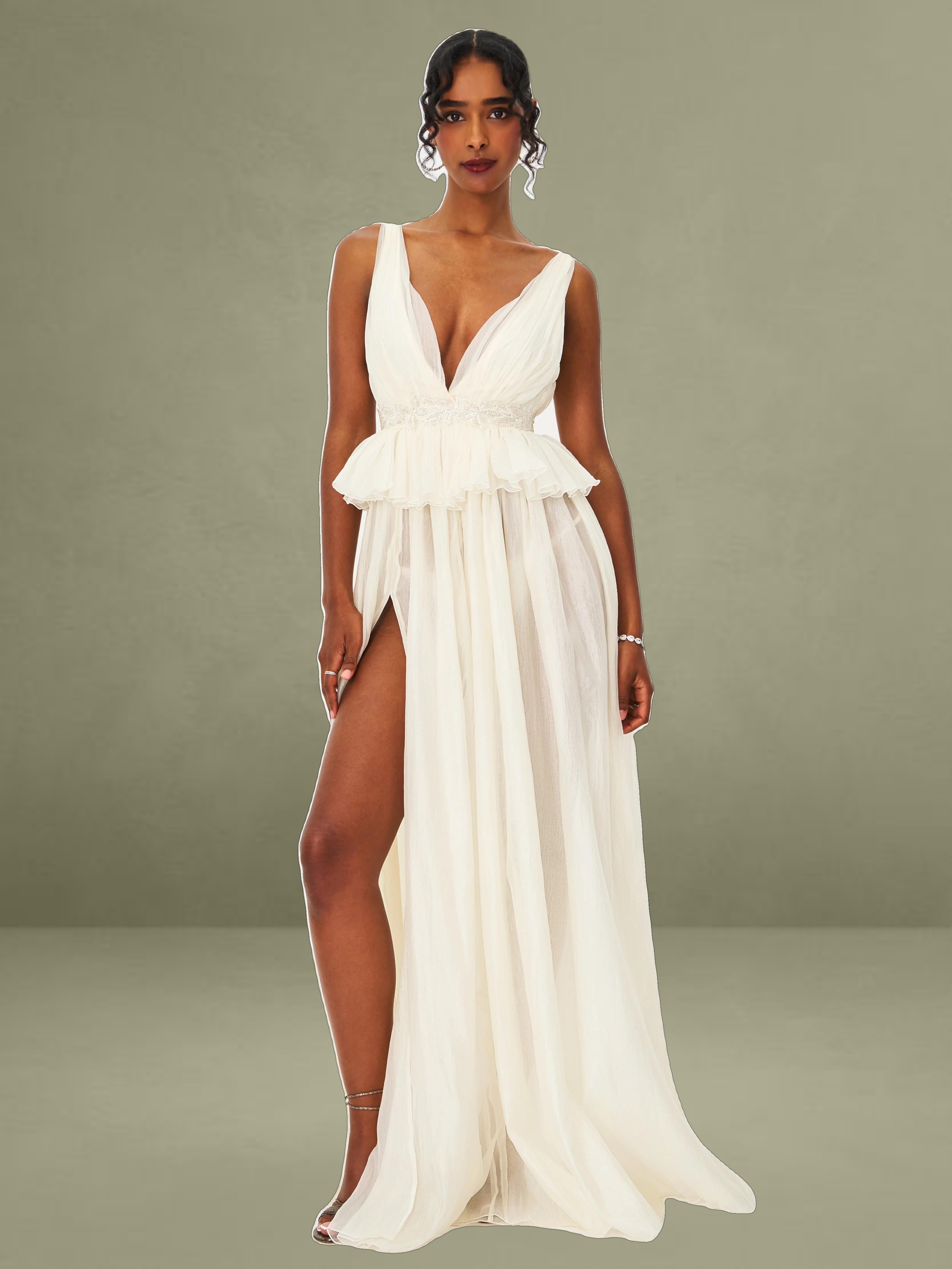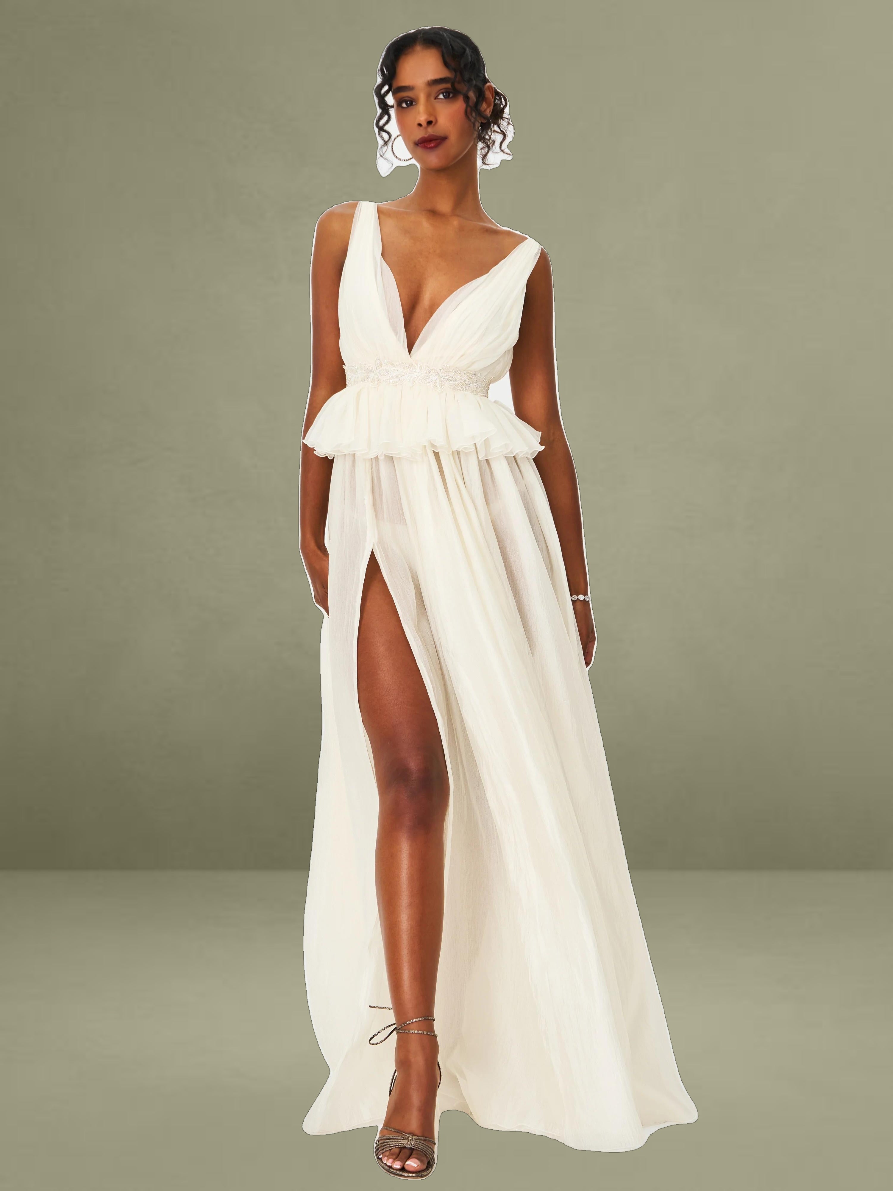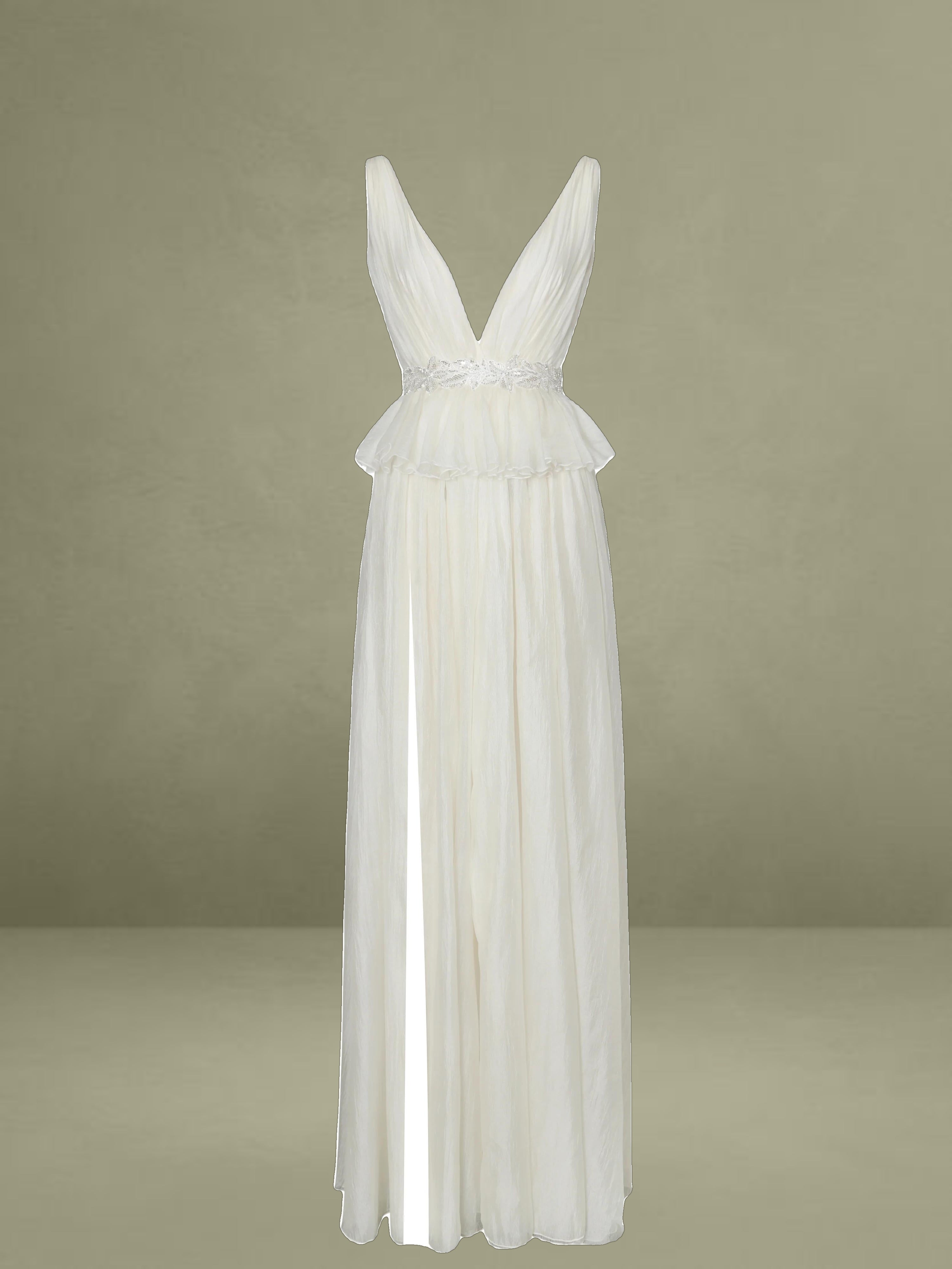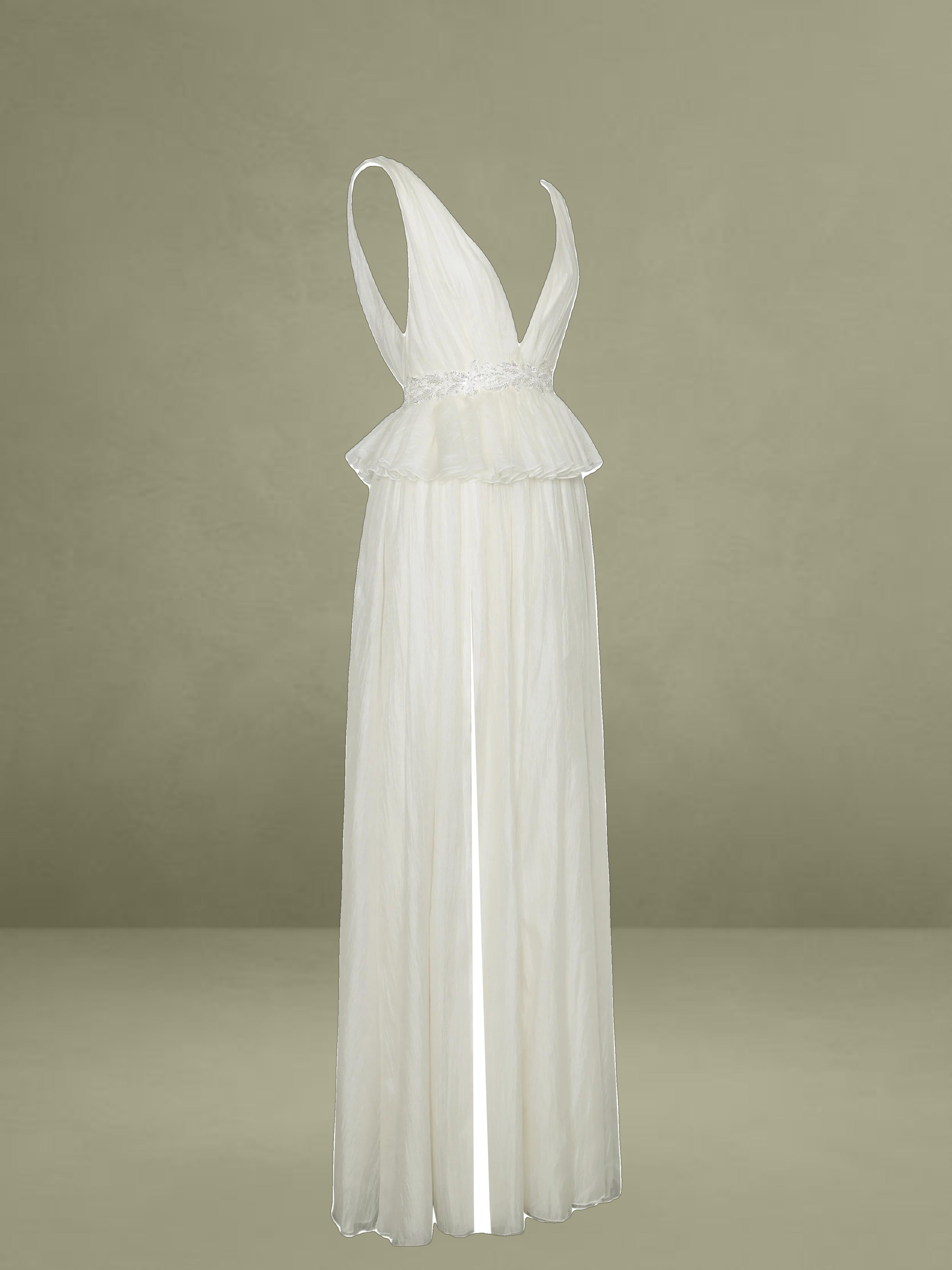 Enchanting and elegantly effortless, this summer gown is made from off-white pleated chiffon with a silver sheen. It has a flowing, layered shape and a high slit for easy movement. The maxi gown features a flattering V-neck and flares nicely at the waist. A beaded belt adds a bit of sparkle, and an invisible zipper ensures a snug fit. Light, airy, and radiant - ideal for summer weddings, garden parties, or any occasion when you want to look amazing.