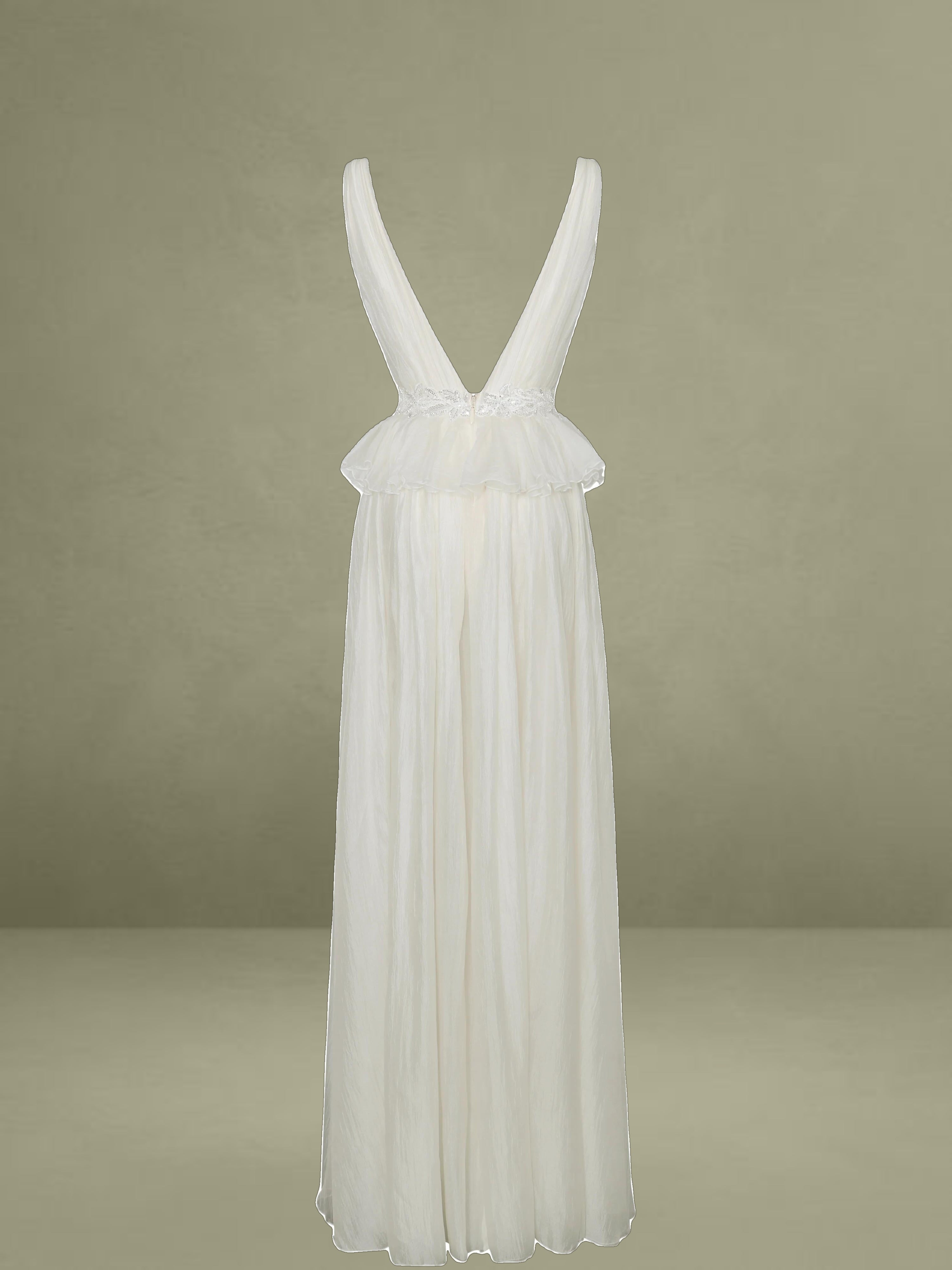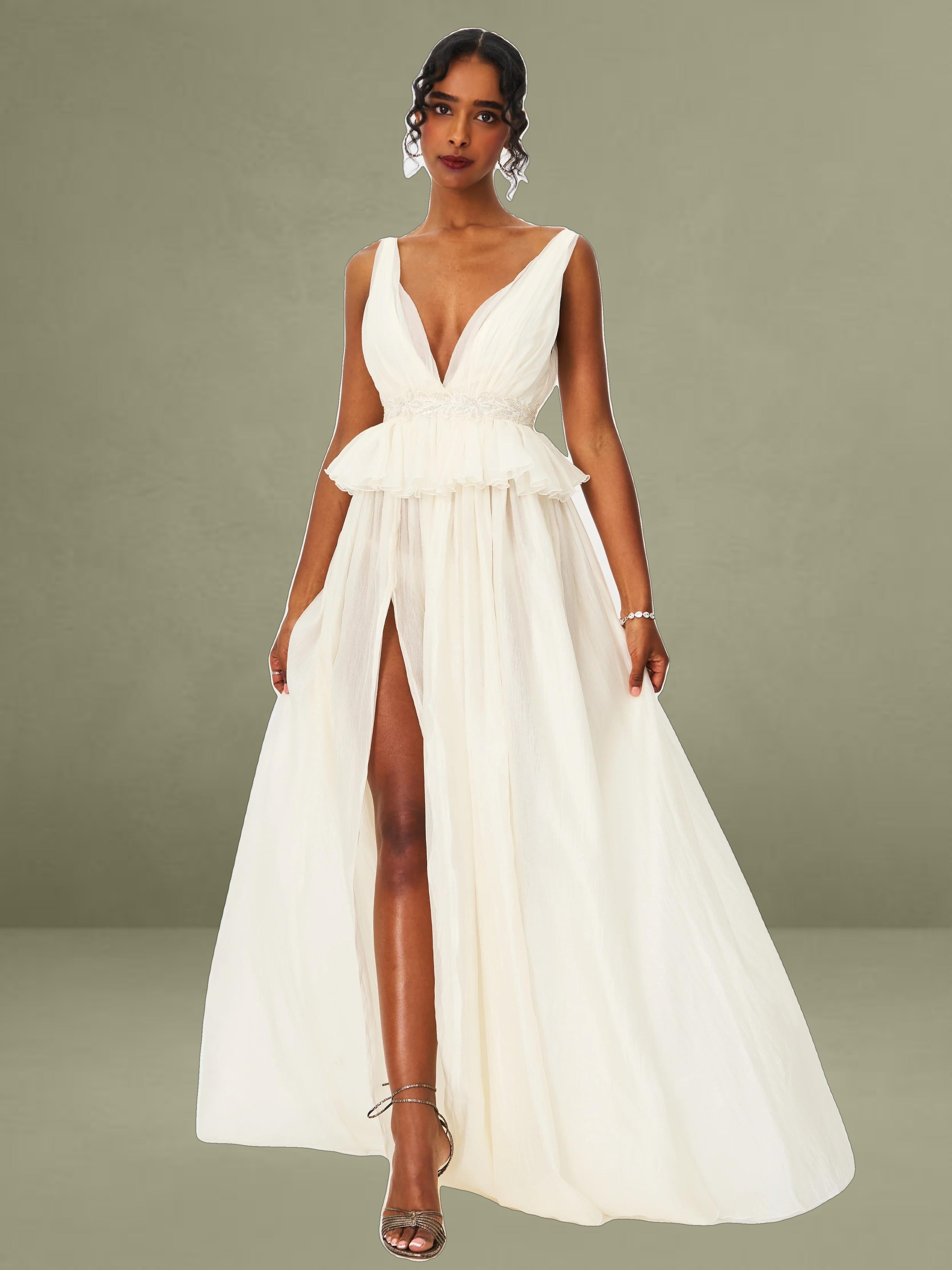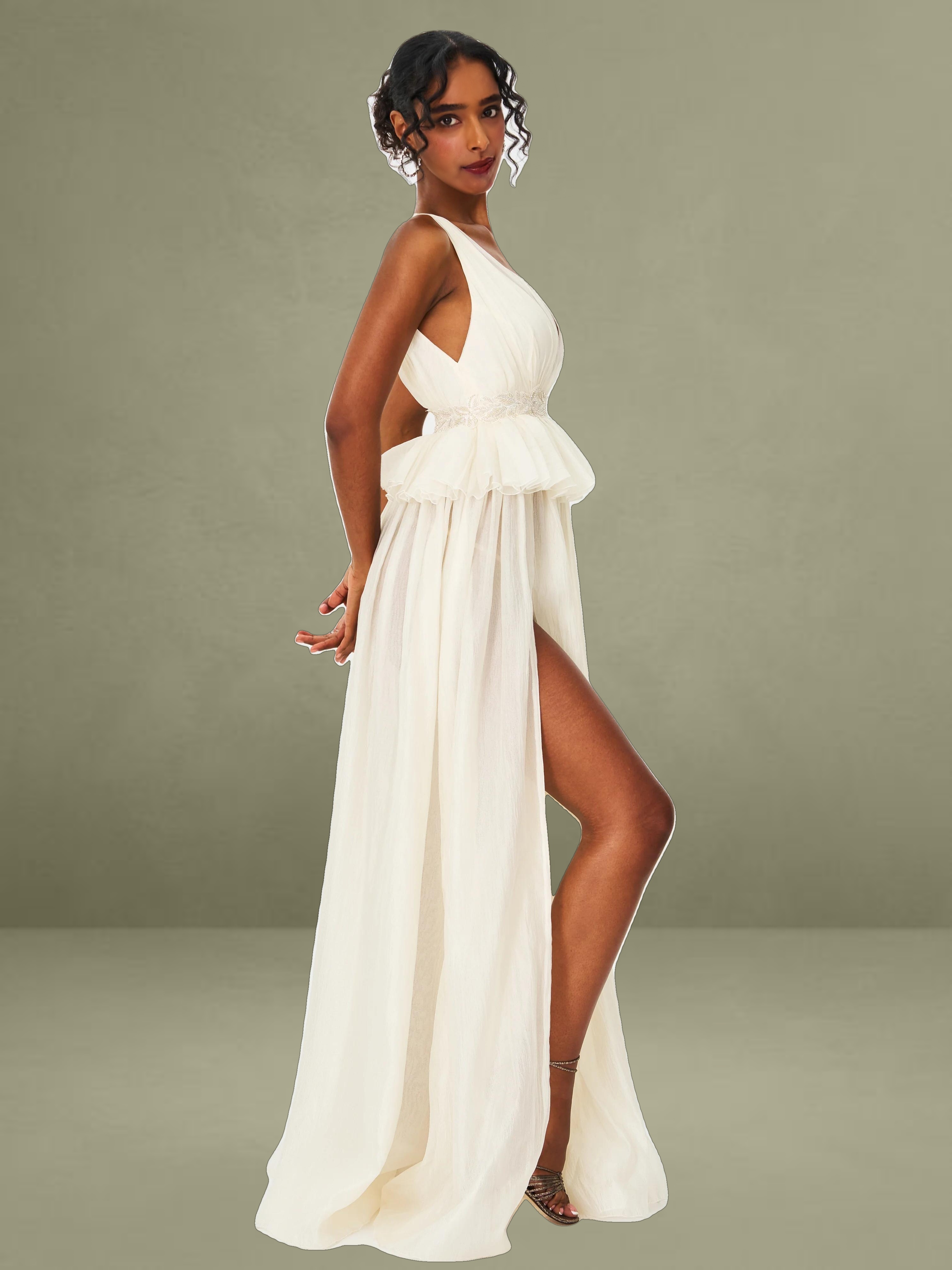 Enchanting and elegantly effortless, this summer gown is made from off-white pleated chiffon with a silver sheen. It has a flowing, layered shape and a high slit for easy movement. The maxi gown features a flattering V-neck and flares nicely at the waist. A beaded belt adds a bit of sparkle, and an invisible zipper ensures a snug fit. Light, airy, and radiant - ideal for summer weddings, garden parties, or any occasion when you want to look amazing.