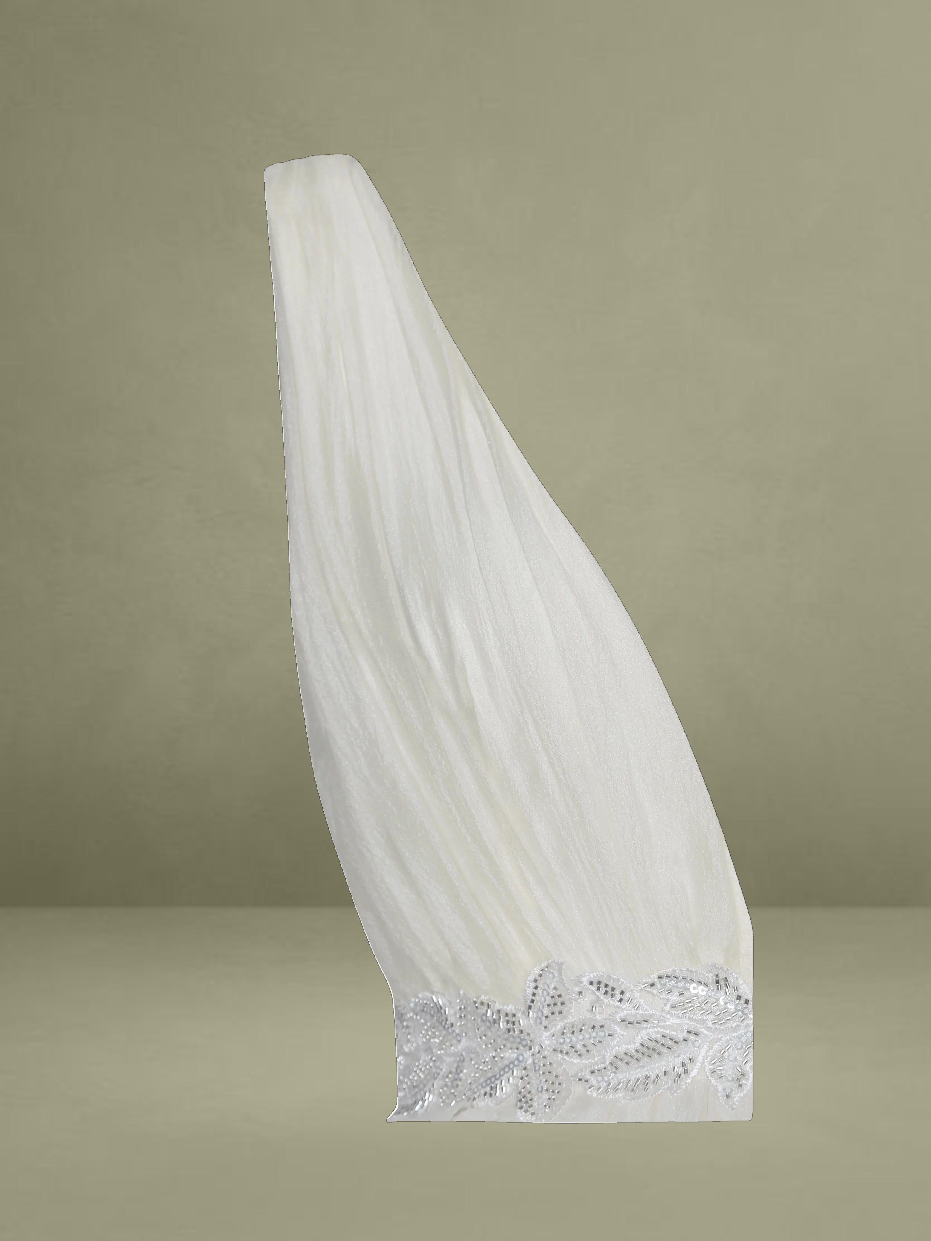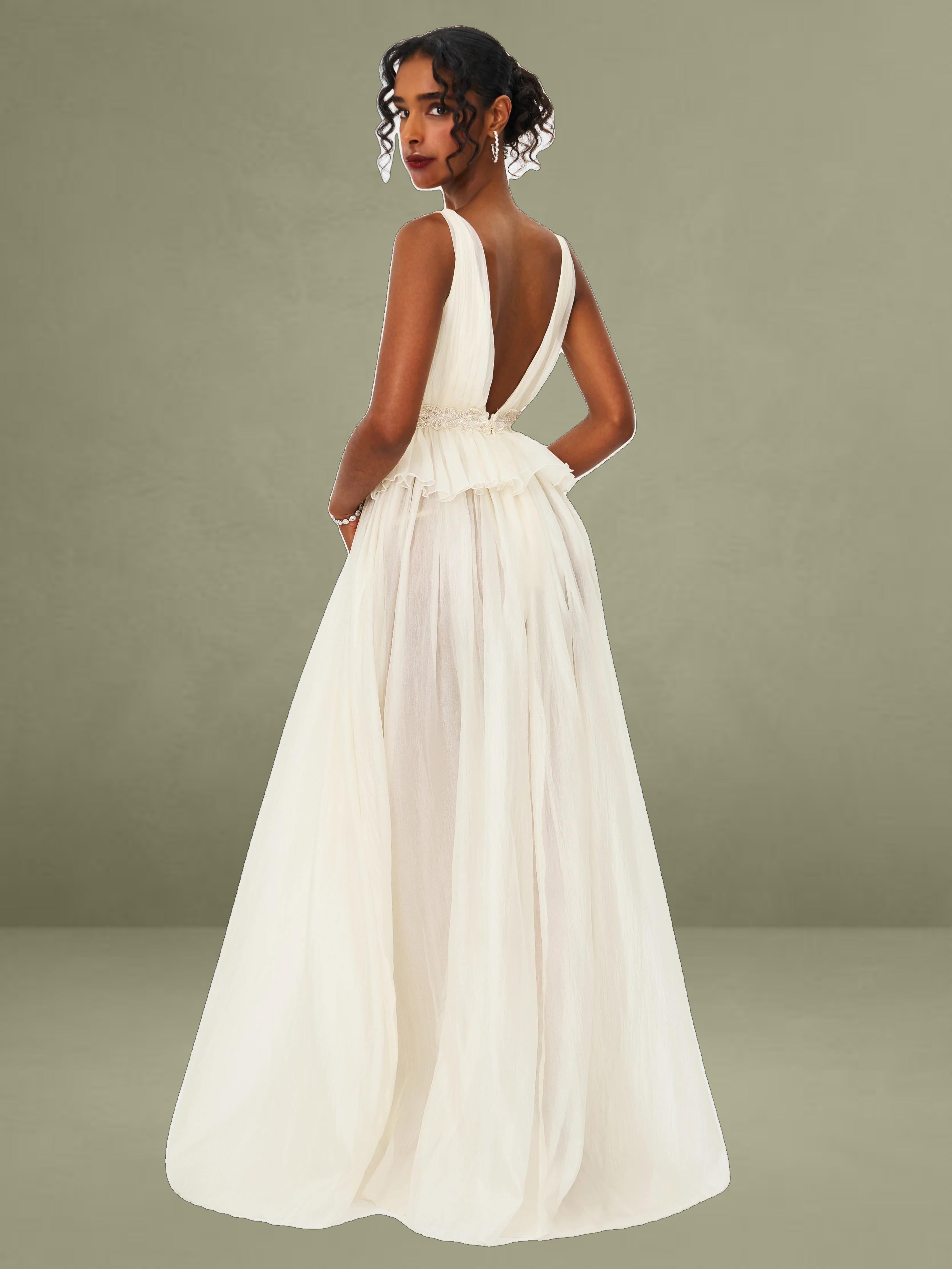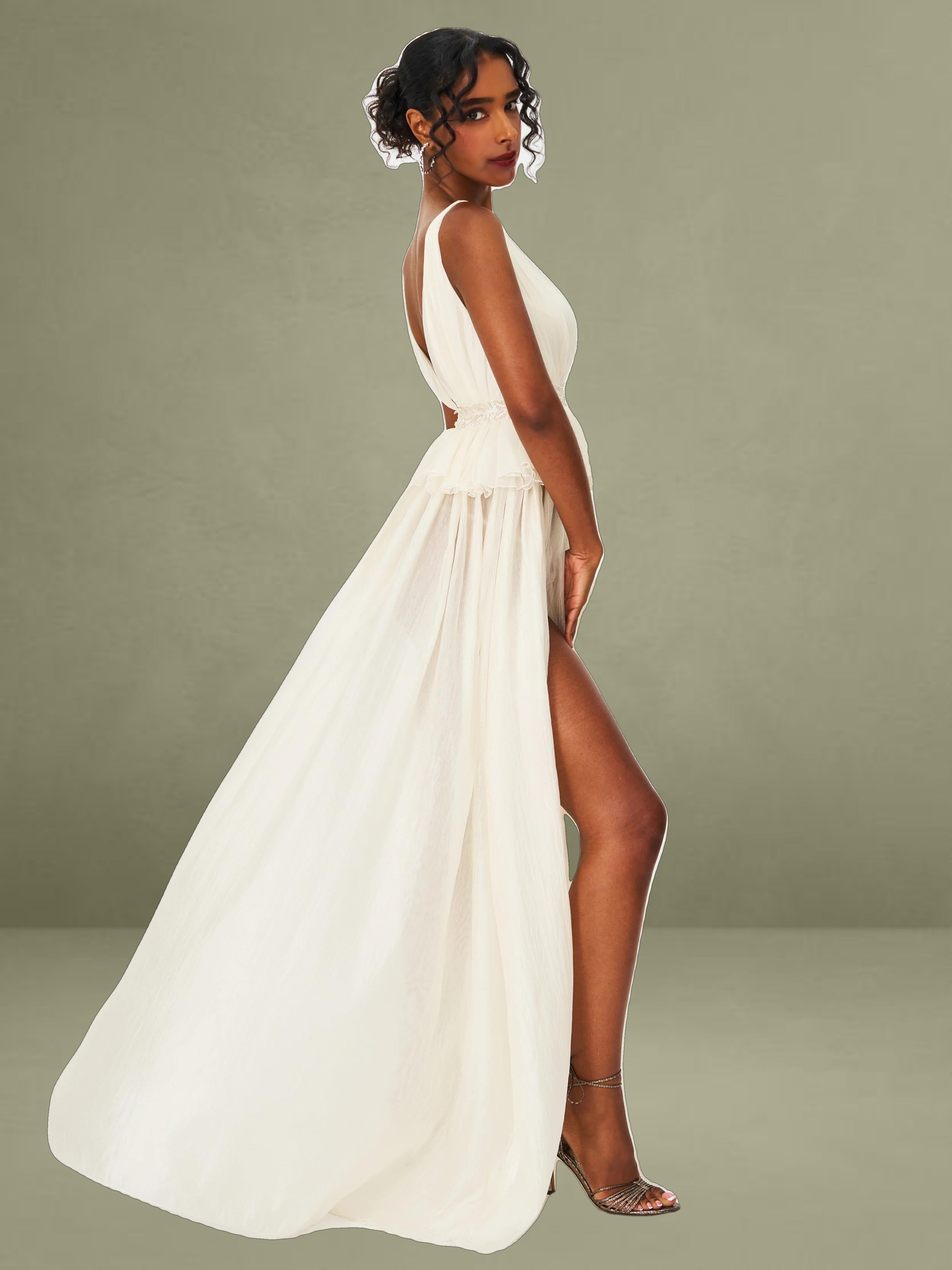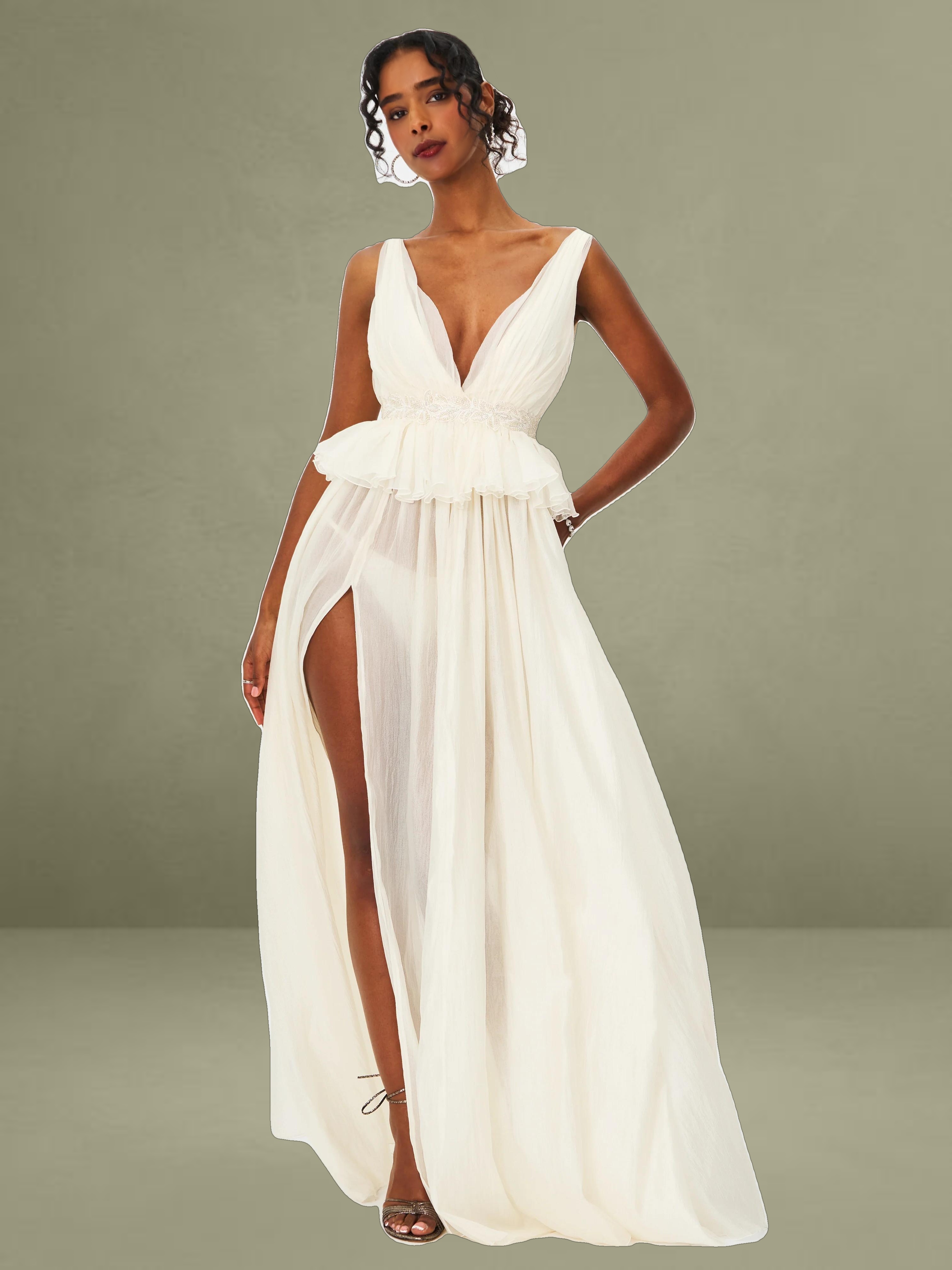 Enchanting and elegantly effortless, this summer gown is made from off-white pleated chiffon with a silver sheen. It has a flowing, layered shape and a high slit for easy movement. The maxi gown features a flattering V-neck and flares nicely at the waist. A beaded belt adds a bit of sparkle, and an invisible zipper ensures a snug fit. Light, airy, and radiant - ideal for summer weddings, garden parties, or any occasion when you want to look amazing.