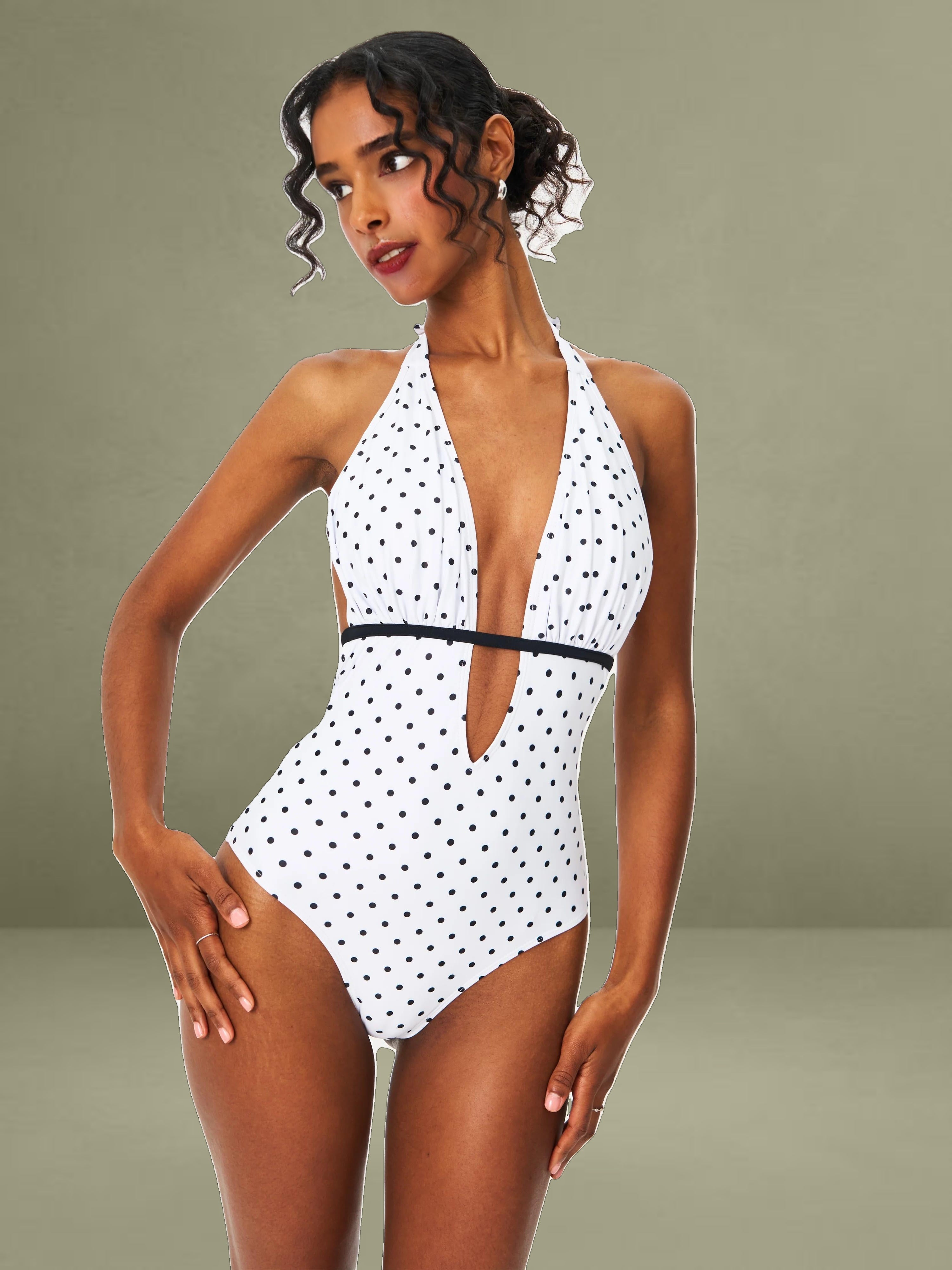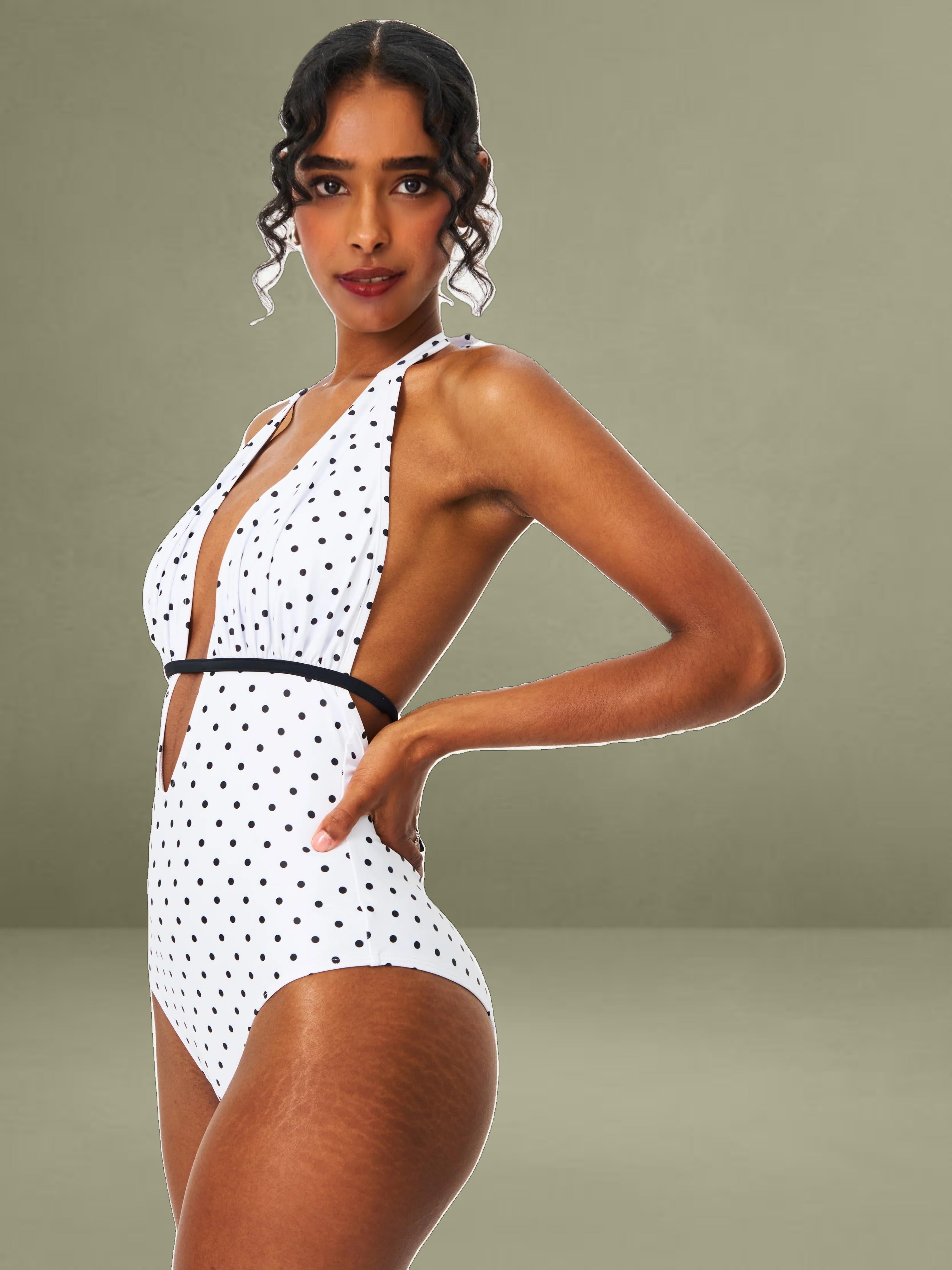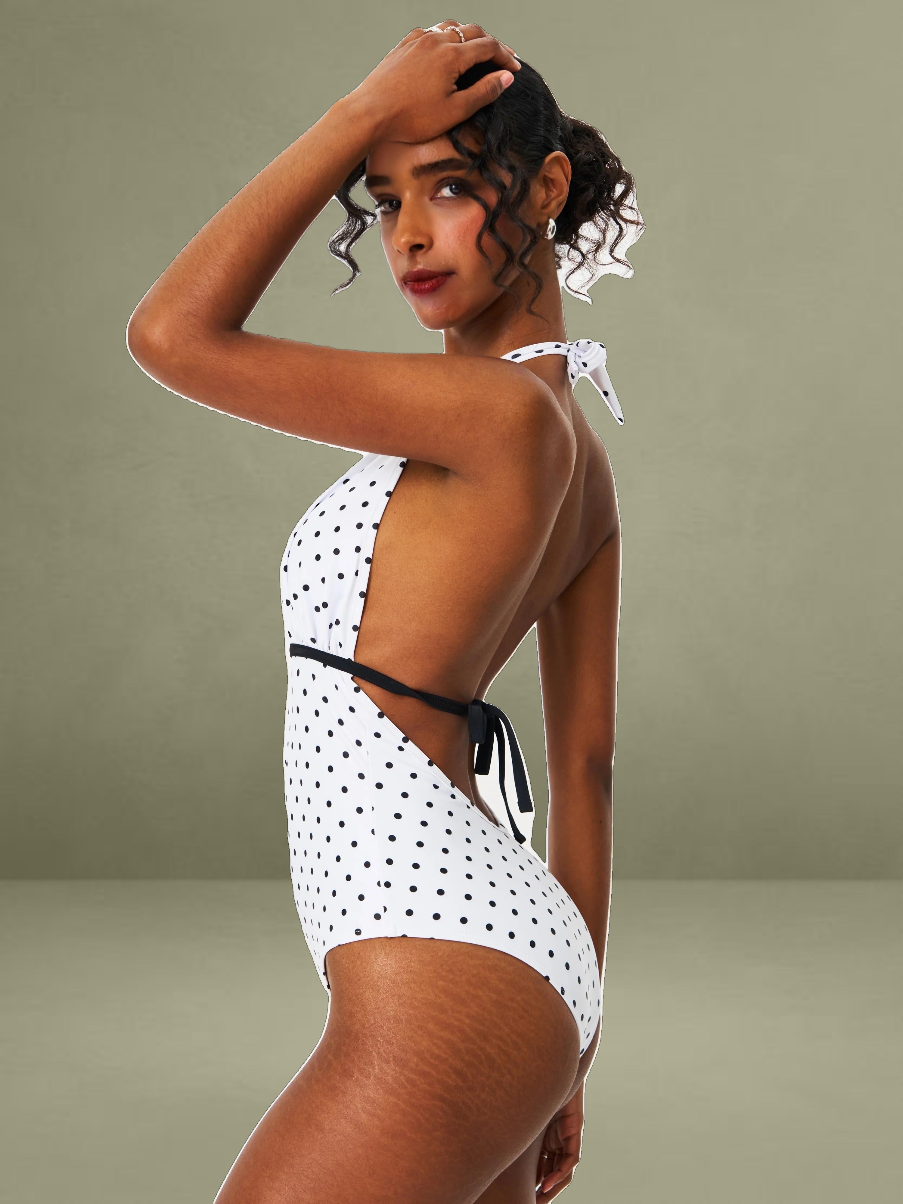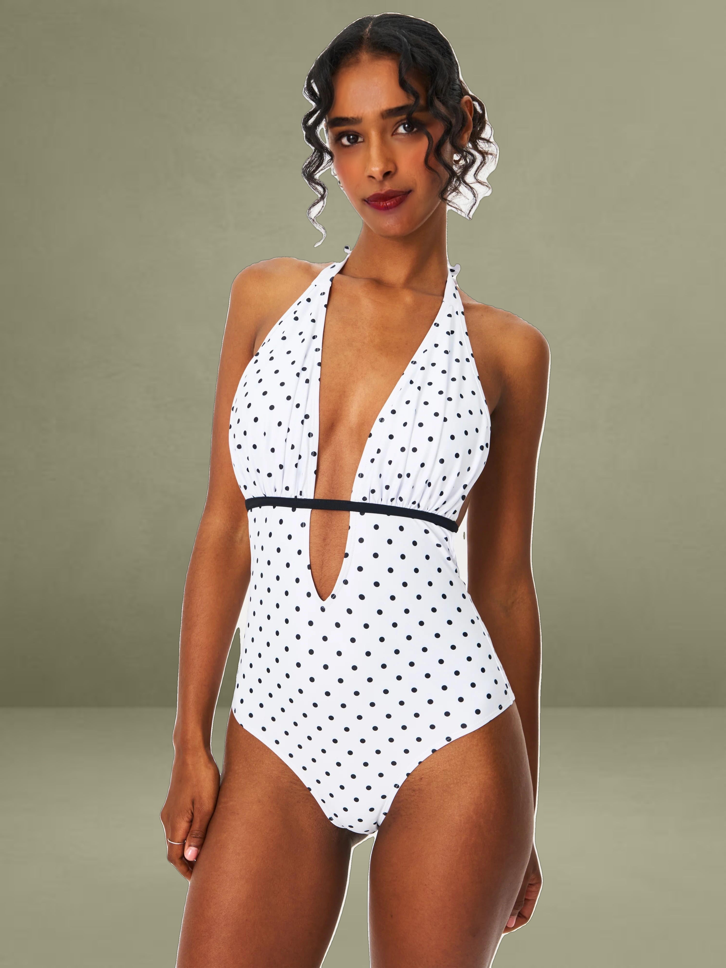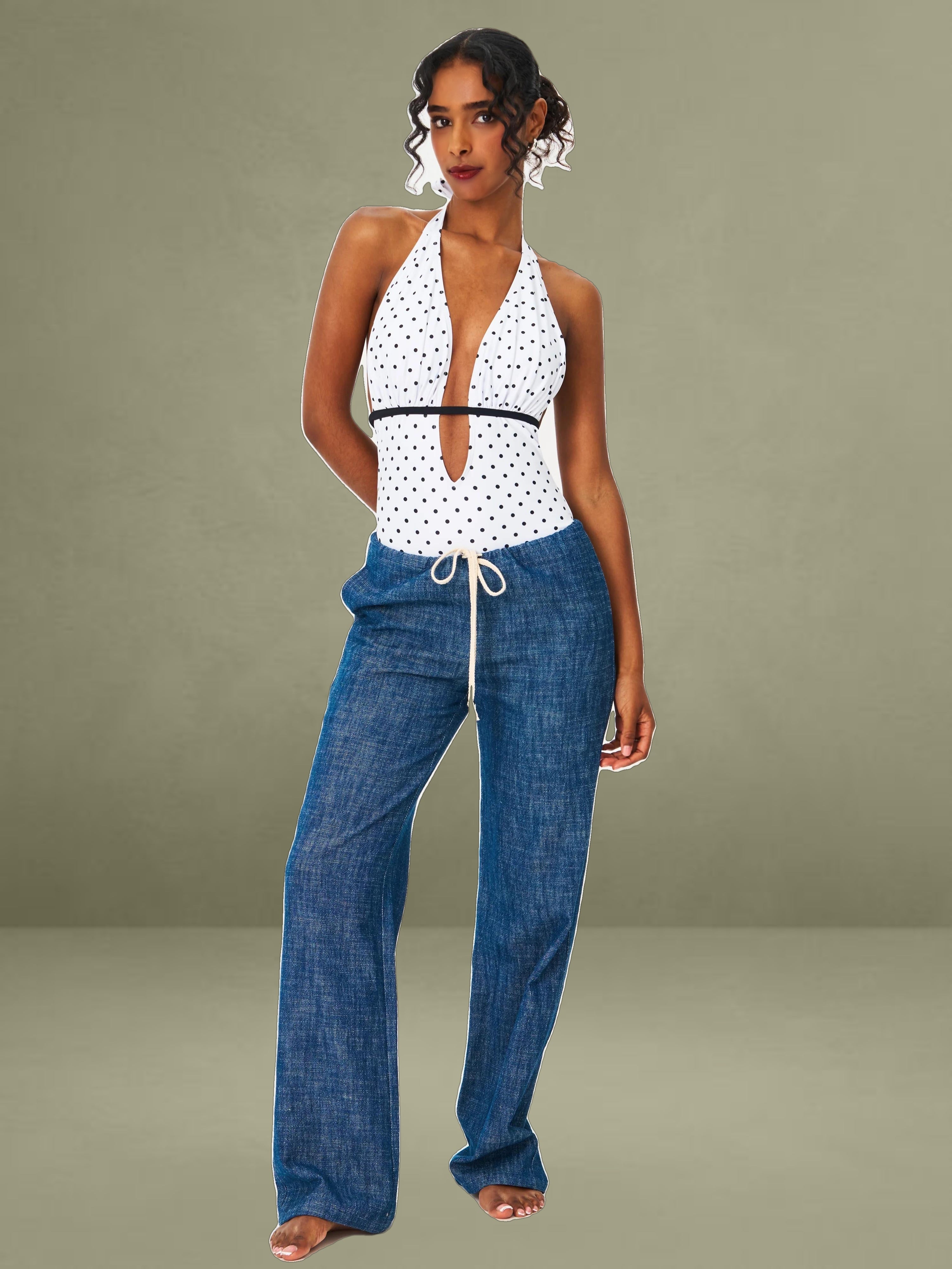 Make a splash this summer in the Olive Swimsuit, where vintage charm meets modern chic. Designed with a flattering ruched bust and a classic white base adorned with black polka dots, this halter-neck, backless style ties elegantly at the back for an adjustable fit. Crafted from stretchy elastane fabric and fully lined for comfort and coverage, it's the perfect piece for sun-soaked vacations and poolside lounging. Style it solo or pair it with the Raffaella Cotton Denim Straight Leg Pants for an effortlessly cool, beach-to-street look.