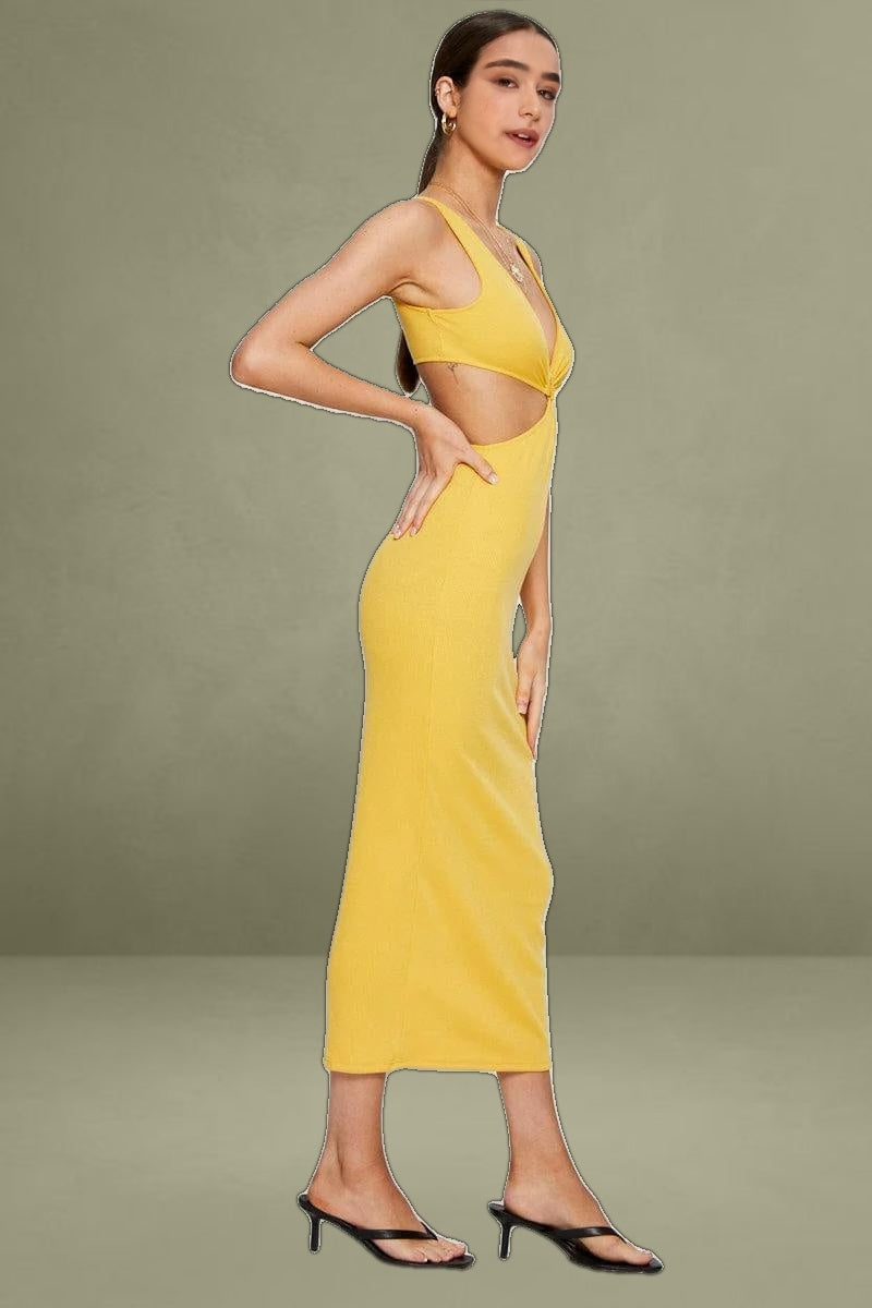 Features: Cut Out Detail, Ribbed Knit Fabric, Midi Length, Bodycon