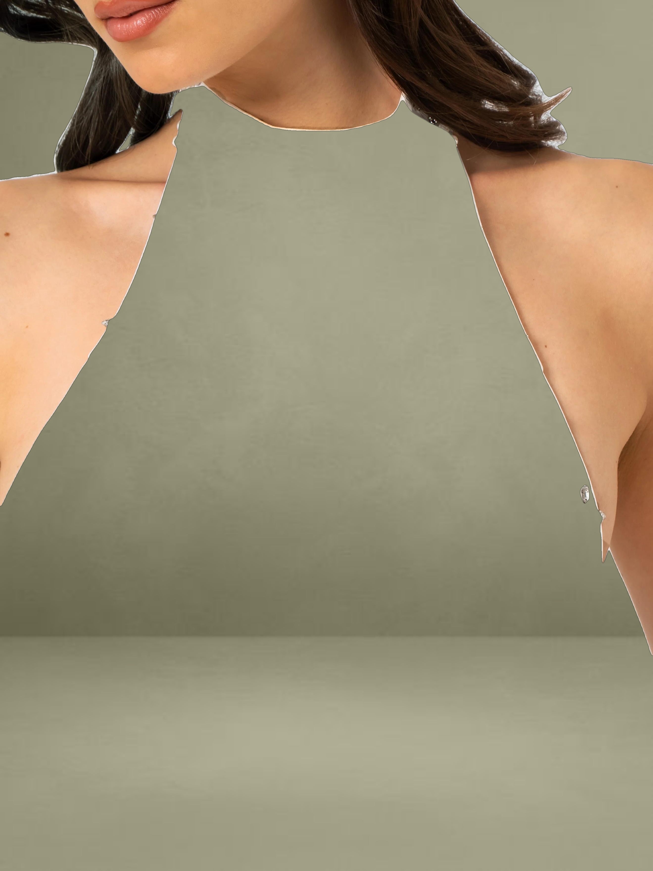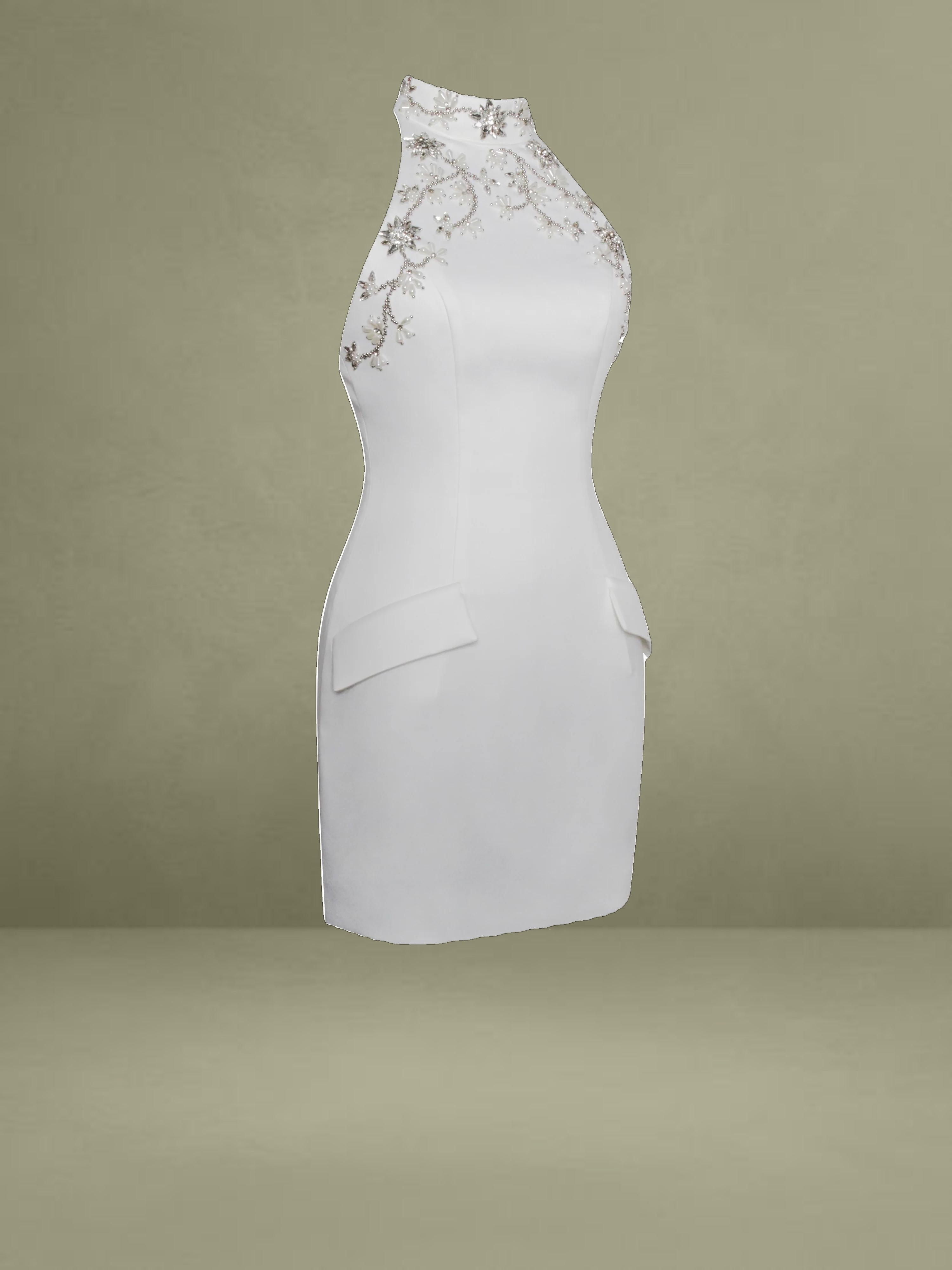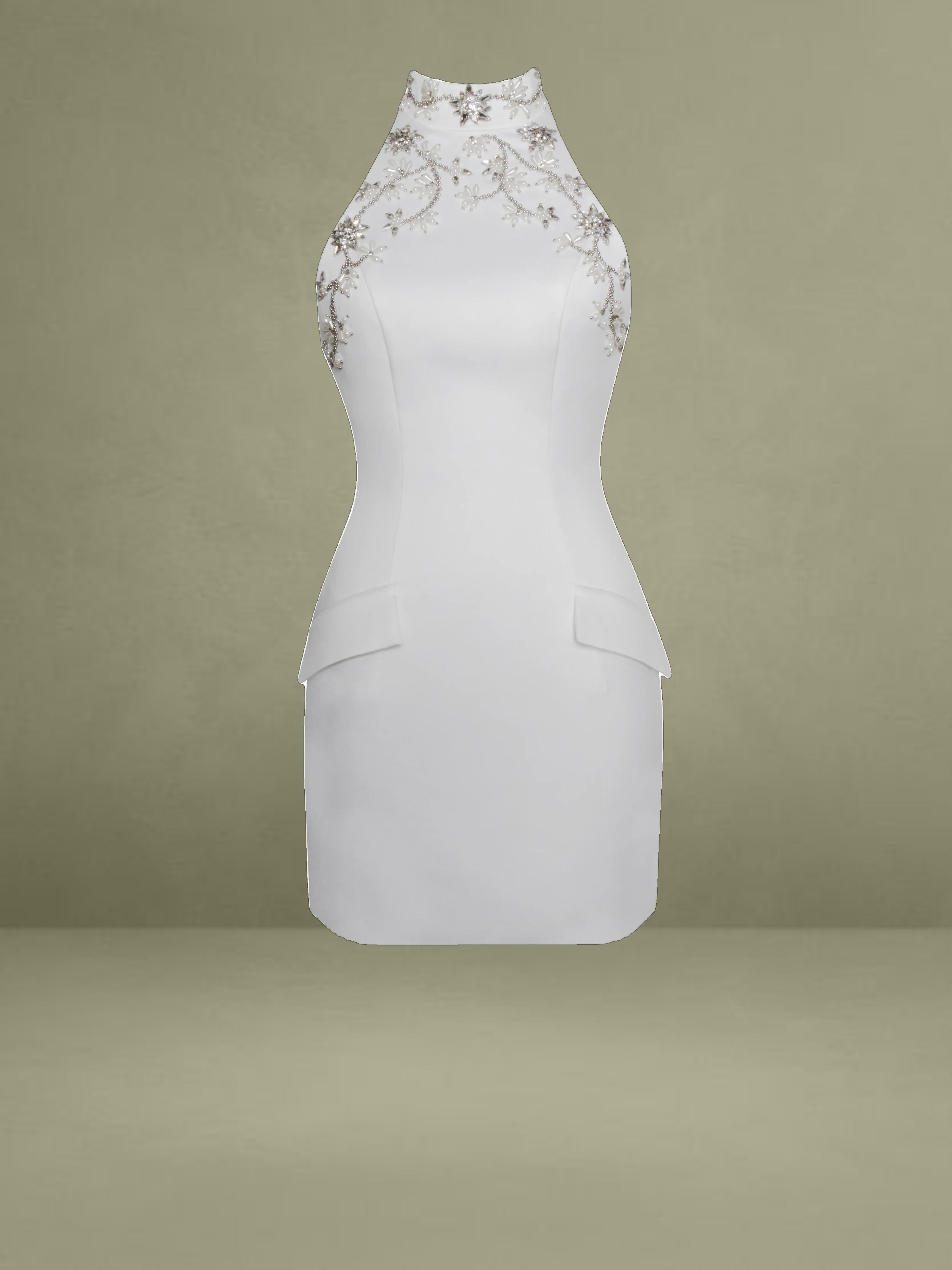 Introducing our Ori mini dress, an epitome of luxury and elegance. Crafted from sumptuous Double Duchess Luxe Satin, this dress promises a silky-smooth feel and a sophisticated sheen. The halter neck design accentuates the shoulders, while the backless feature adds a daring touch. Adorned with hand-made crystal and pearl embellishments, it exudes a sense of refined glamor. Faux pockets add a chic detail, enhancing its modern appeal. Perfect for any occasion, this mini dress effortlessly combines opulence and style, making it a standout piece in any wardrobe.
