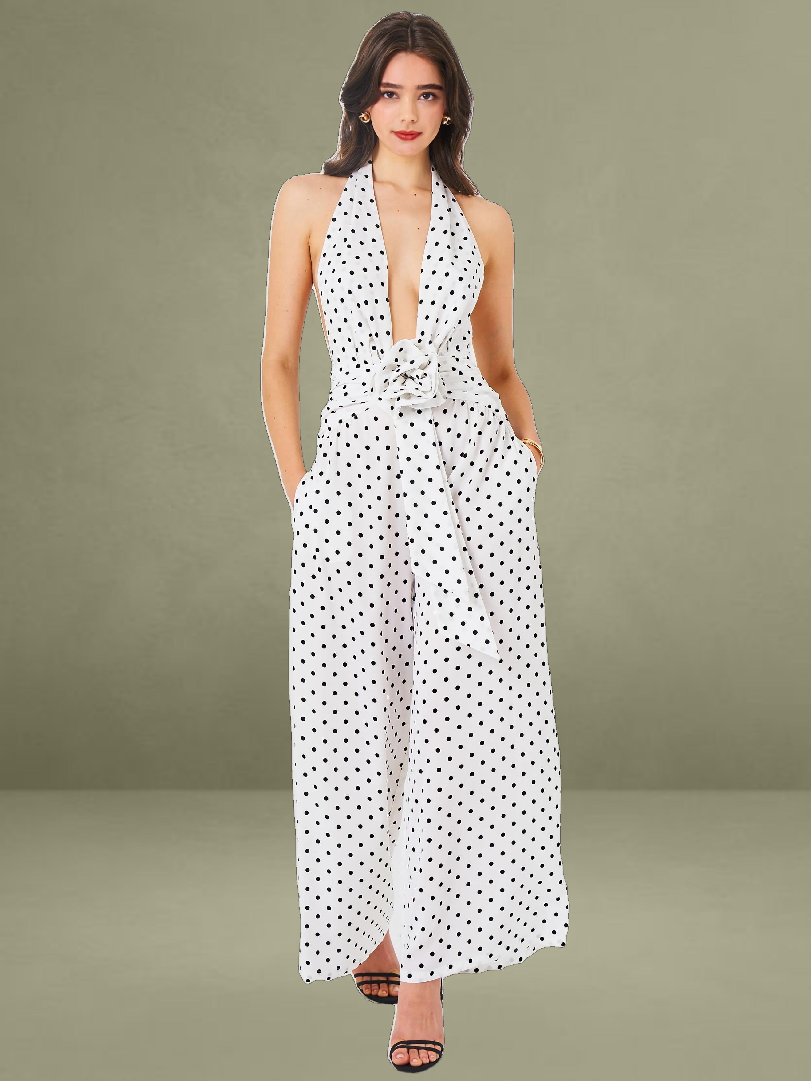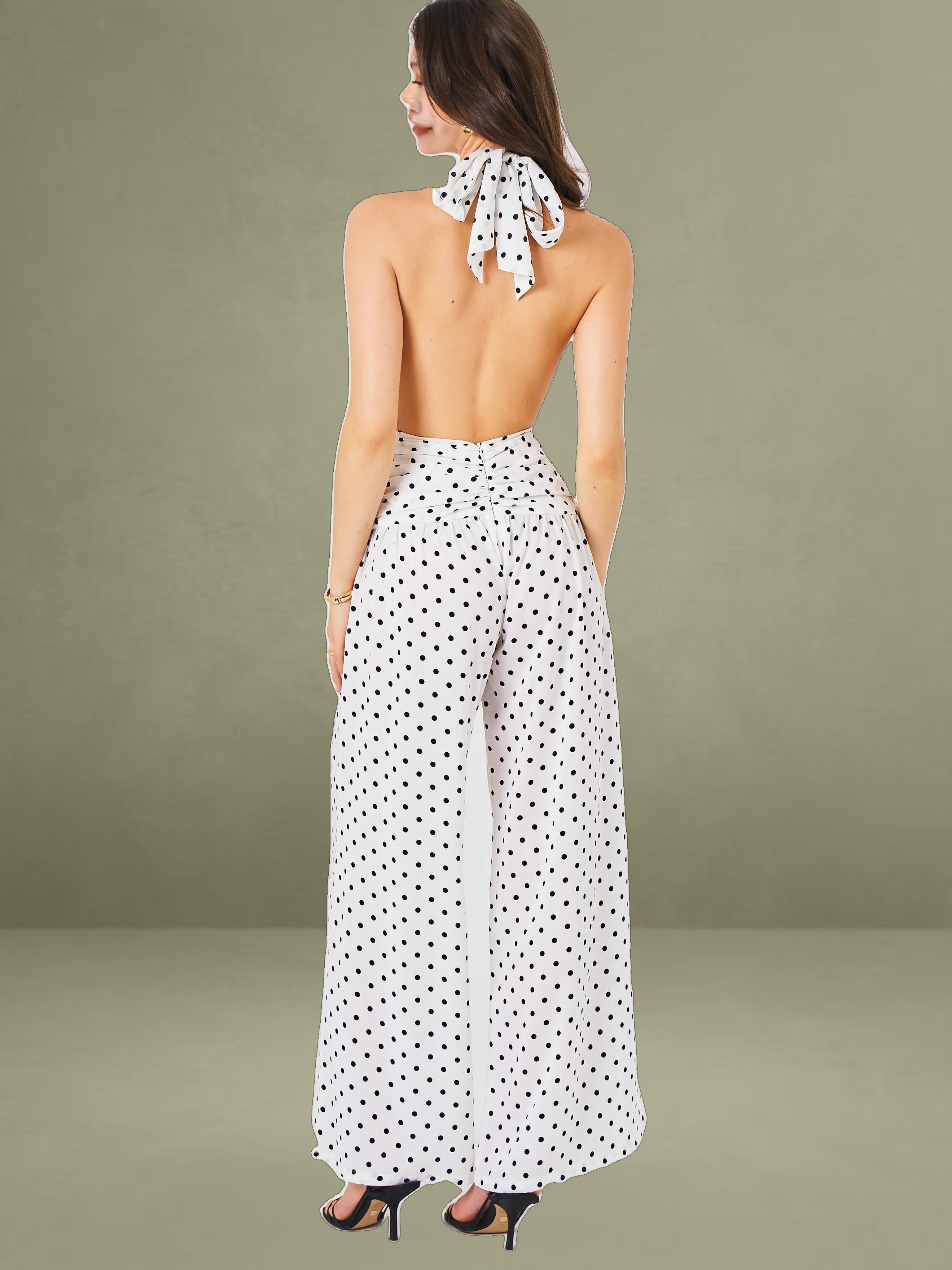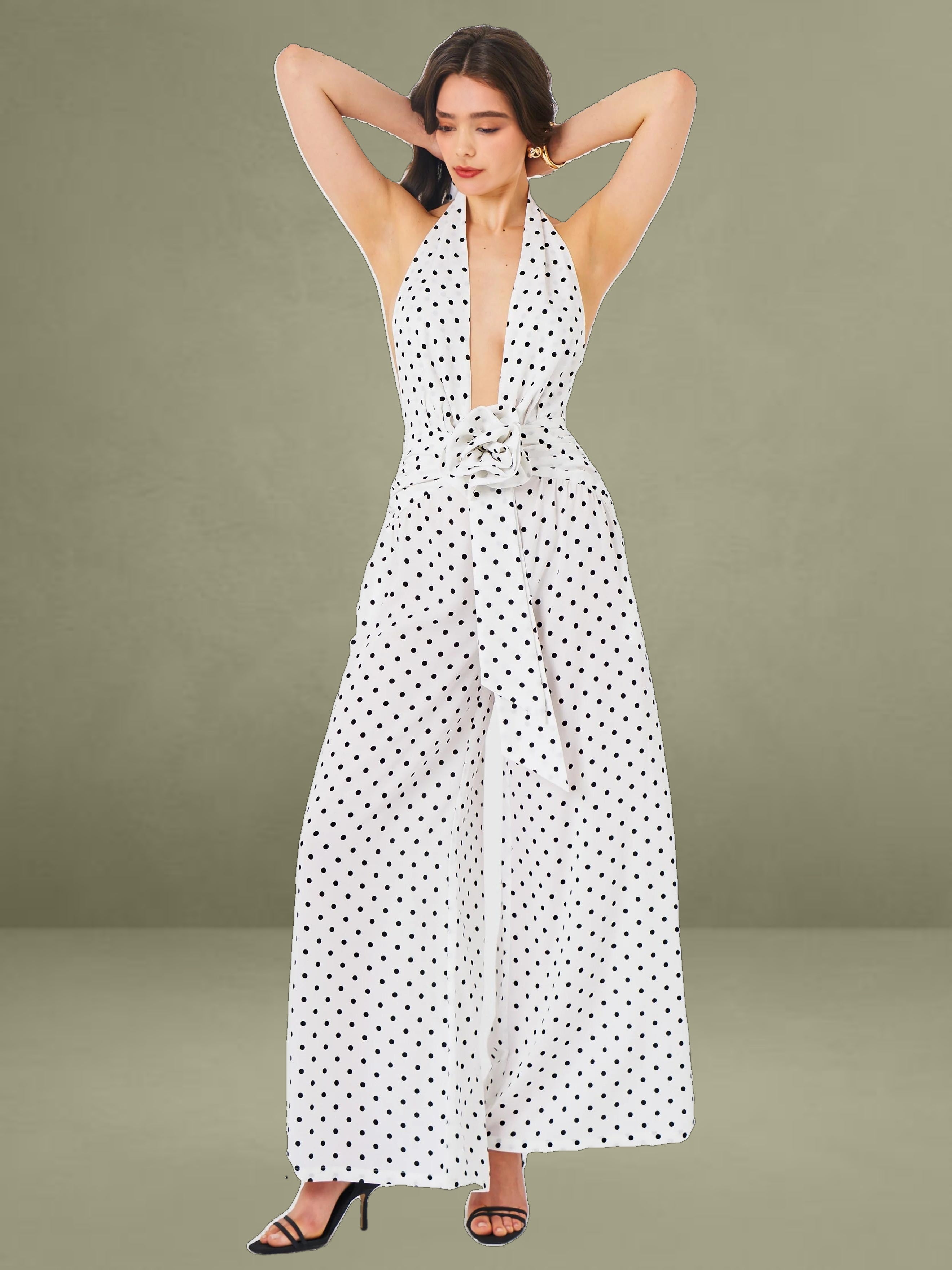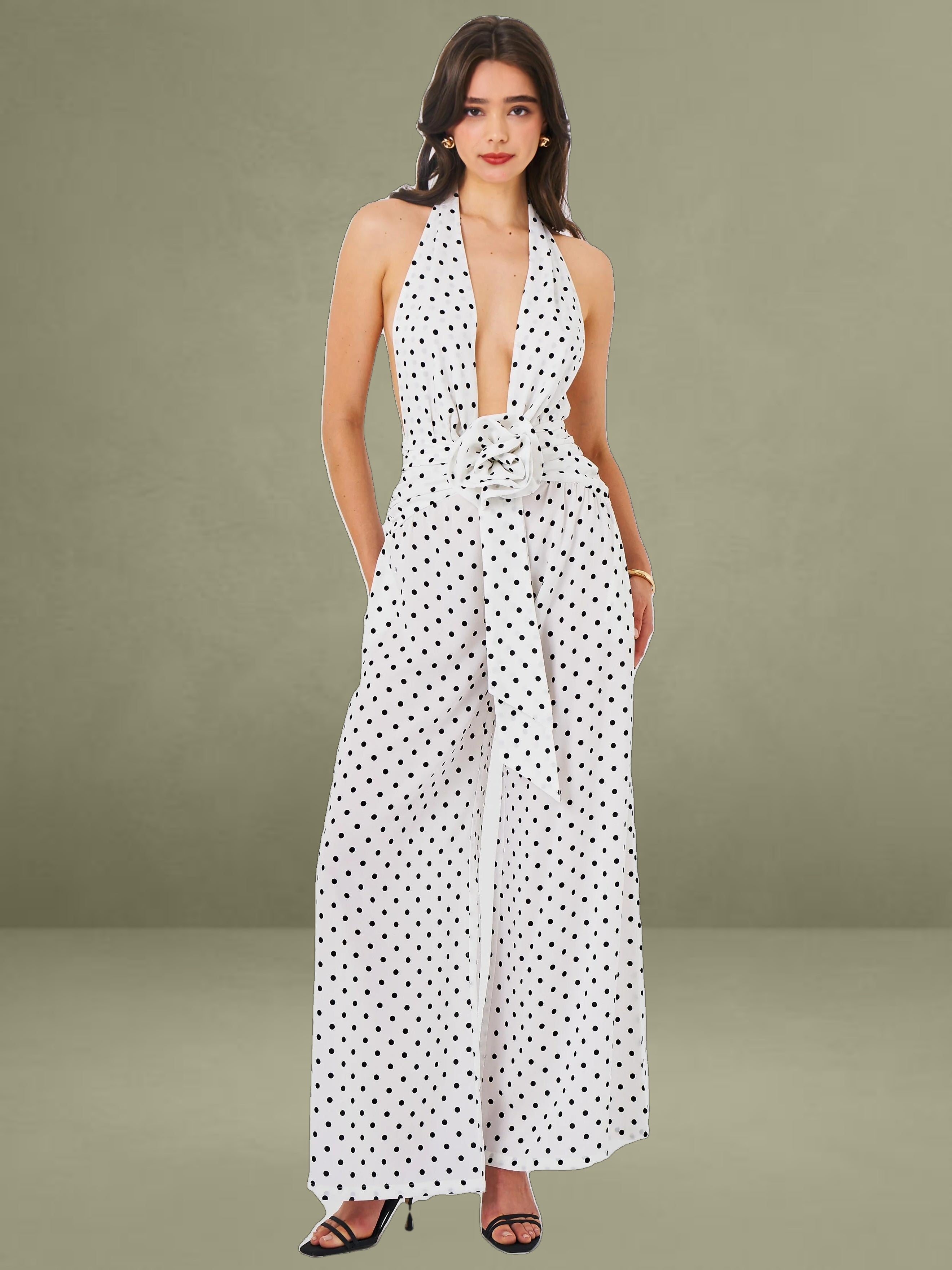 Introducing the Oriana jumpsuit, a chic and playful addition to your wardrobe. Adorned with eye-catching polka dots, this jumpsuit features a stylish halter top that beautifully complements the wide-leg pants. A delicate flower decoration adds a touch of femininity and charm. The invisible zipper ensures a seamless and sleek fit. Perfect for any occasion, this jumpsuit effortlessly blends fun and elegance, making it a standout piece for both casual and formal events. This jumpsuit also available in black with white polka dots.