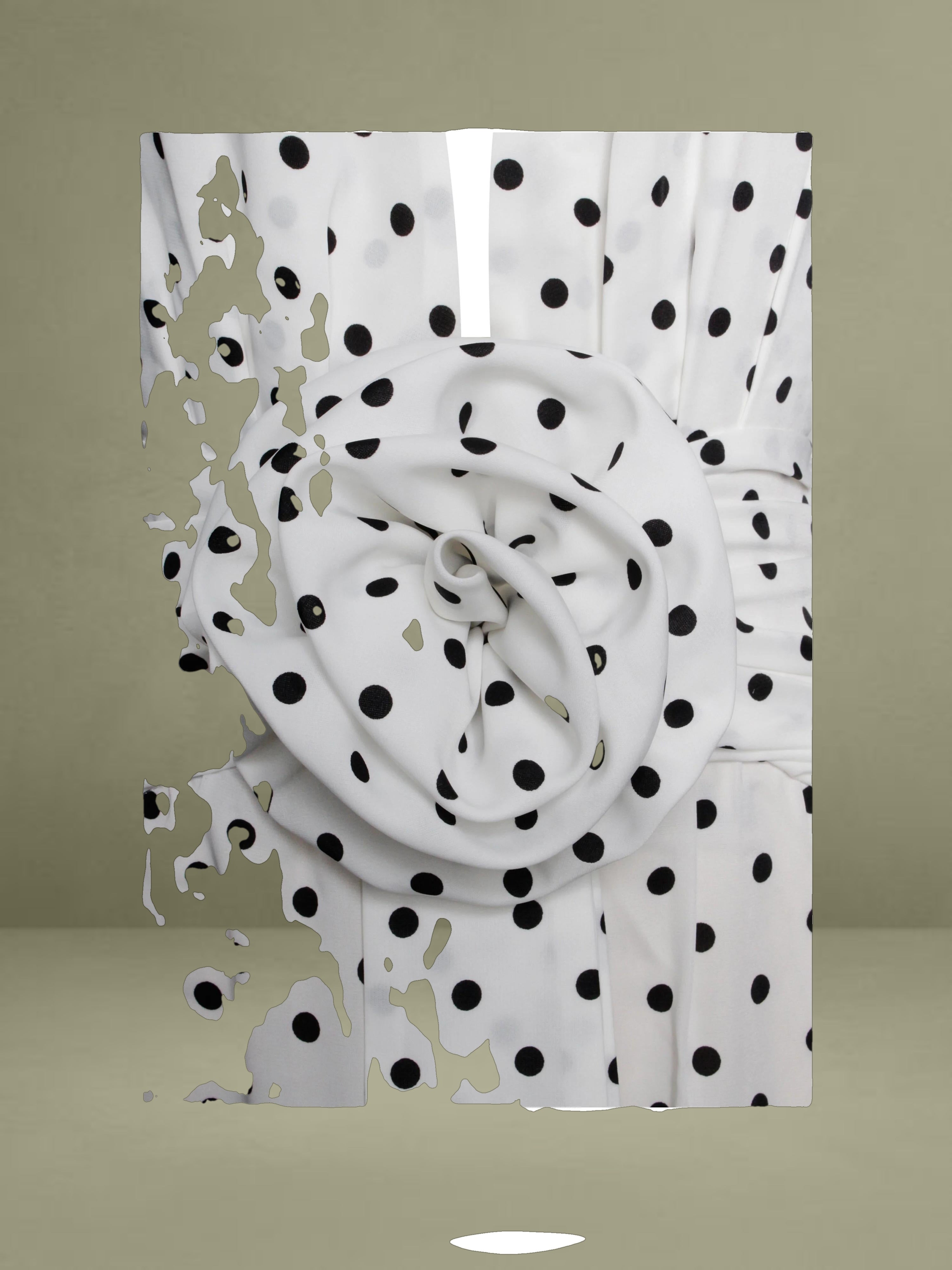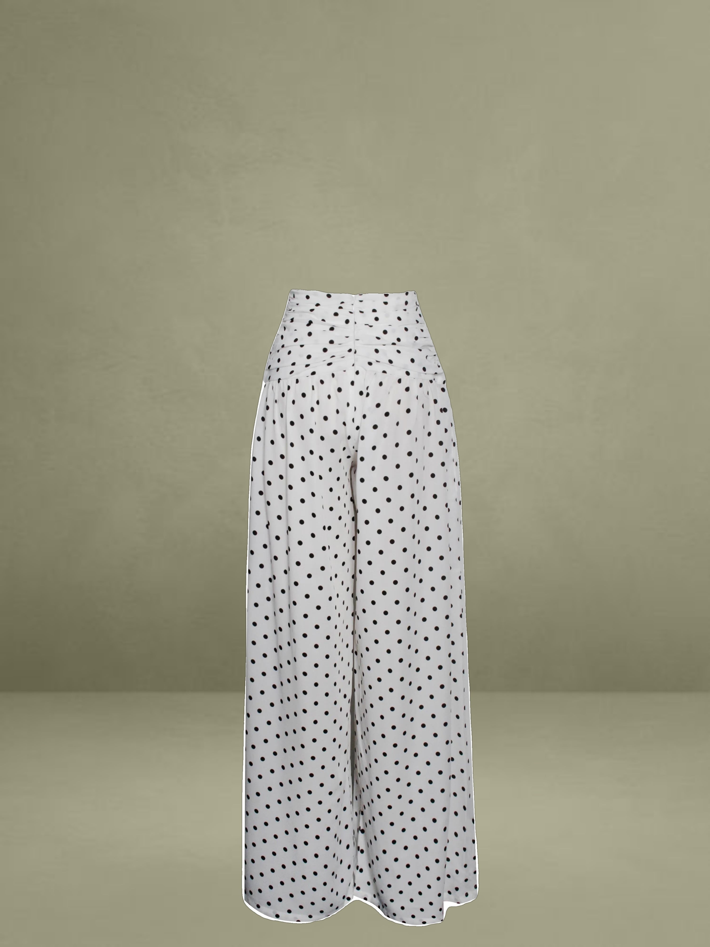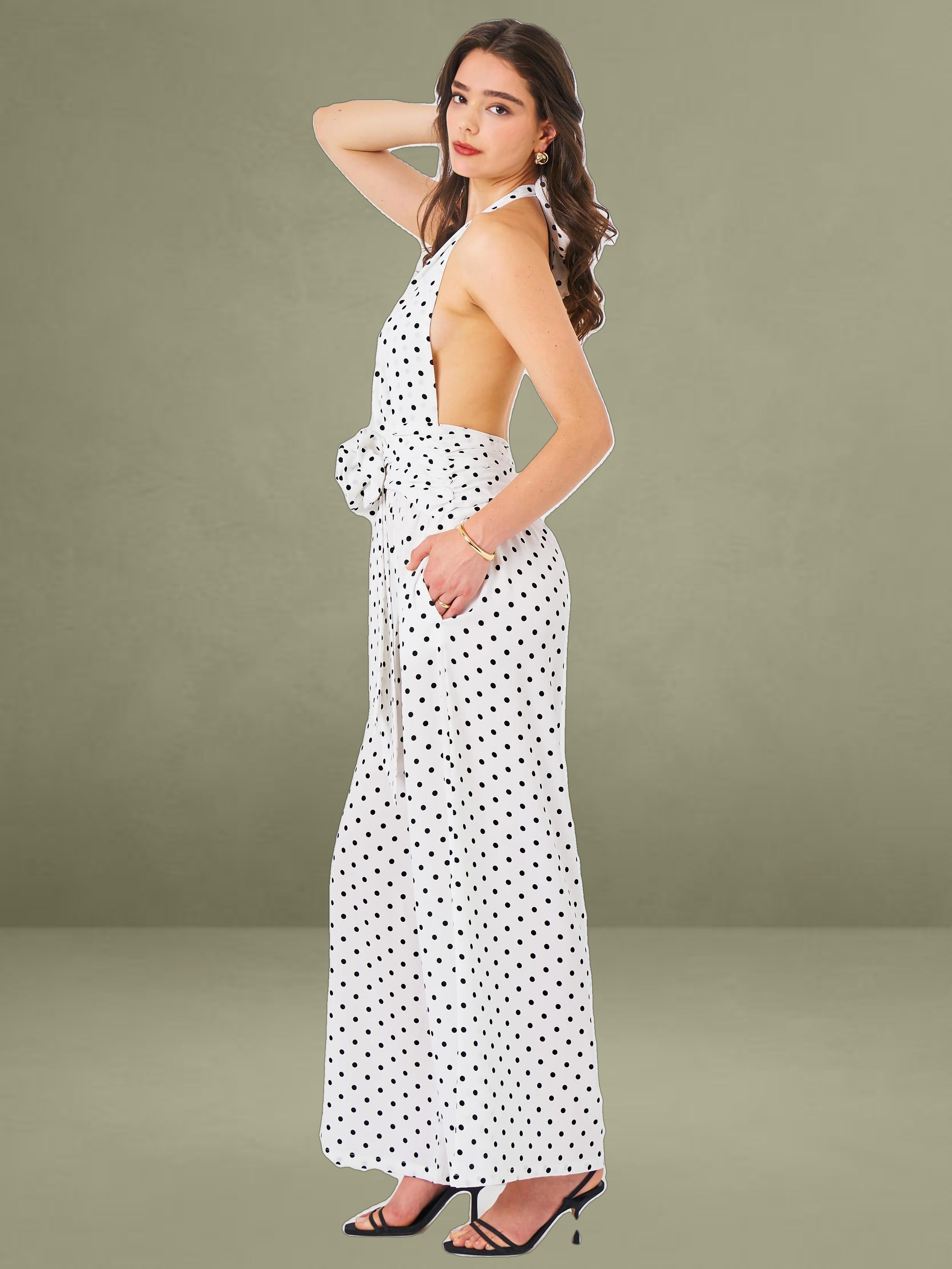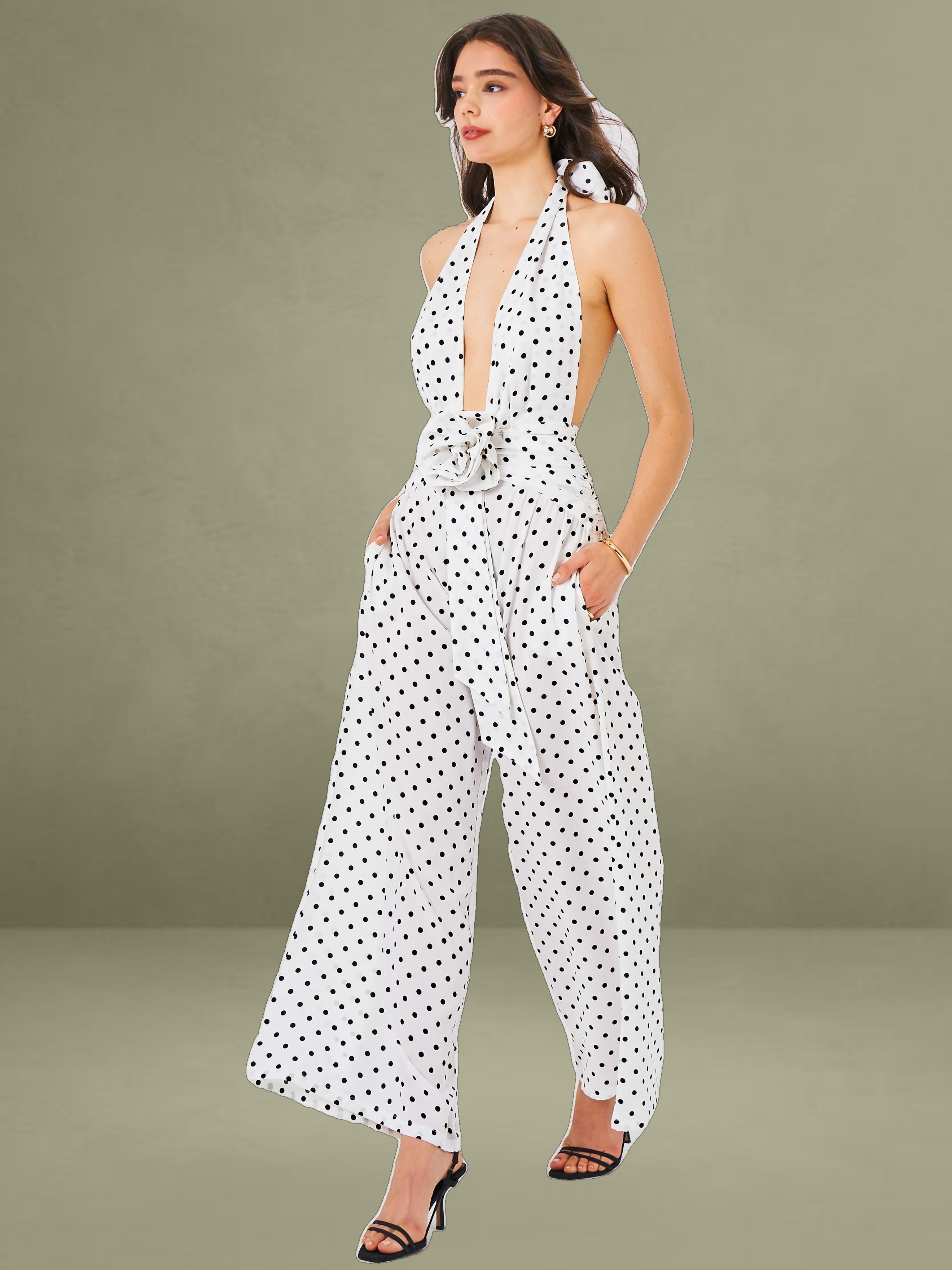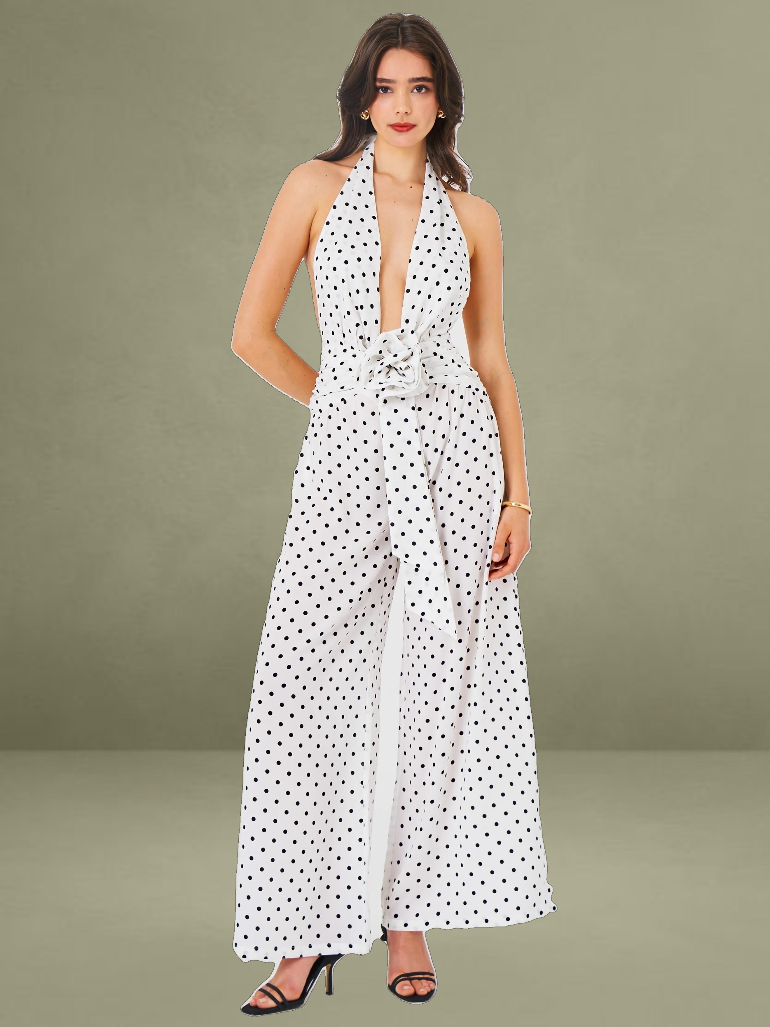 Introducing the Oriana jumpsuit, a chic and playful addition to your wardrobe. Adorned with eye-catching polka dots, this jumpsuit features a stylish halter top that beautifully complements the wide-leg pants. A delicate flower decoration adds a touch of femininity and charm. The invisible zipper ensures a seamless and sleek fit. Perfect for any occasion, this jumpsuit effortlessly blends fun and elegance, making it a standout piece for both casual and formal events. This jumpsuit also available in black with white polka dots.