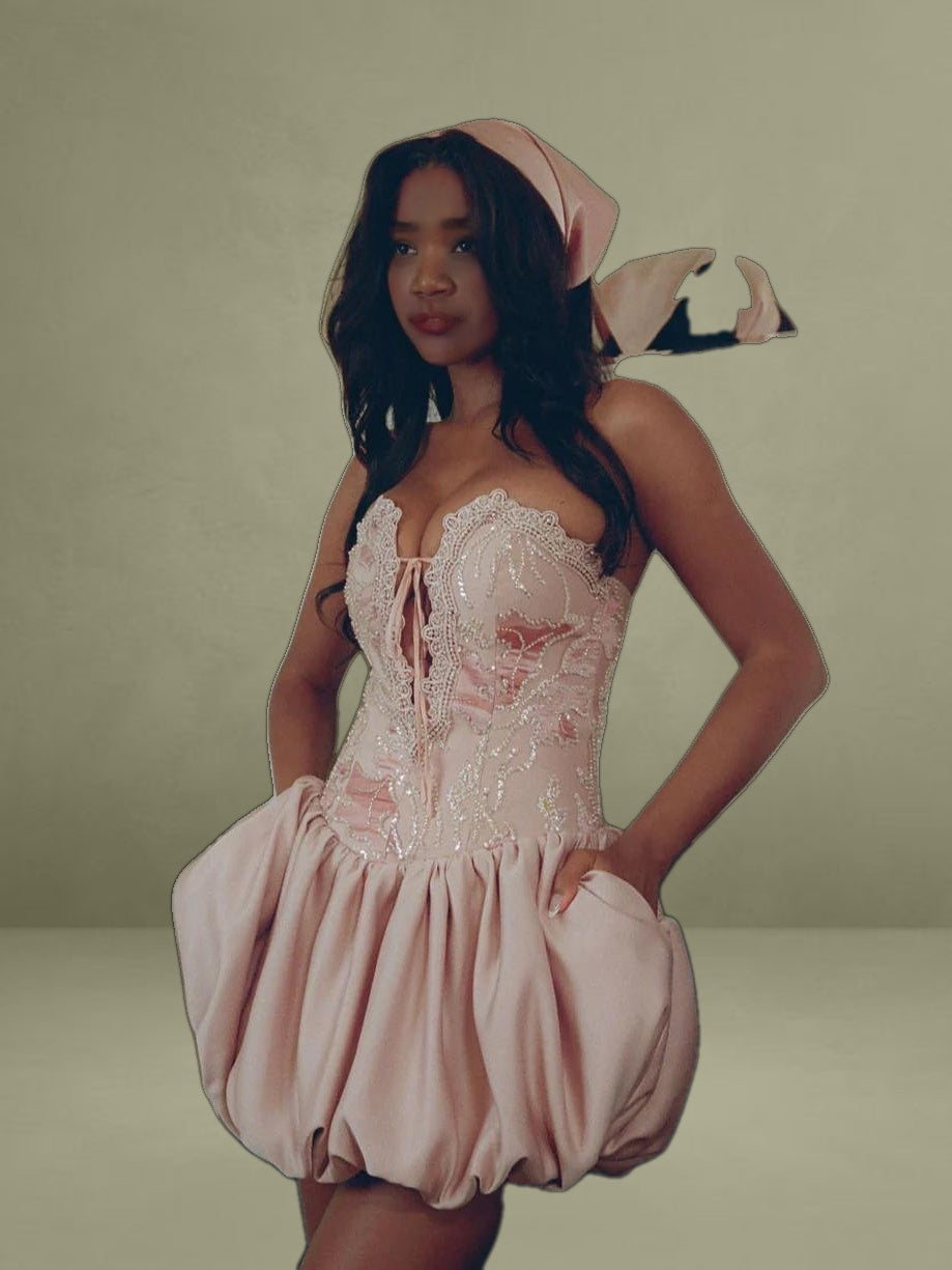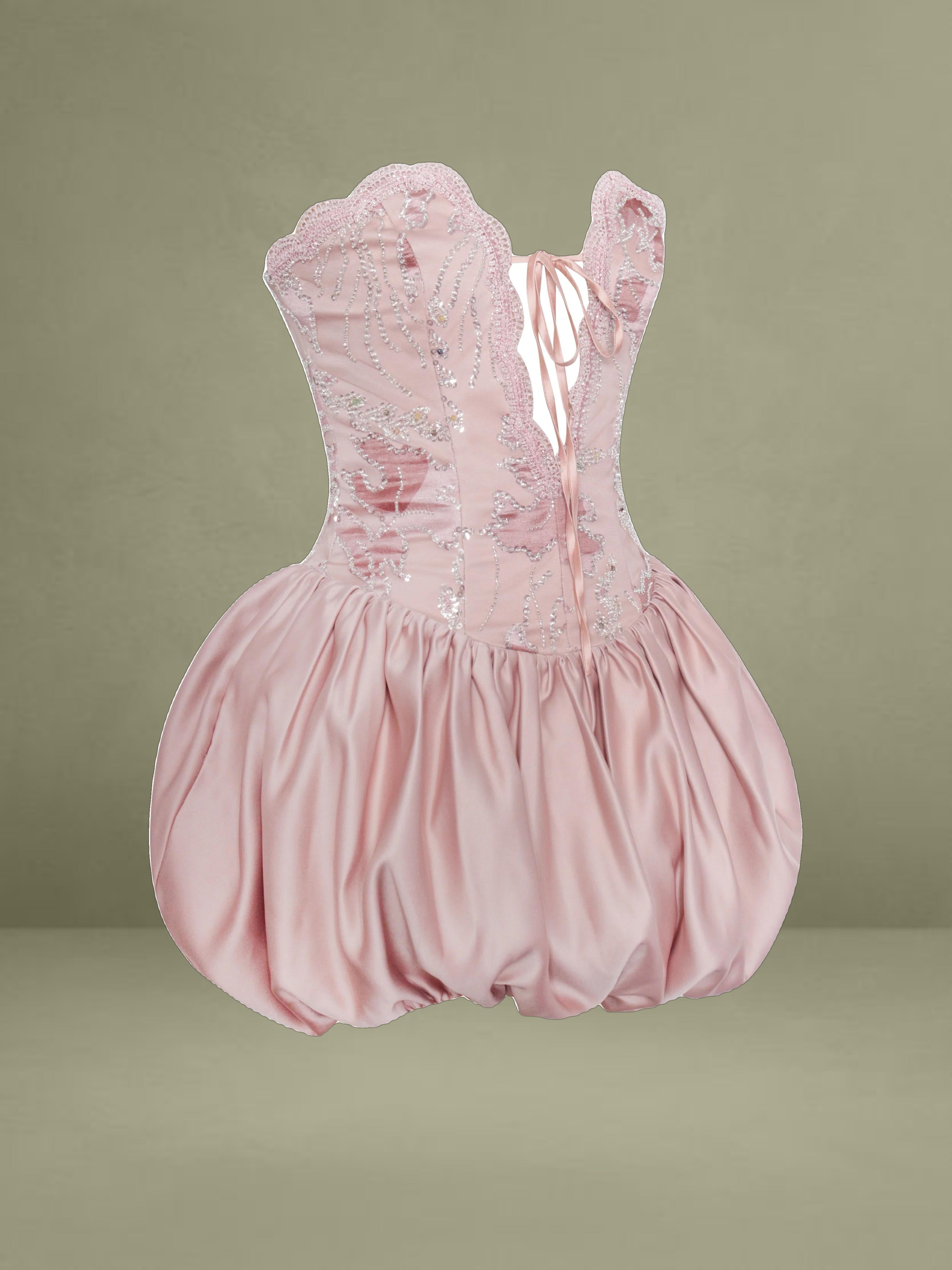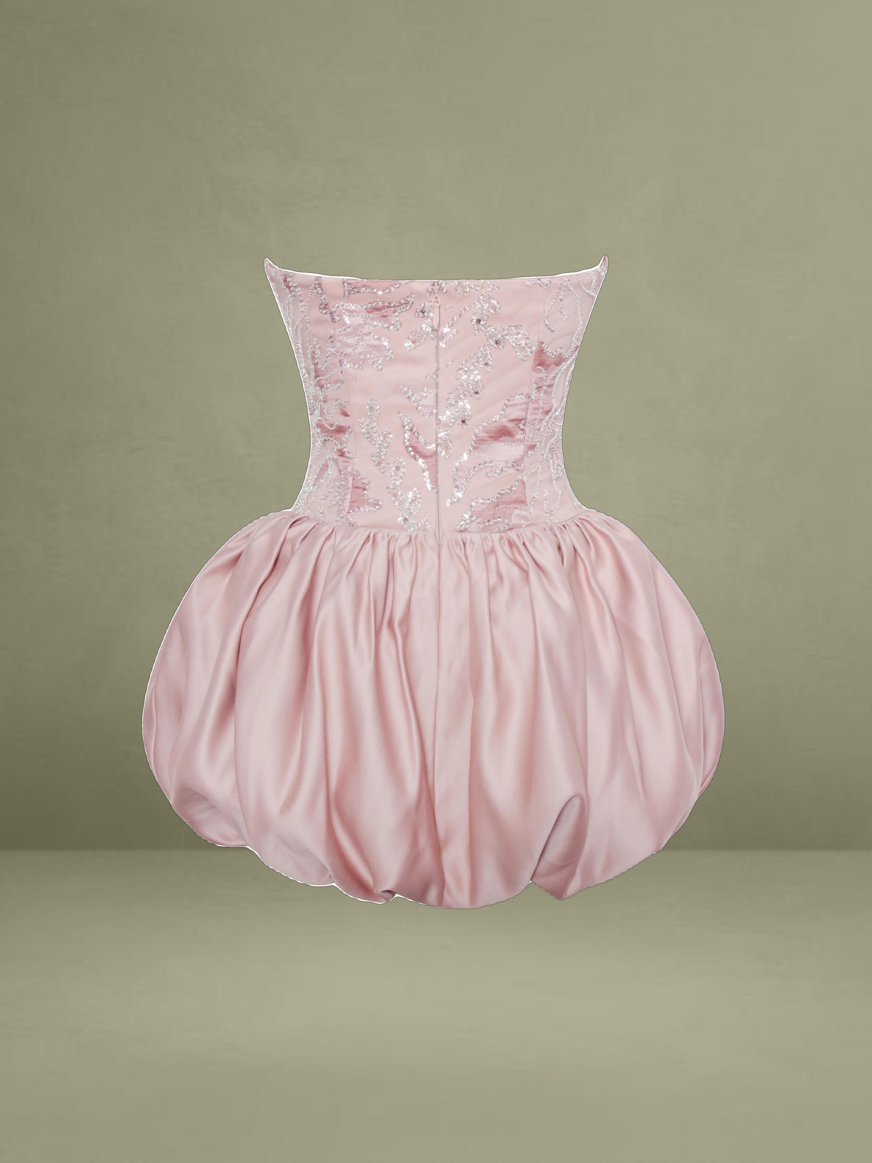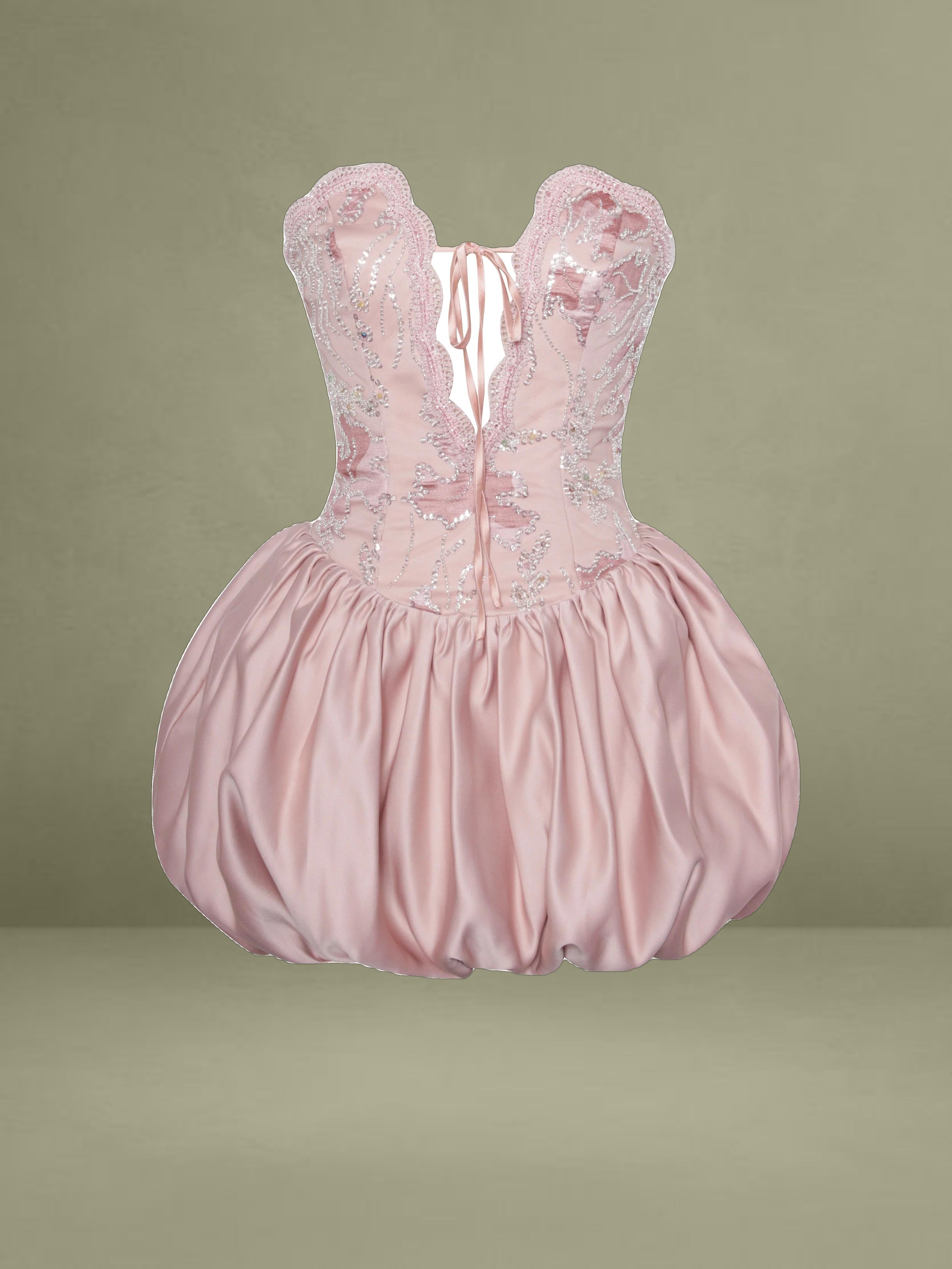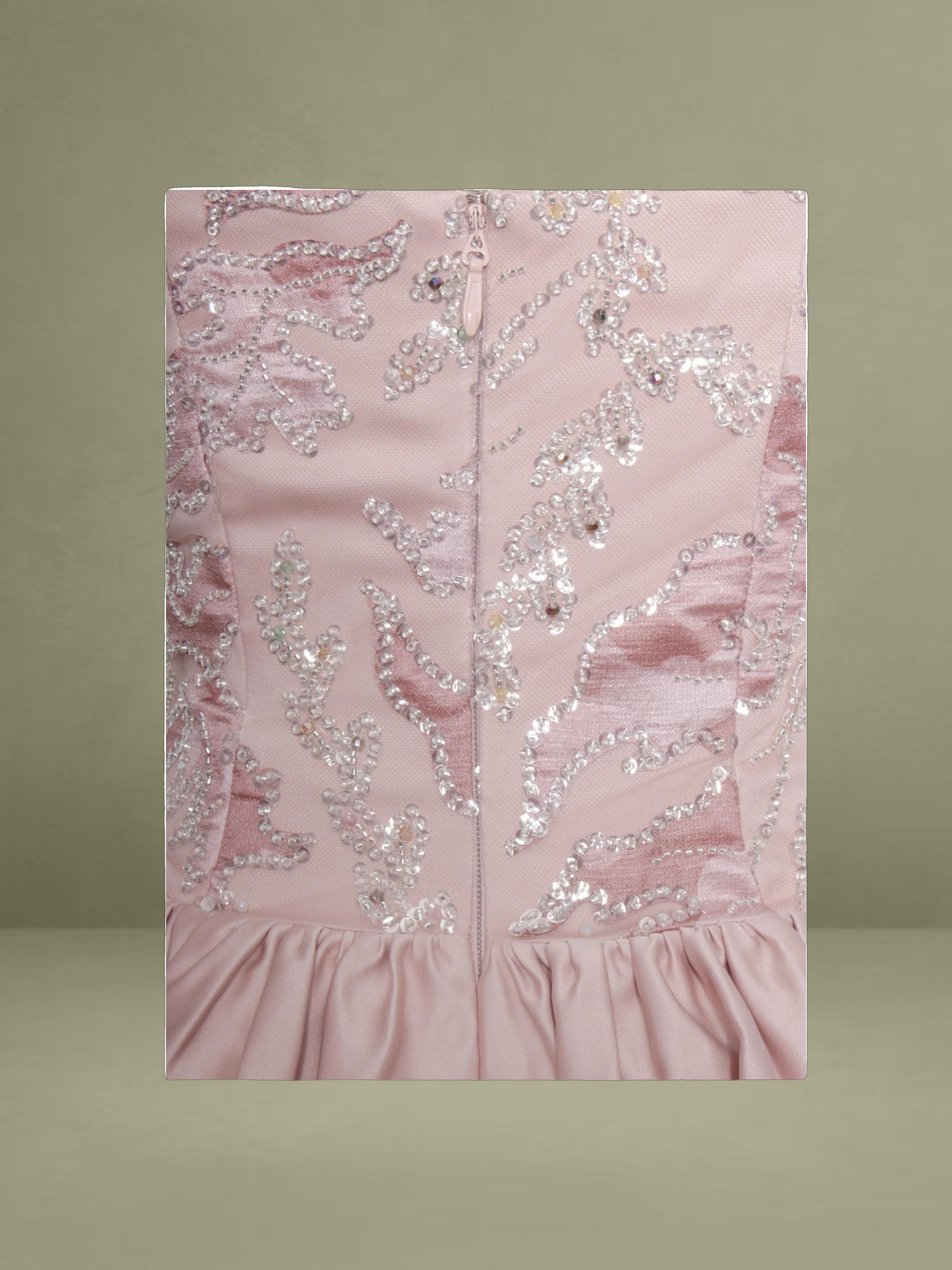 Delight in the whimsical elegance of the Palesa Dress, a masterpiece inspired by ballet style grace. Crafted from exquisite beaded sequin-embroidered fabric, this enchanting pink dress features a playful bubble hem and a charming drop waist silhouette. The deep V collar, adorned with delicate lace trim, adds a romantic touch, while the practicality of hidden pockets makes it as functional as it is beautiful. Fully lined for comfort and fitted with an invisible zipper for a seamless finish, the Palesa Dress is perfect for making a dreamy statement at any special occasion.