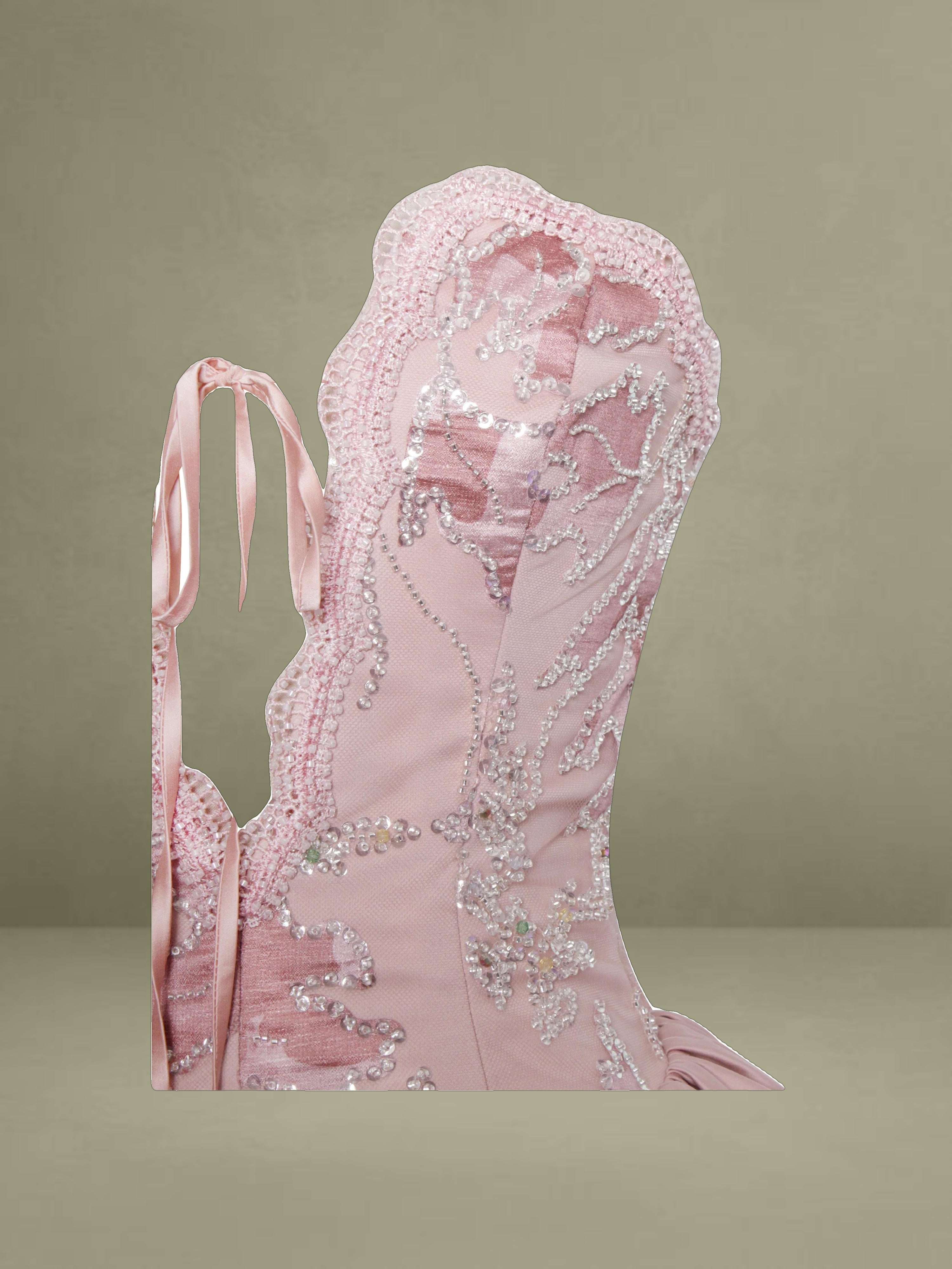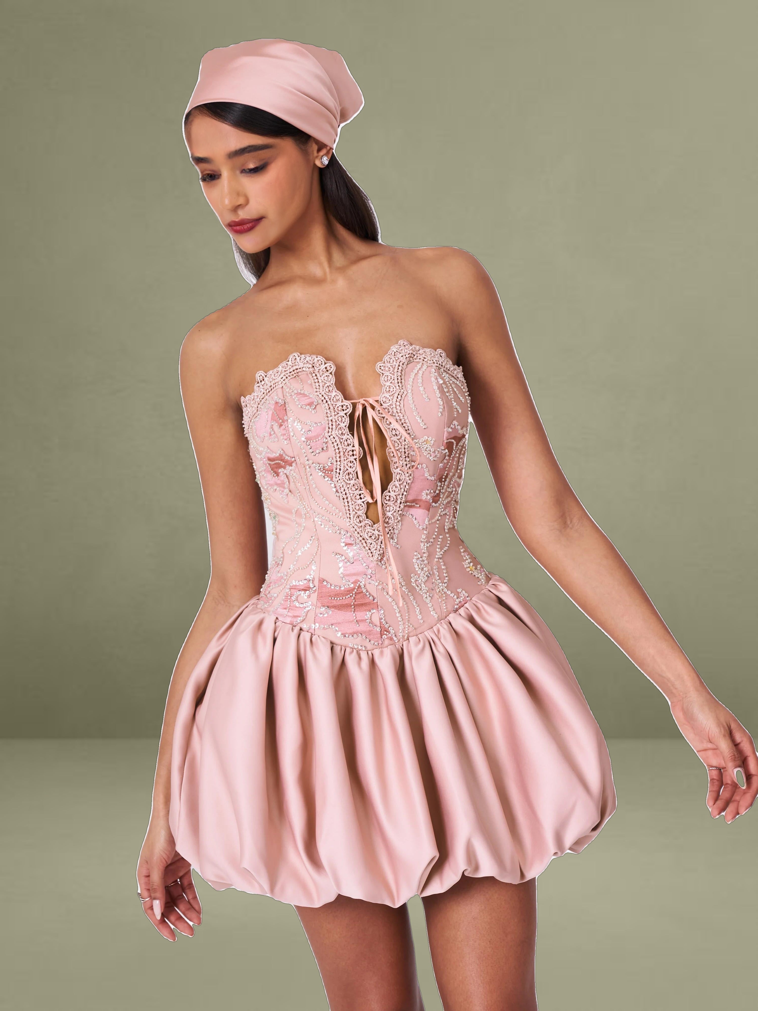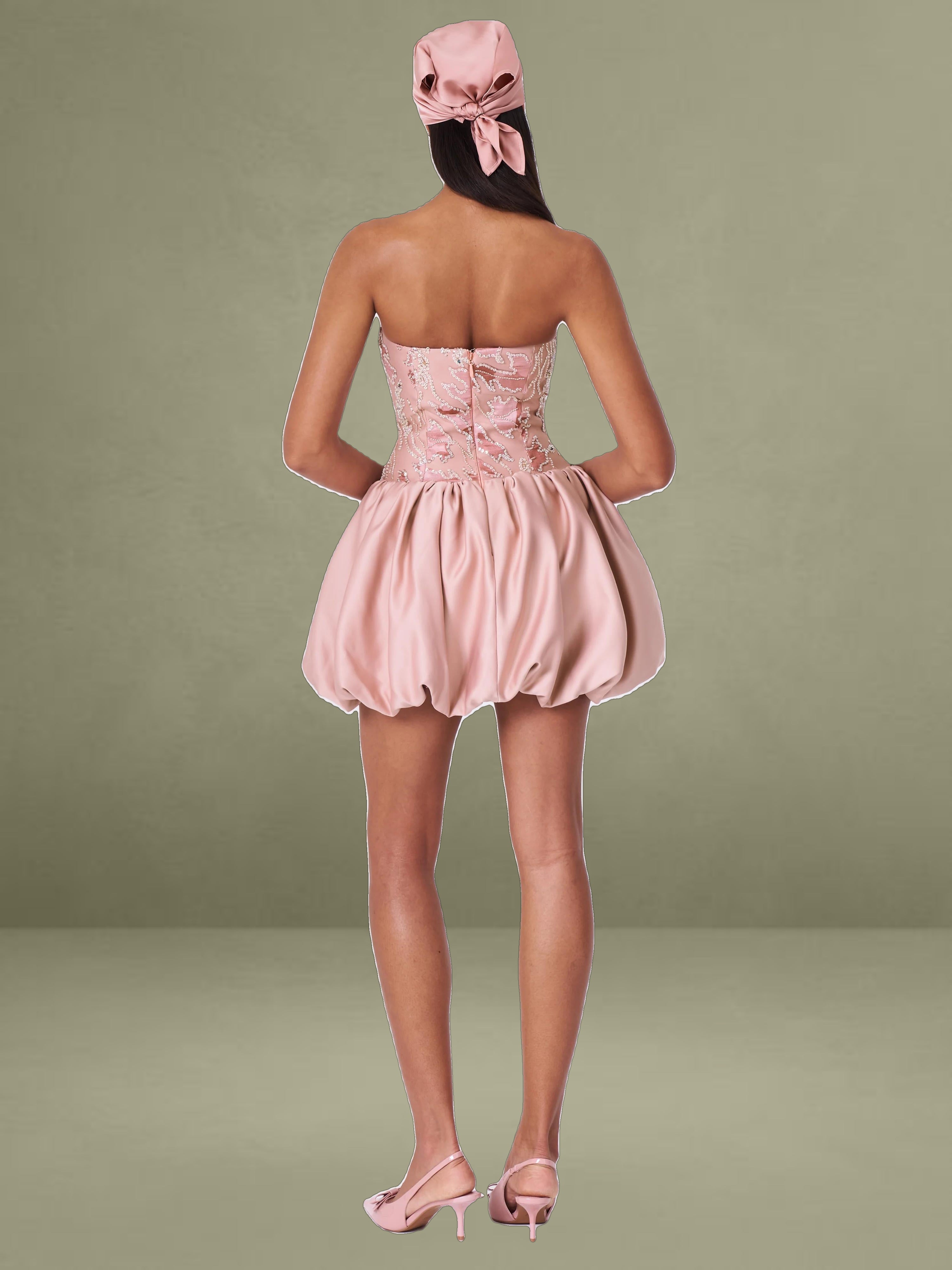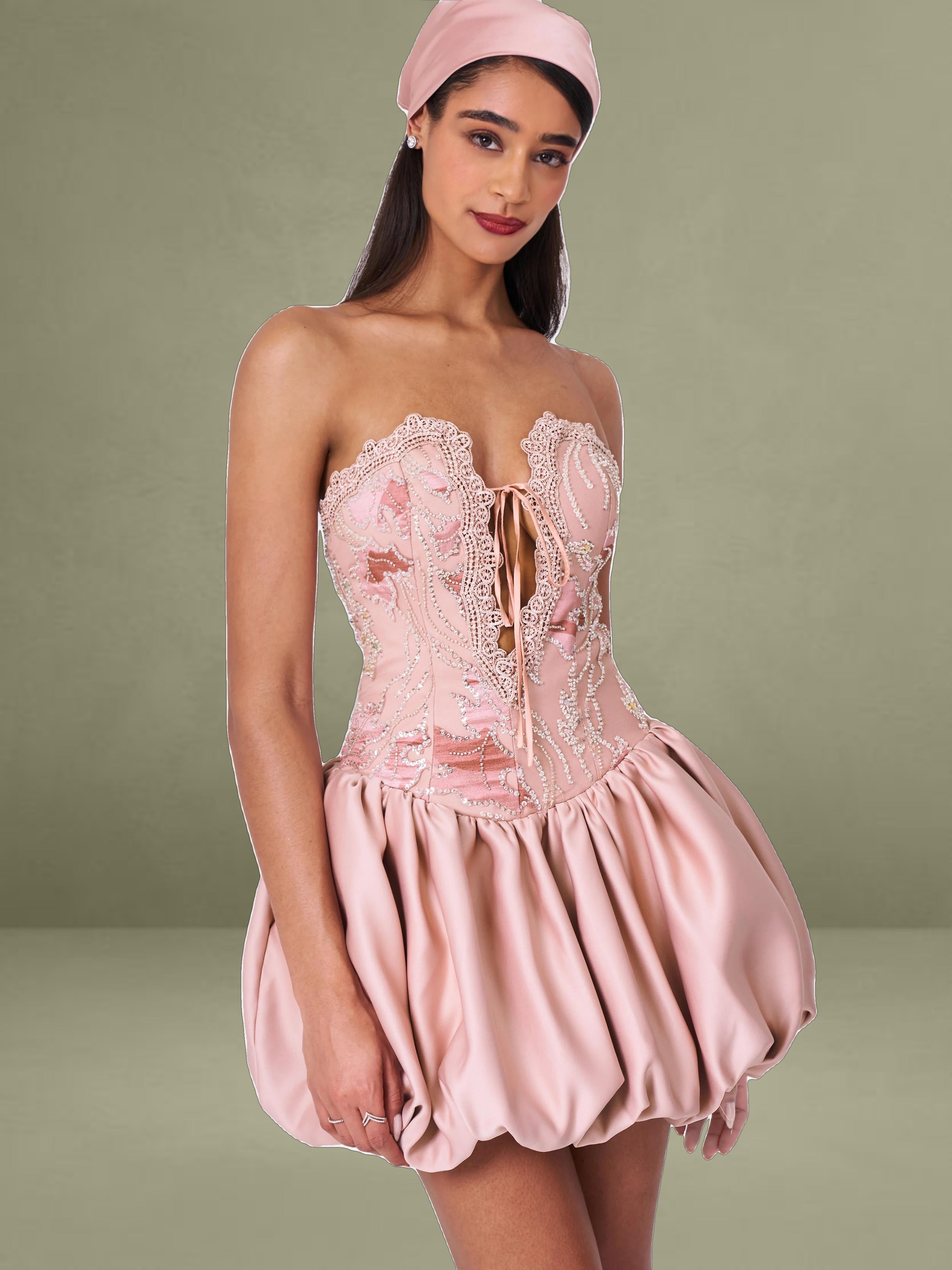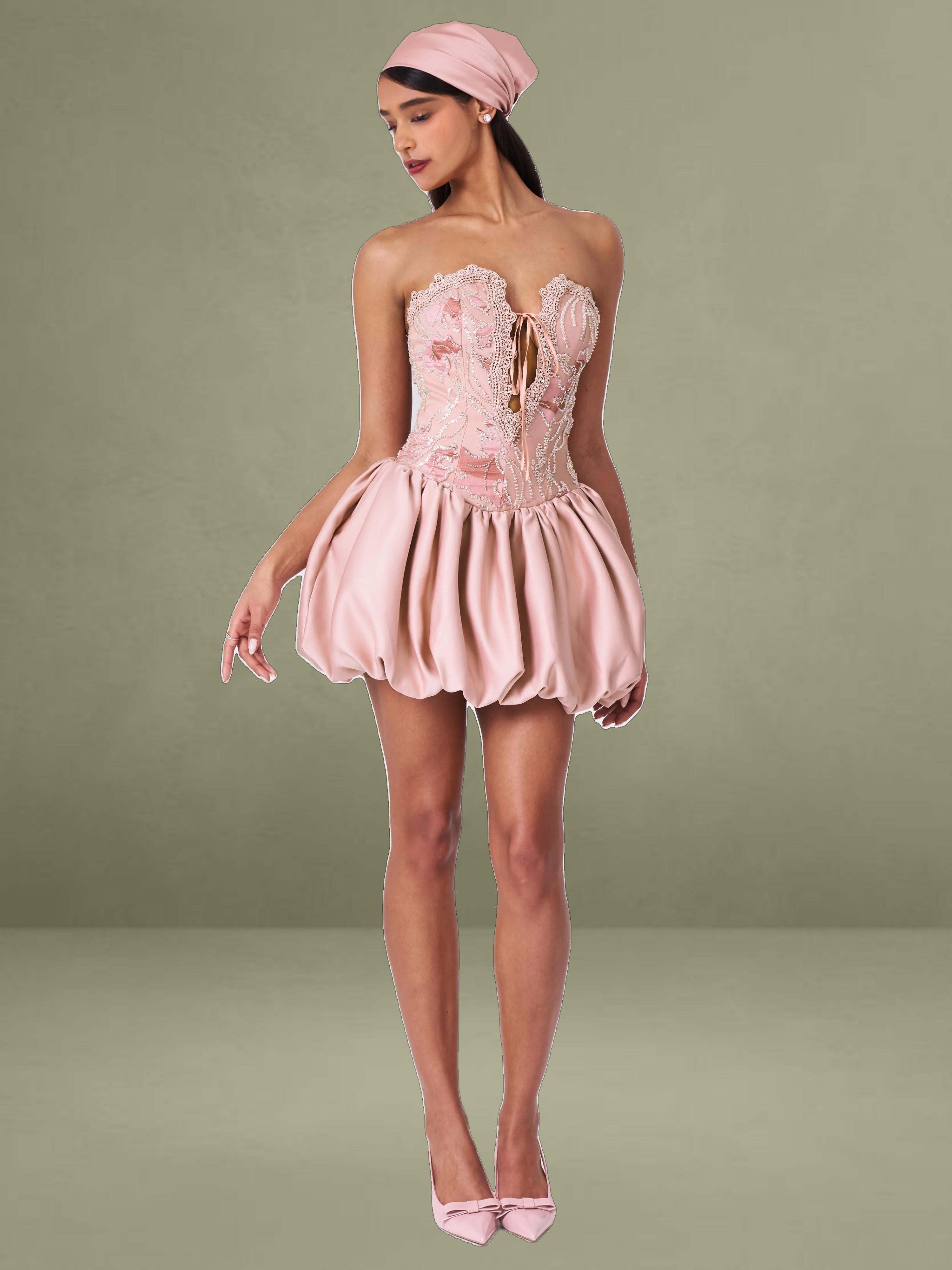 Delight in the whimsical elegance of the Palesa Dress, a masterpiece inspired by ballet style grace. Crafted from exquisite beaded sequin-embroidered fabric, this enchanting pink dress features a playful bubble hem and a charming drop waist silhouette. The deep V collar, adorned with delicate lace trim, adds a romantic touch, while the practicality of hidden pockets makes it as functional as it is beautiful. Fully lined for comfort and fitted with an invisible zipper for a seamless finish, the Palesa Dress is perfect for making a dreamy statement at any special occasion.
