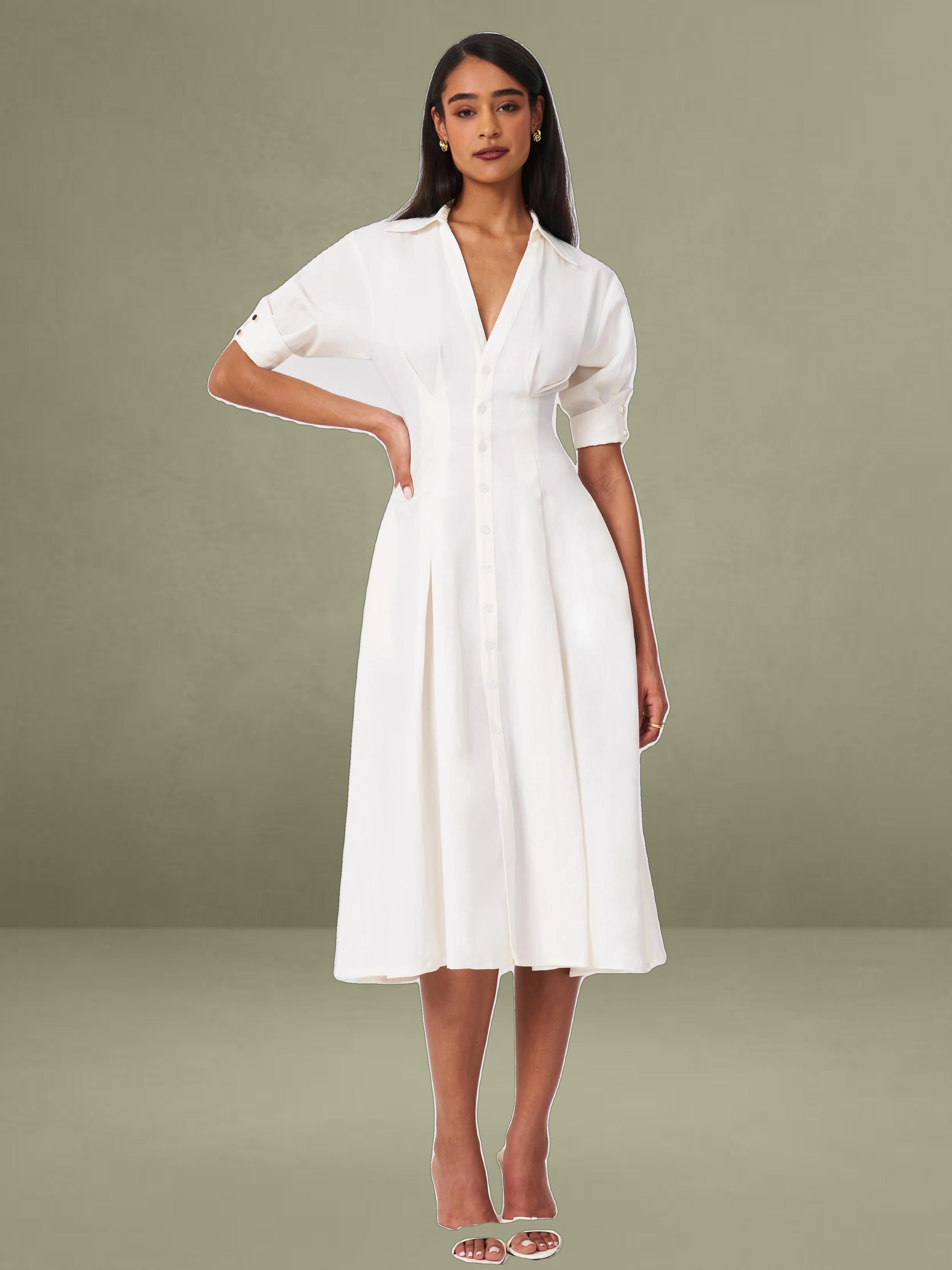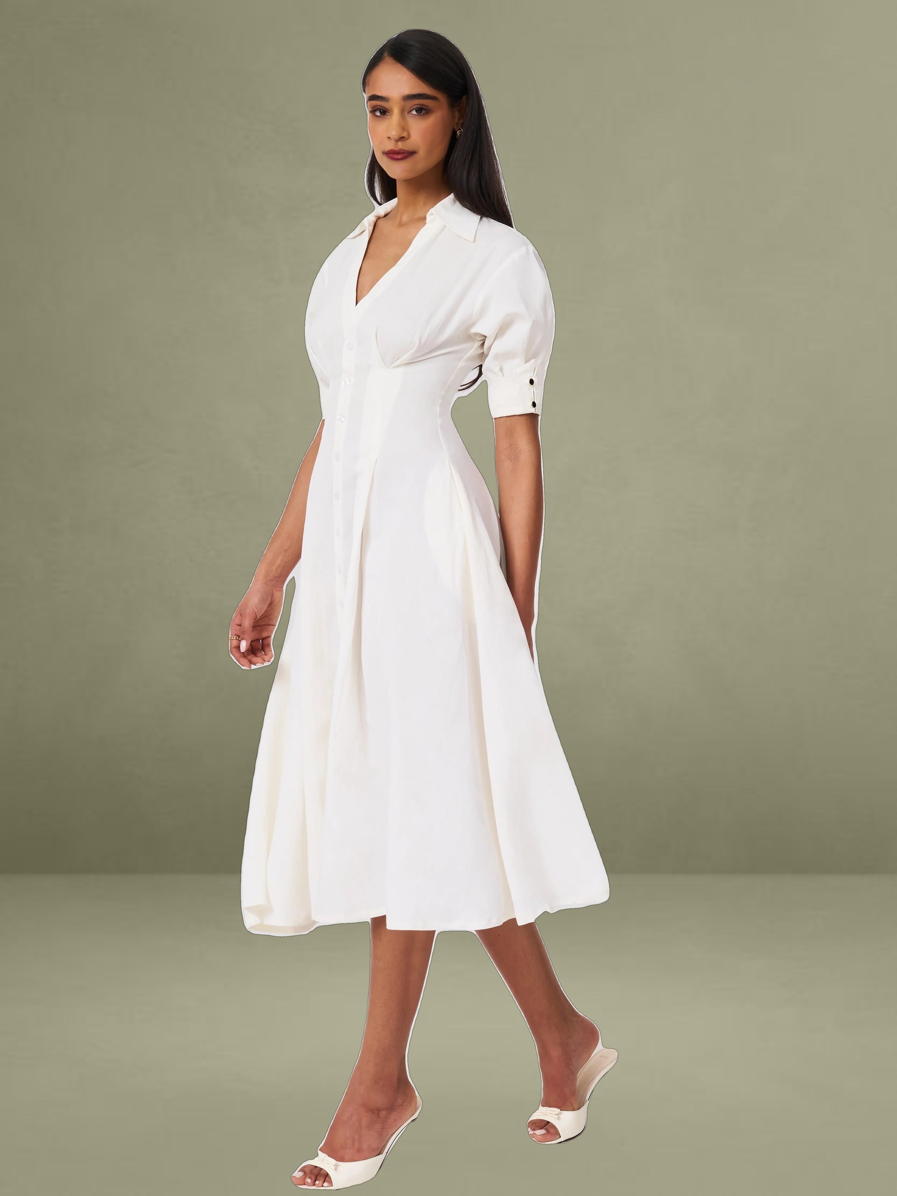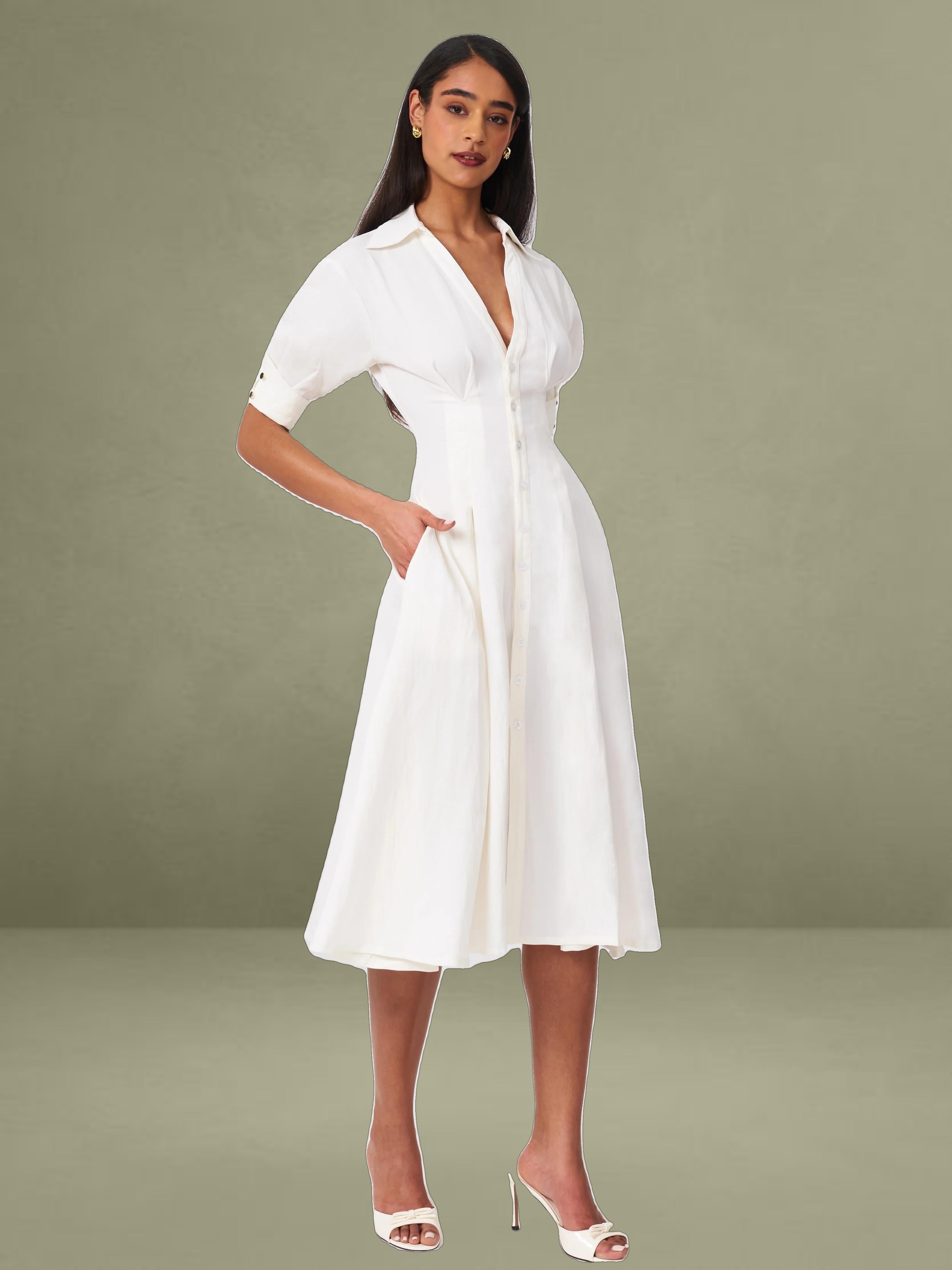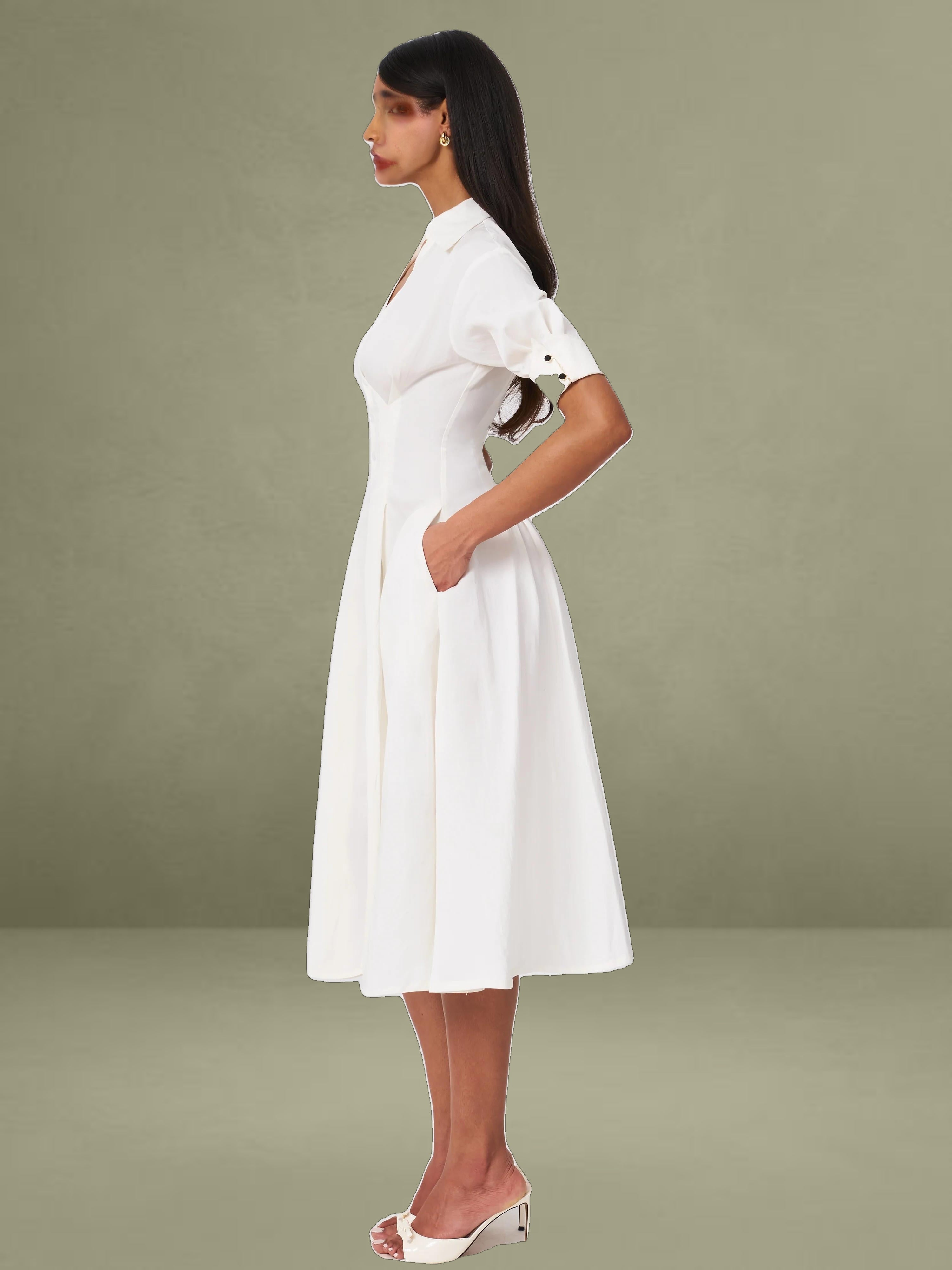 The Palina Dress redefines preppy elegance with its timeless shirt dress silhouette. Made from breathable Lyocell fabric, this midi-length dress features delicate pleated detailing that adds a touch of sophistication. The button-up front and black cuff buttons create a polished business casual look, perfect for both formal and daily wear. Thoughtfully designed with invisible pockets, this versatile white dress is a wardrobe staple for effortless style and comfort.