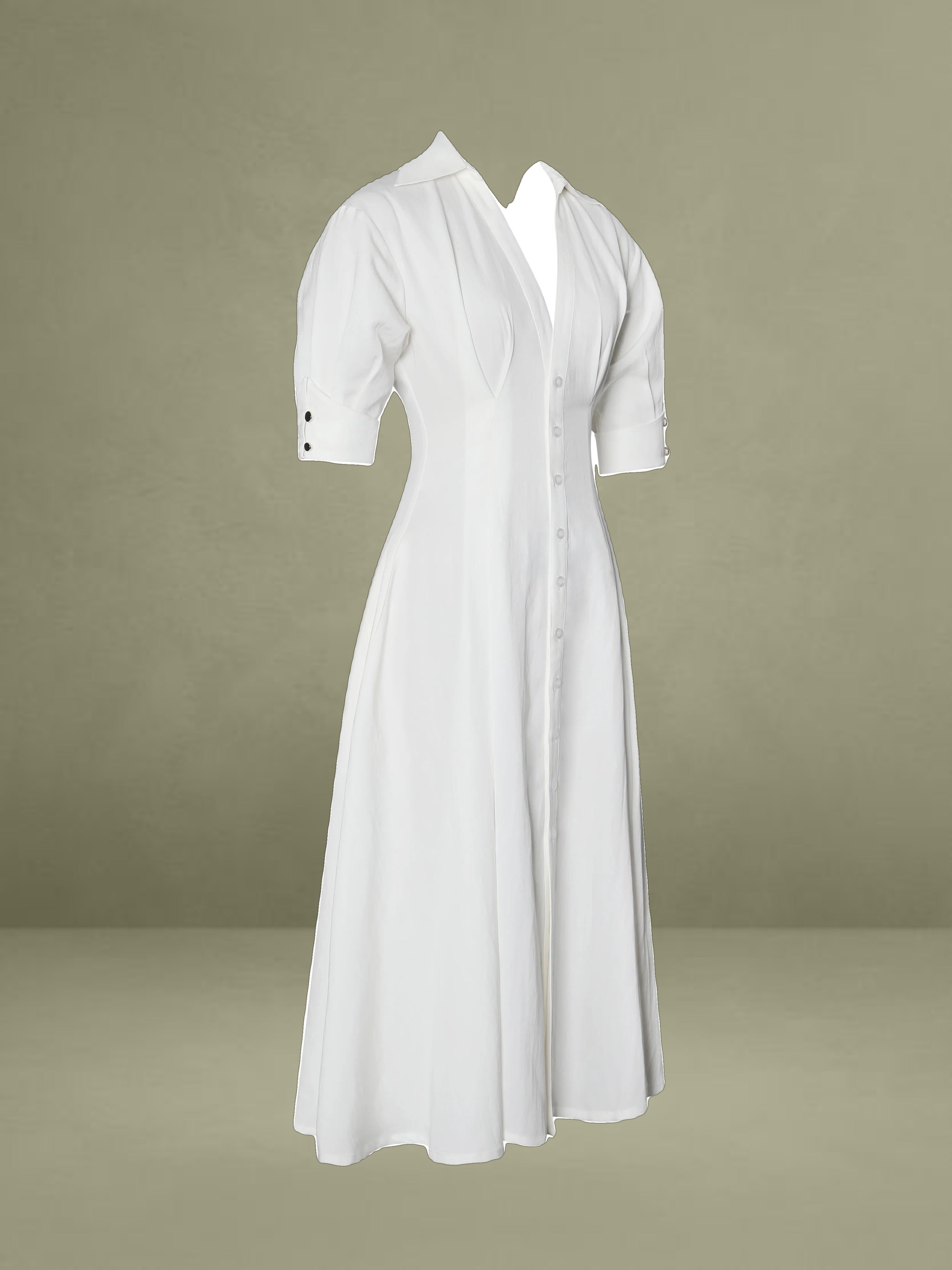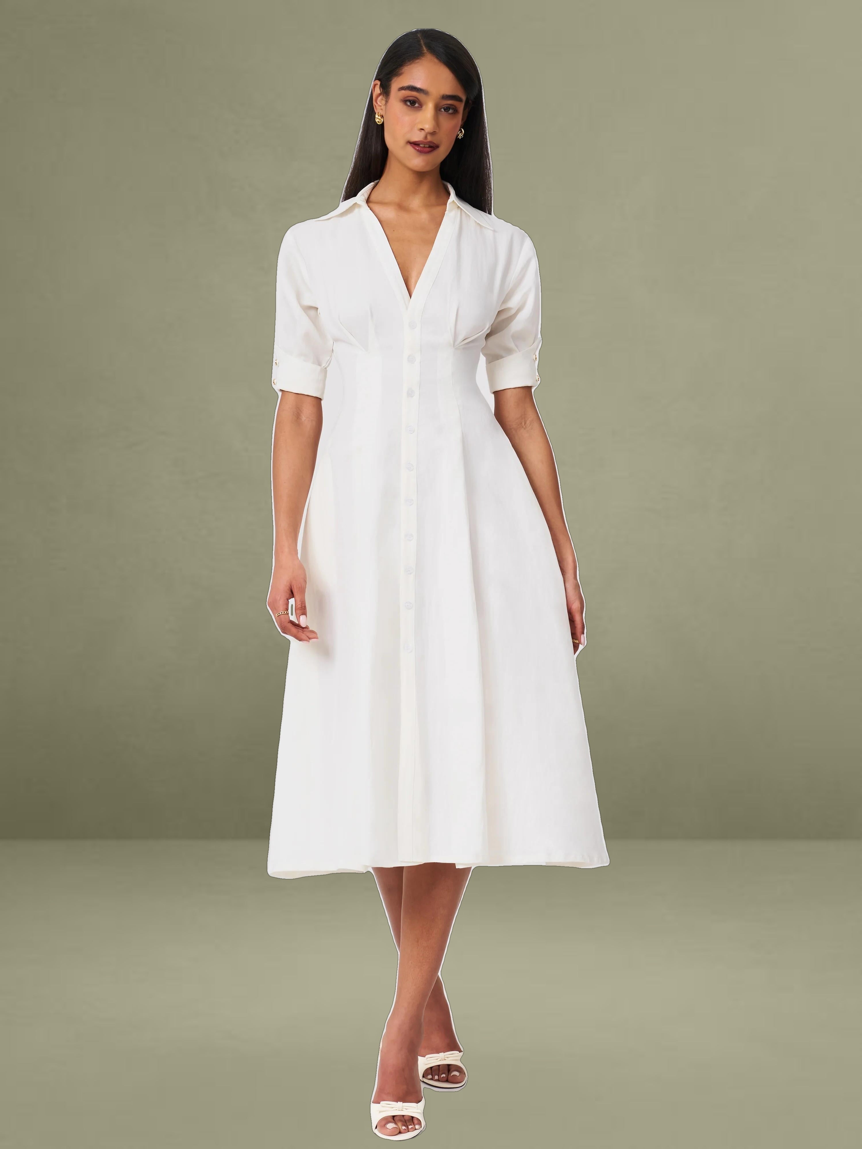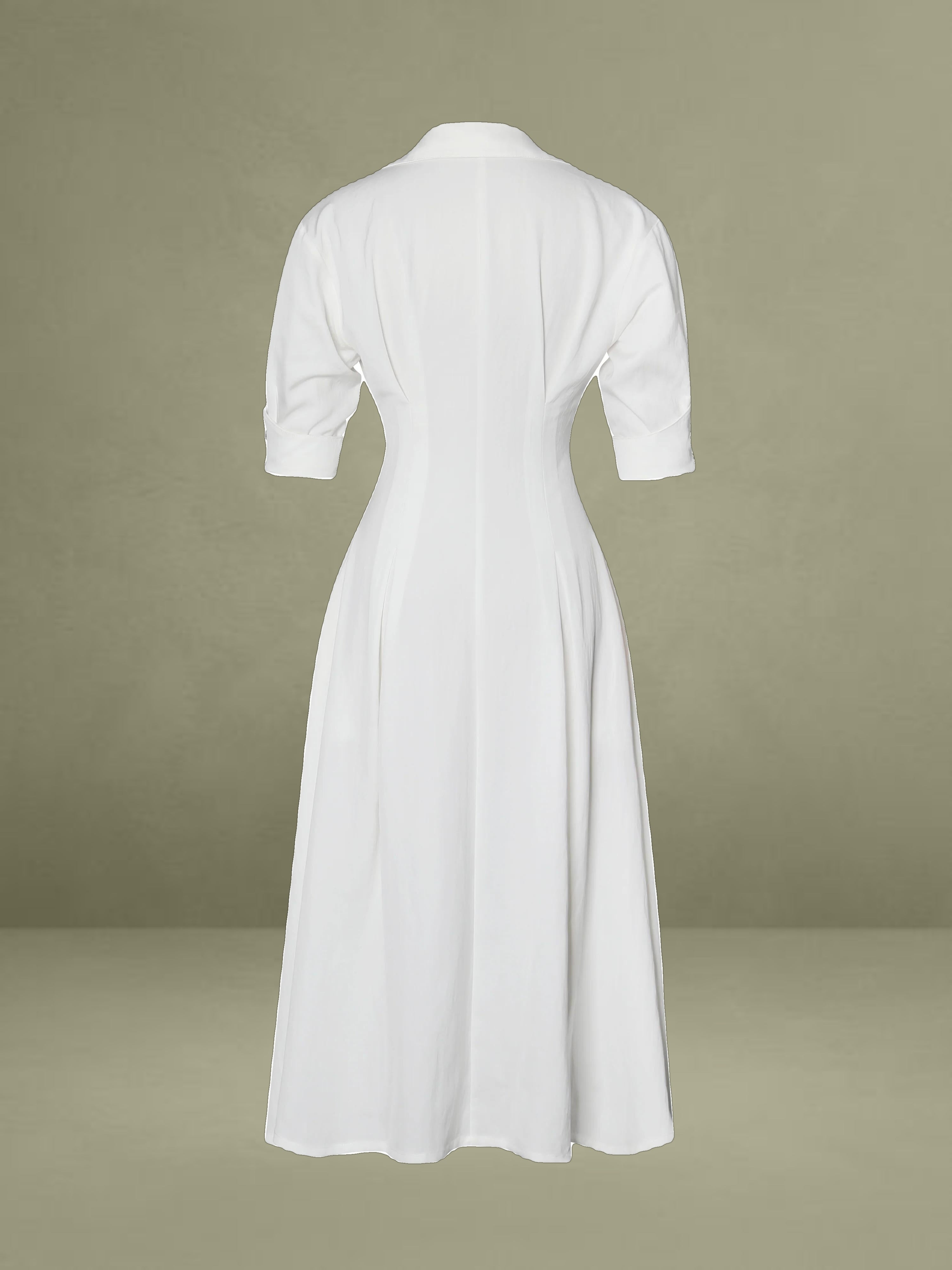 The Palina Dress redefines preppy elegance with its timeless shirt dress silhouette. Made from breathable Lyocell fabric, this midi-length dress features delicate pleated detailing that adds a touch of sophistication. The button-up front and black cuff buttons create a polished business casual look, perfect for both formal and daily wear. Thoughtfully designed with invisible pockets, this versatile white dress is a wardrobe staple for effortless style and comfort.