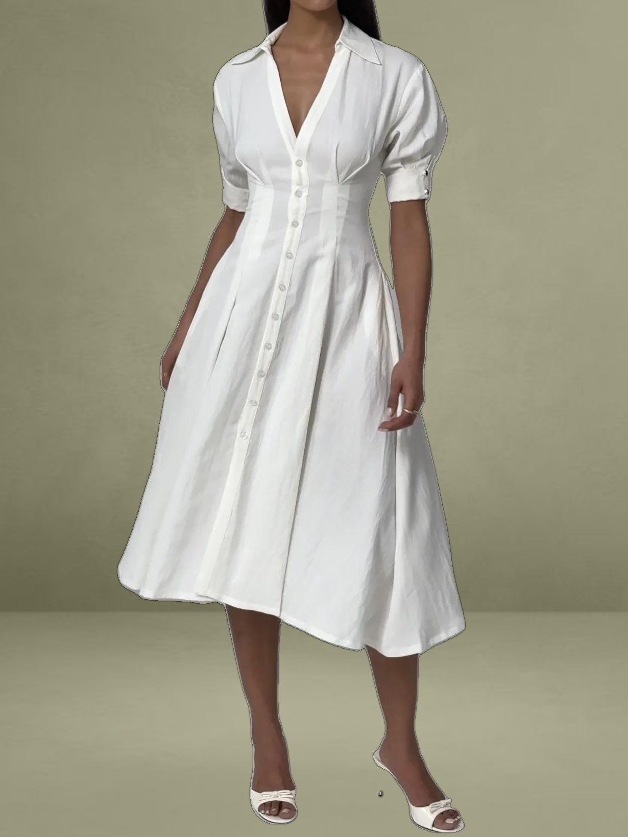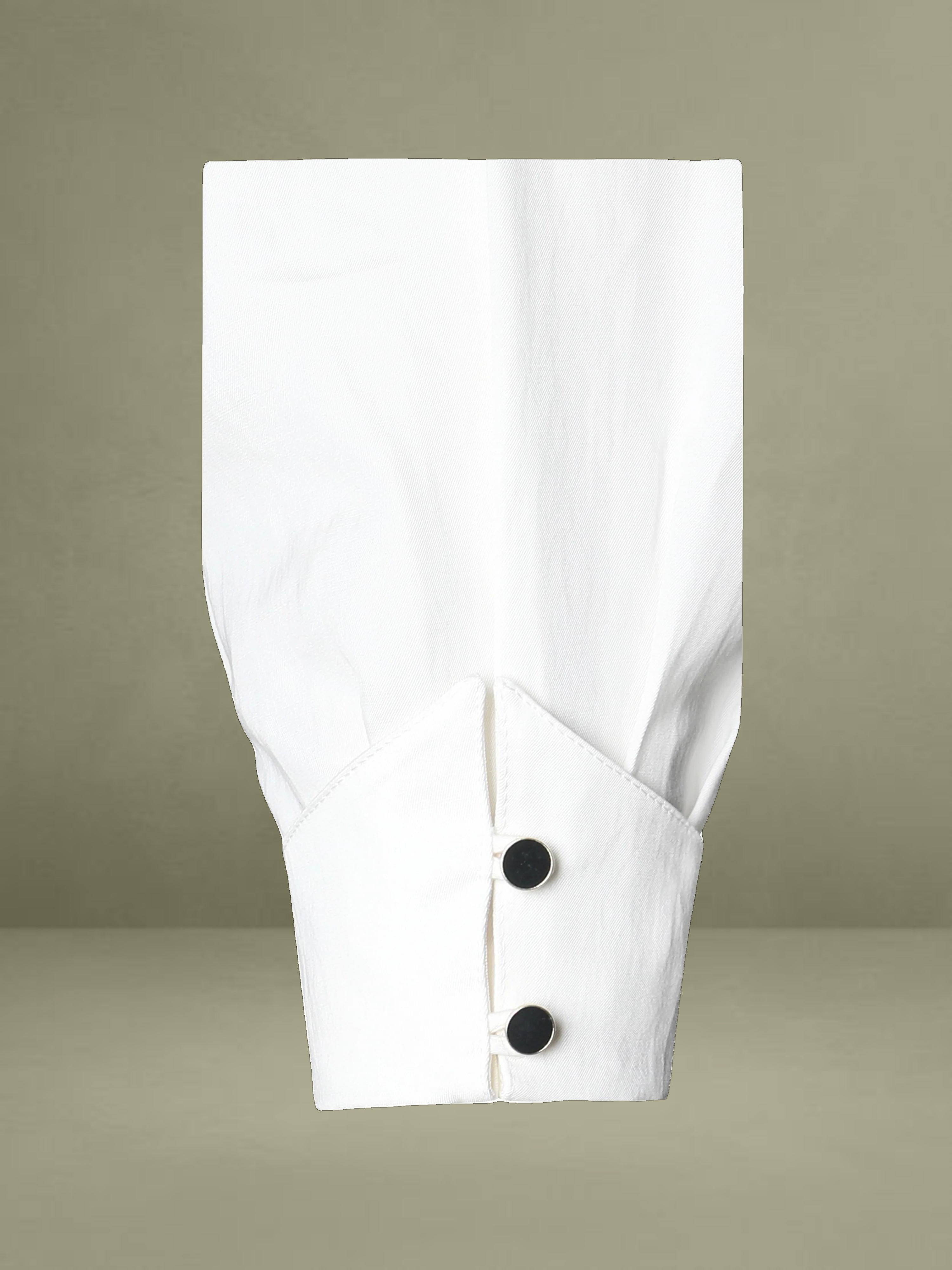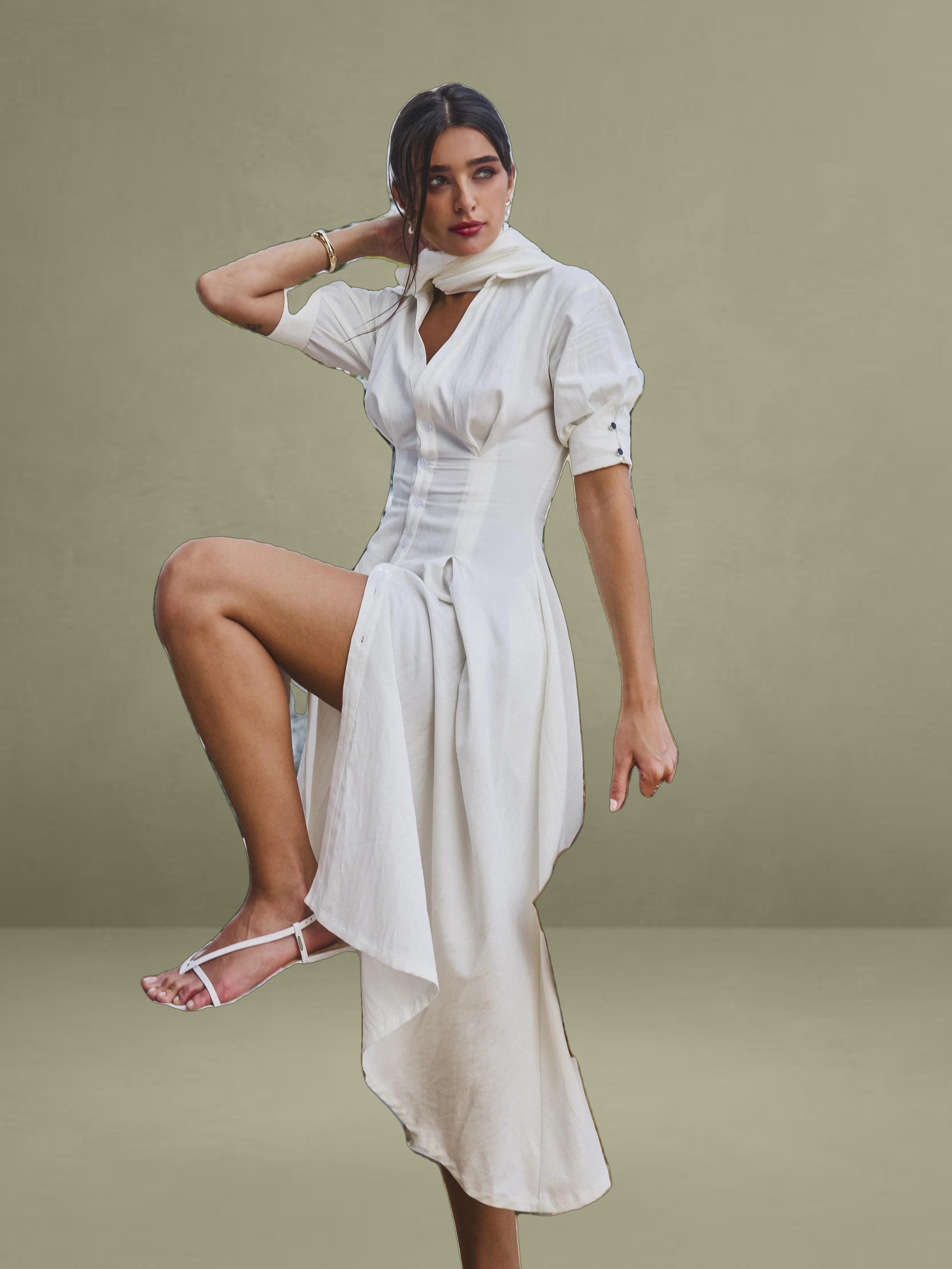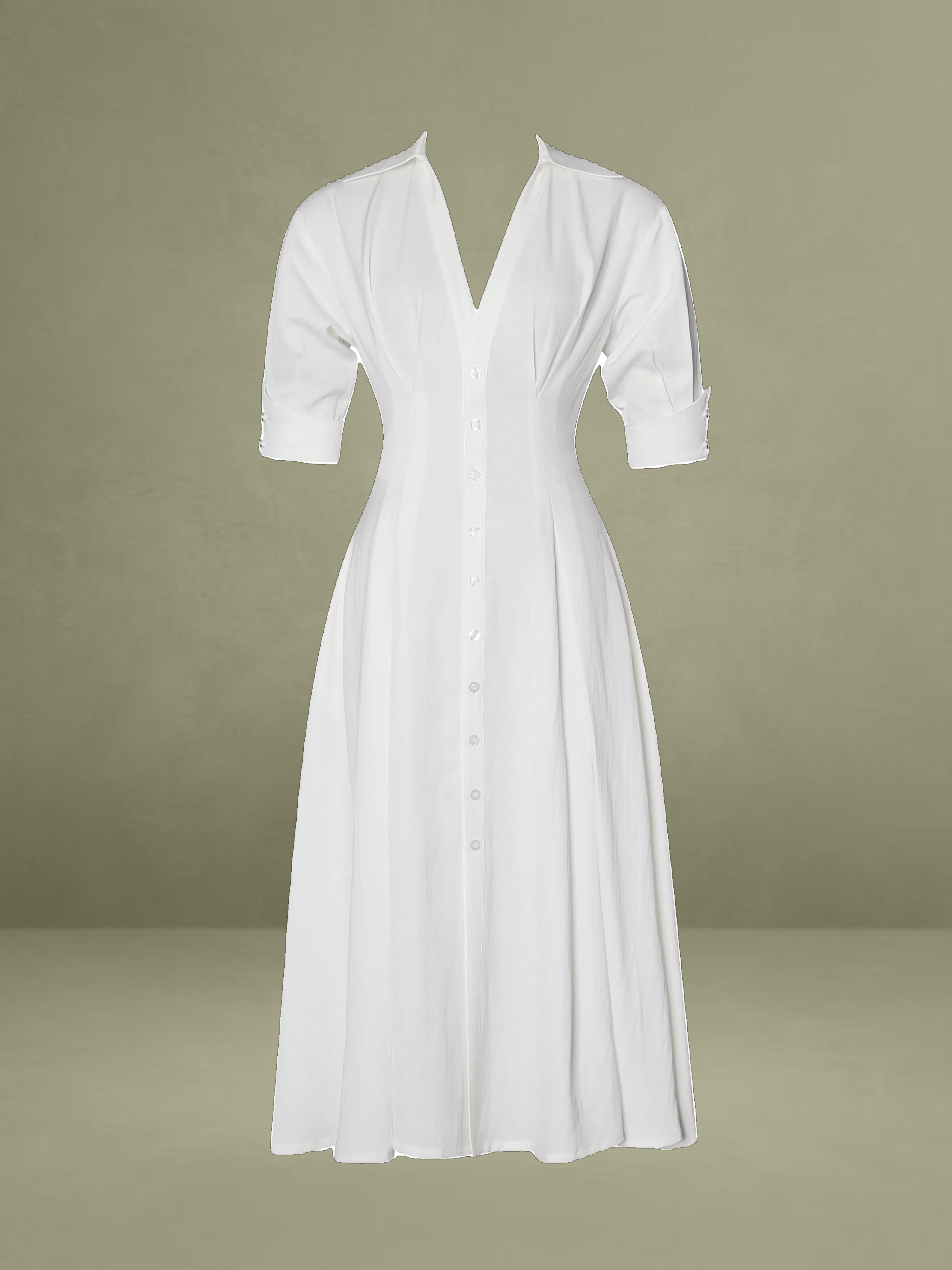The Palina Dress redefines preppy elegance with its timeless shirt dress silhouette. Made from breathable Lyocell fabric, this midi-length dress features delicate pleated detailing that adds a touch of sophistication. The button-up front and black cuff buttons create a polished business casual look, perfect for both formal and daily wear. Thoughtfully designed with invisible pockets, this versatile white dress is a wardrobe staple for effortless style and comfort.