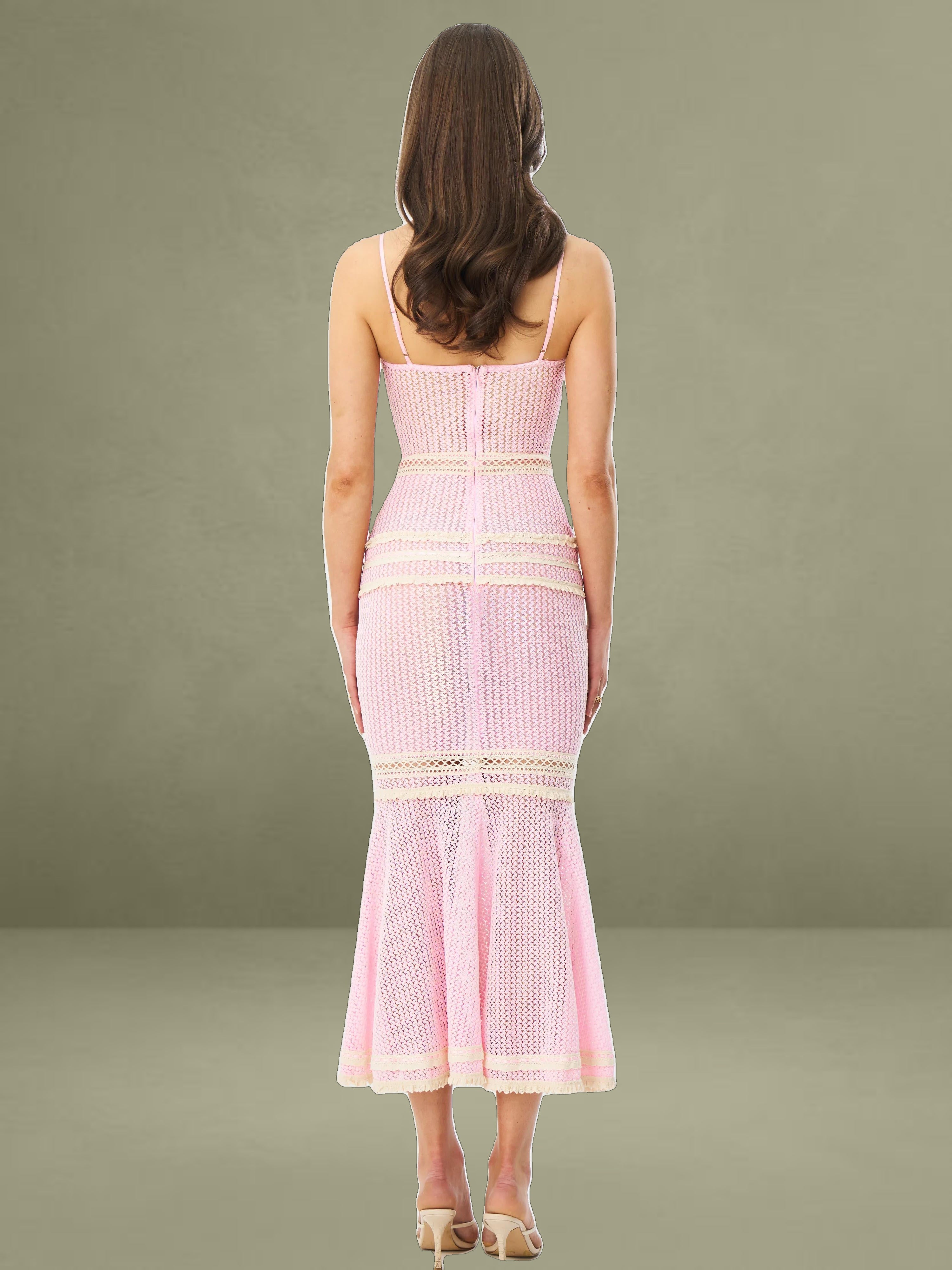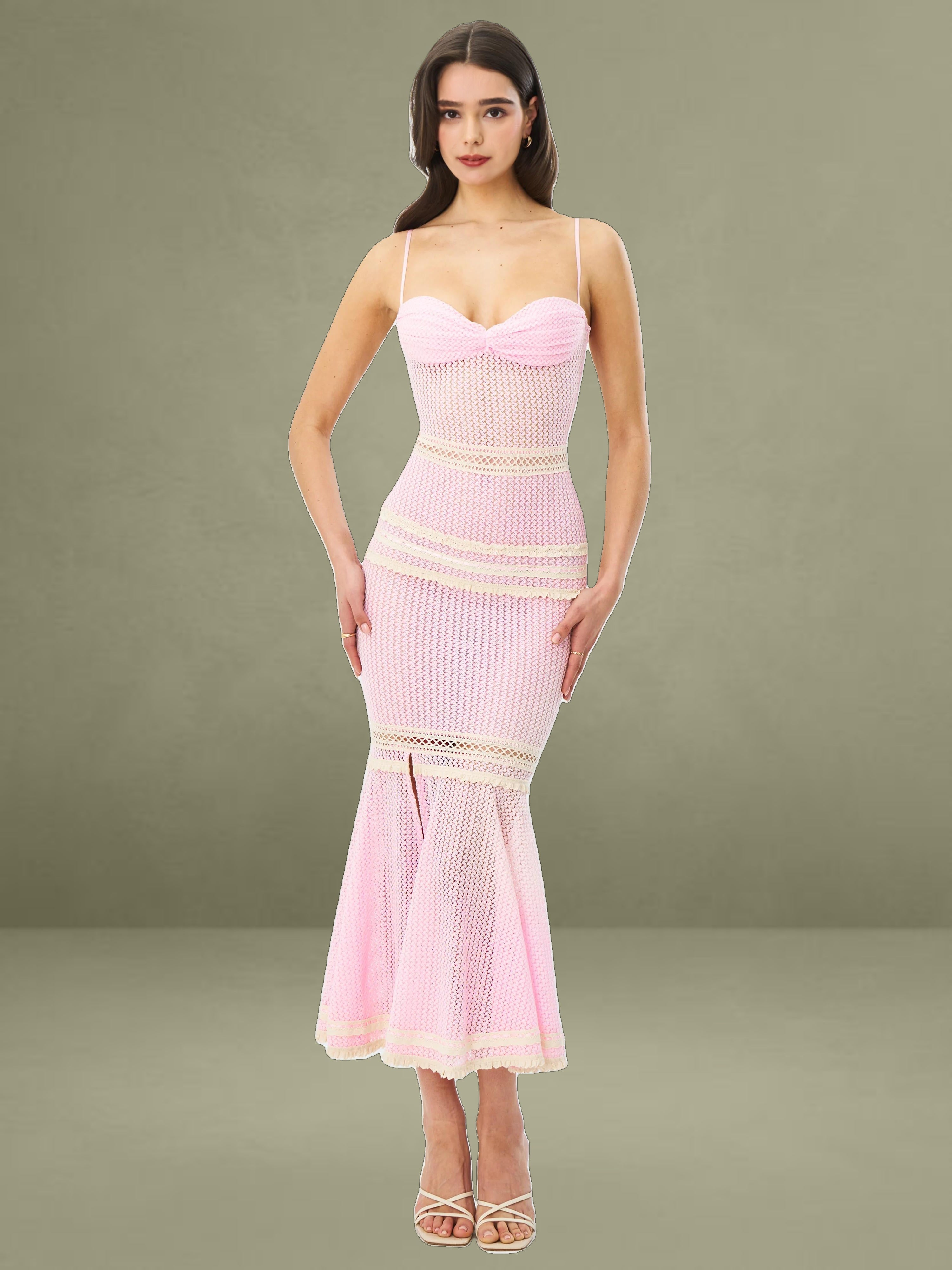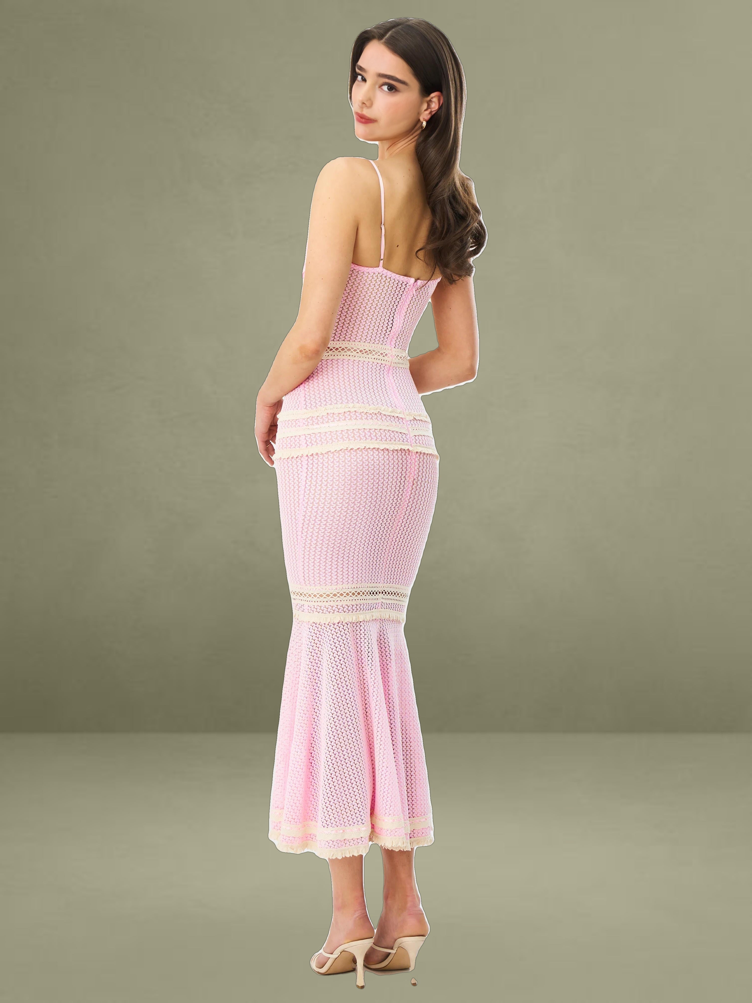 The Pallas Dress exudes feminine charm with its romantic pink crochet fabric and intricate lace detailing. Designed with a ruched breast and three-layer lace trim at the bust, it offers a flattering fit enhanced by a mid waist silhouette and delicate lace-trimmed waistline. The knee-high slit features a double-layer lace trim that adds graceful movement to its mermaid shape. Mesh lining ensures comfort, while adjustable straps and stretchable fabric provide a flexible, custom fit. Finished with an invisible zipper at the back, this knee-length beauty is both dreamy and statement-making.