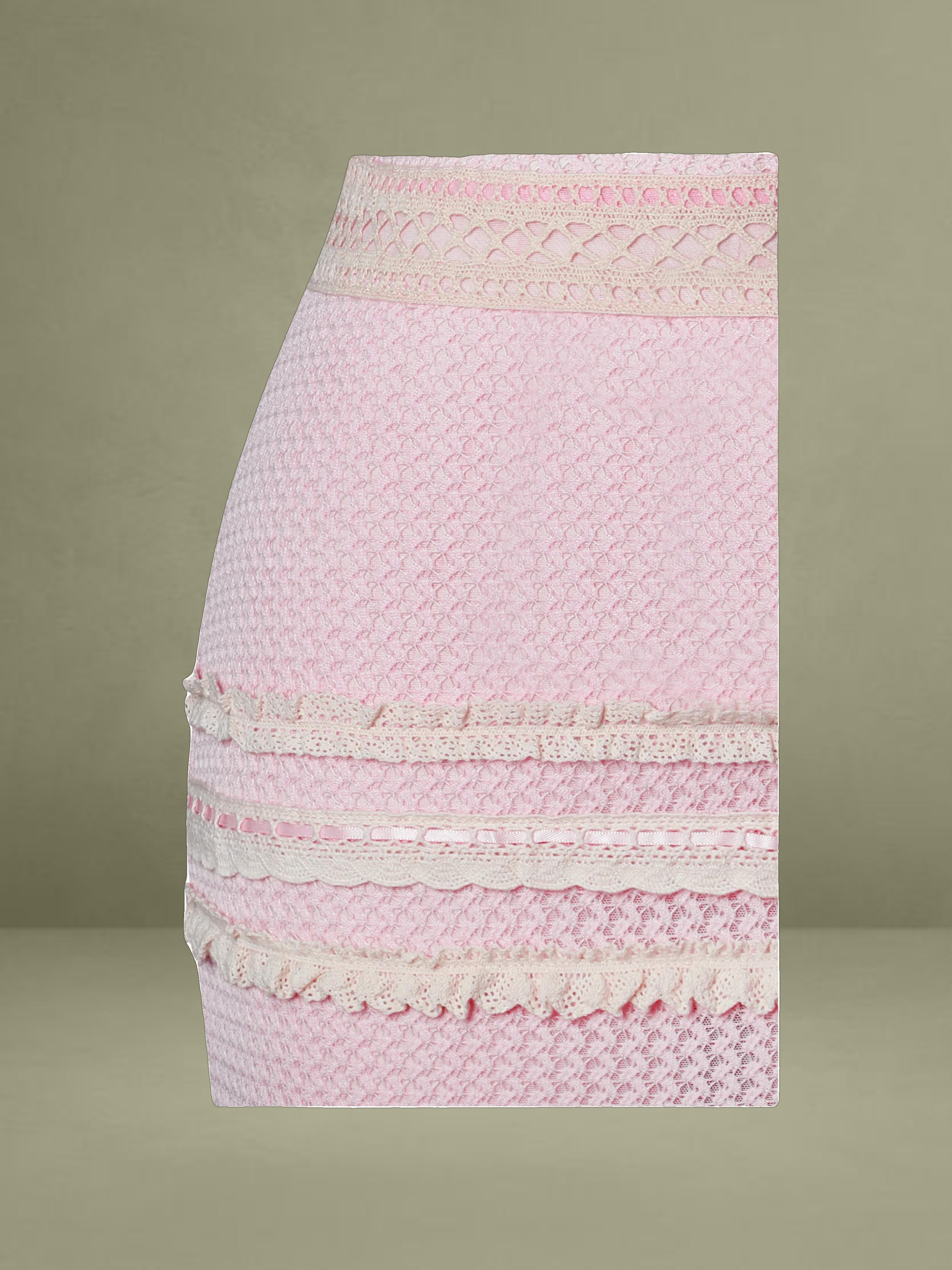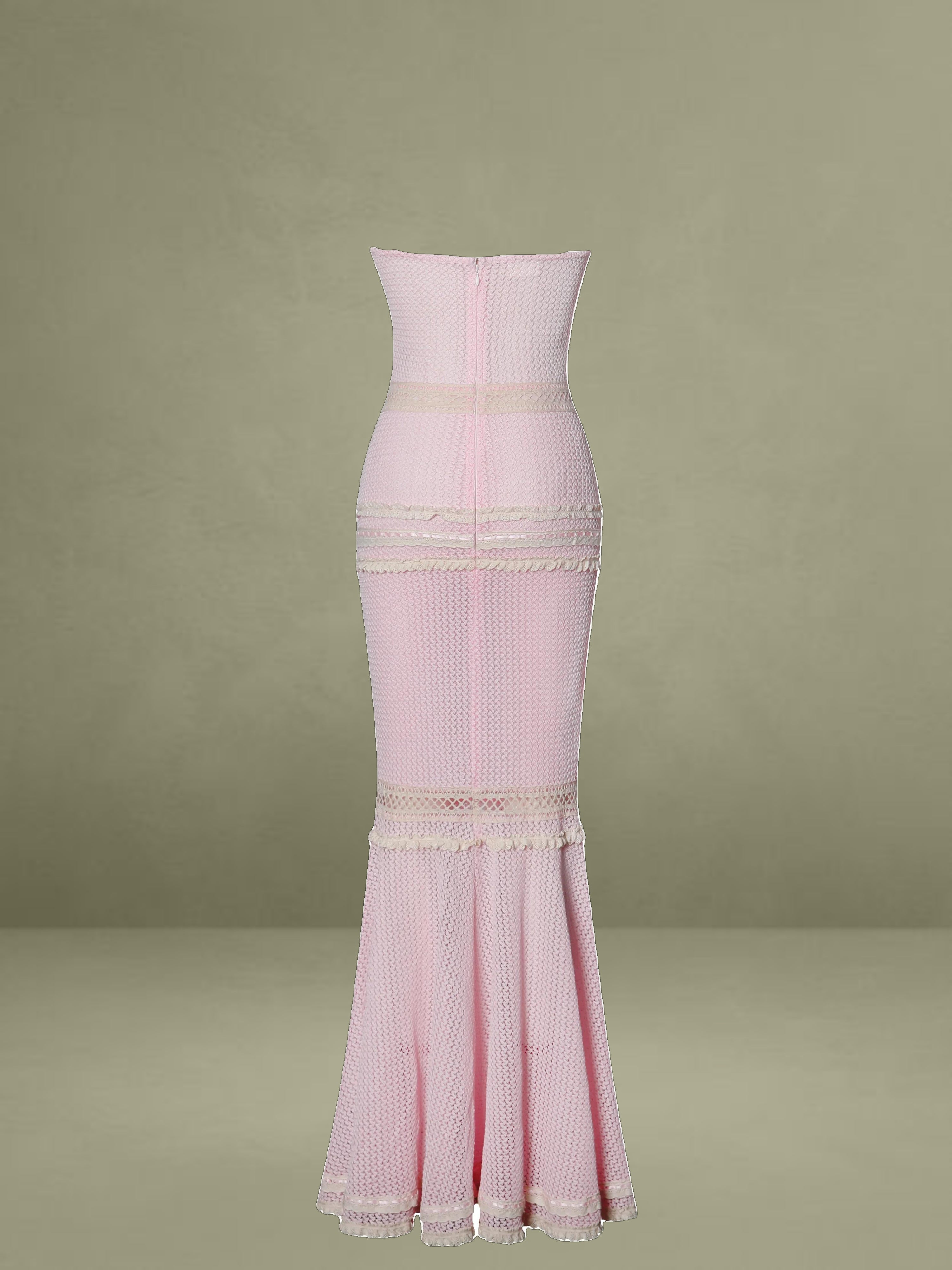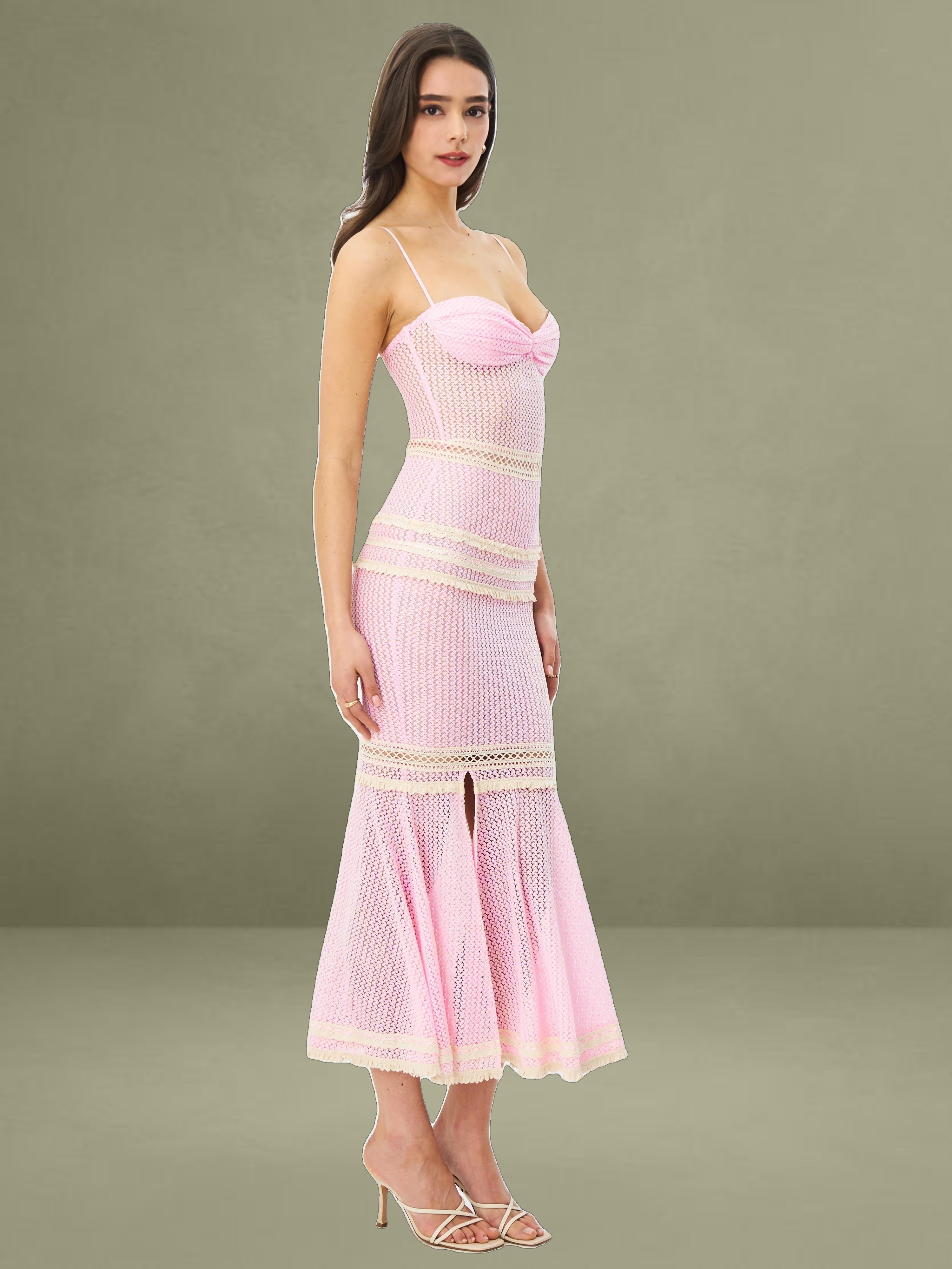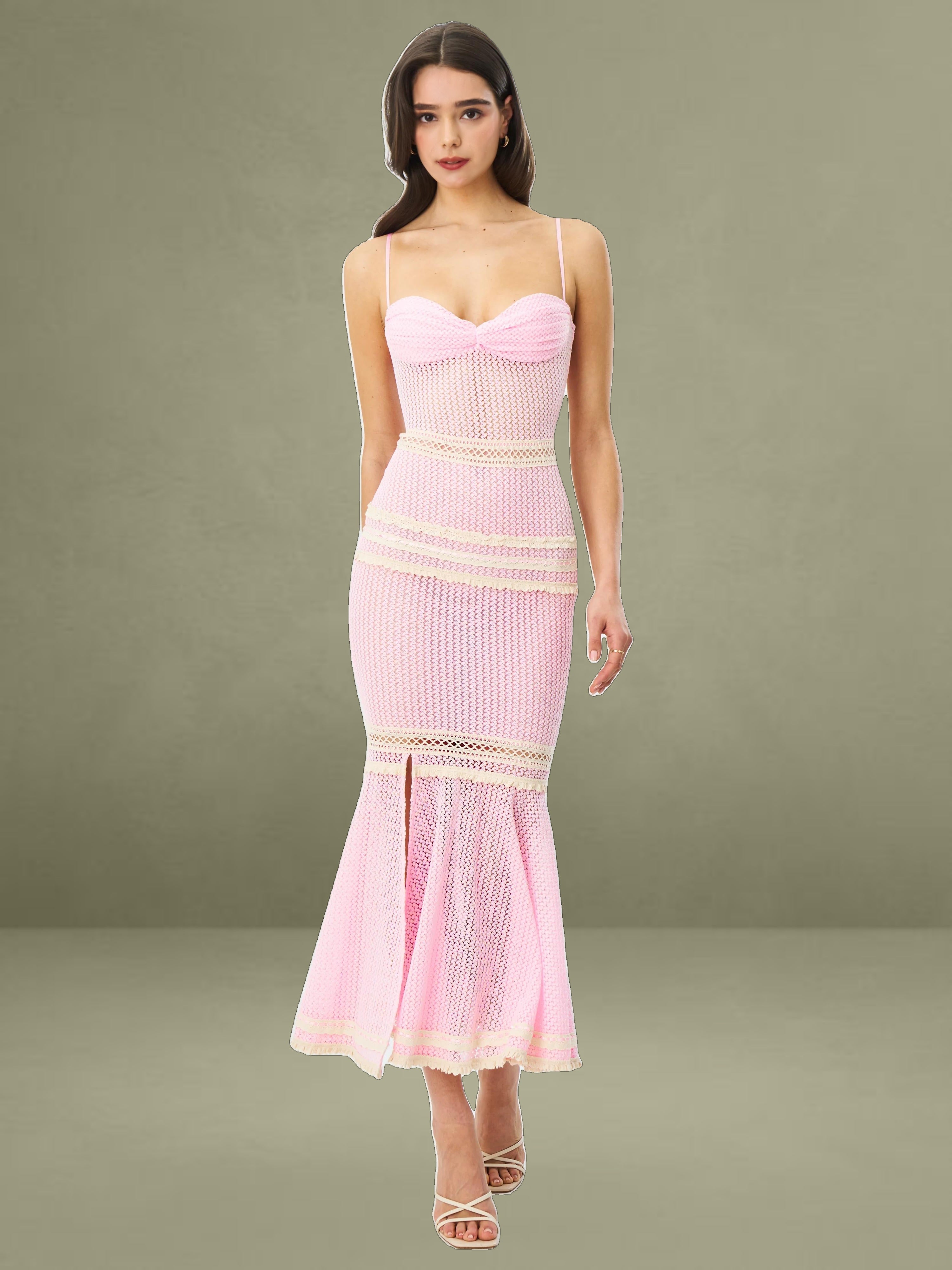 The Pallas Dress exudes feminine charm with its romantic pink crochet fabric and intricate lace detailing. Designed with a ruched breast and three-layer lace trim at the bust, it offers a flattering fit enhanced by a mid waist silhouette and delicate lace-trimmed waistline. The knee-high slit features a double-layer lace trim that adds graceful movement to its mermaid shape. Mesh lining ensures comfort, while adjustable straps and stretchable fabric provide a flexible, custom fit. Finished with an invisible zipper at the back, this knee-length beauty is both dreamy and statement-making.