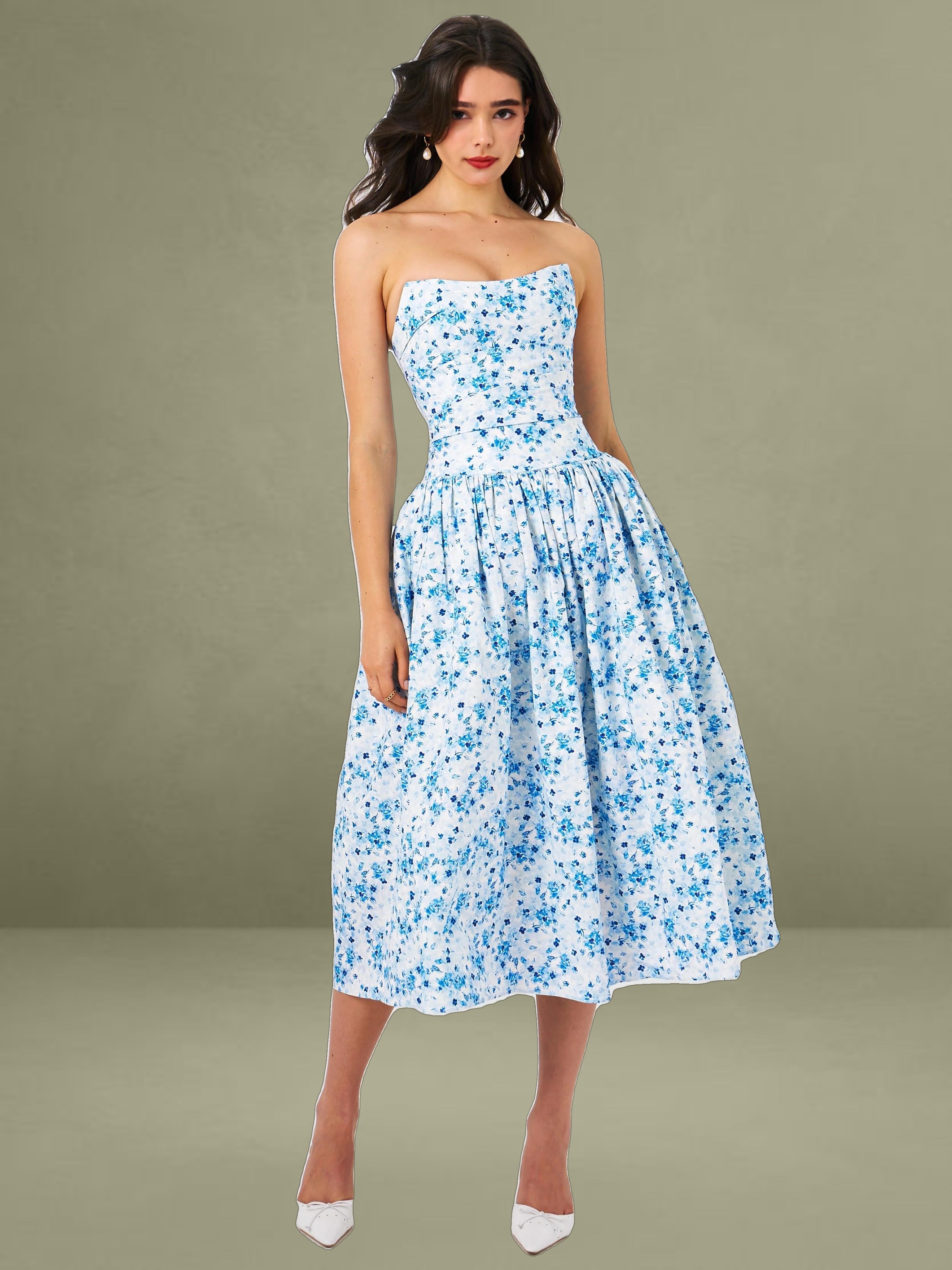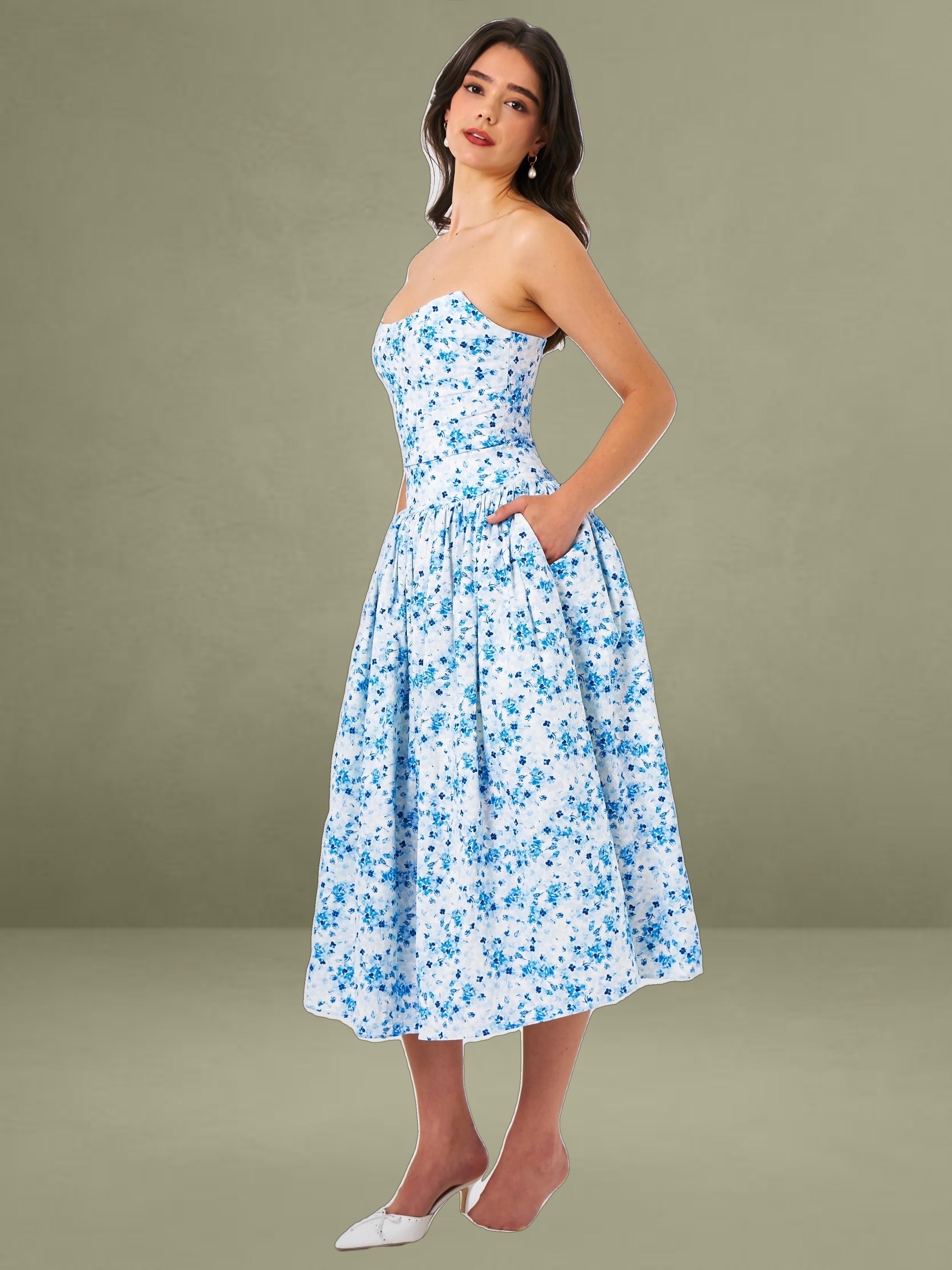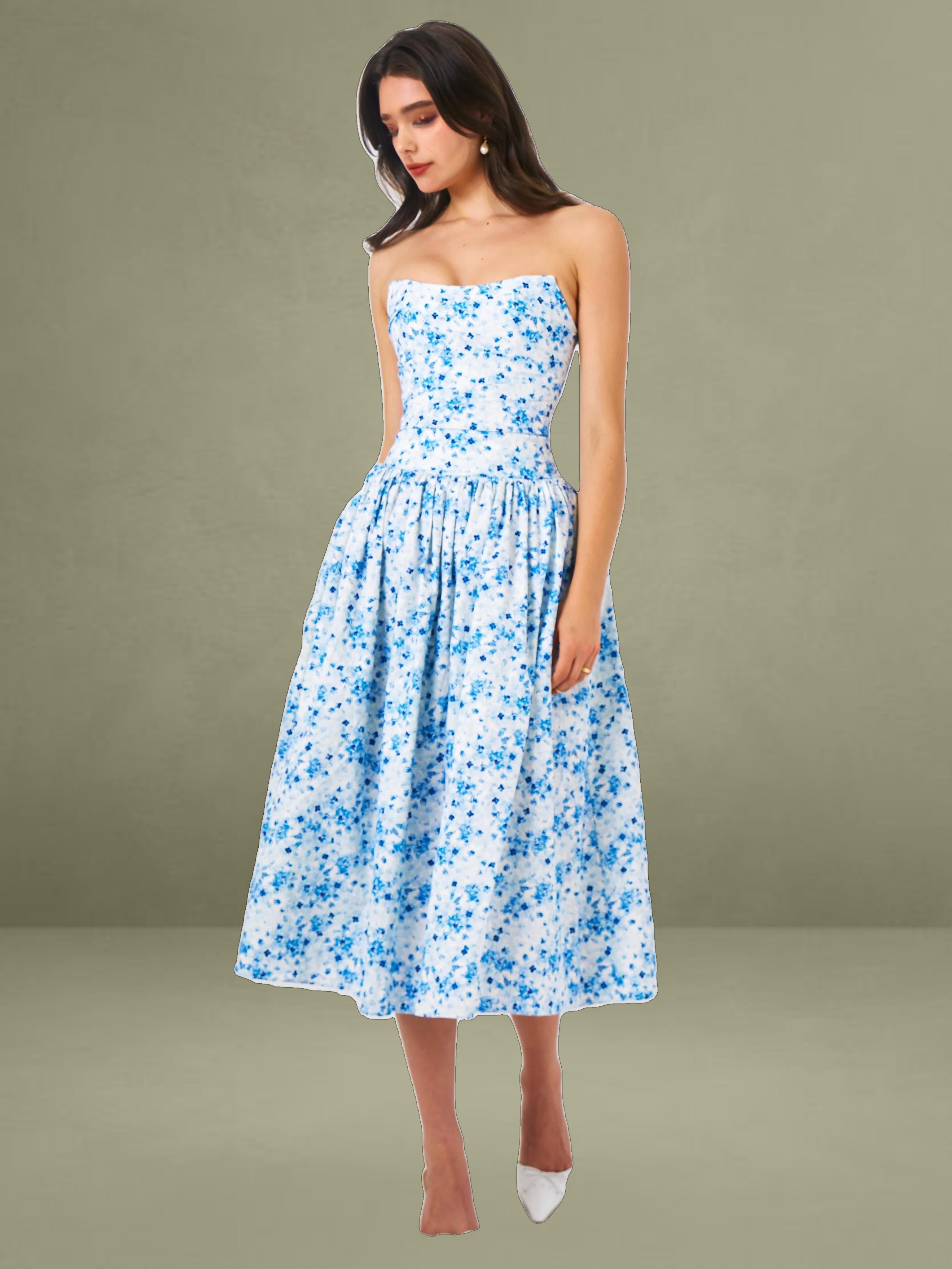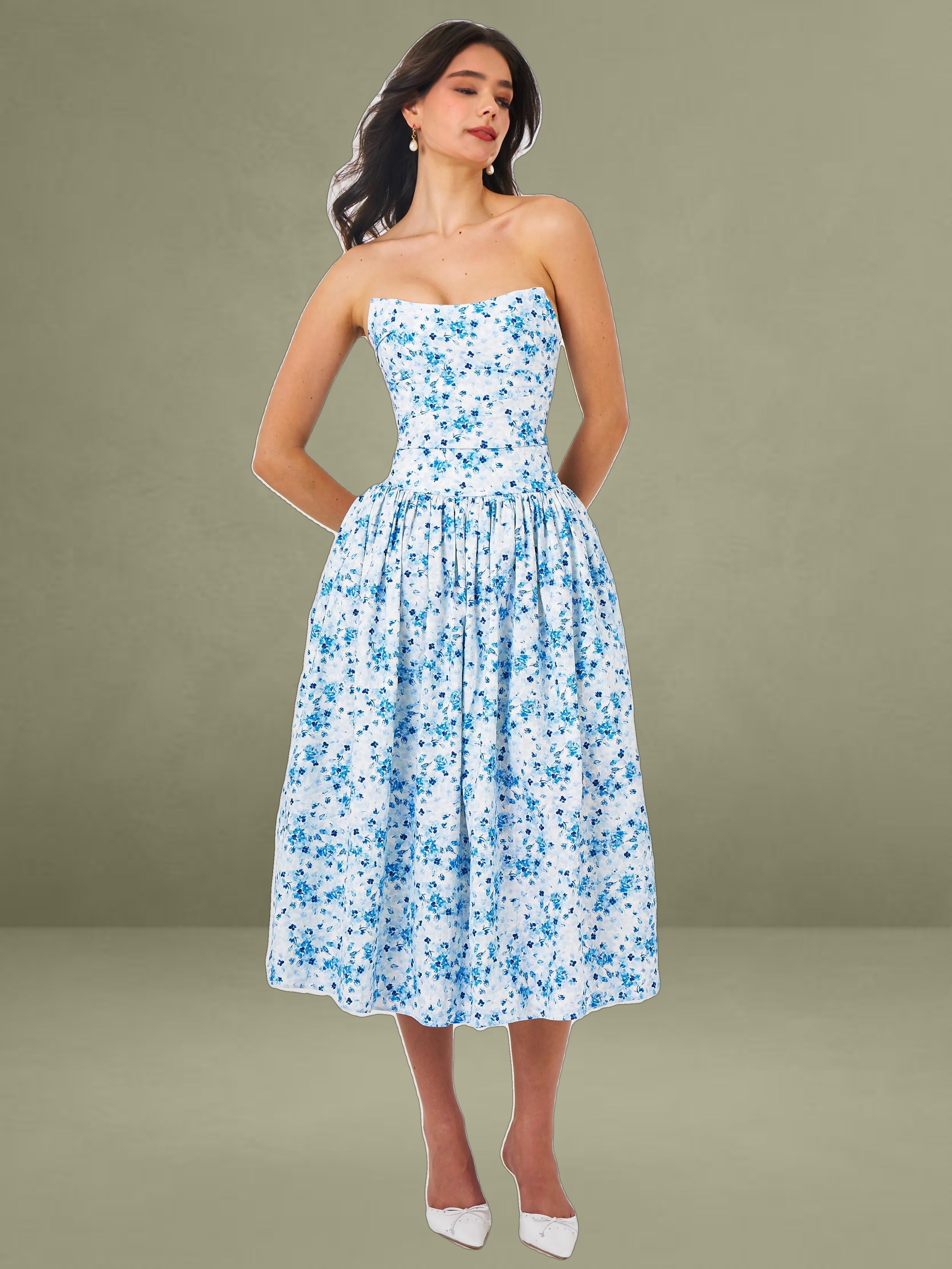 Presenting the Paloma dress, a striking display of effortless sophistication. Crafted with meticulous attention to detail, this midi sundress features a mesmerizing print eco-luxe fabric that captivates with its vibrant allure. The drop waist design adds a contemporary edge, while the draping top exudes timeless elegance. Fully lined and equipped with built-in bones, this dress offers both comfort and structure, ensuring a flawless fit that flatters every curve. Slip into refined style effortlessly, facilitated by the discreet invisible zipper at the middle back, guaranteeing a seamless finish that's as chic as it is captivating.