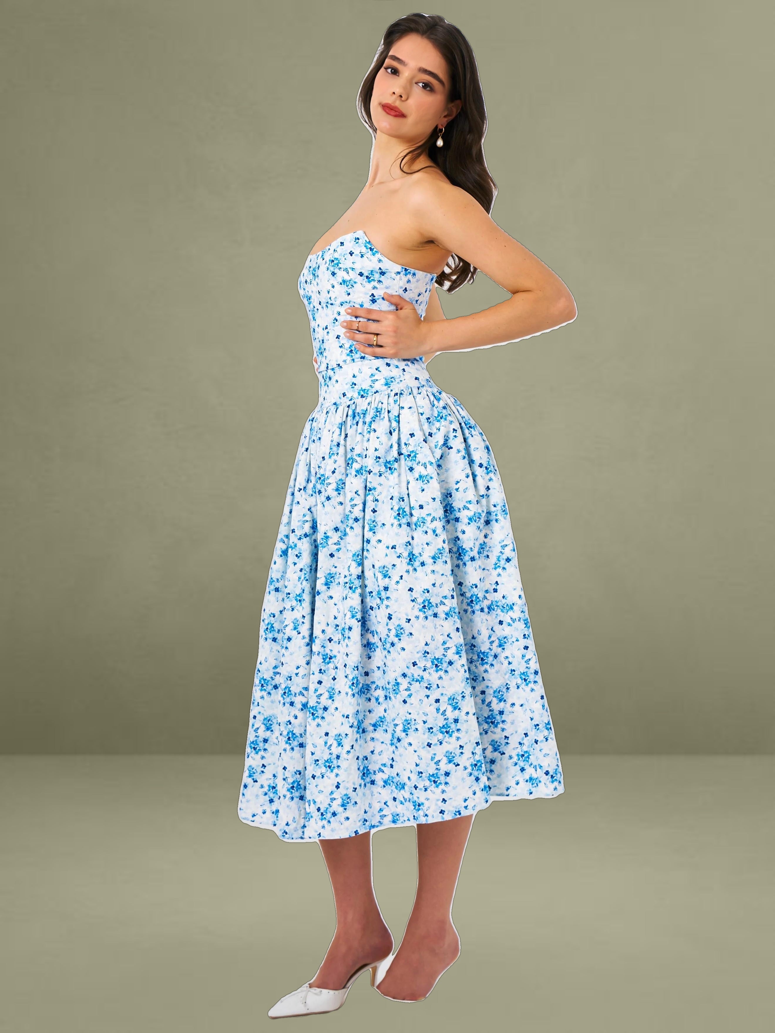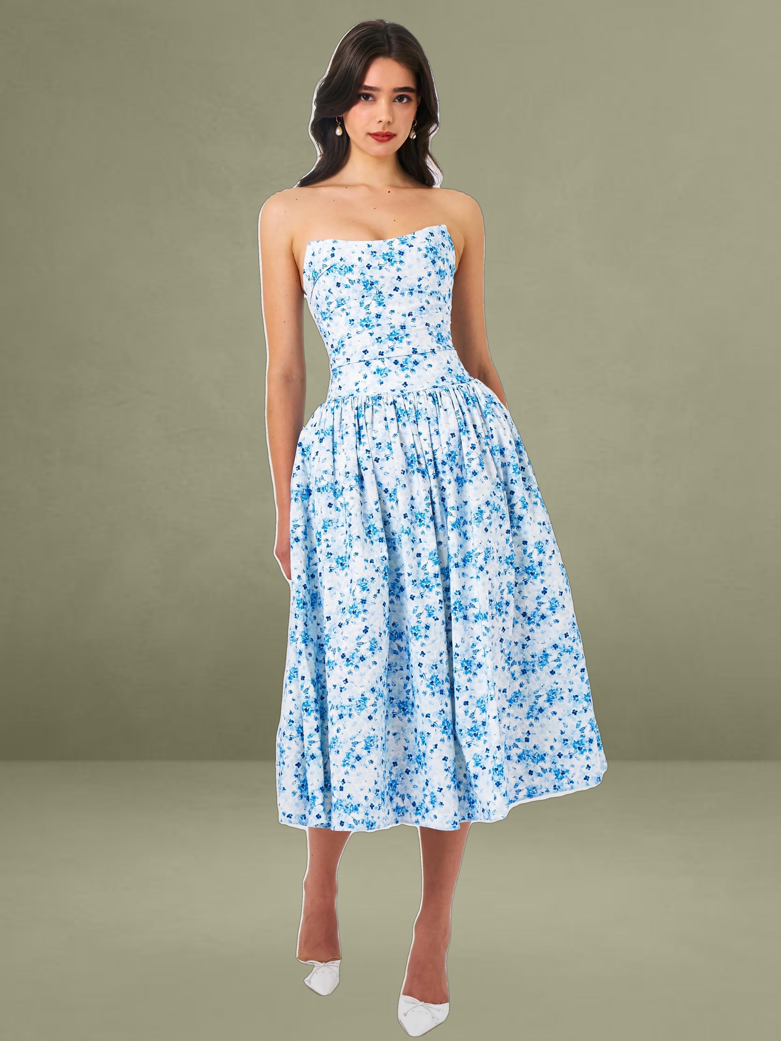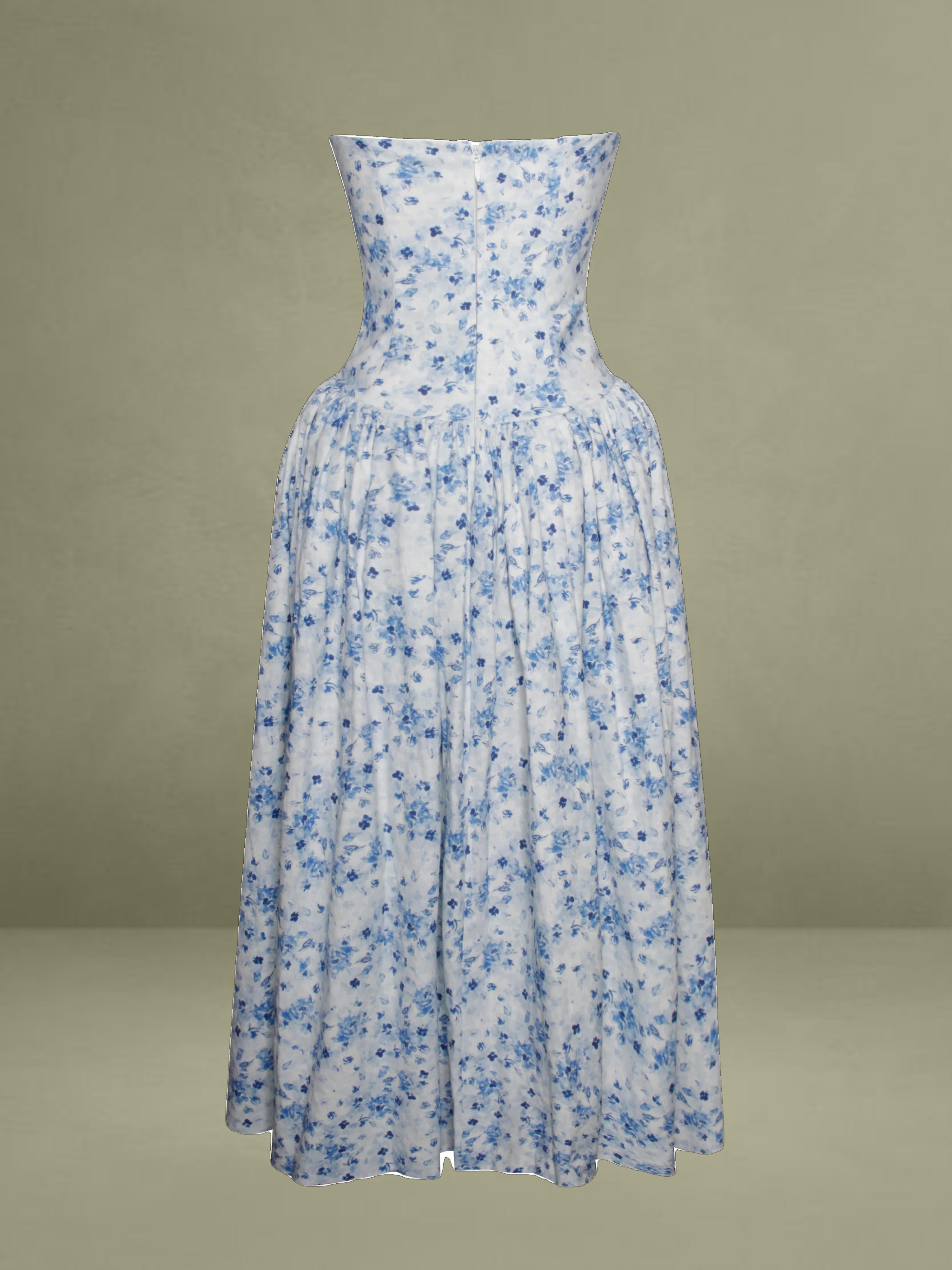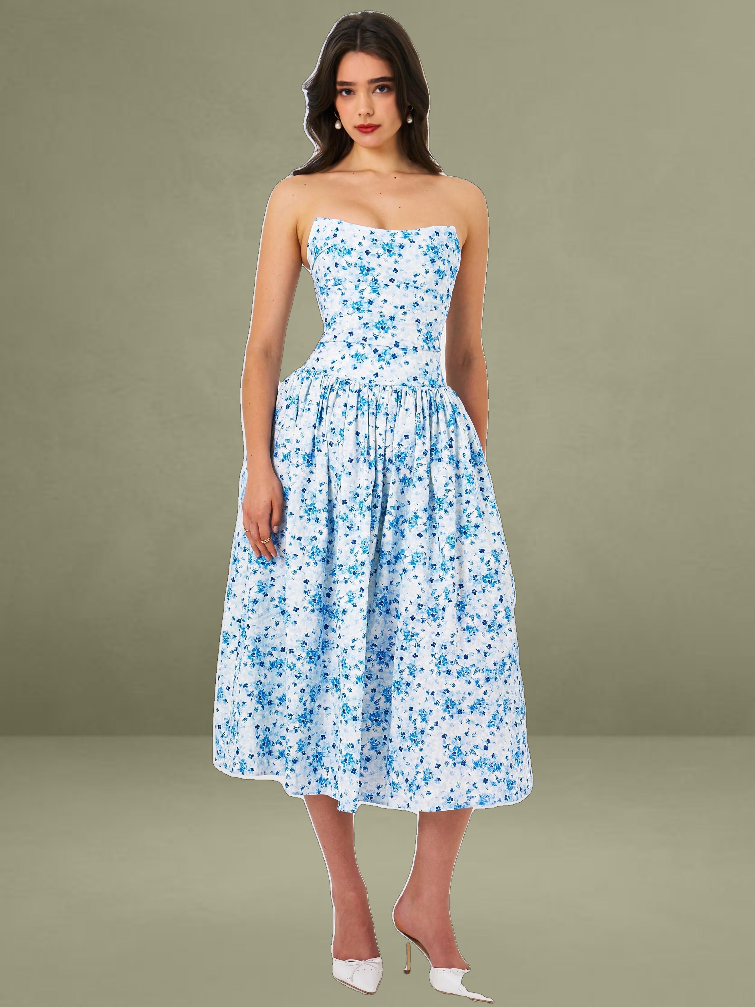 Presenting the Paloma dress, a striking display of effortless sophistication. Crafted with meticulous attention to detail, this midi sundress features a mesmerizing print eco-luxe fabric that captivates with its vibrant allure. The drop waist design adds a contemporary edge, while the draping top exudes timeless elegance. Fully lined and equipped with built-in bones, this dress offers both comfort and structure, ensuring a flawless fit that flatters every curve. Slip into refined style effortlessly, facilitated by the discreet invisible zipper at the middle back, guaranteeing a seamless finish that's as chic as it is captivating.