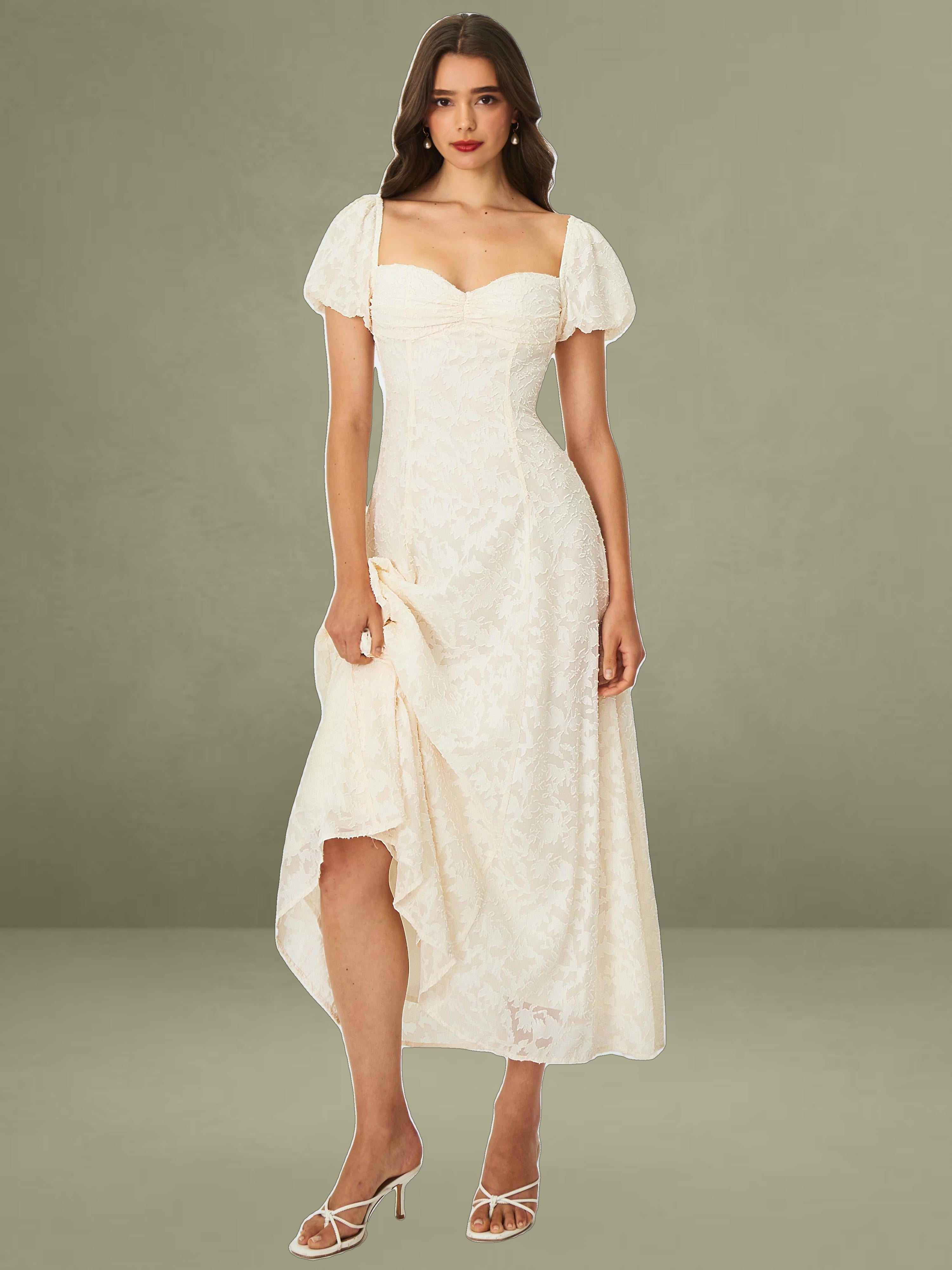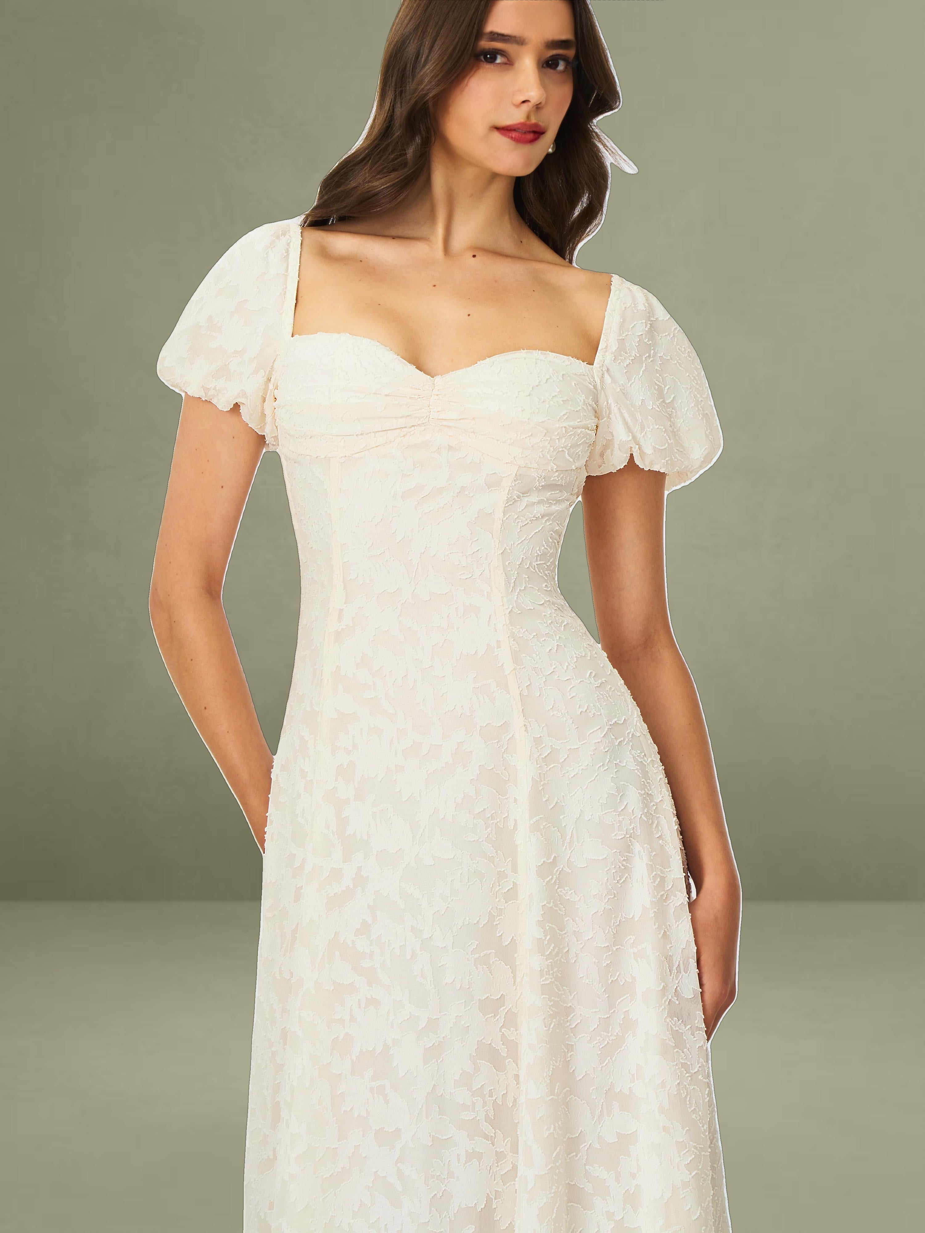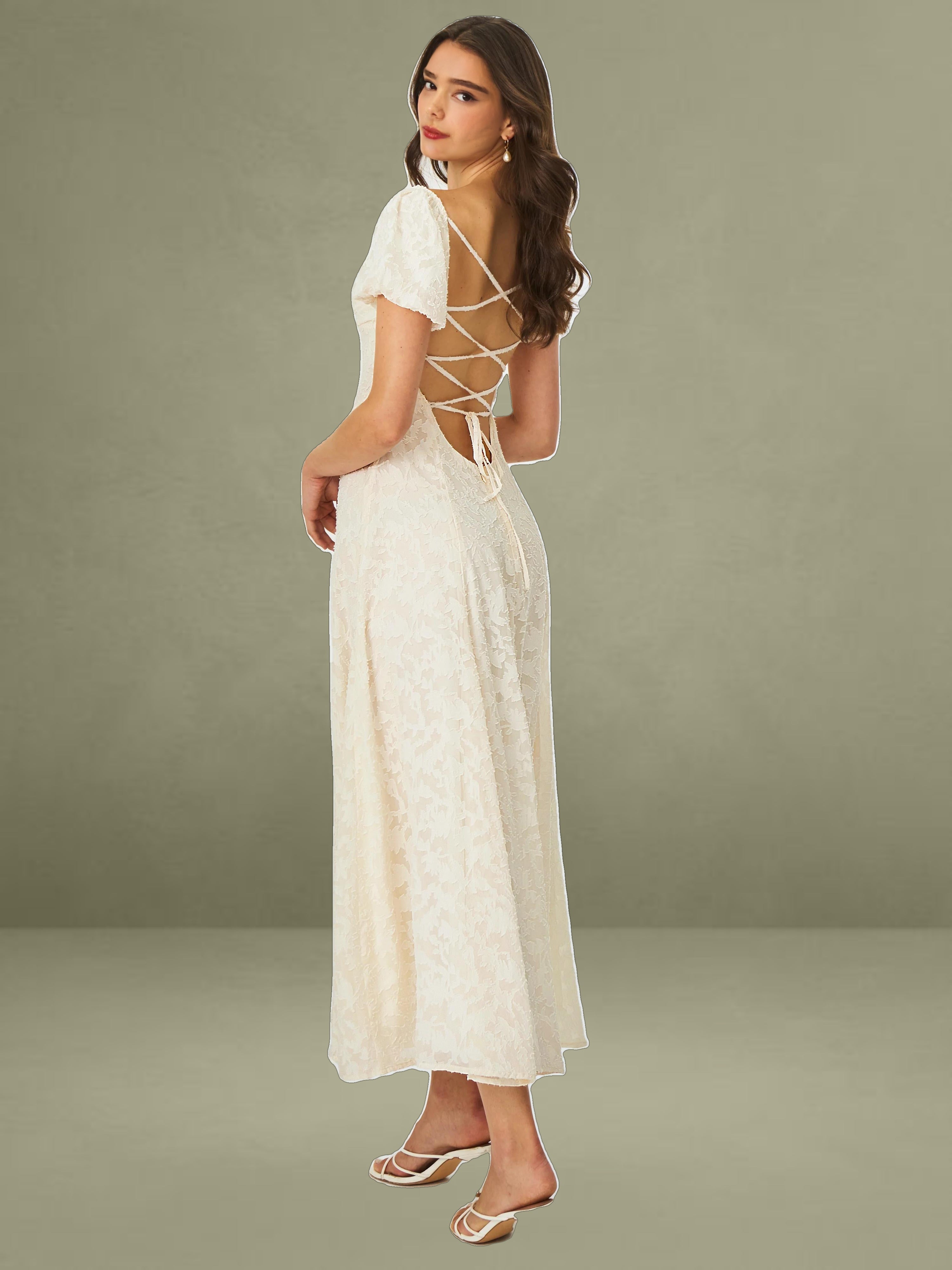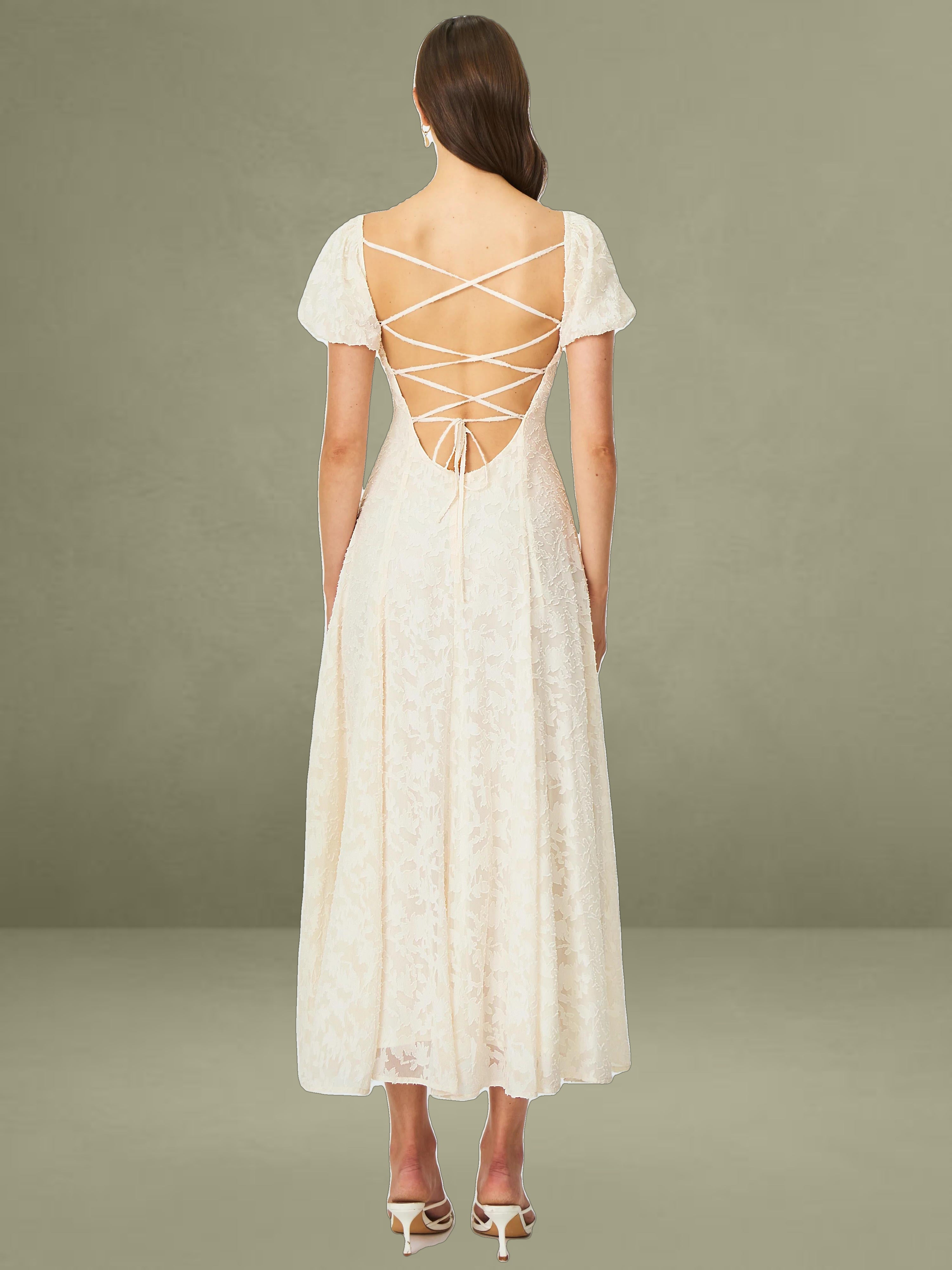 Effortlessly dreamy and beautifully detailed, the Pandora Dress is your go-to for everyday elegance and vacation charm. Made from textured white jacquard fabric, this dress features romantic bubble sleeves, a ruched breast, and a flattering low-waist silhouette. The lace-up back and subtle backless design add a soft allure, while the non-slip strap and full lining ensure all-day comfort. Finished with an invisible zipper for a seamless fit, the Pandora is the perfect blend of casual grace and whimsical sophistication.