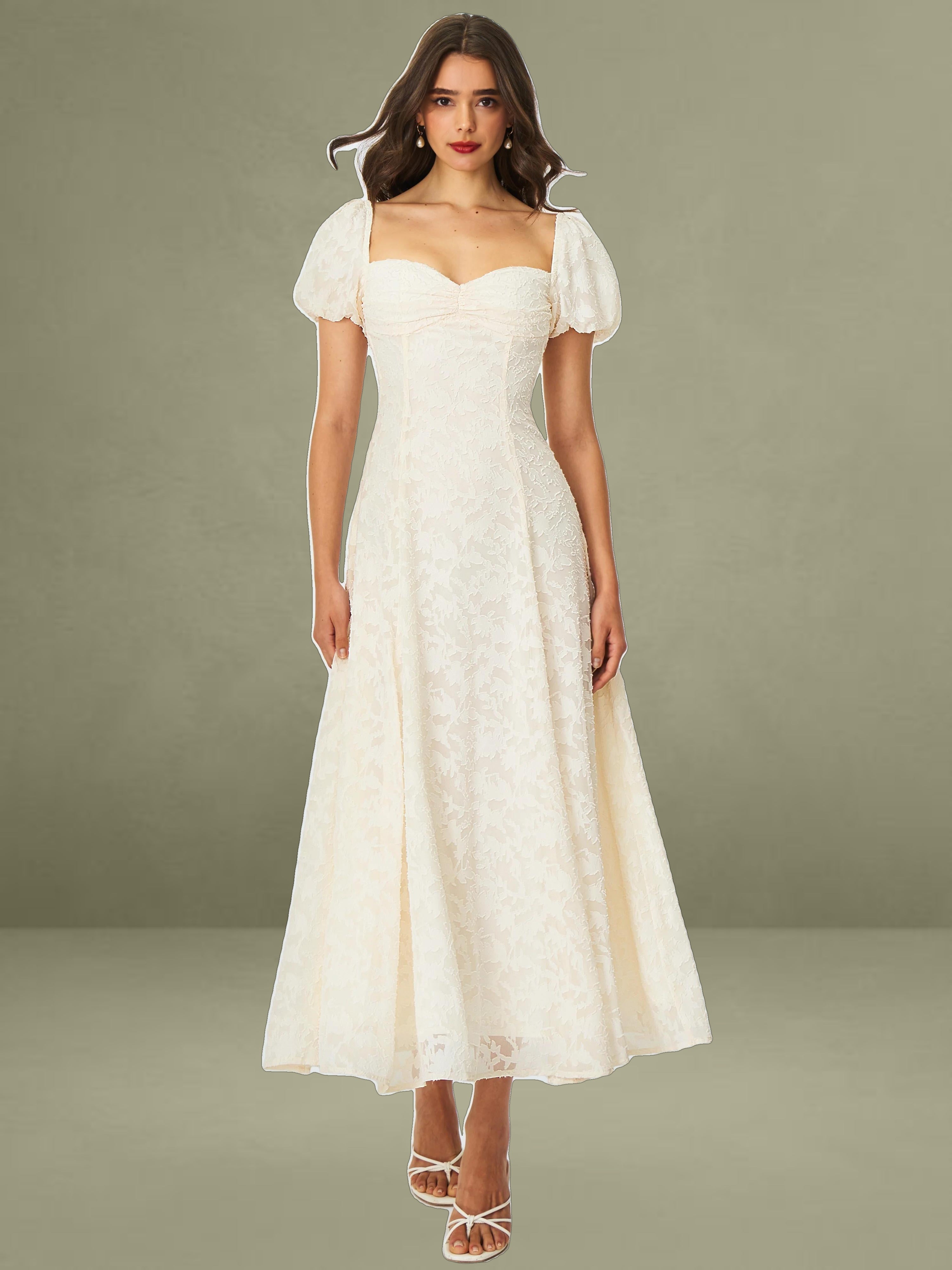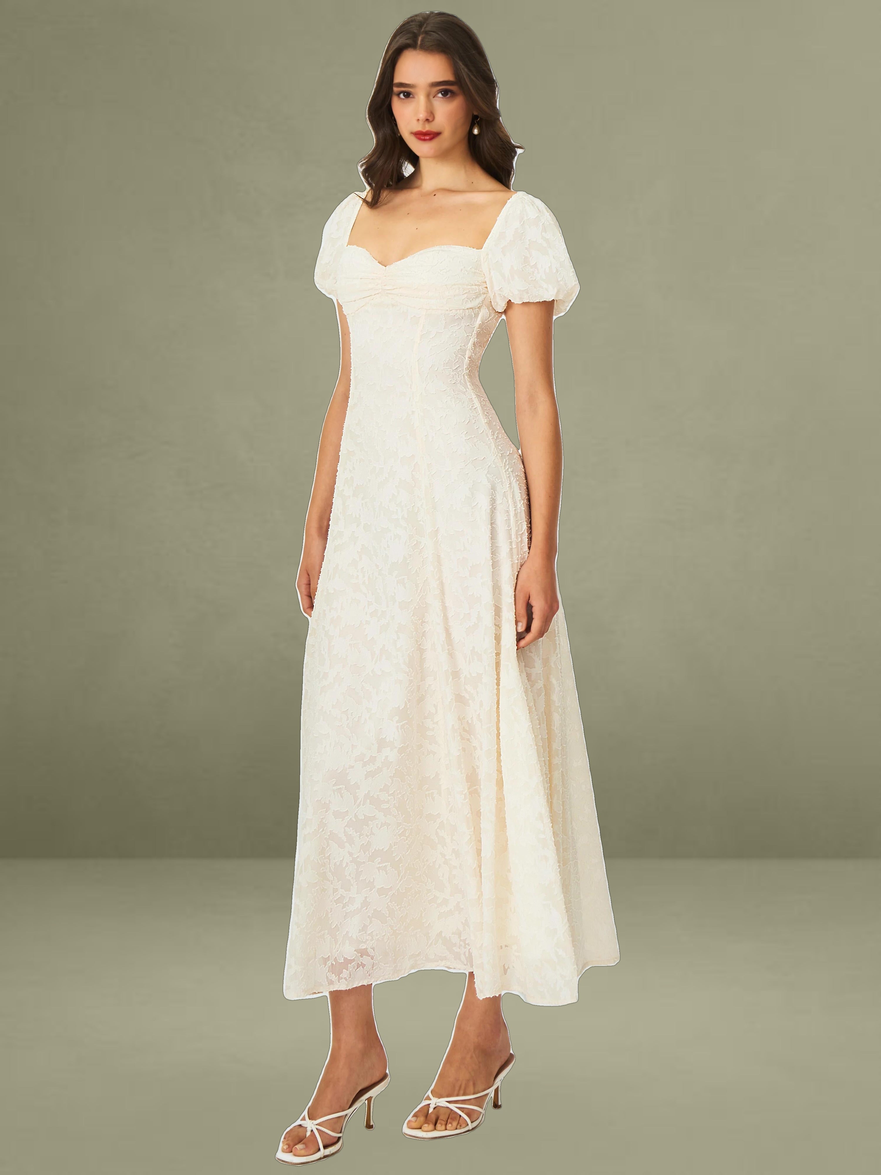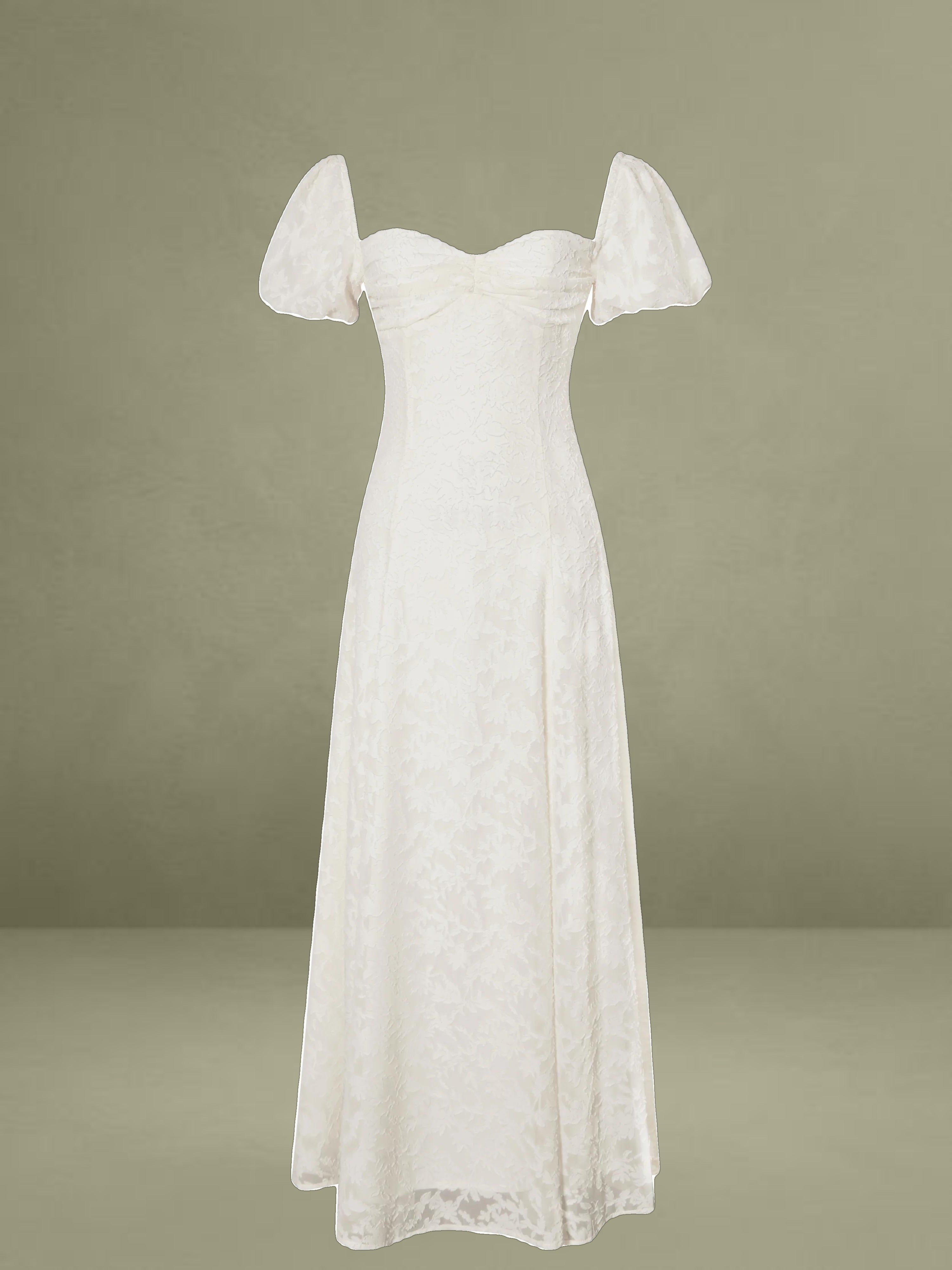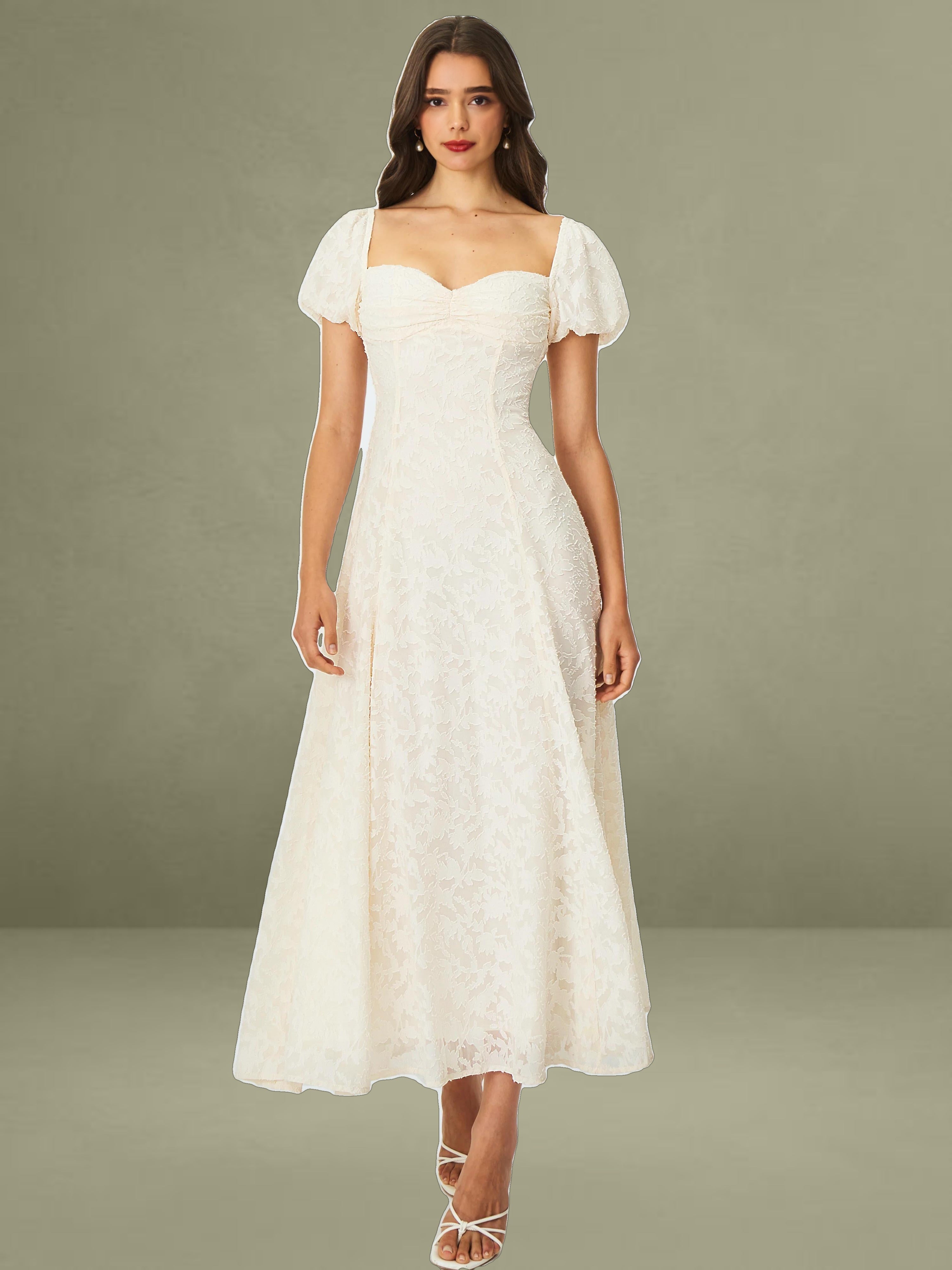 Effortlessly dreamy and beautifully detailed, the Pandora Dress is your go-to for everyday elegance and vacation charm. Made from textured white jacquard fabric, this dress features romantic bubble sleeves, a ruched breast, and a flattering low-waist silhouette. The lace-up back and subtle backless design add a soft allure, while the non-slip strap and full lining ensure all-day comfort. Finished with an invisible zipper for a seamless fit, the Pandora is the perfect blend of casual grace and whimsical sophistication.