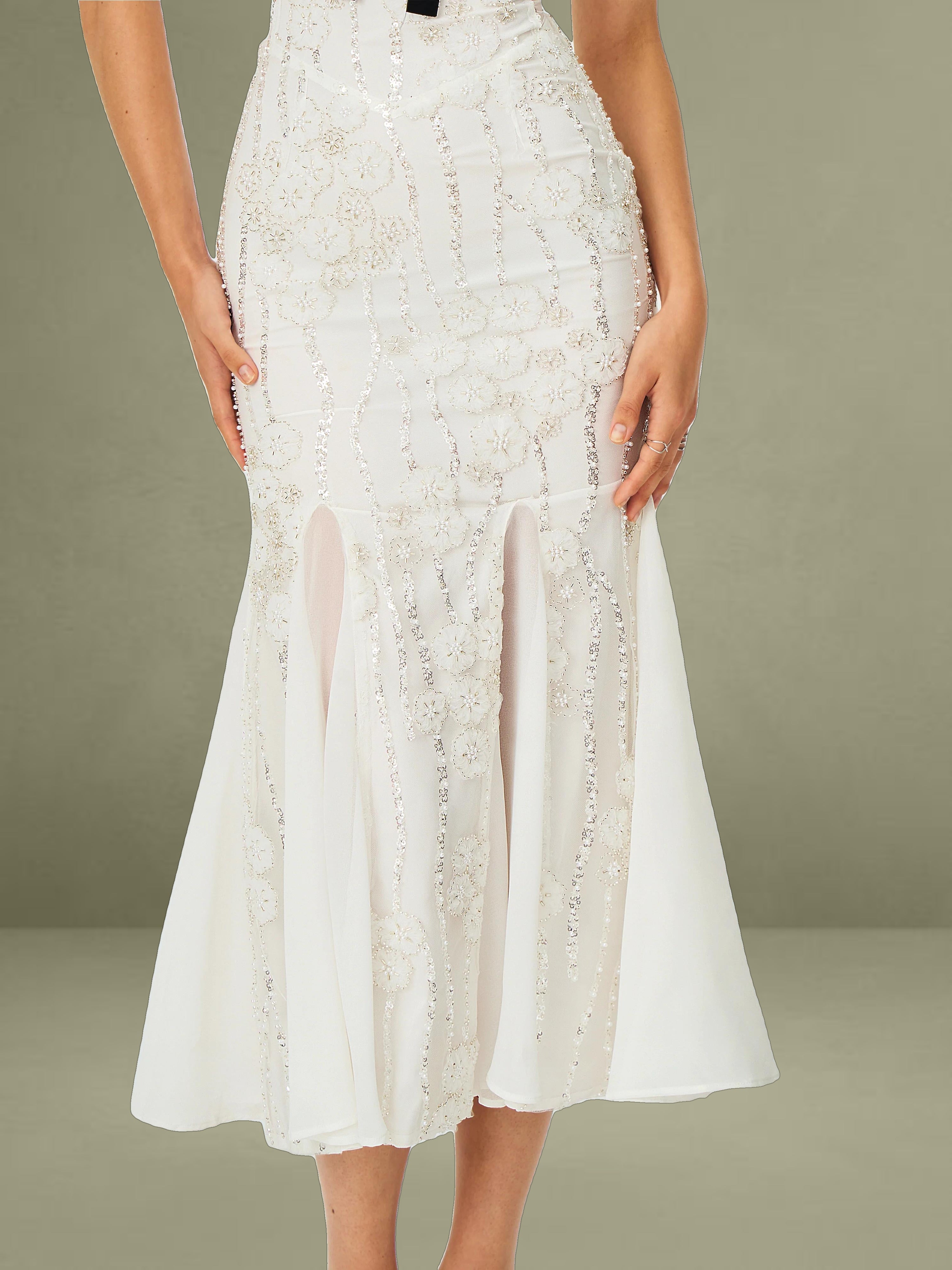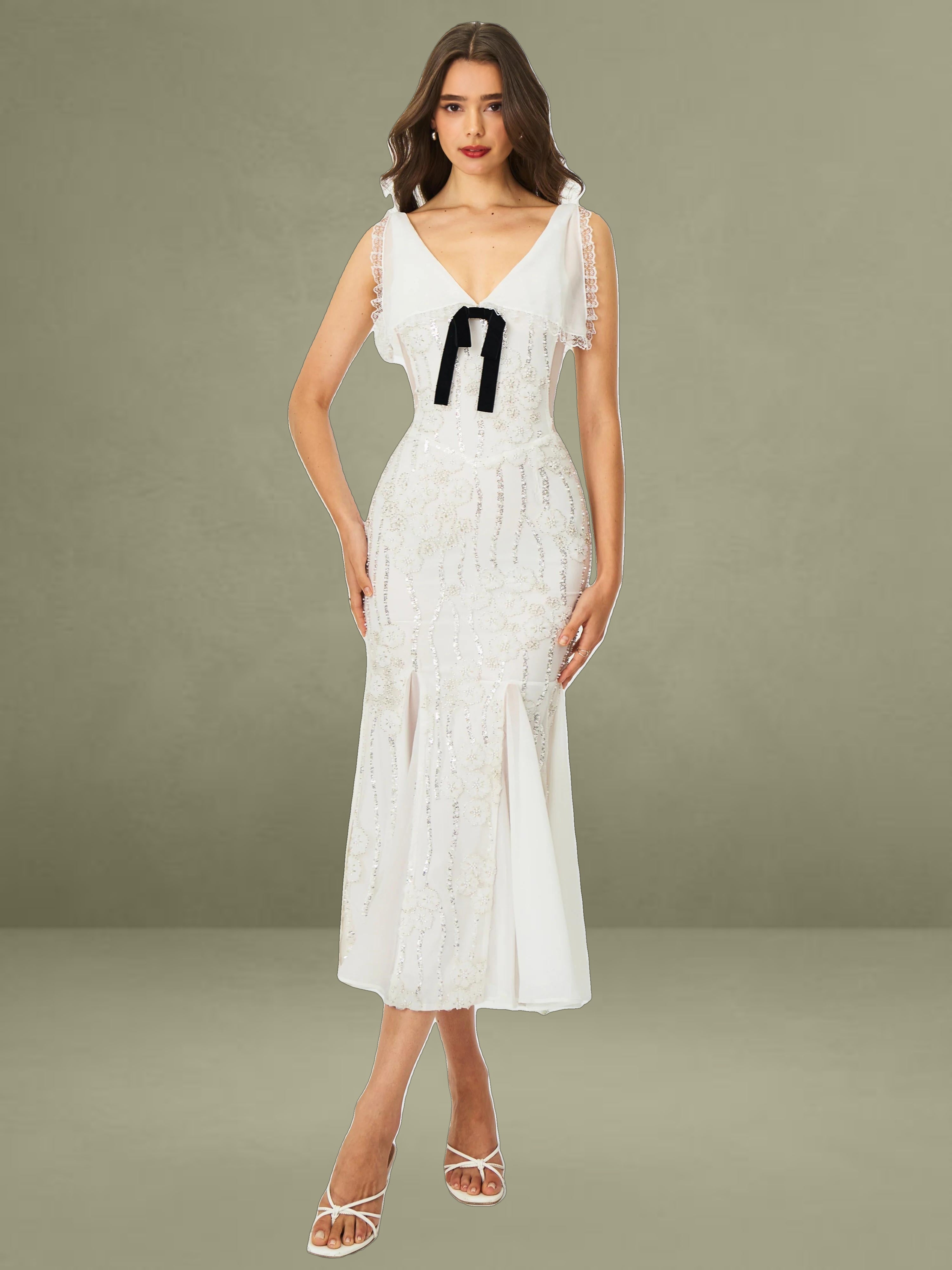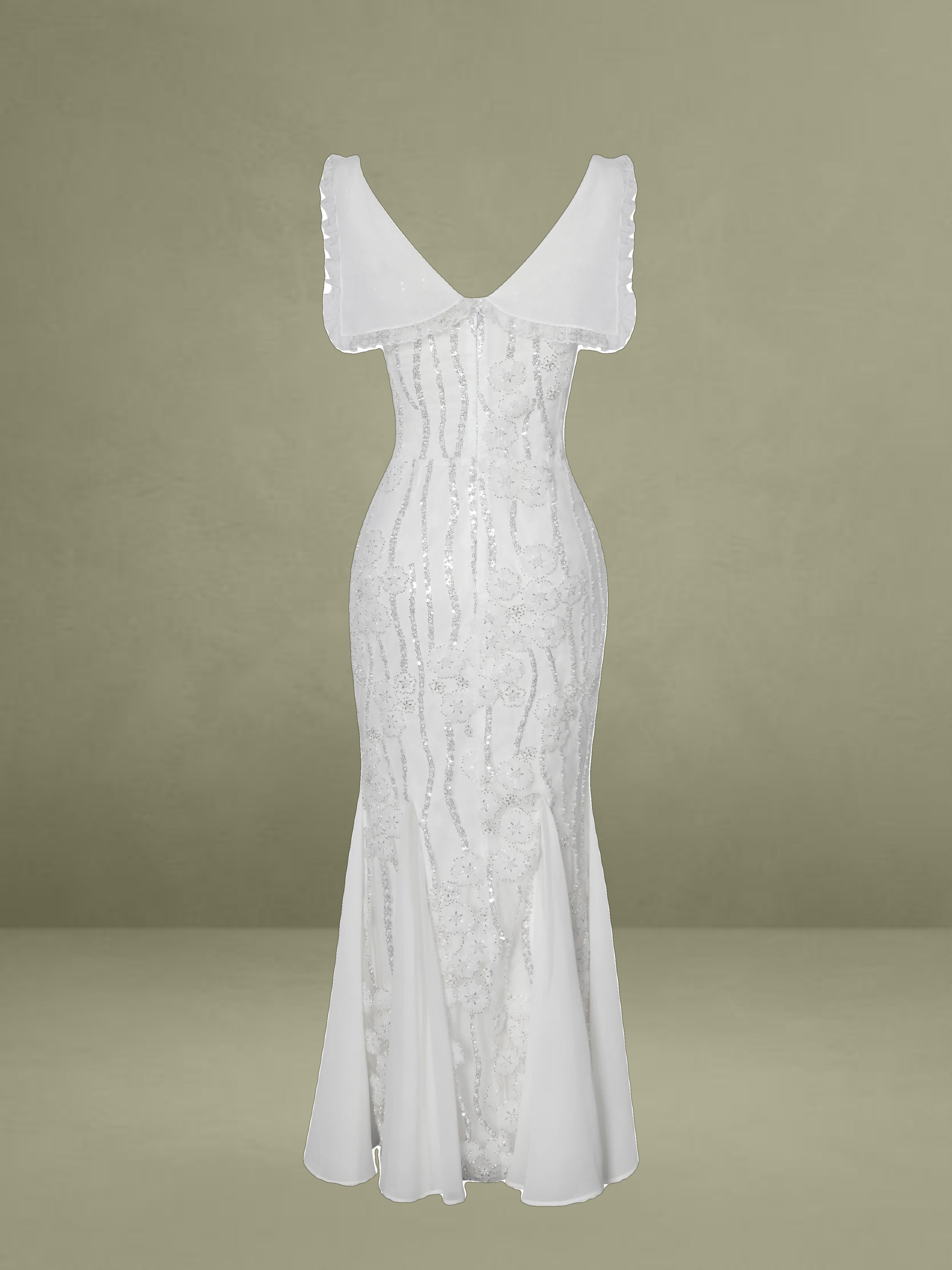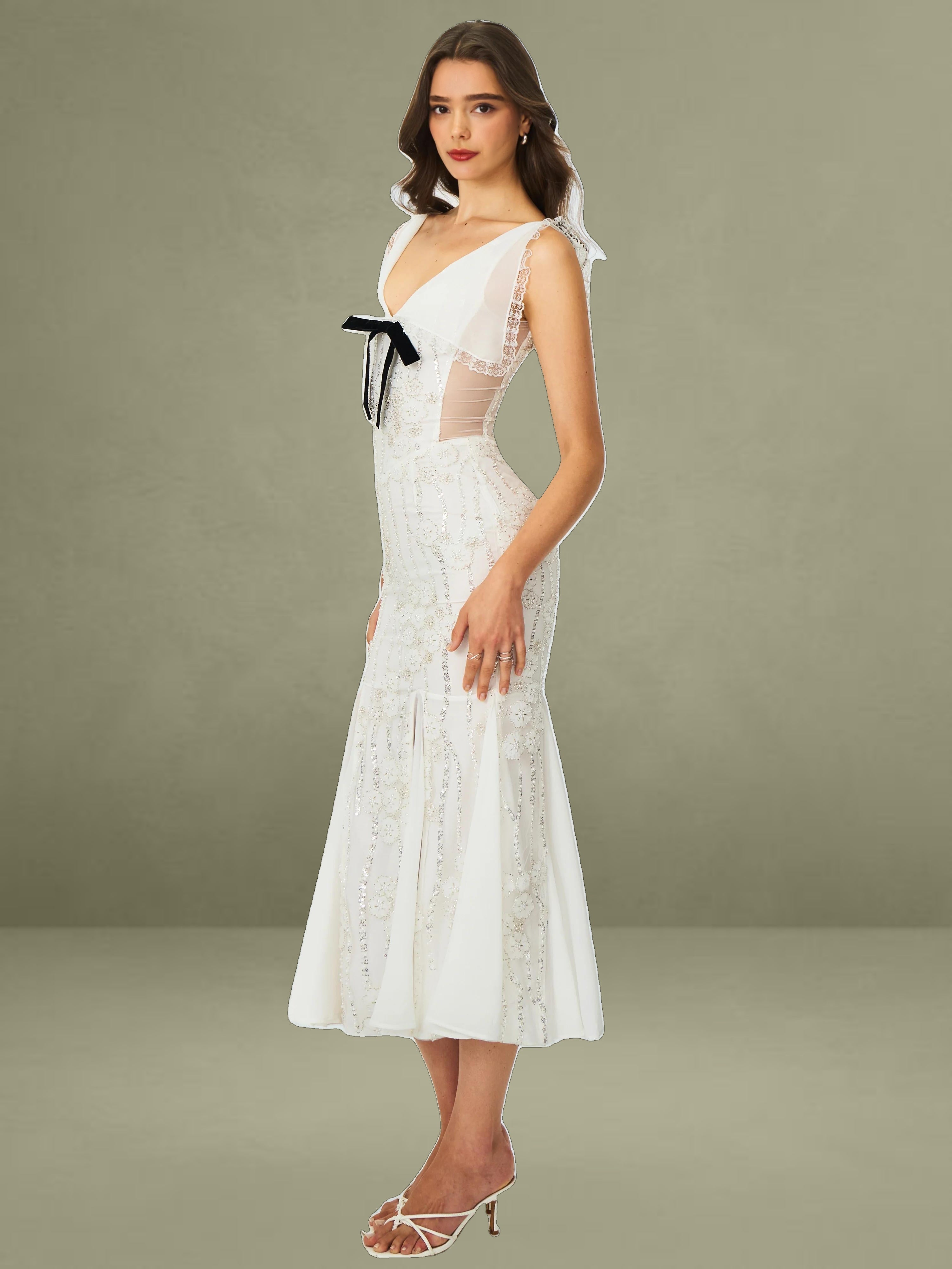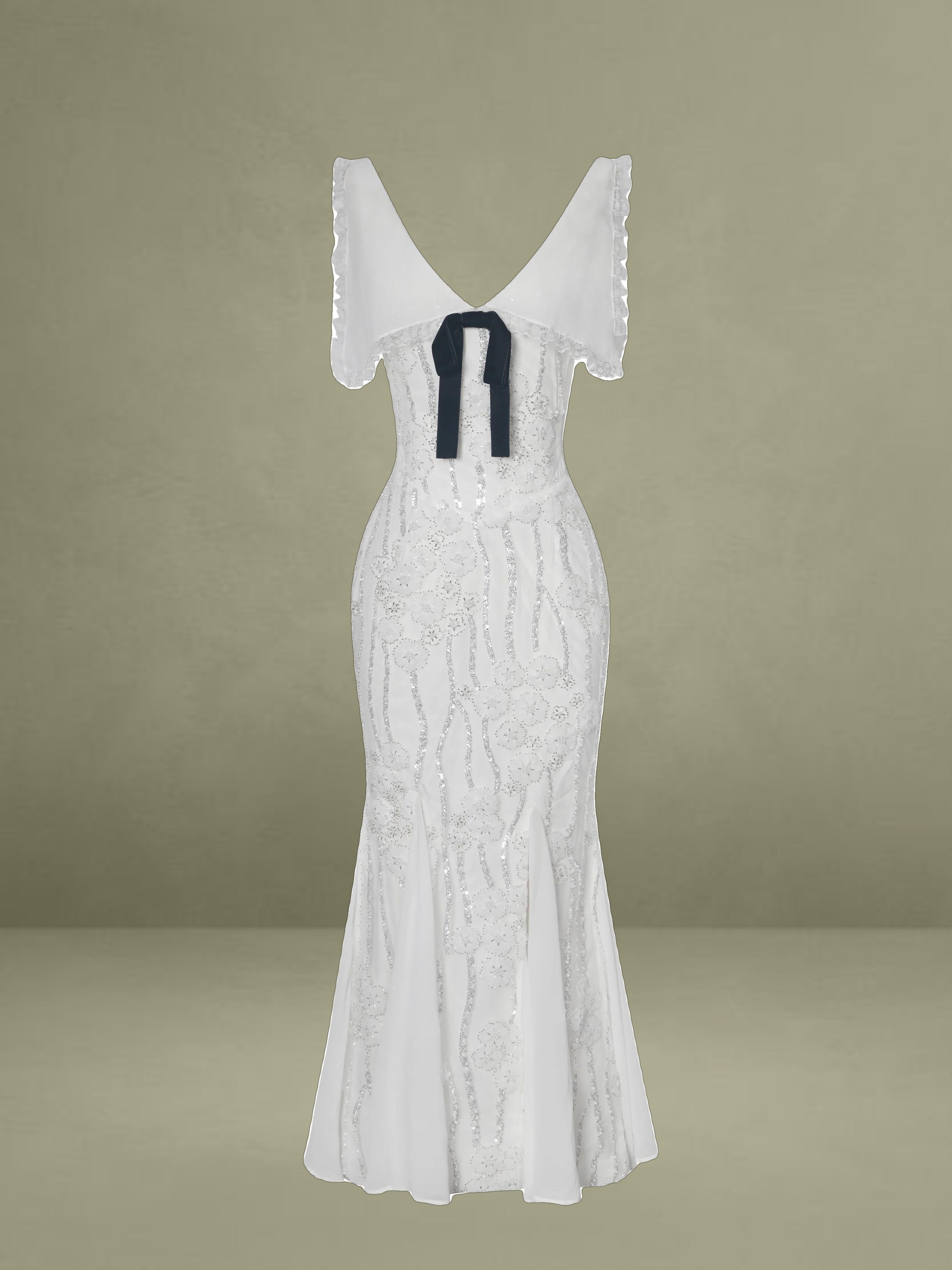 Introducing the Paola Dress, a standout white gown that effortlessly blends elegant details with youthful charm. Its triangular Peter Pan collar, accented by a black velvet ribbon nestled in the V-neck, creates a striking focal point, while delicate lace trims the edges and elevates the design. Graceful godets add sweeping movement, complemented by shimmering sequins and beaded embellishments that highlight its exquisite craftsmanship. With a soft, romantic mermaid silhouette balanced by a lively summer spirit, this fully lined dress features a back zipper closure for a flawless fit. Perfect for elegant brunches, afternoon teas, and leisurely weekend celebrations.