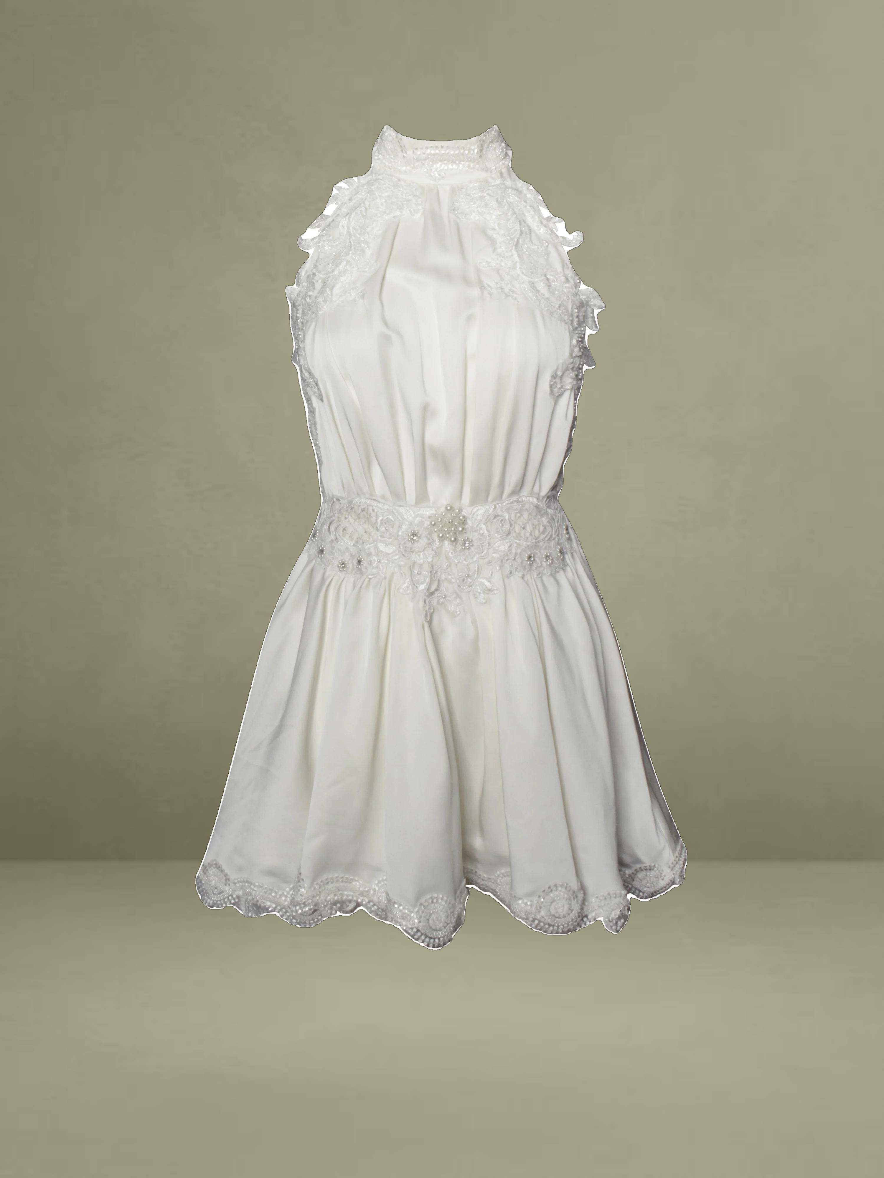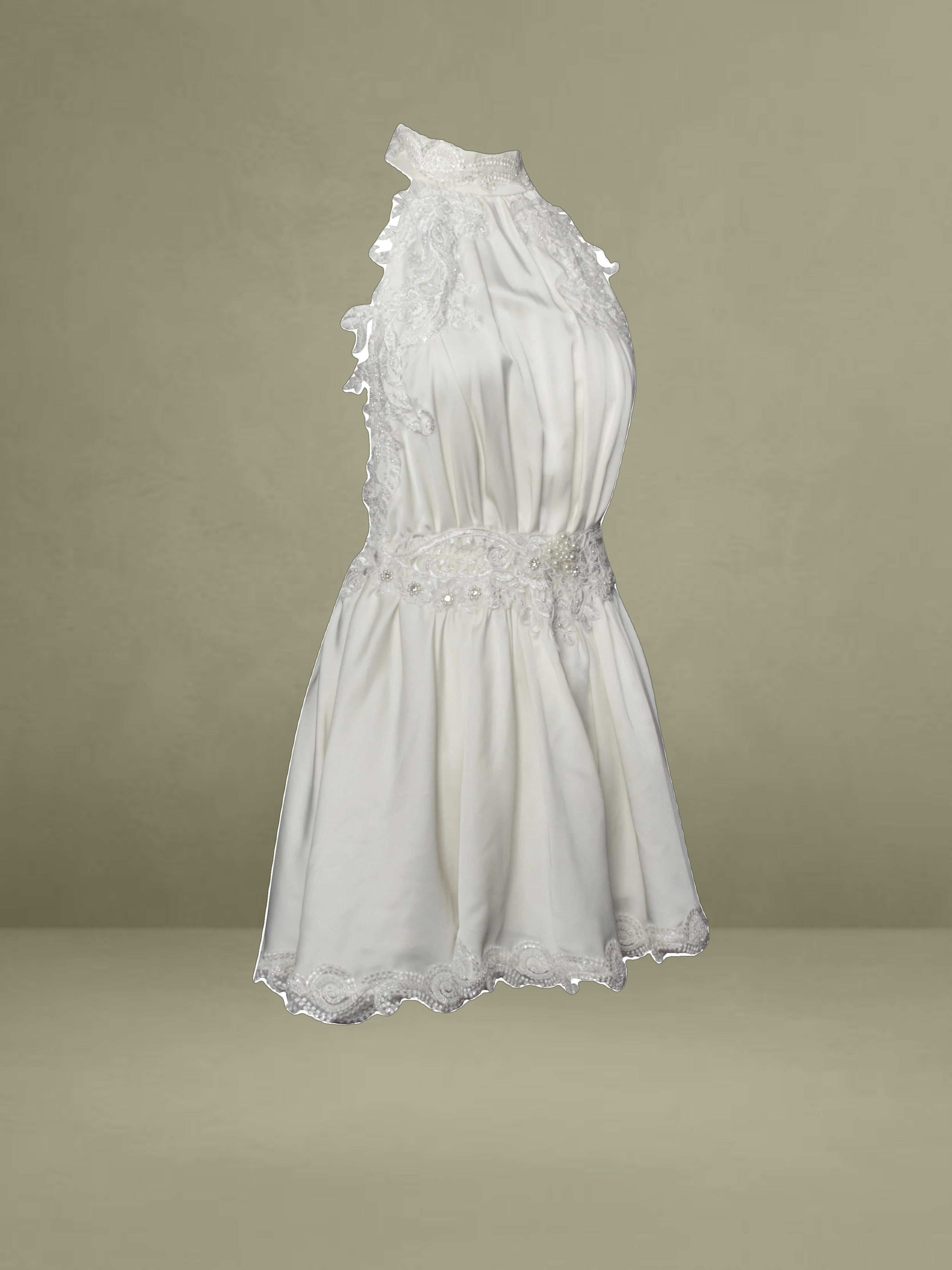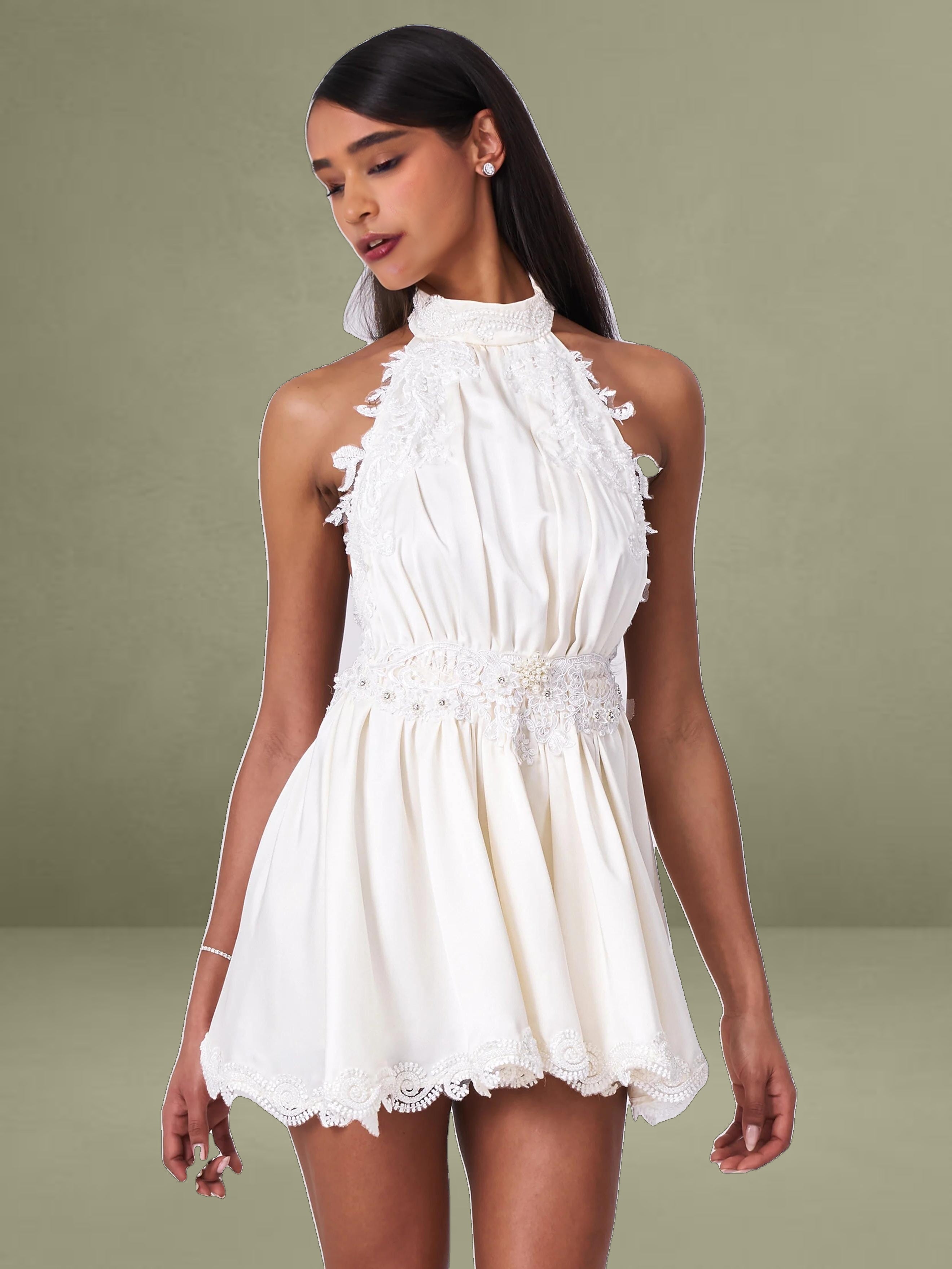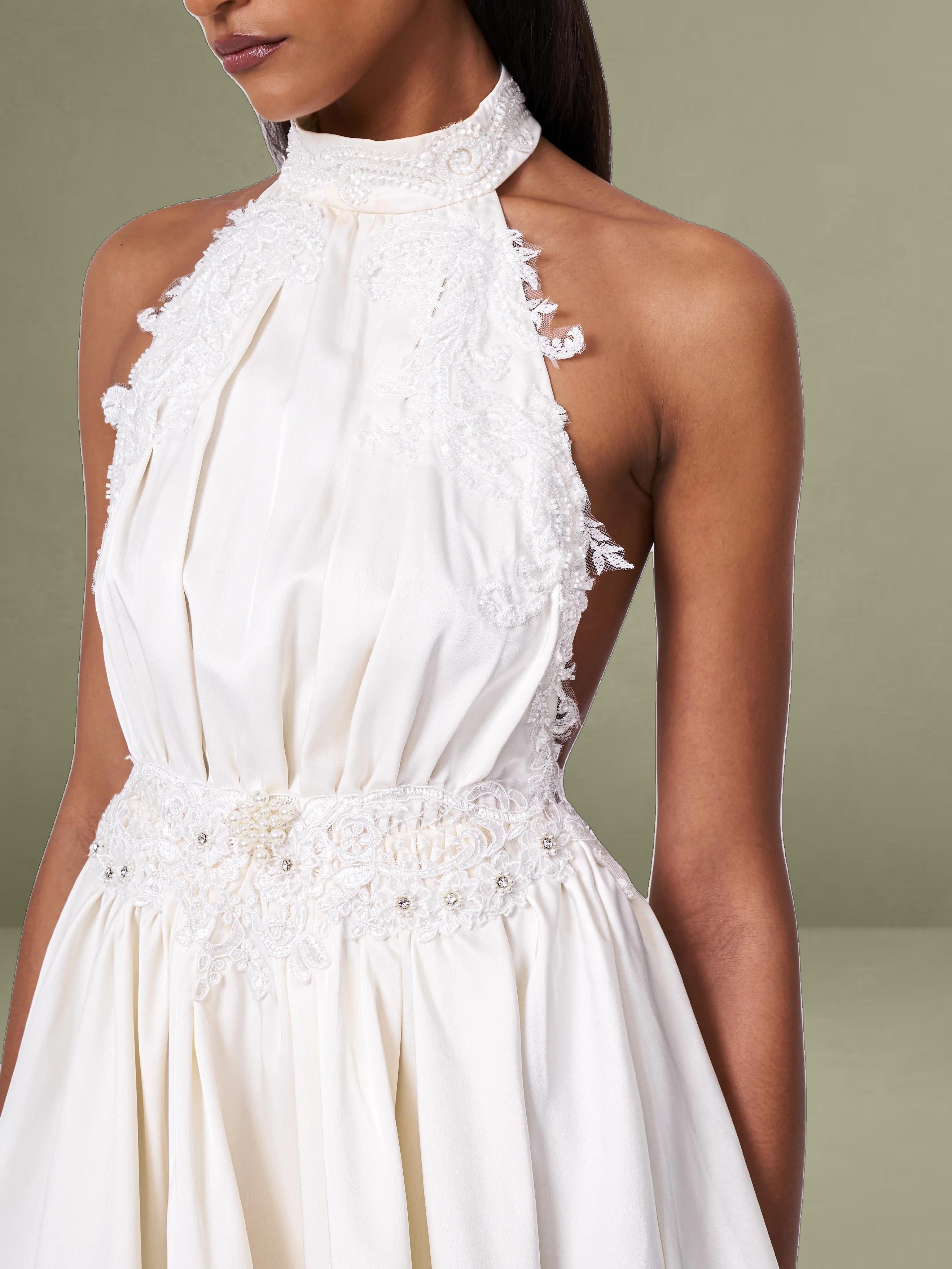 Embrace elegance with this timeless dress, perfect for weddings, engagements, formal events, or summer parties. Made from luxurious silky fabric in a radiant pearl white color, it features a sophisticated halter neck and an alluring backless design, ideal for making an impression. The ruched front adds a flattering effect, while the delicate beaded lace trim and trimmed skirt bring a touch of romantic charm. With a stylish mid-waist silhouette, fully lined interior, and an invisible zipper for a seamless look, this dress is great for dancing all night or celebrating a special birthday in style.