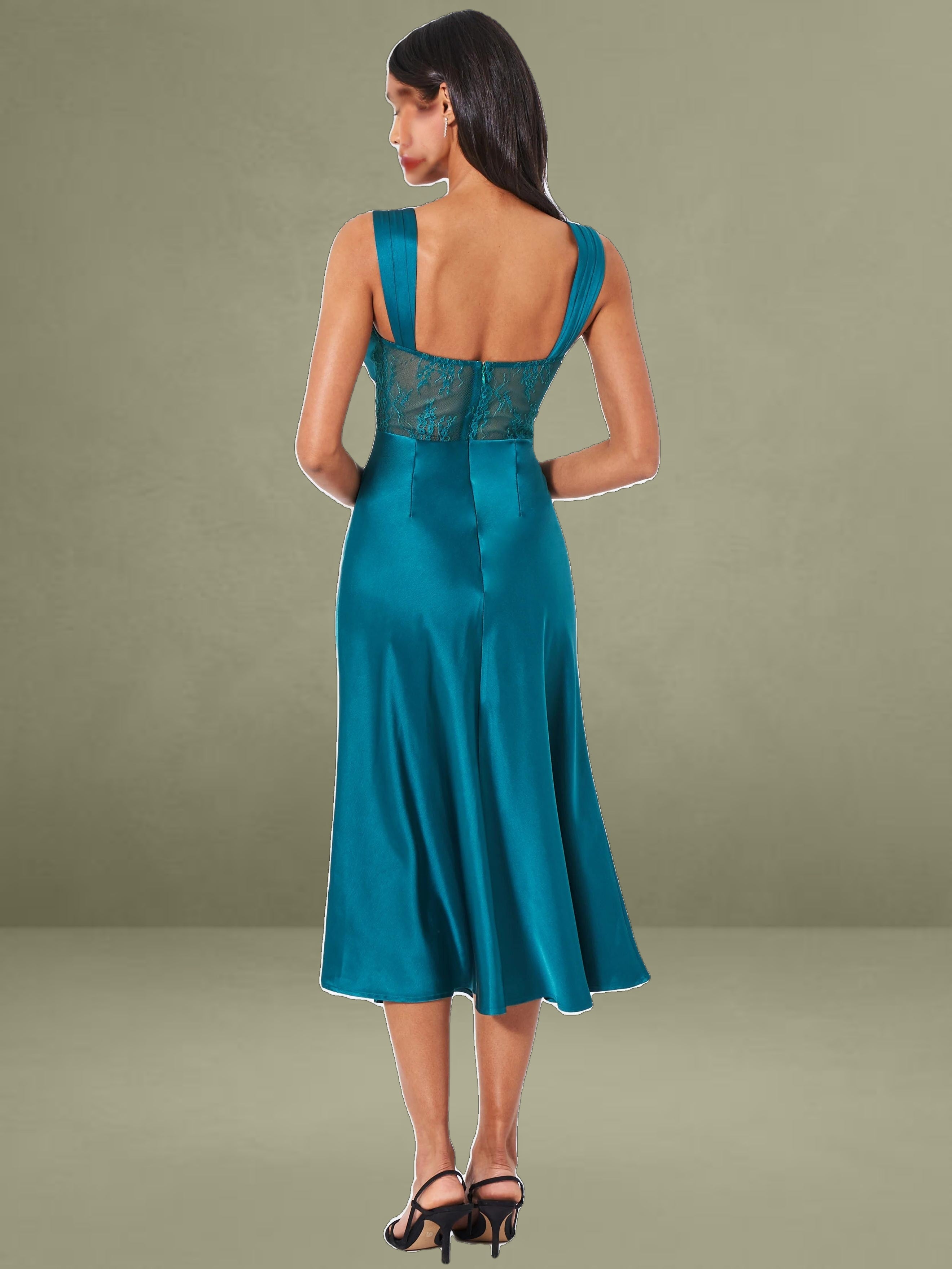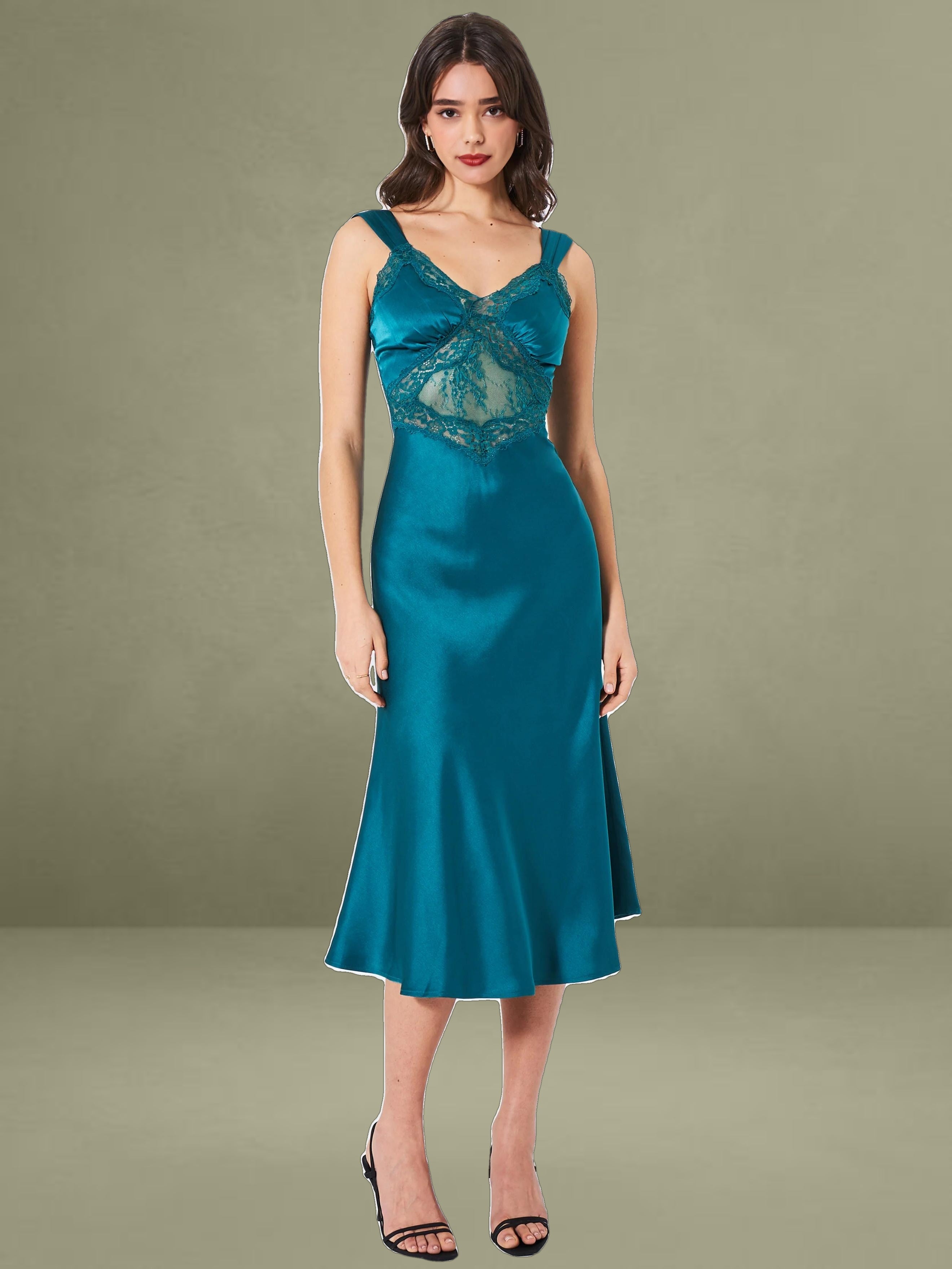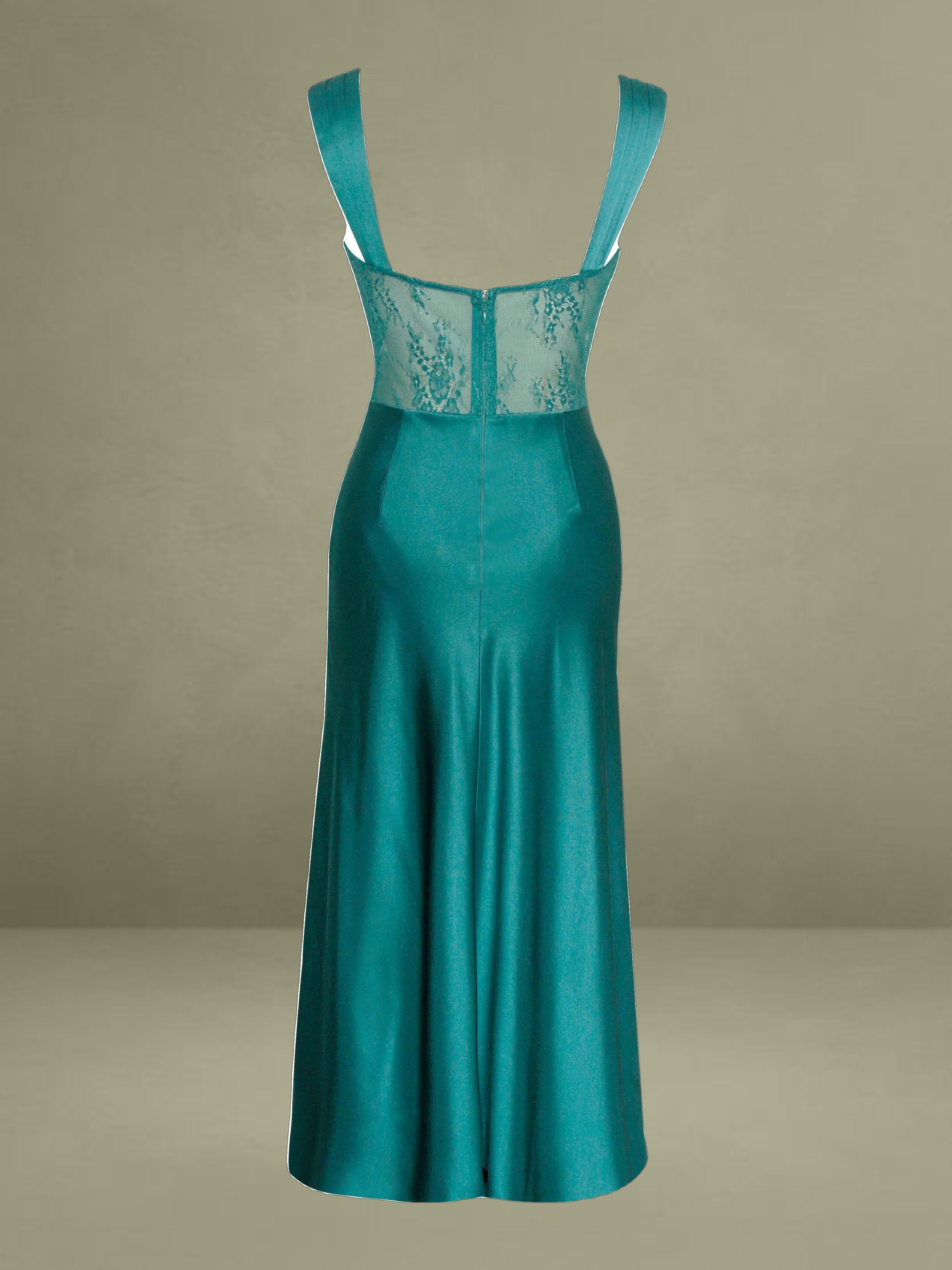 Say hello to our newest Perley, the perfect shade of teal satin and lace midi slip dress of your dreams! This elegant piece boasts a slightly flared mermaid silhouette, with ruched satin straps that can be worn on or off the shoulder. The bodice features a flattering fit with ruched cups, and a sheer lace diamond-shaped panel at the center front. Intricate black lace trimming runs throughout the front of the bodice for an added touch of sophistication. The back showcases sheer lace panels at the back waist, adding a touch of allure. Unlined at the skirt and bodice, this dress is crafted from luxe double duchess satin and adorned with intricate lace details. Perfect for black-tie affairs, a stroll in the park, dinner parties, or a night on the town. The Perley is available exclusively in teal and also available in a black maxi version.
