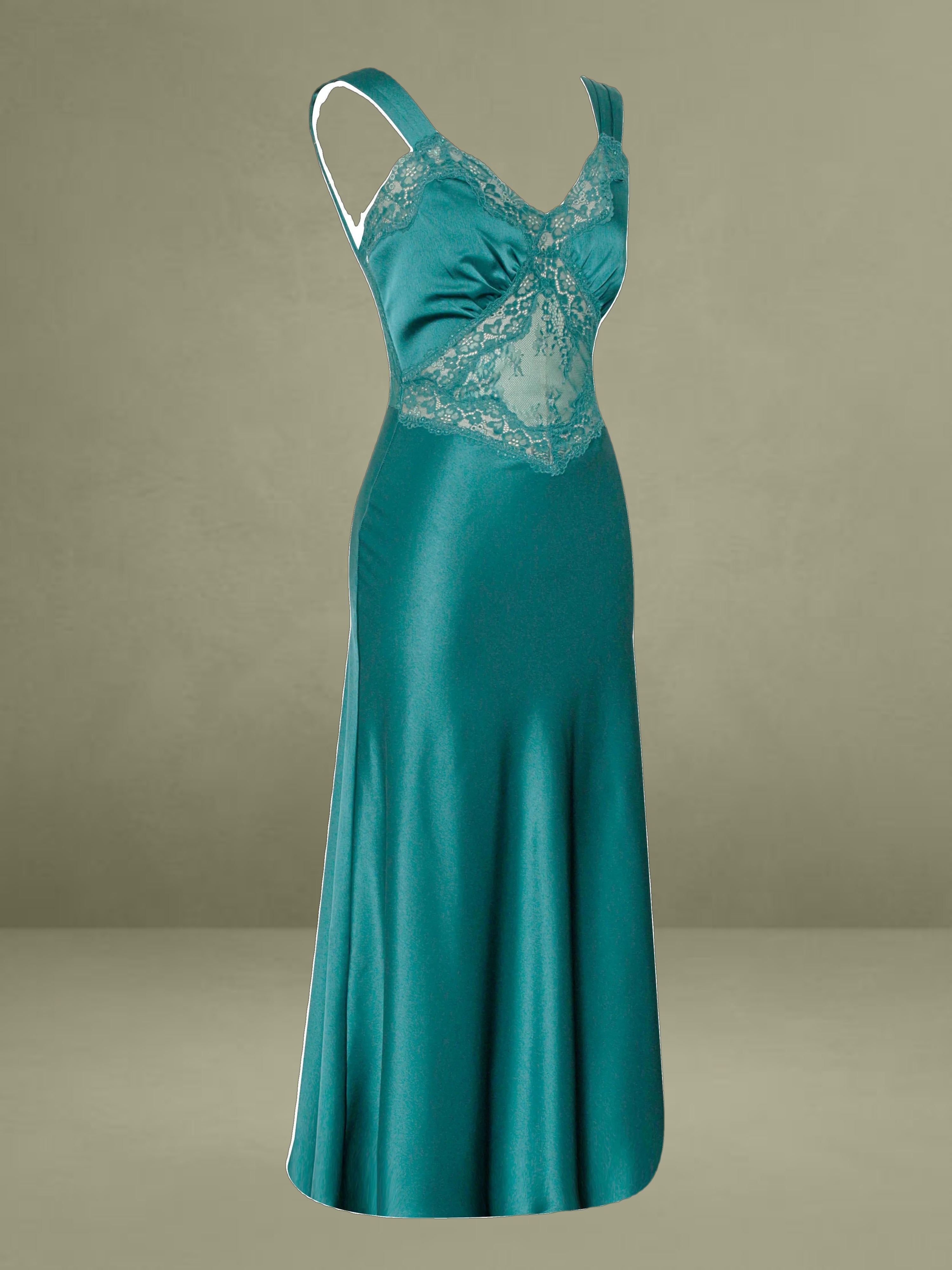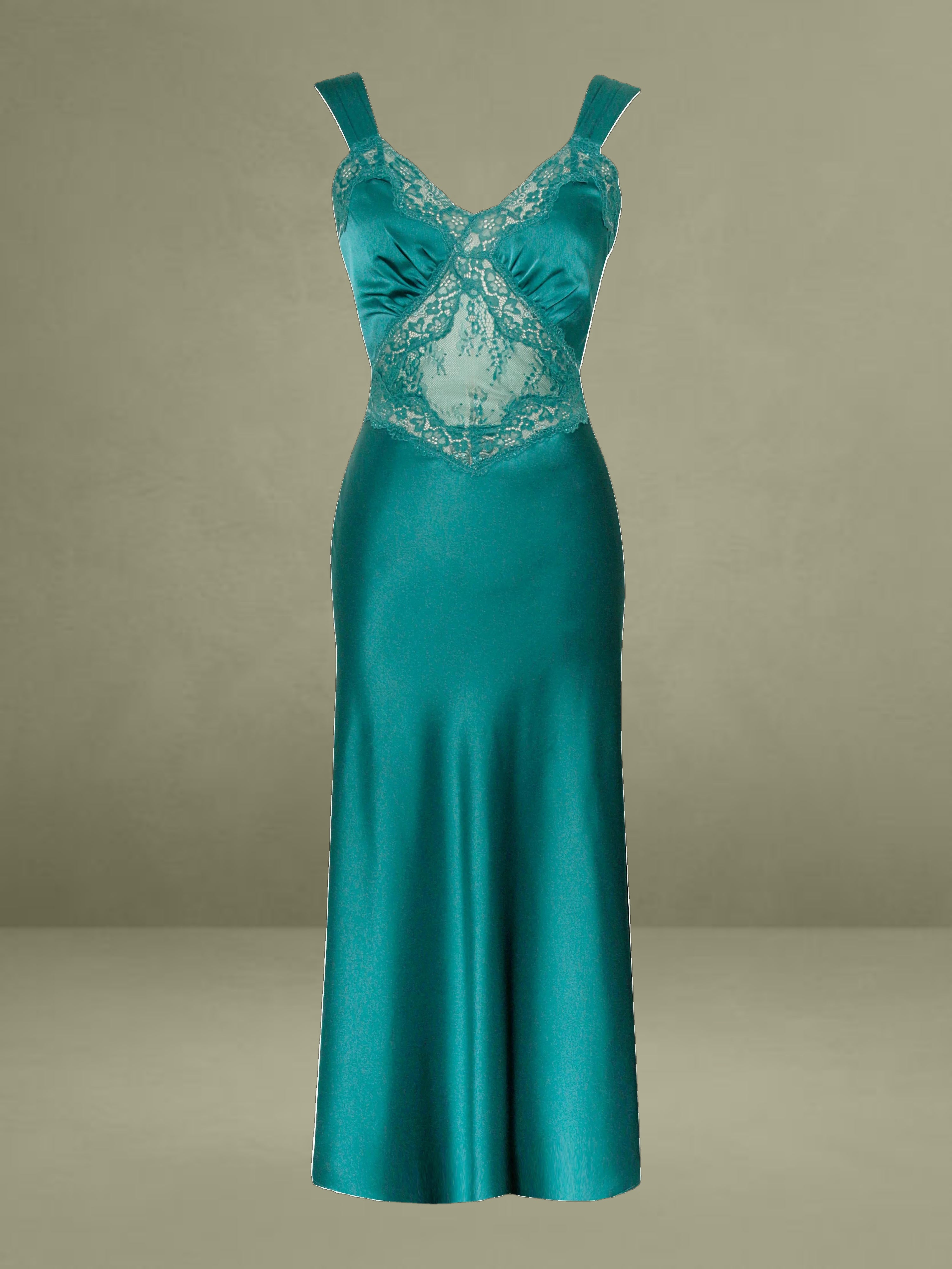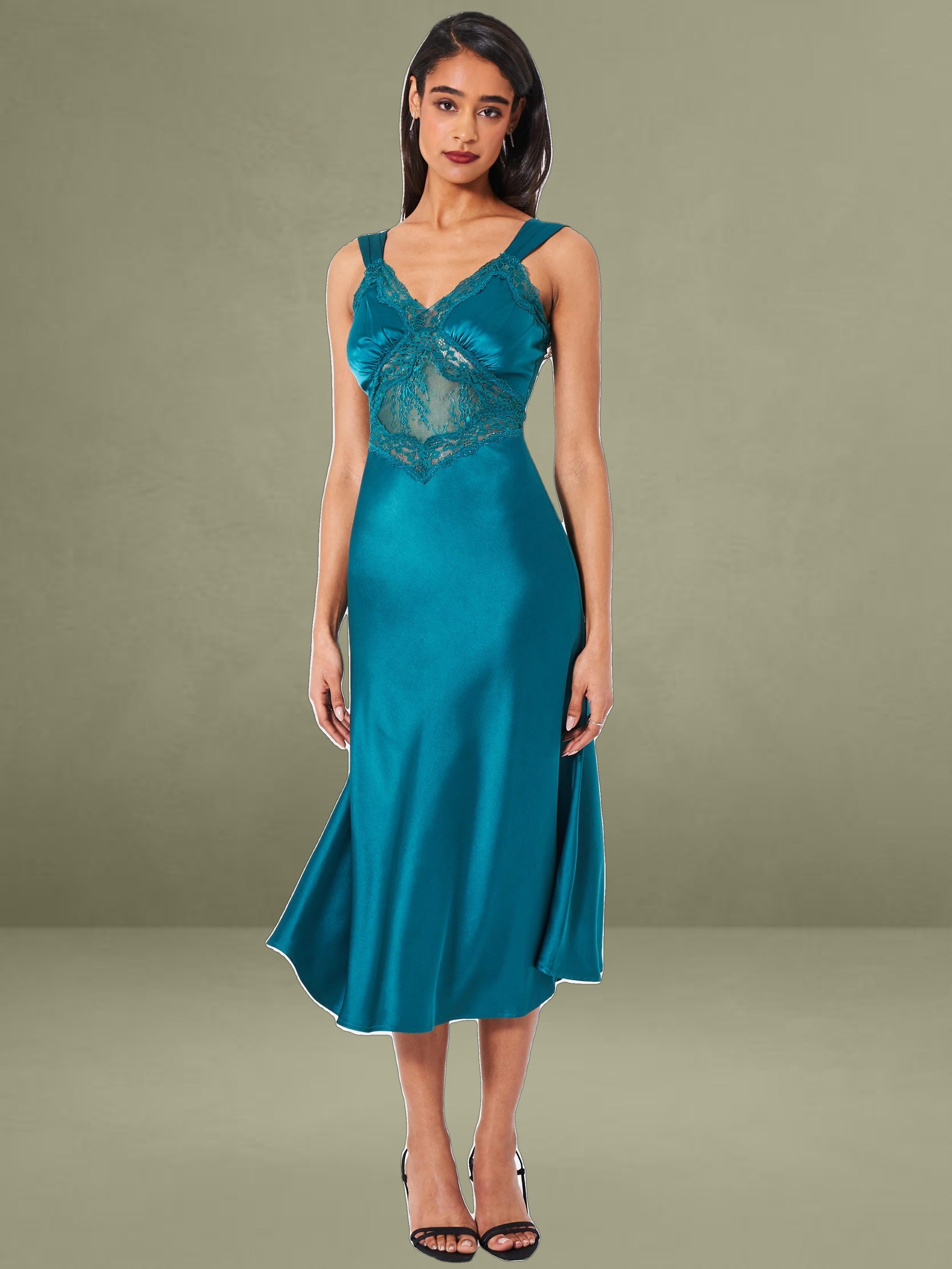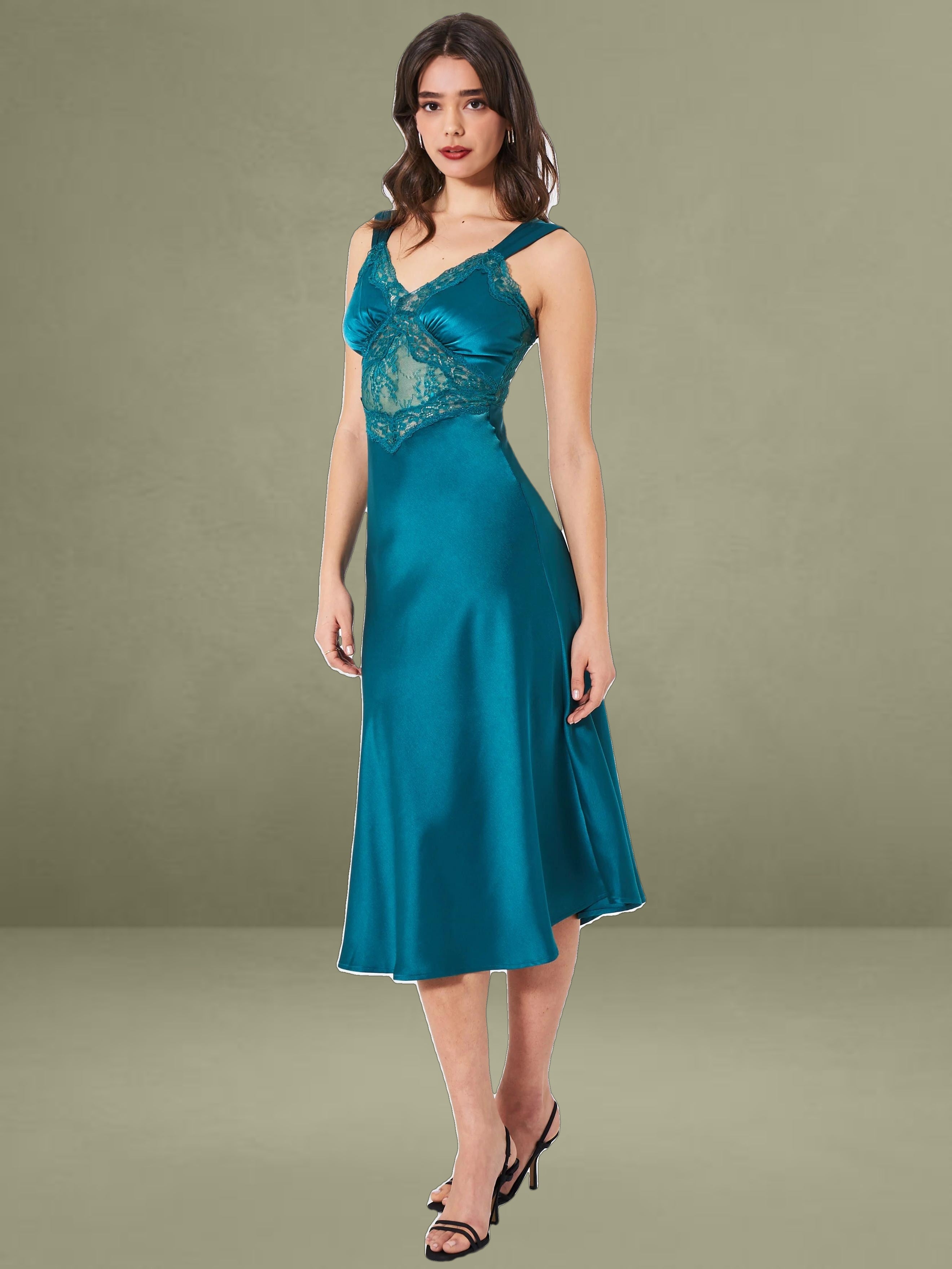 Say hello to our newest Perley, the perfect shade of teal satin and lace midi slip dress of your dreams! This elegant piece boasts a slightly flared mermaid silhouette, with ruched satin straps that can be worn on or off the shoulder. The bodice features a flattering fit with ruched cups, and a sheer lace diamond-shaped panel at the center front. Intricate black lace trimming runs throughout the front of the bodice for an added touch of sophistication. The back showcases sheer lace panels at the back waist, adding a touch of allure. Unlined at the skirt and bodice, this dress is crafted from luxe double duchess satin and adorned with intricate lace details. Perfect for black-tie affairs, a stroll in the park, dinner parties, or a night on the town. The Perley is available exclusively in teal and also available in a black maxi version.