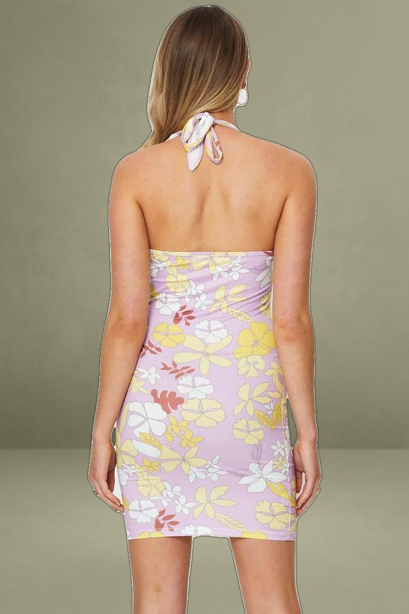 Features: Halter Neck, Mini Length, Retro Floral Print, Bust Detail