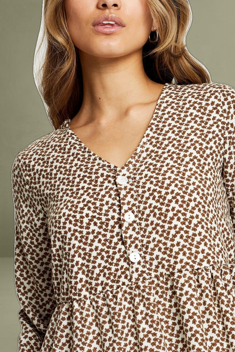 Features: Floral Print, Button Down Bodice, Ballon Sleeves, Ruffle Hem