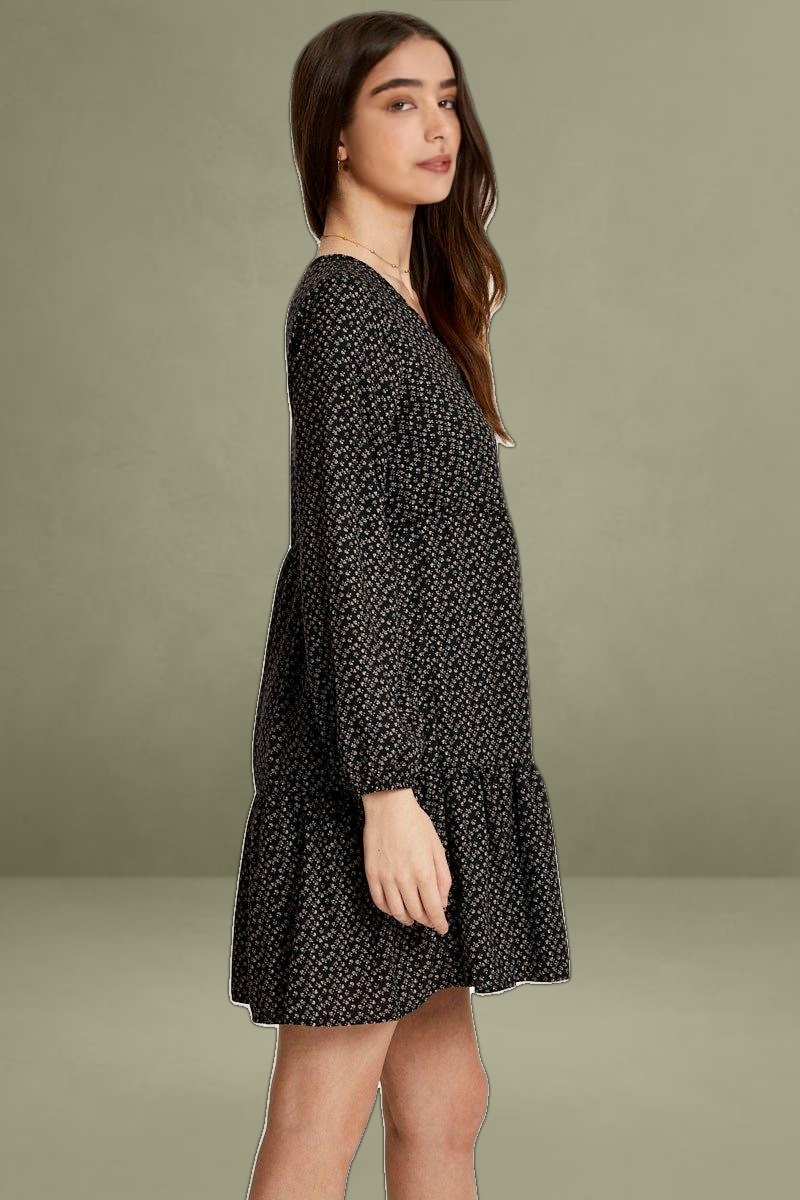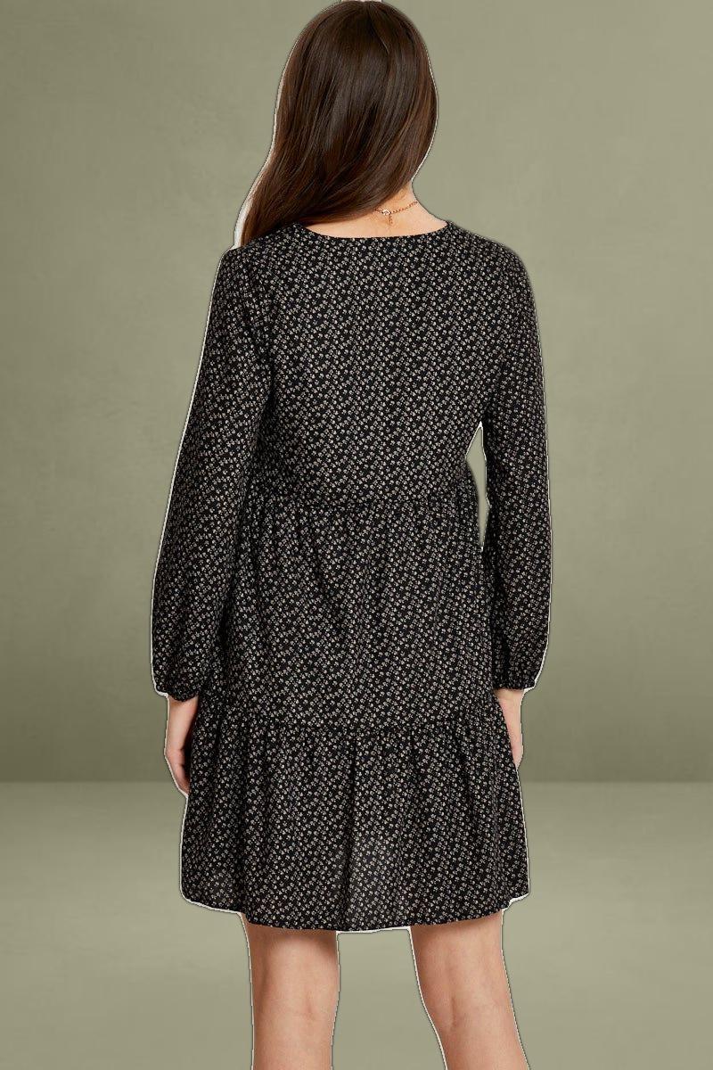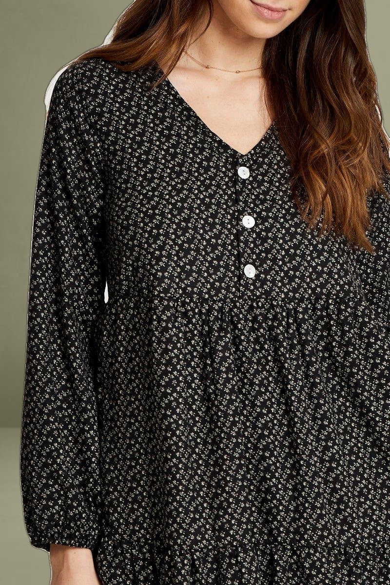 Features: Floral print, button-down bodice, balloon sleeves, ruffled hem