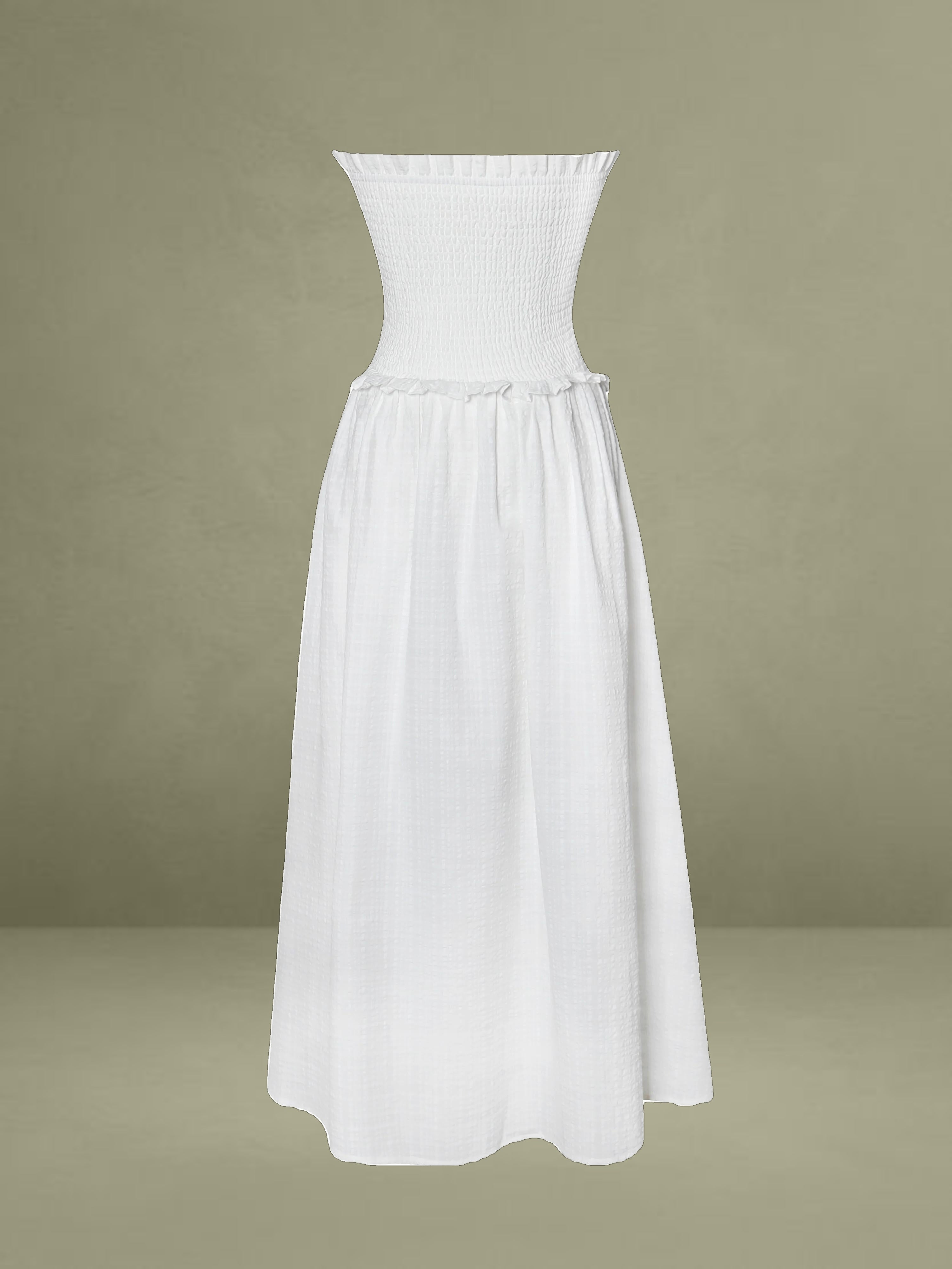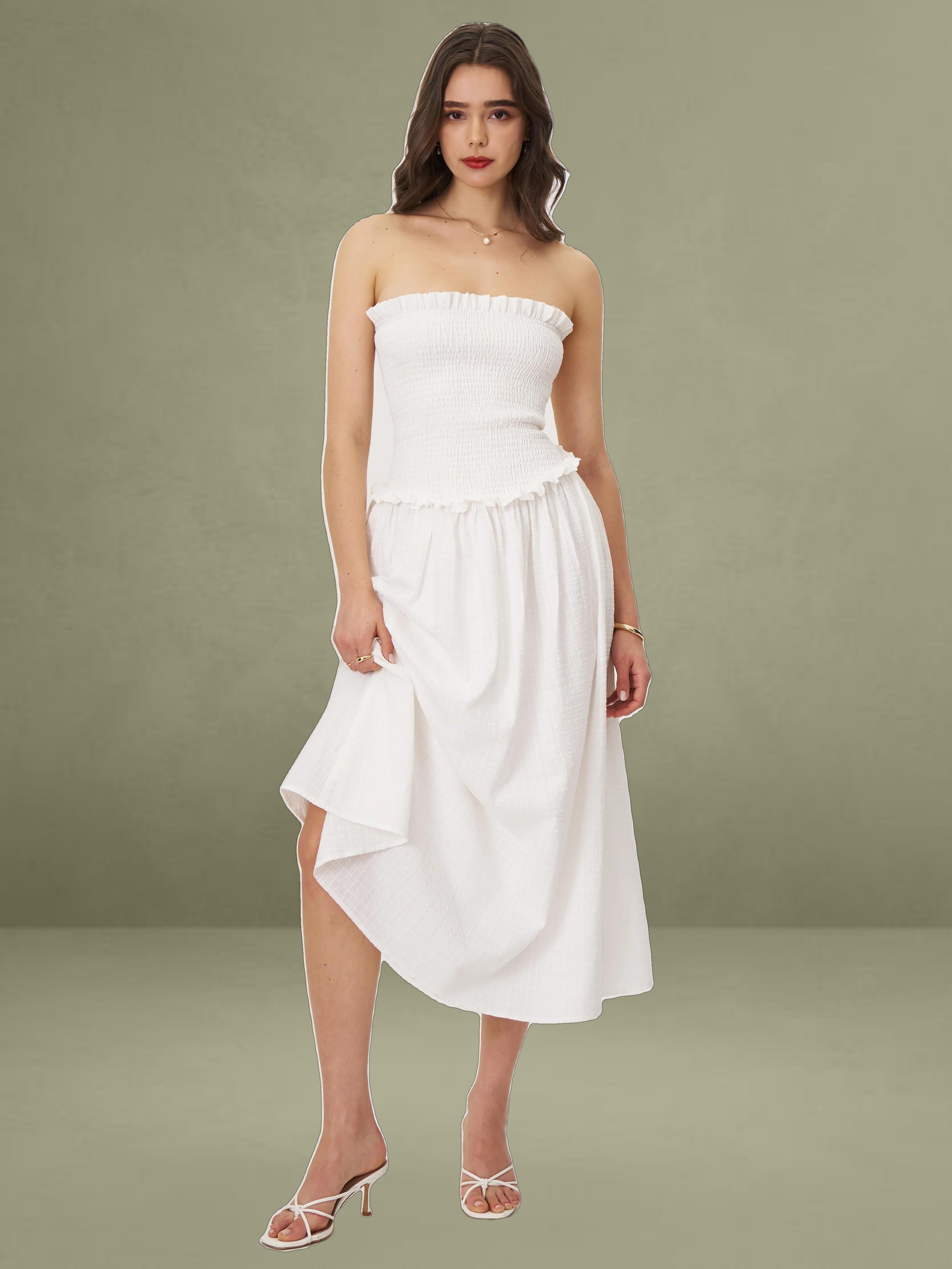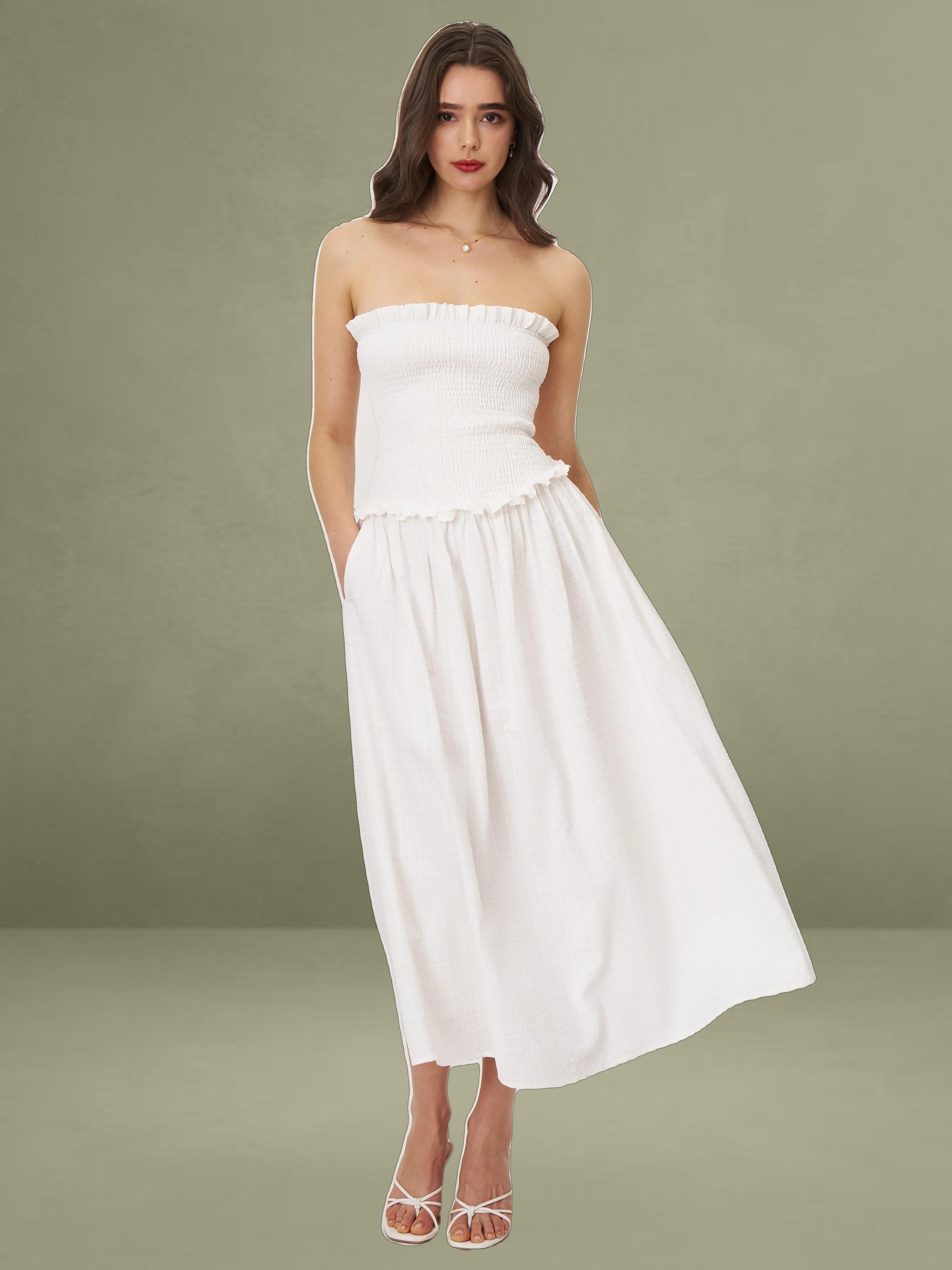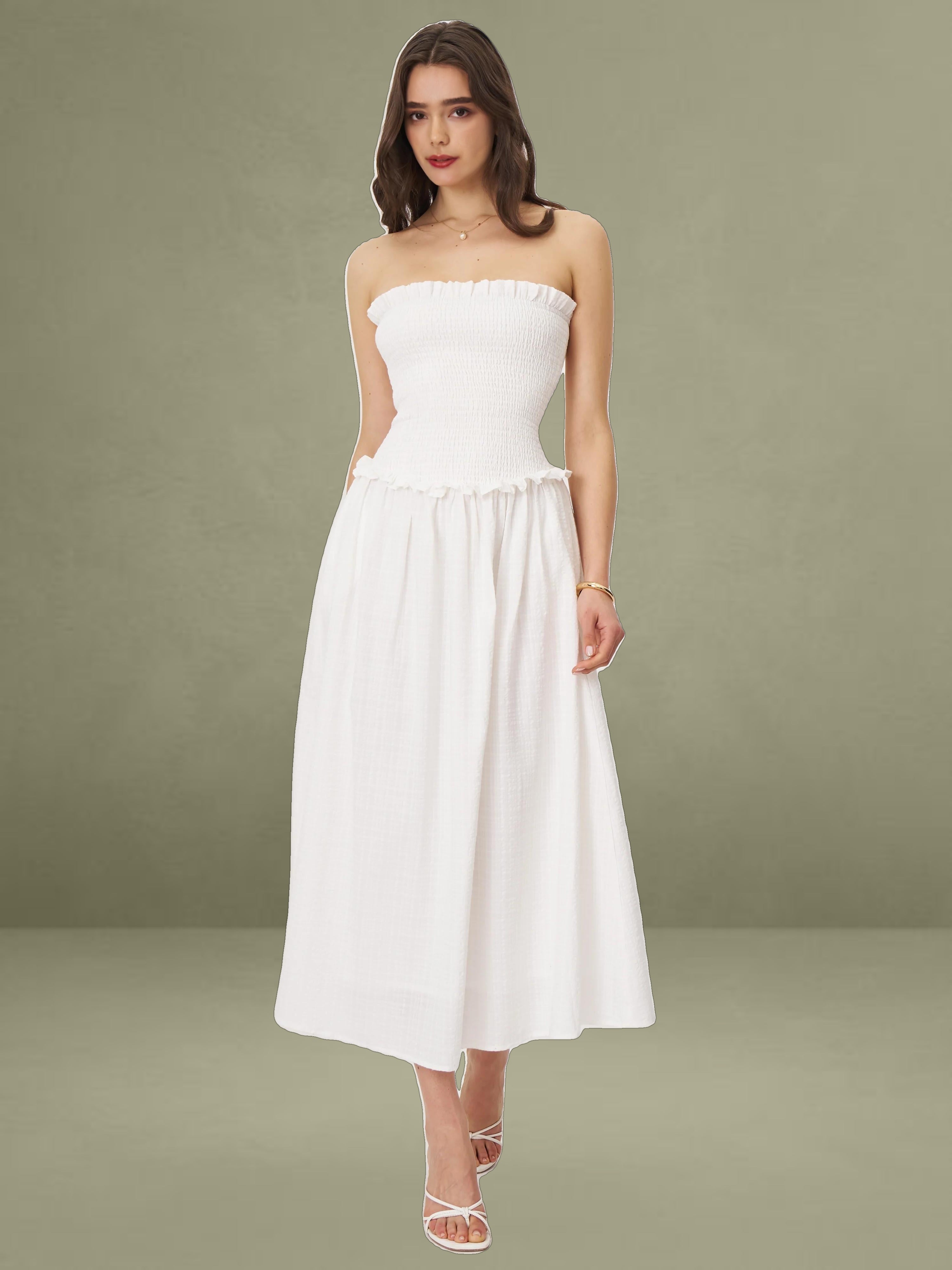 Breezy and romantic, the Quadiya Dress is your go-to piece for summer escapes. Crafted from airy white cotton seersucker, this strapless midi dress features a smocked top that hugs the body comfortably and a playful drop waist that flows into a ruffle-trimmed skirt. Lightweight and fully vacation-ready, it’s perfect for holidays, beach strolls, and sunny days. Finished with an invisible zipper for a seamless fit.